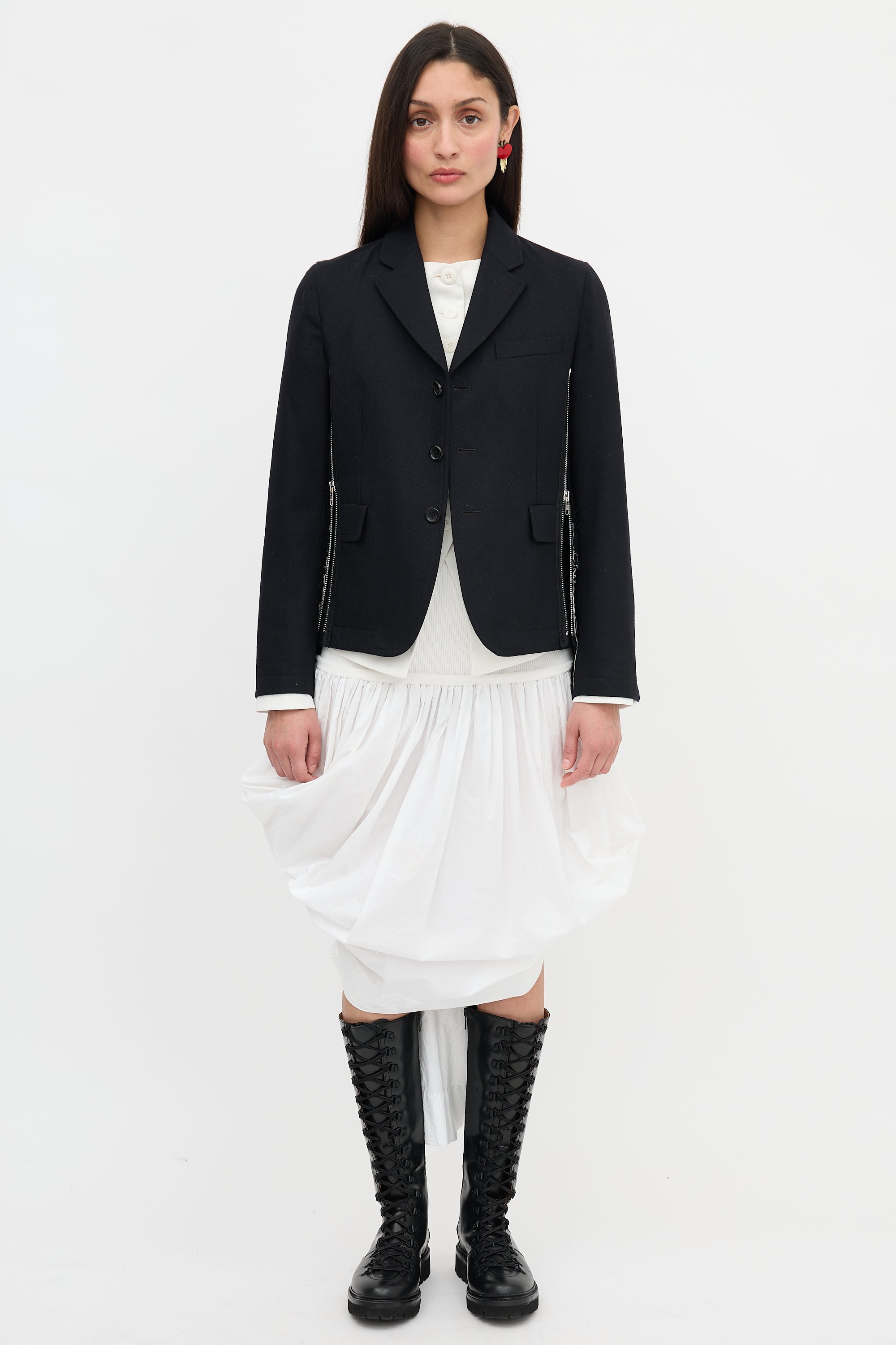 Pre-owned Comme des Garçons Comme des Garçons black wool blazer featuring a notched lapel, three button front, asymmetric zipped sides, one welt pocket at chest, two faux flap pockets, and vented back.