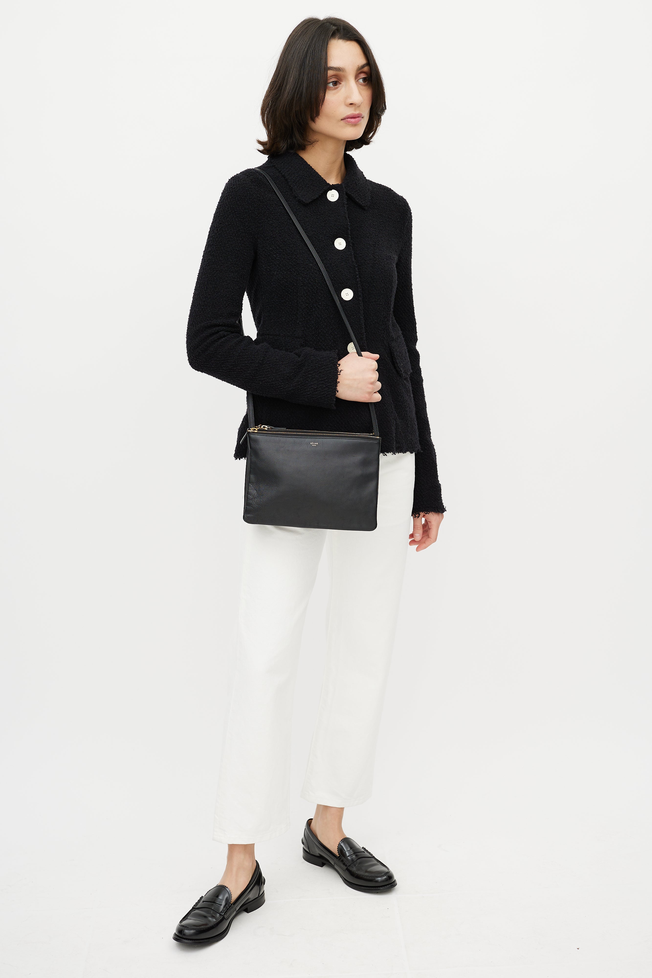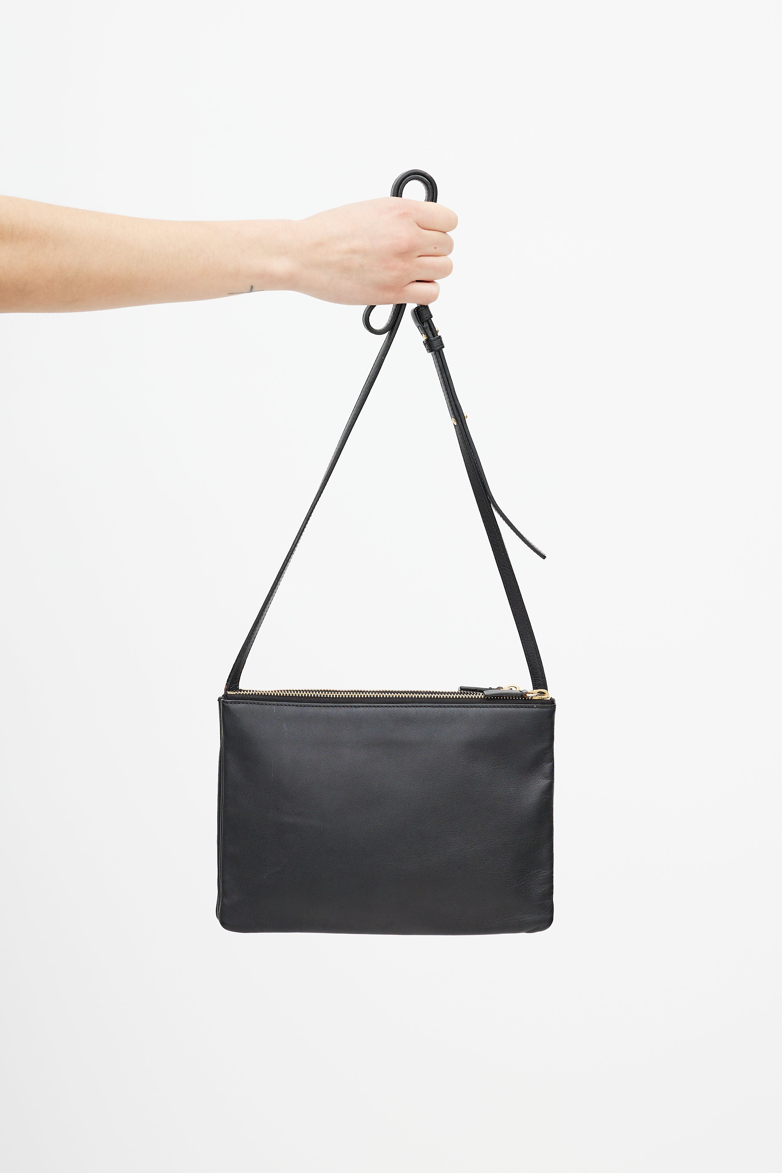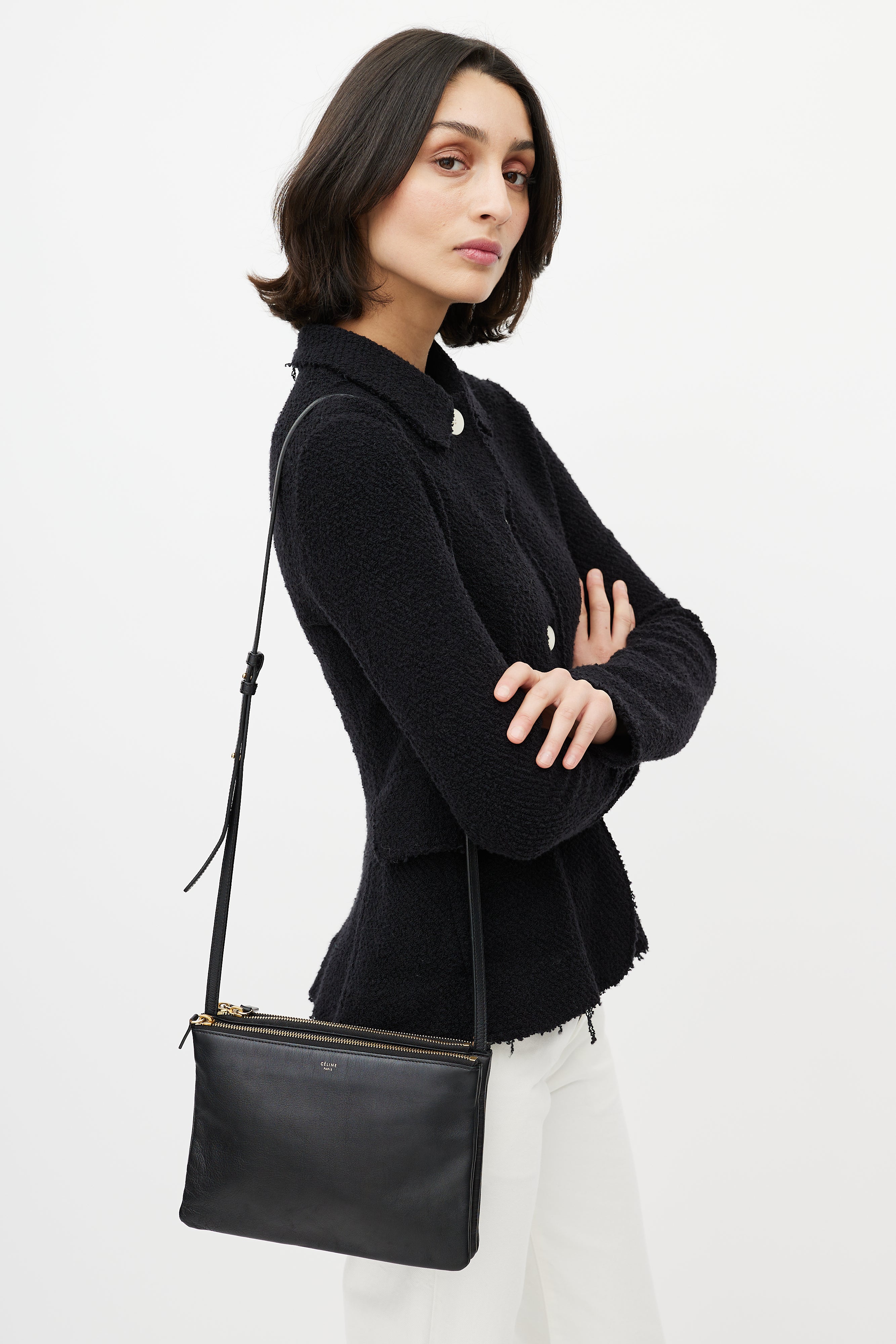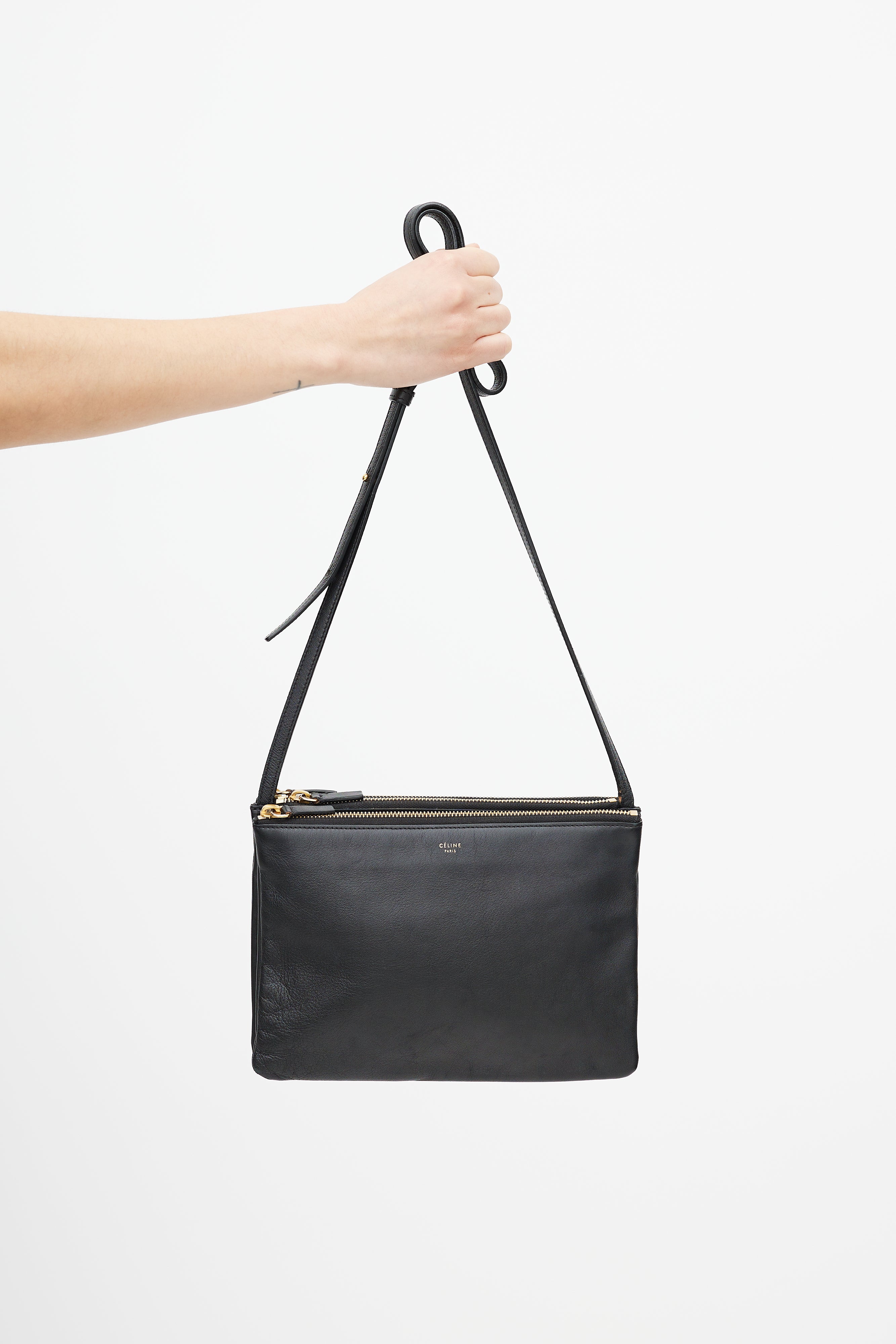 Pre-owned Celine 2014 black large Trio crossbody bag featuring gold stamped logo at front, adjustable crossbody strap, and three zip compartments.