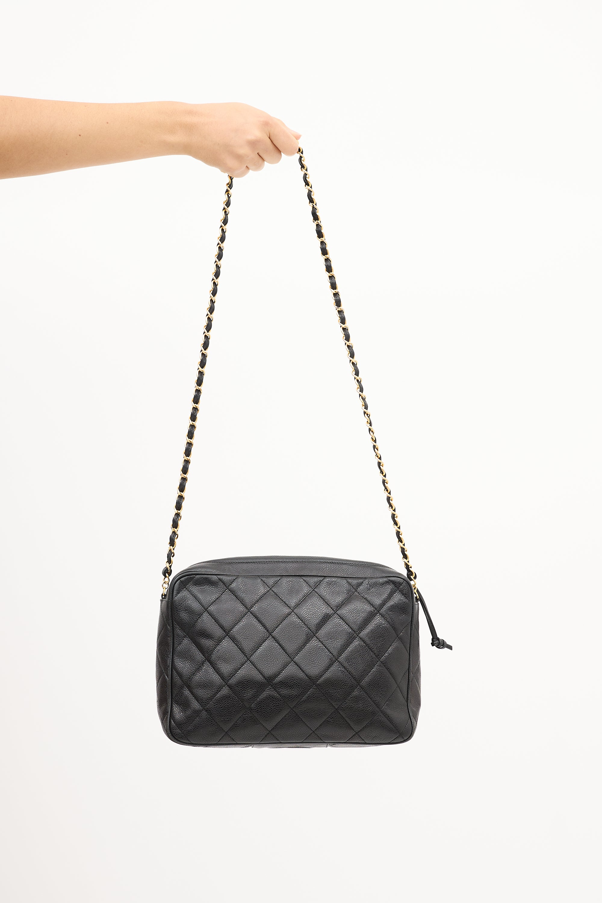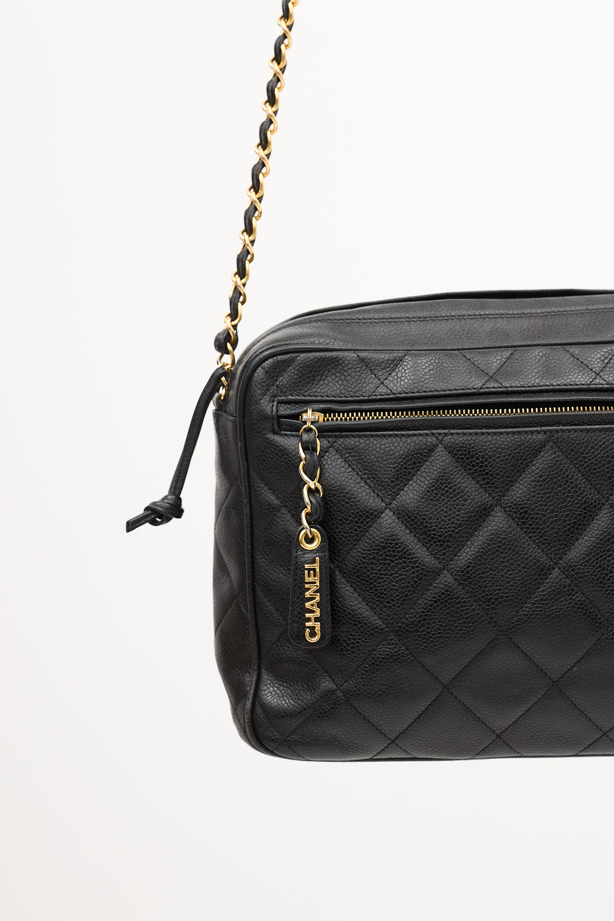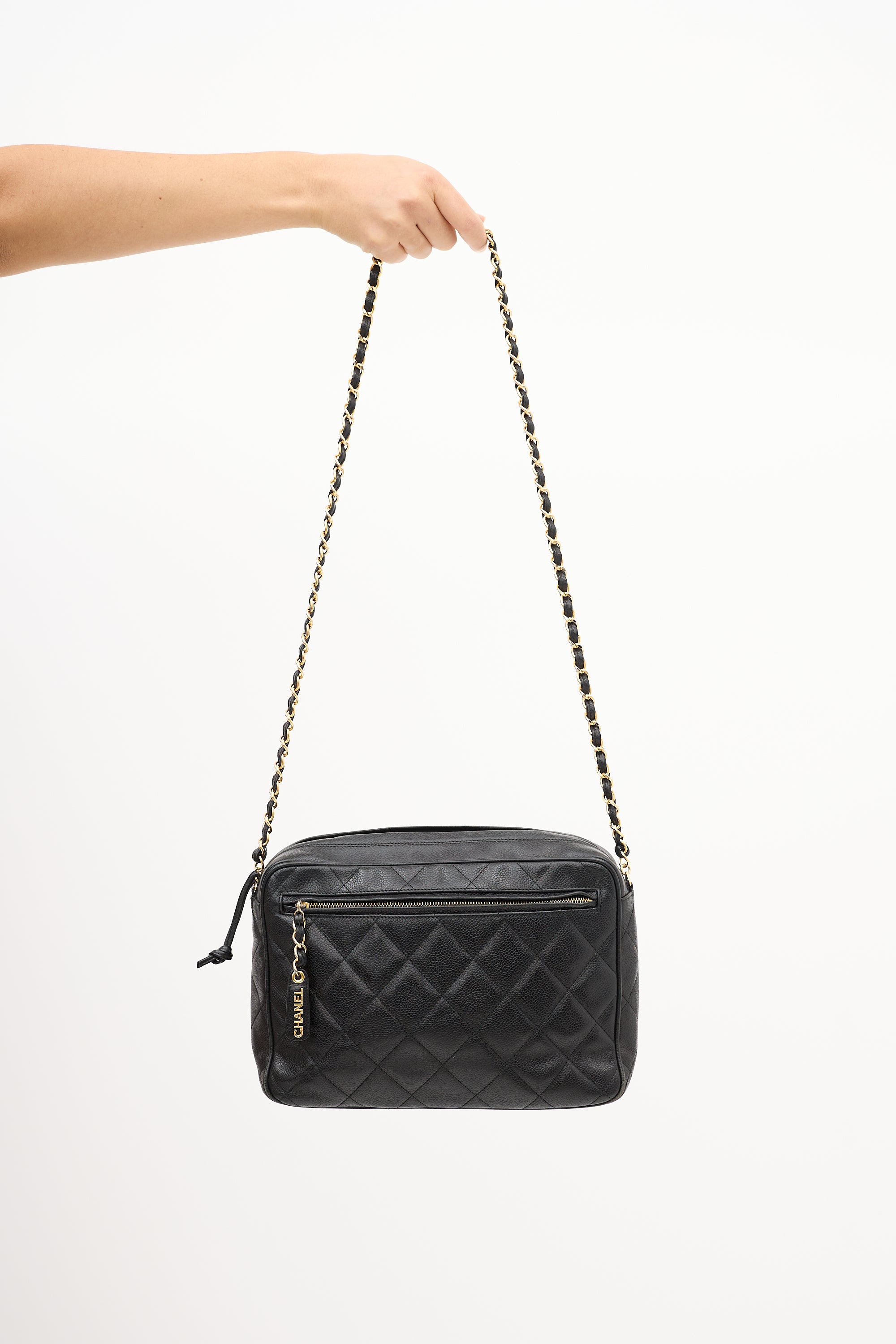 Pre-owned Chanel 1994-1996 black crossbody bag featuring signature diamond quilted Caviar leather body, gold tone hardware, stitching CC motif at base, back zip pocket with hardware logo at zipper pull, fixed braided leather and chain strap, top zip closure, and one lined main compartment with one slip pocket and one zip pocket.