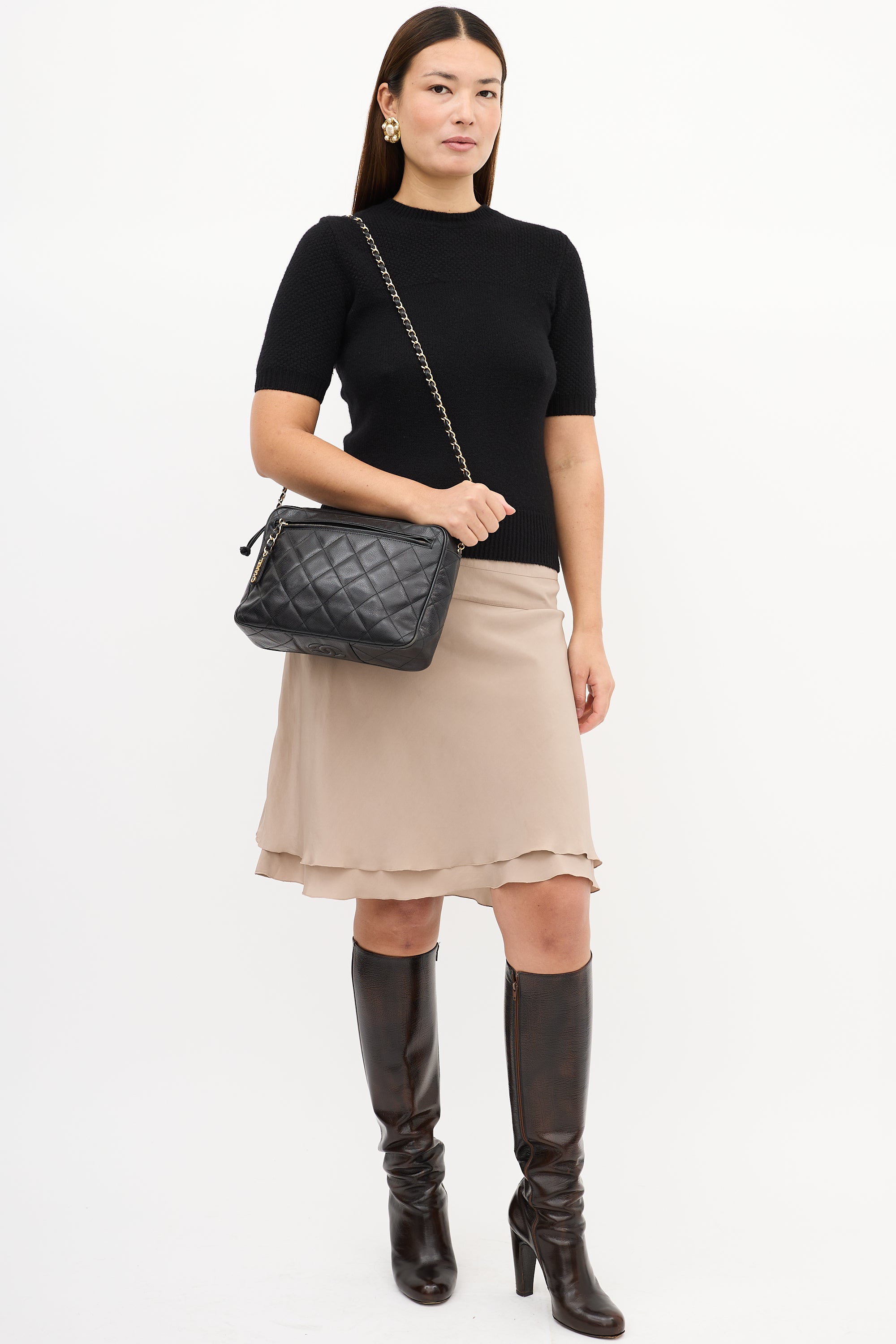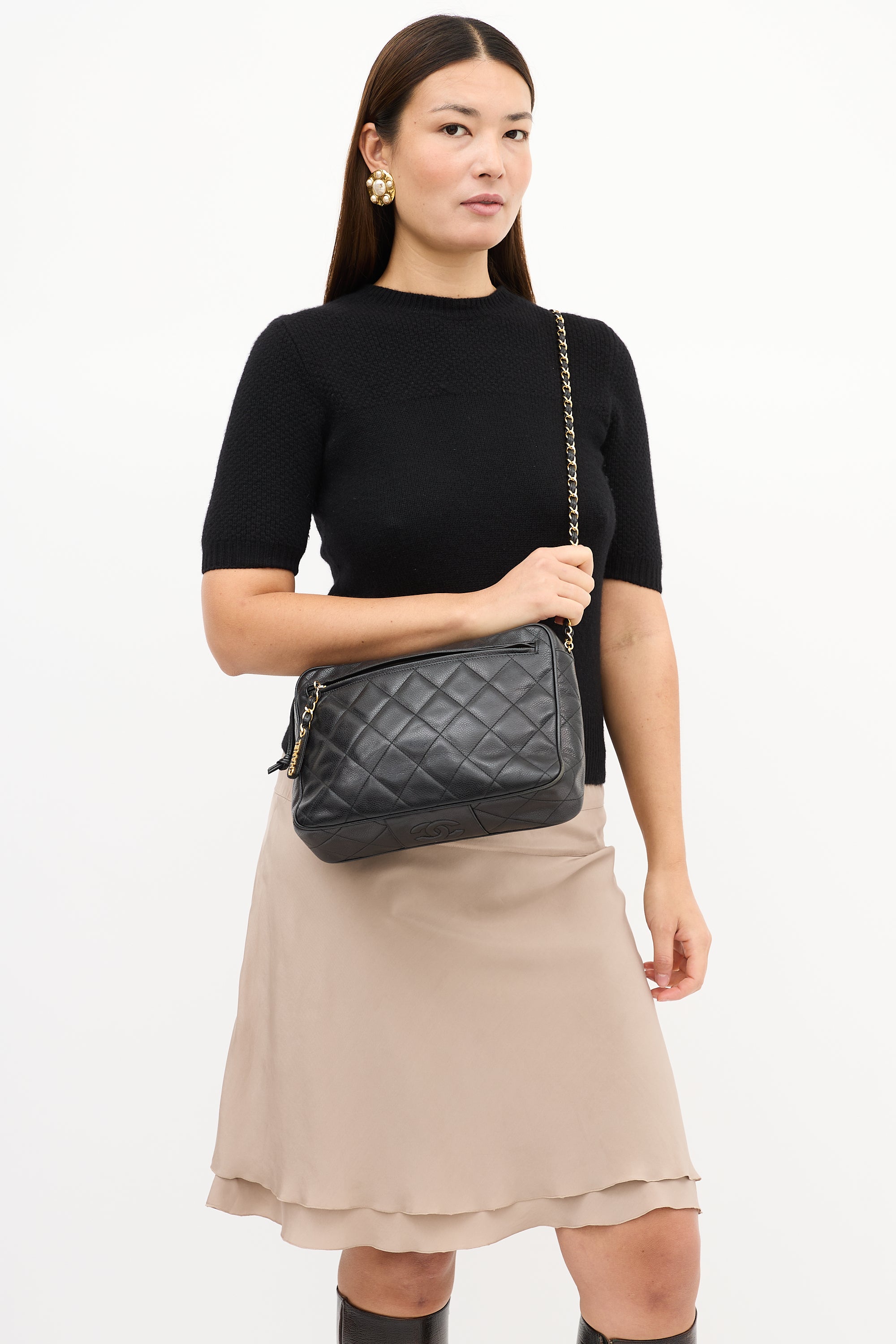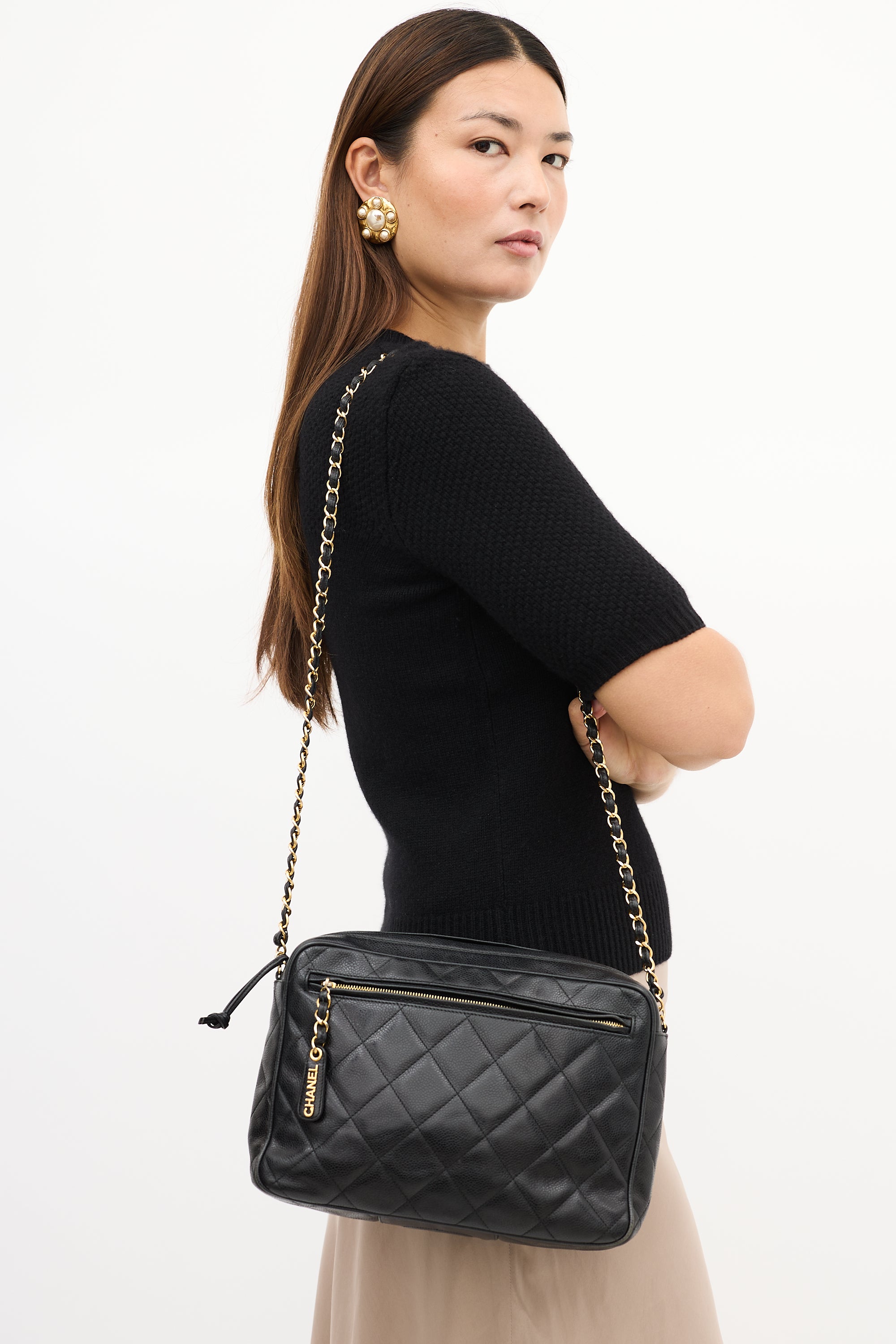 Pre-owned Chanel 1994-1996 black crossbody bag featuring signature diamond quilted Caviar leather body, gold tone hardware, stitching CC motif at base, back zip pocket with hardware logo at zipper pull, fixed braided leather and chain strap, top zip closure, and one lined main compartment with one slip pocket and one zip pocket.