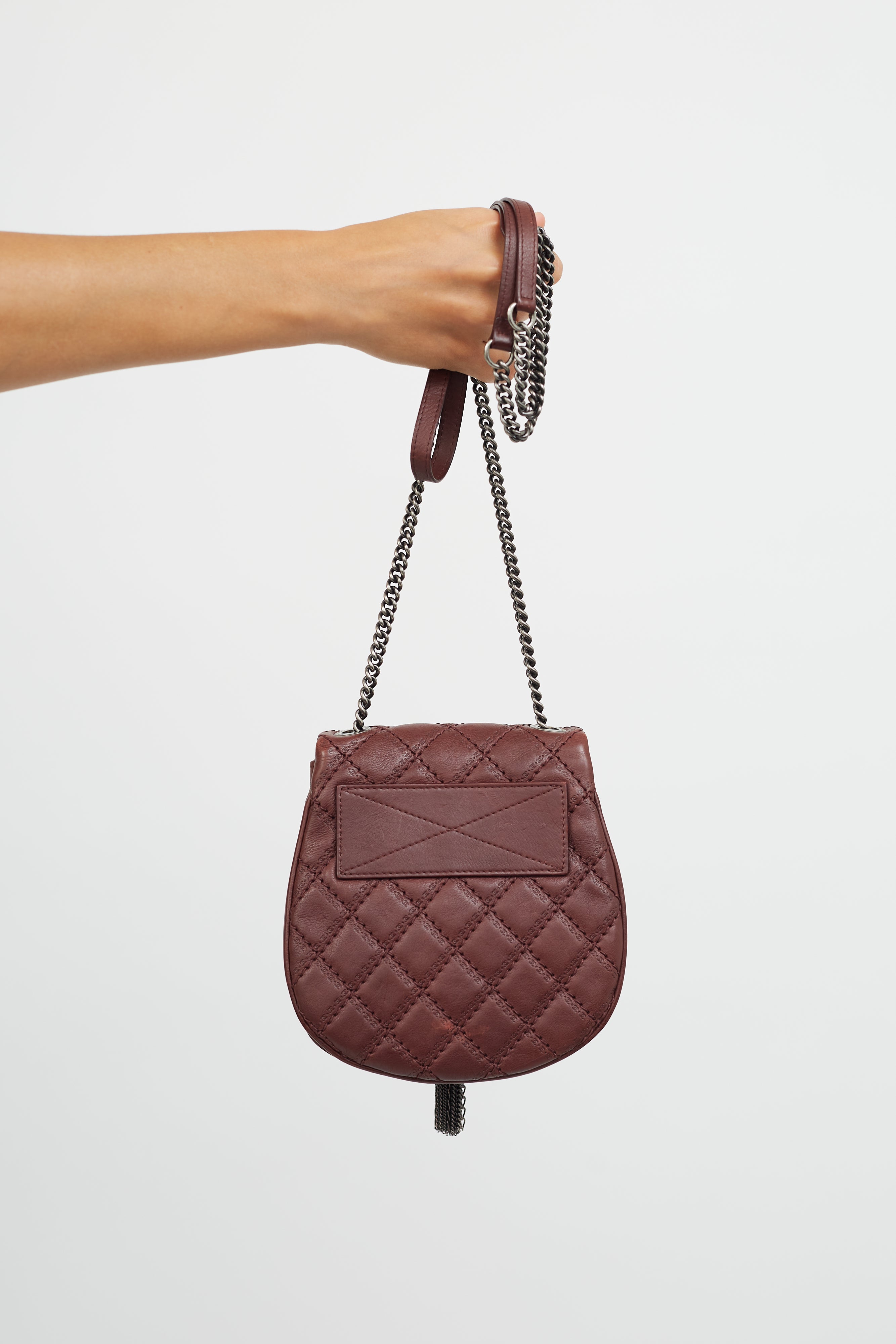 Pre-owned Chanel burgundy Coco Sporran tassel shoulder bag featuring a top flap closure with twist lock, silver tone metal hardware at front and on tassels, quilted pattern throughout, silver tone and burgundy leather crossbody strap and one main compartment. Entrupy certificate included.