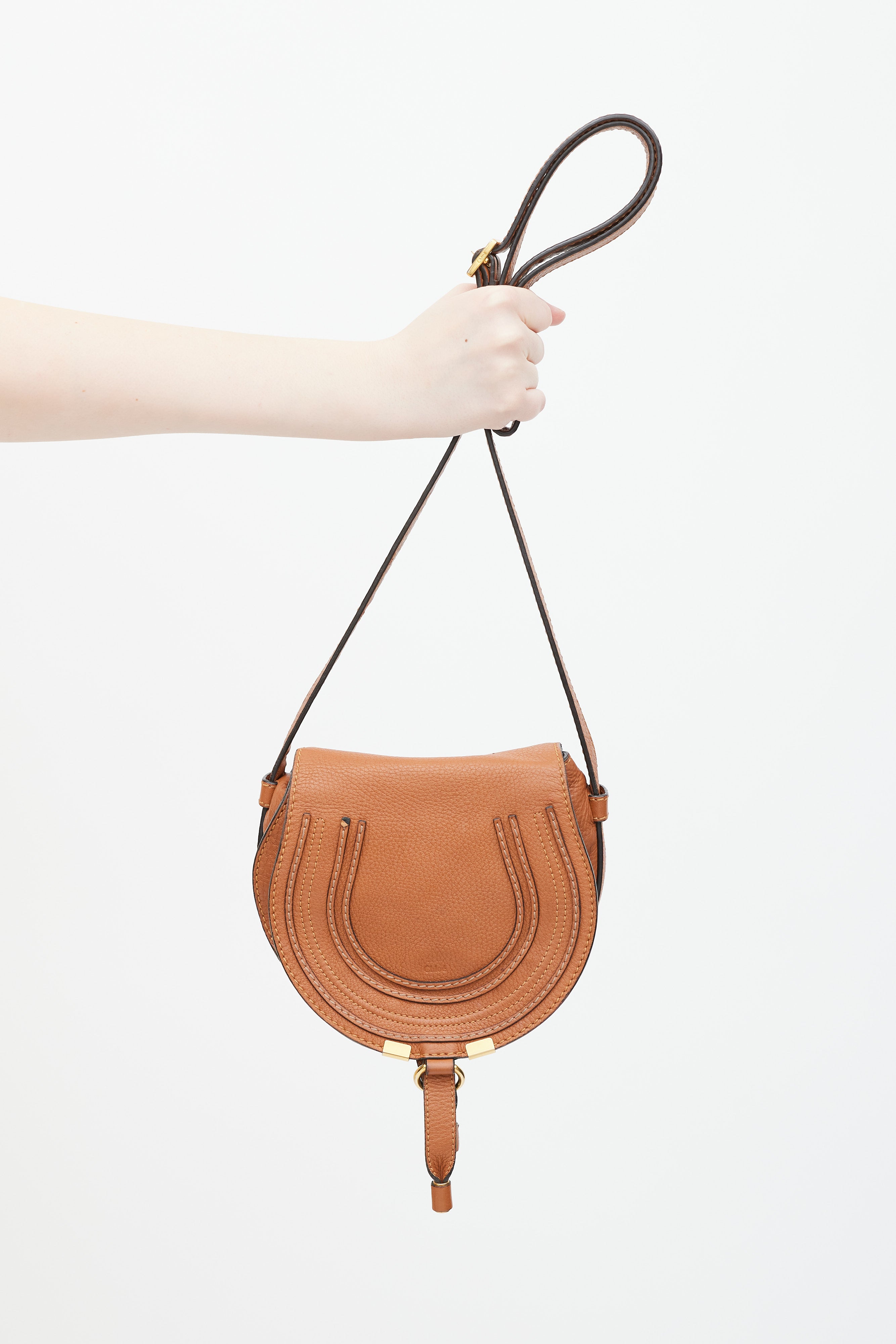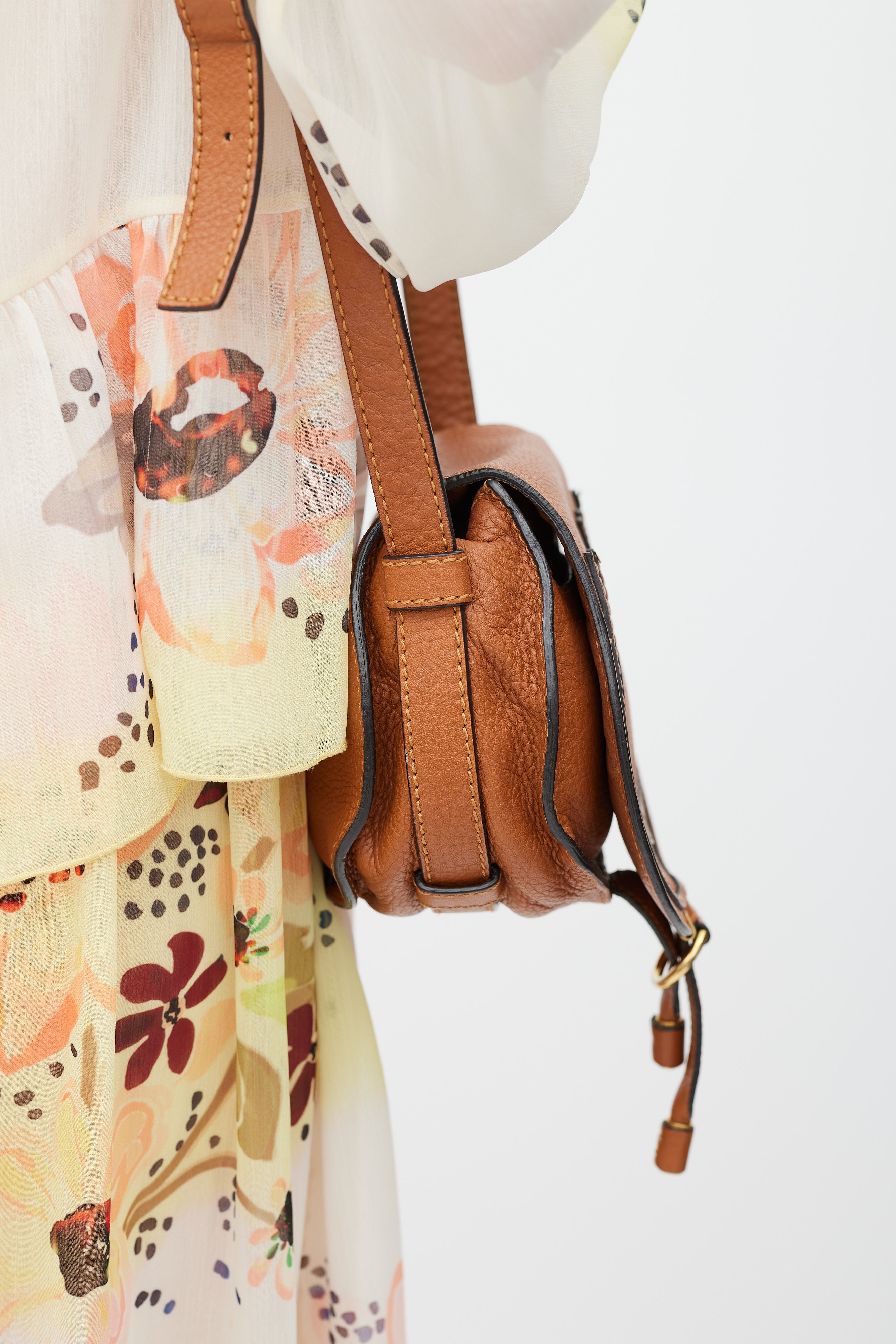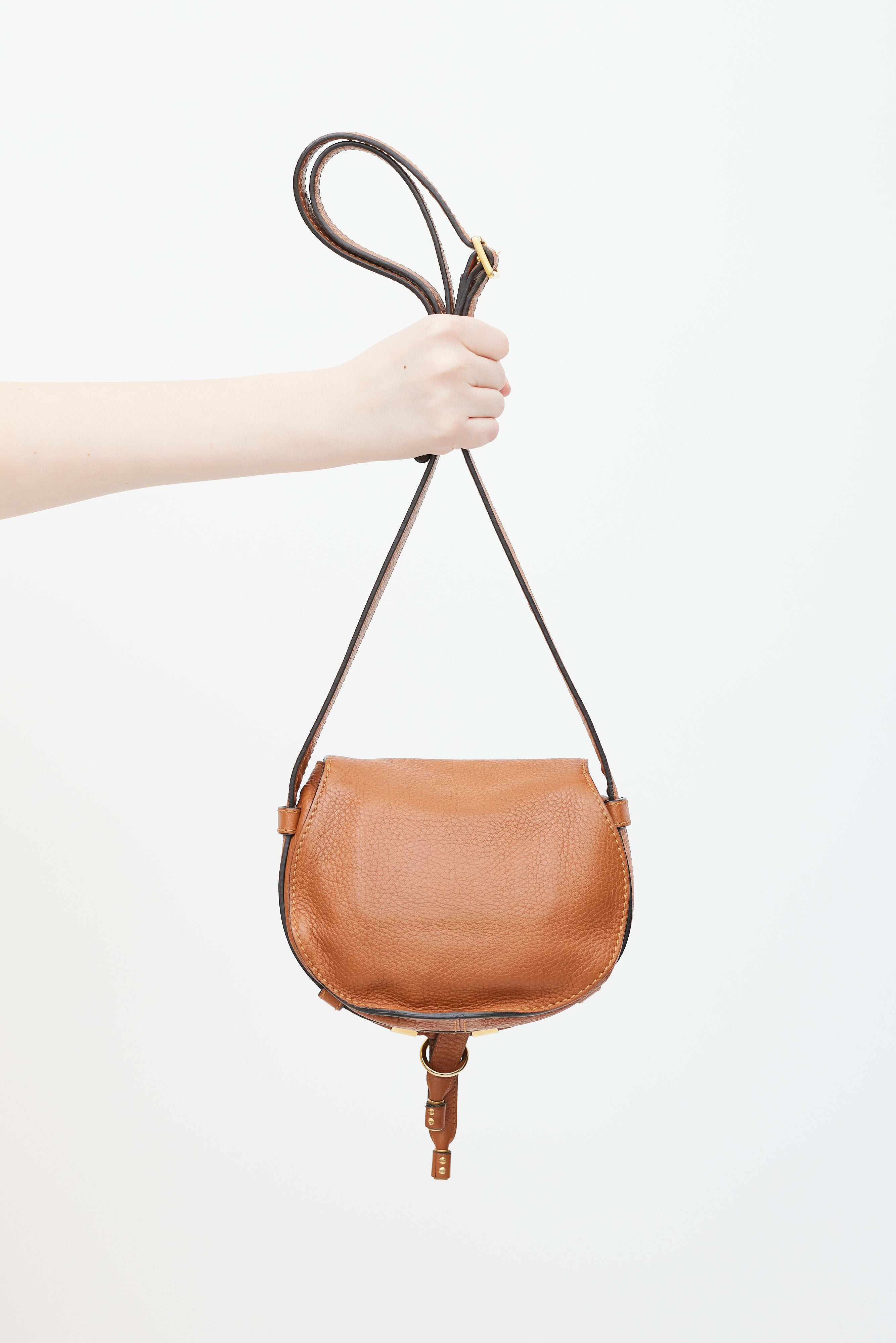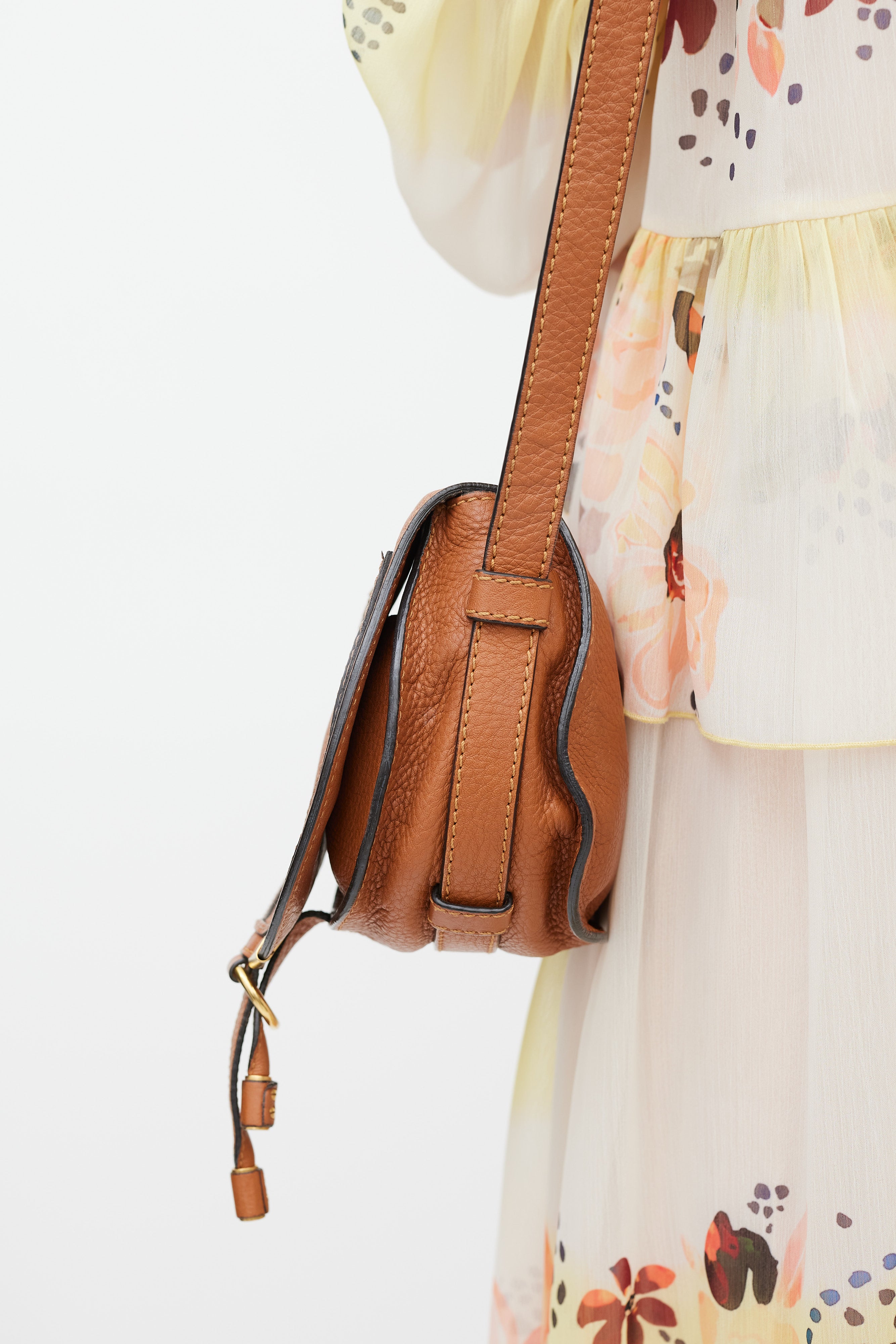 Pre-owned Chloé brown mini Marcie crossbody bag featuring pebbled leather, gold tone hardware, fold-over front flap with u-shaped stitching and debossed logo, two tassel closure, adjustable buckle shoulder strap, one slip pocket at front, and canvas lined main compartment with single card slot-holder.