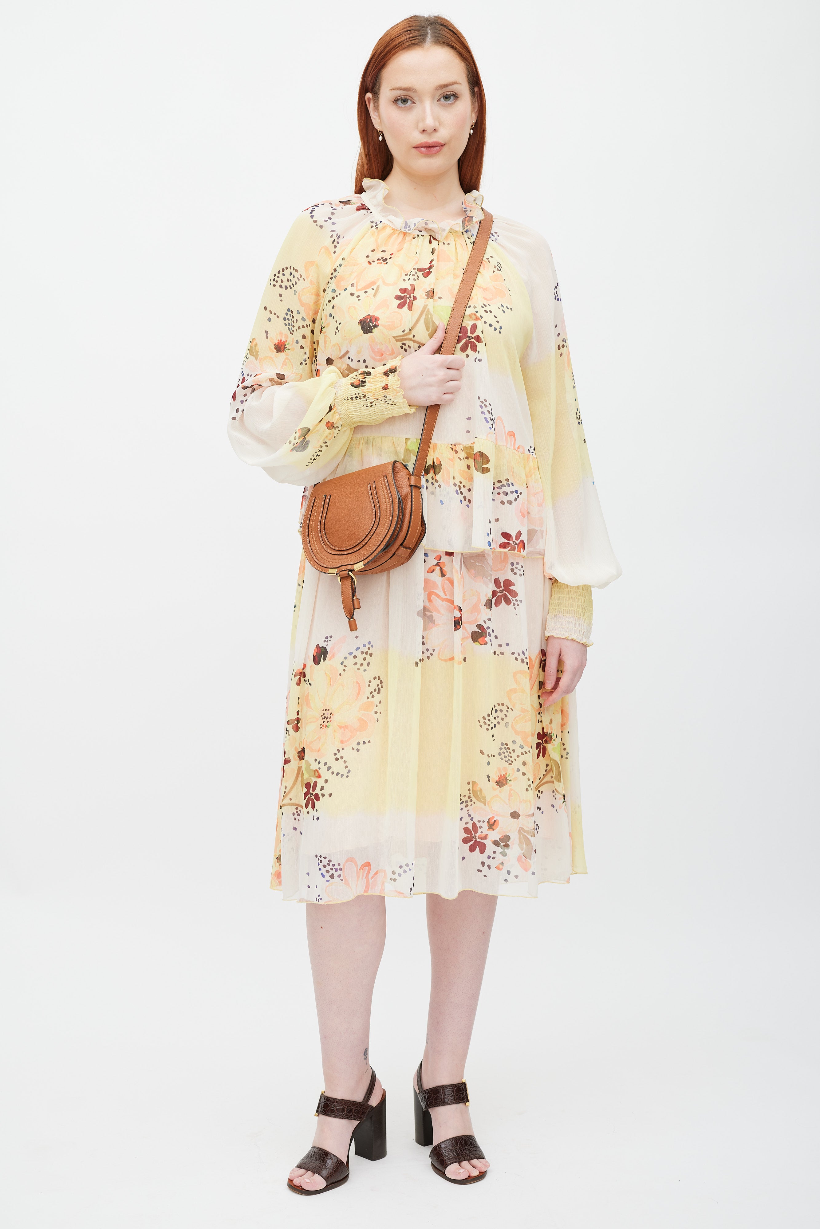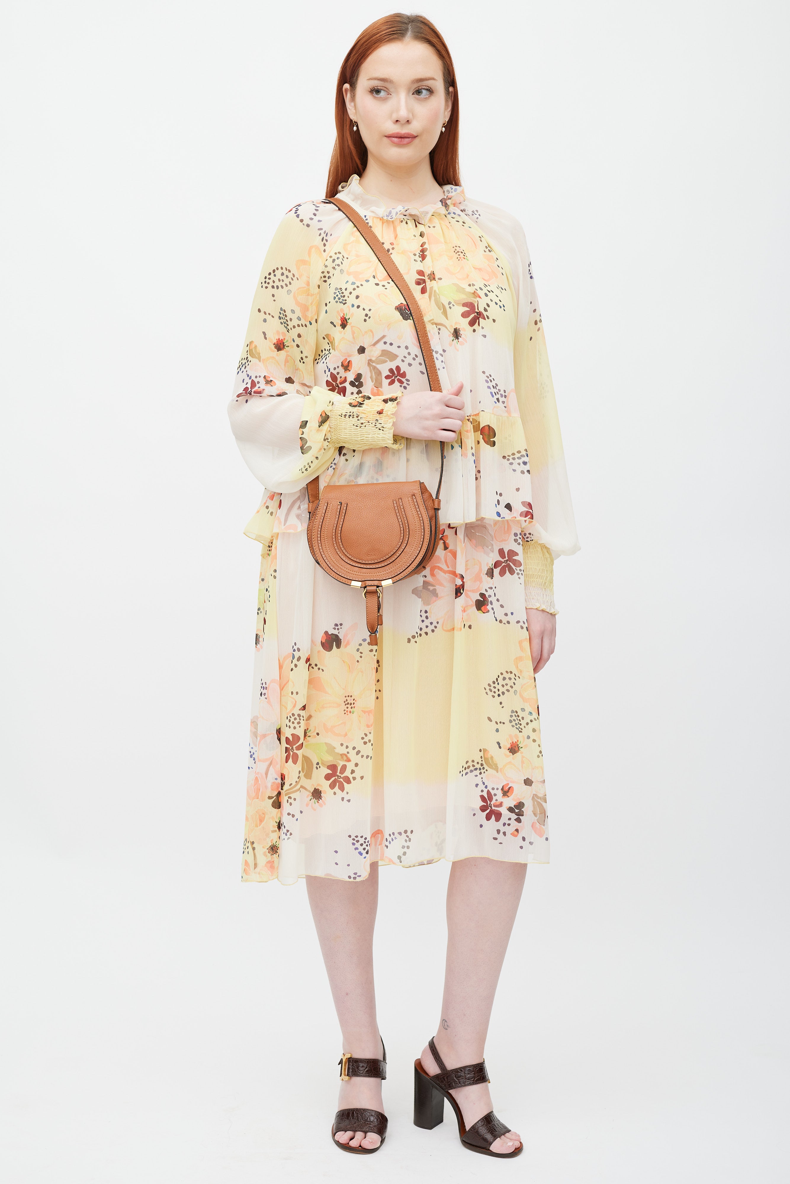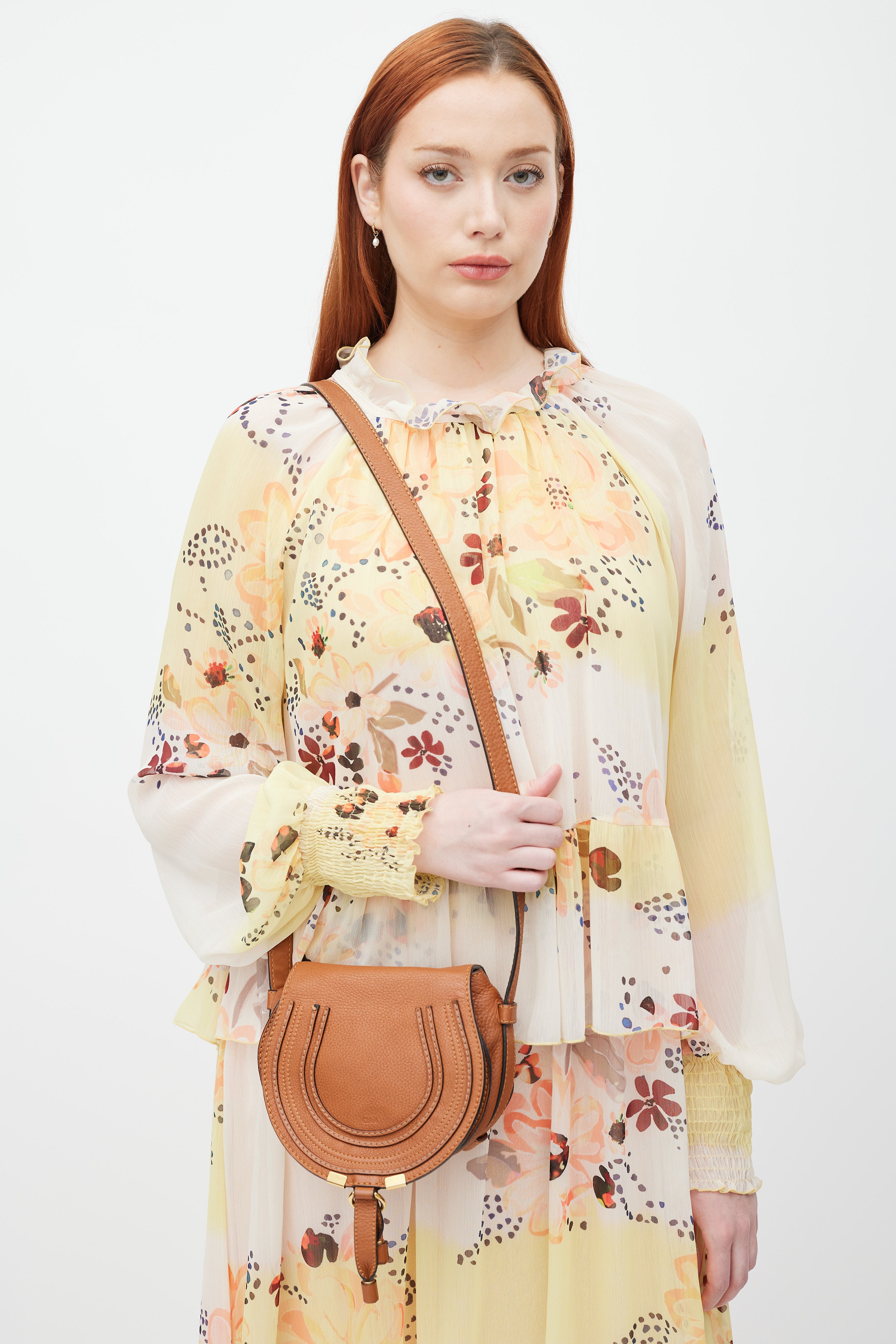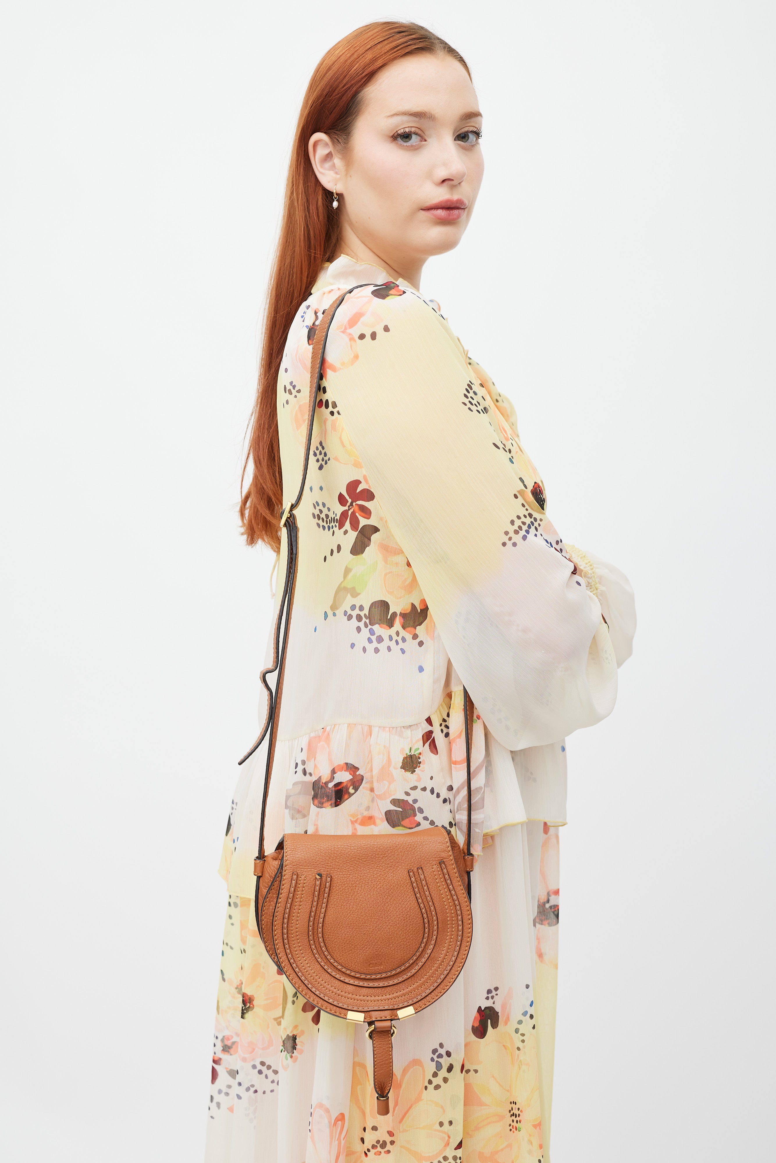 Pre-owned Chloé brown mini Marcie crossbody bag featuring pebbled leather, gold tone hardware, fold-over front flap with u-shaped stitching and debossed logo, two tassel closure, adjustable buckle shoulder strap, one slip pocket at front, and canvas lined main compartment with single card slot-holder.