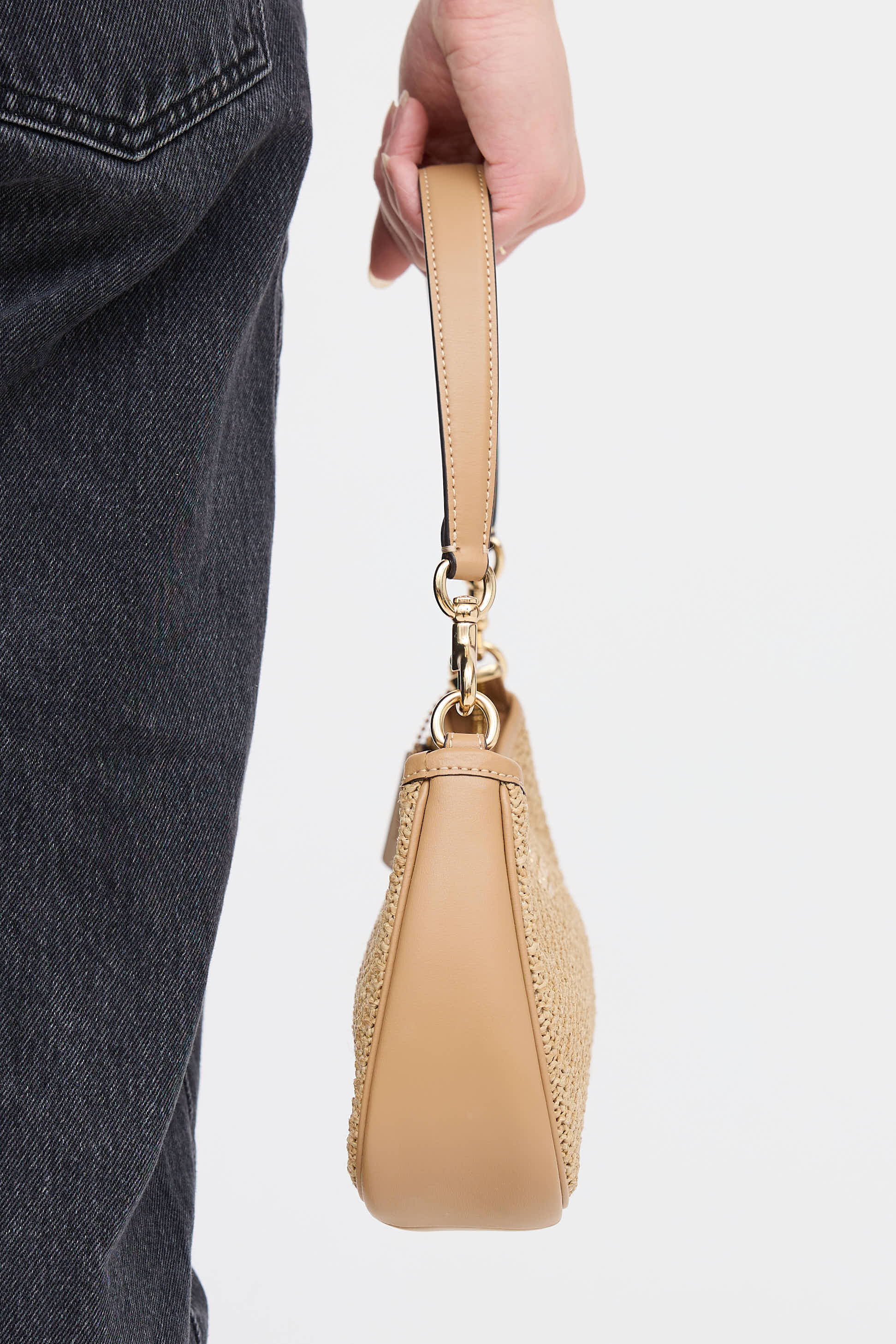 Pre-owned Coach beige Raffia Teri crossbody bag featuring gold tone hardware, leather trim, removable adjustable shoulder strap, removable top handle strap, logo embellishment, and zip closure. Canvas interior, one main compartment, one slip pocket with logo tab, and two card slots.