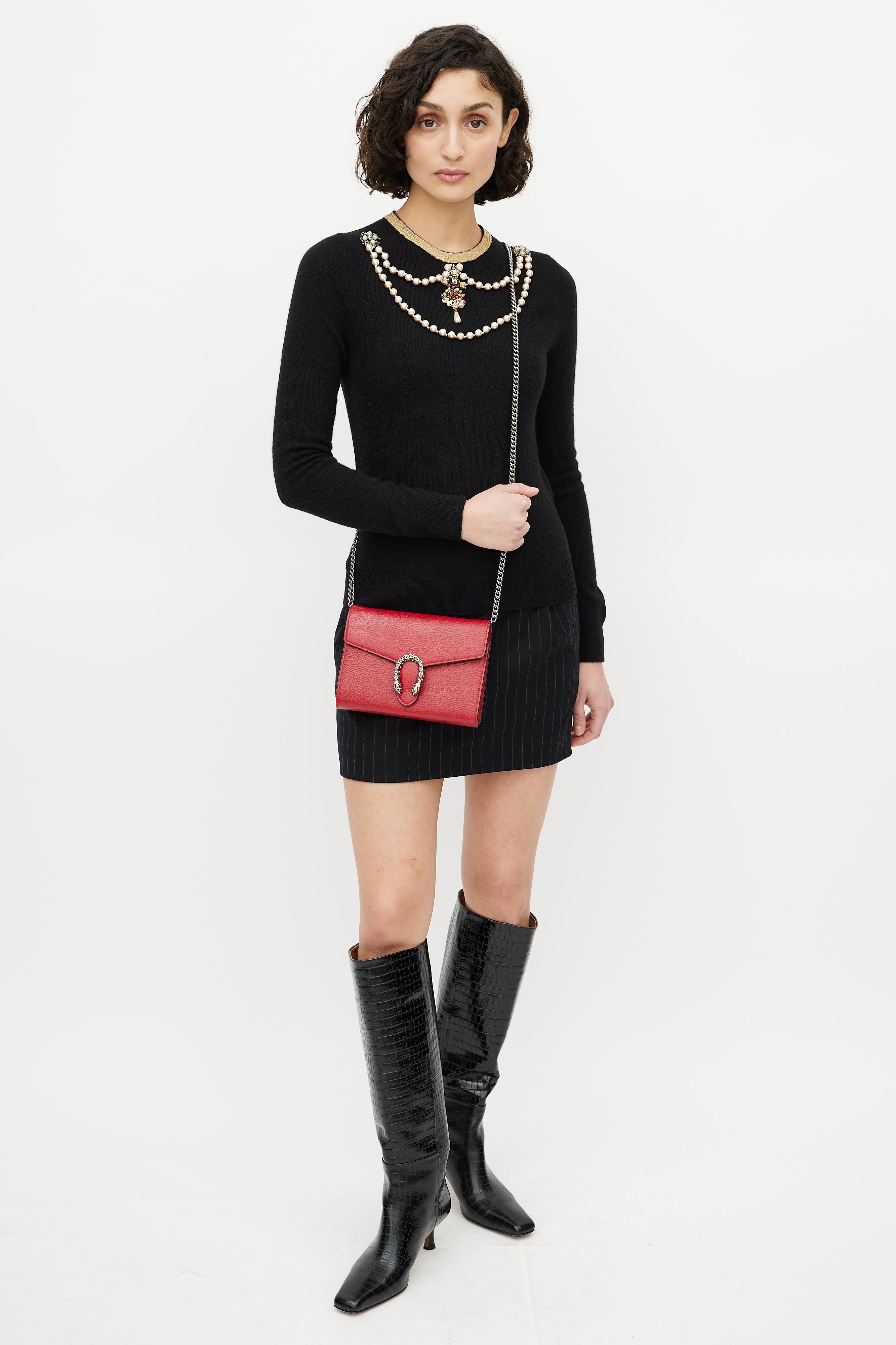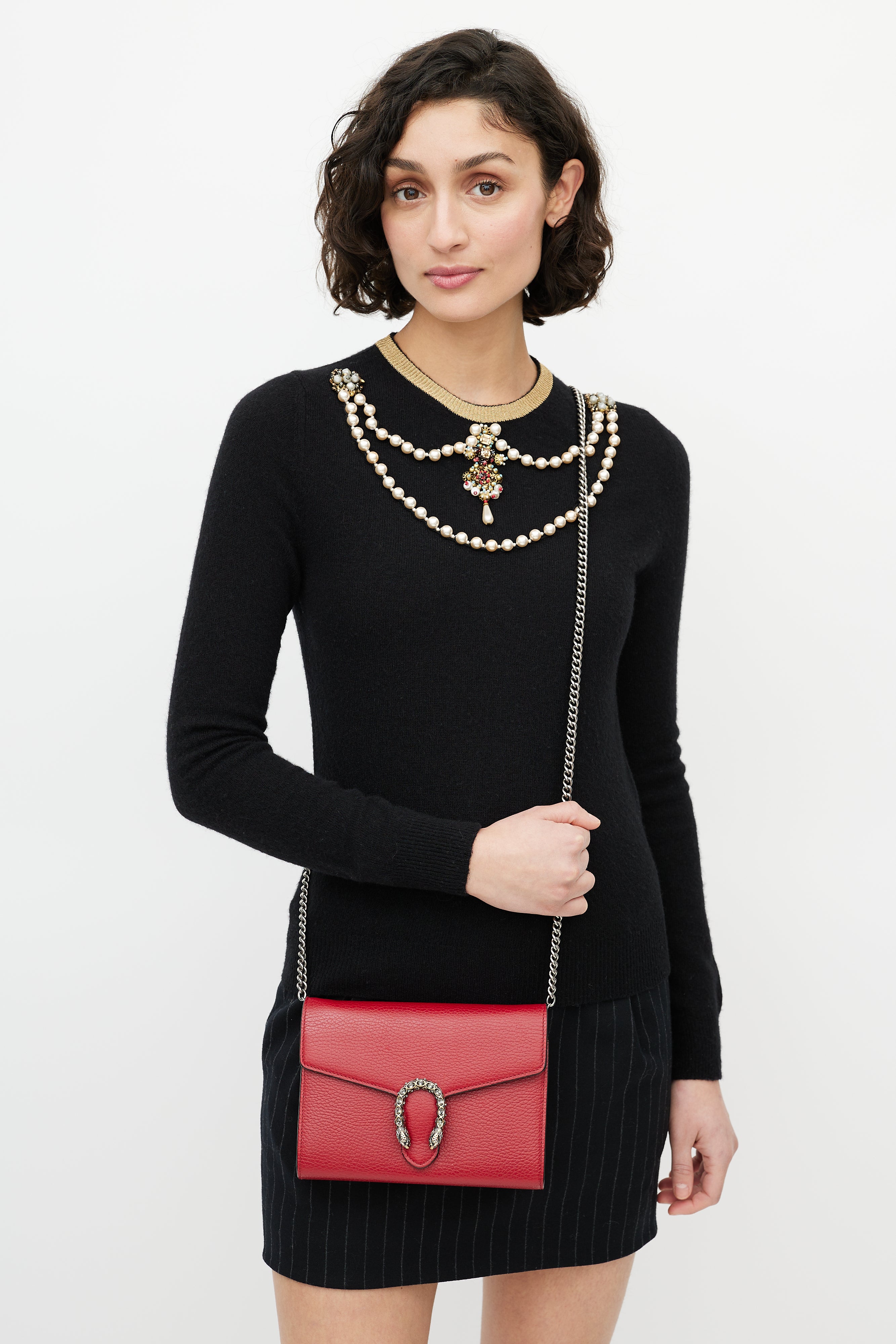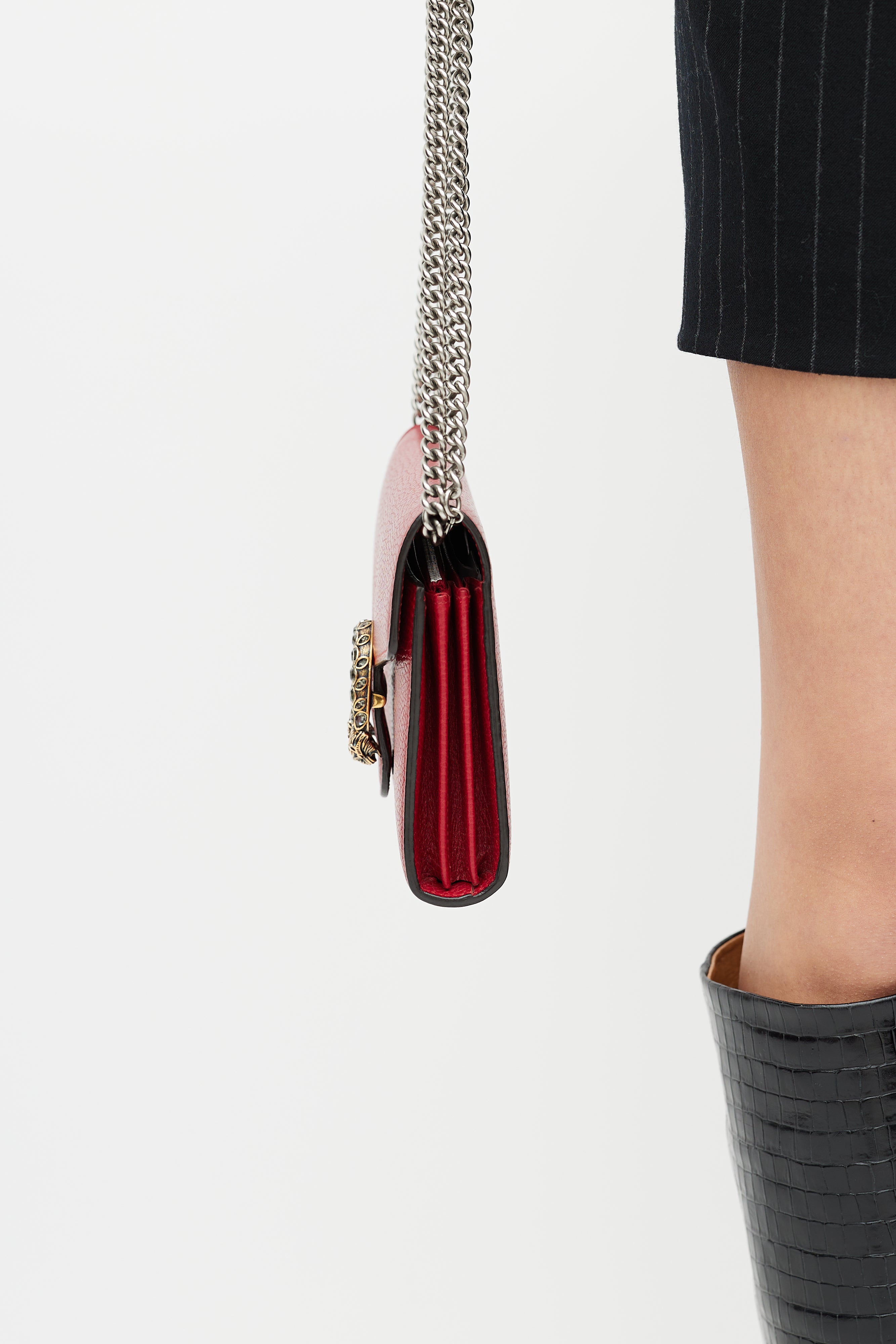 Pre-owned Gucci mini leather Dionysus wallet on chain featuring pebbled leather, crystal embellished tiger head at front, snap button closure, detachable chain strap, three main compartment, middle zip closure, Moiré lining, and multiple card slots inside. Comes with original dust bag and box.