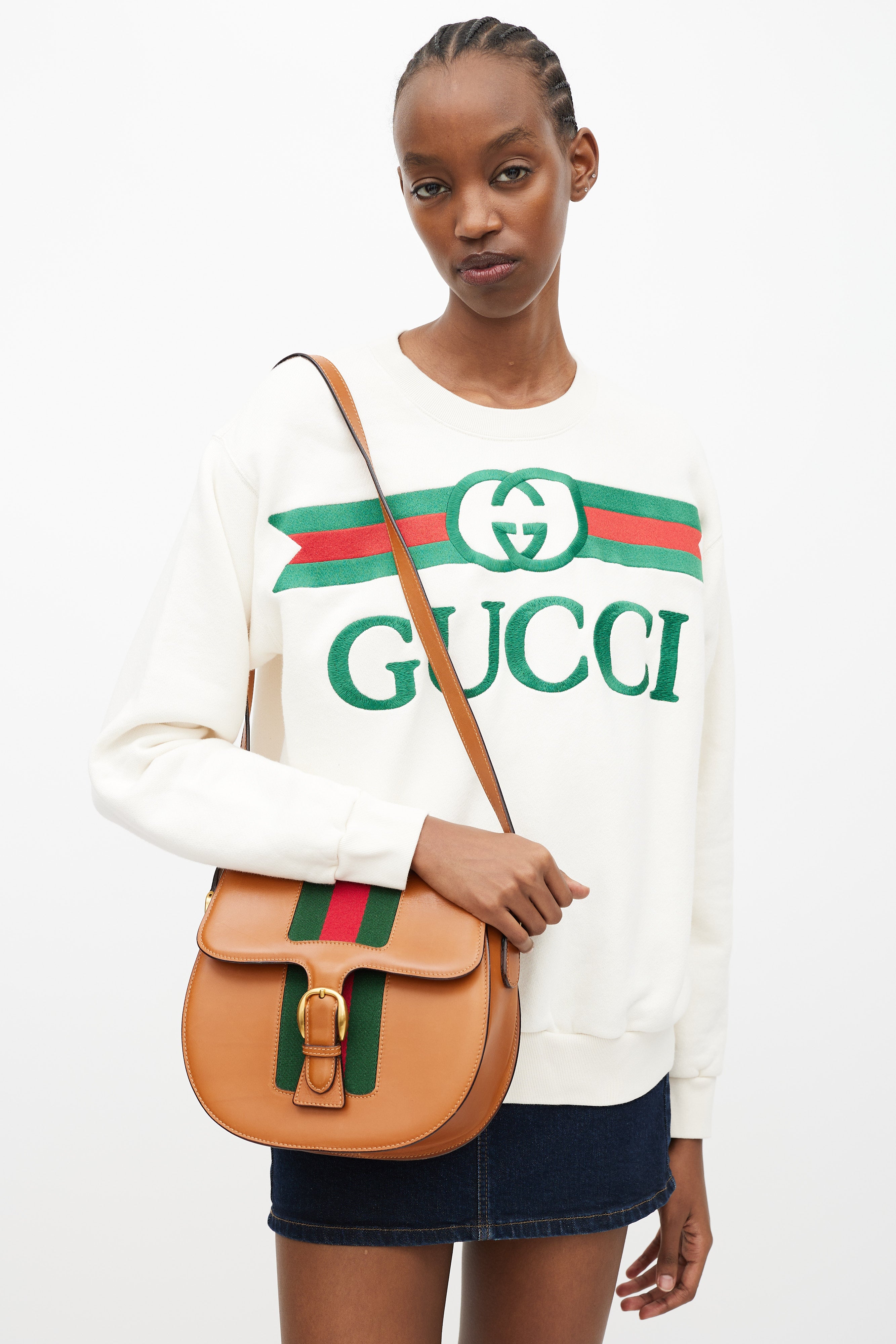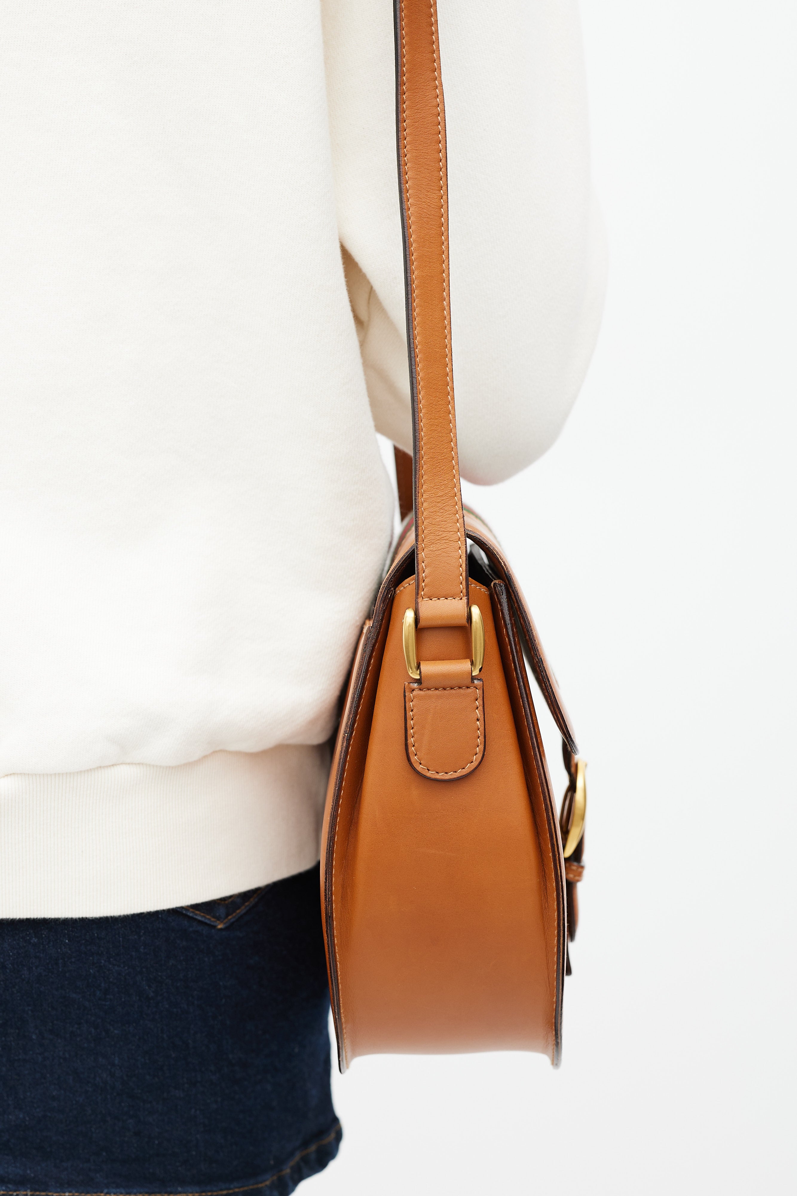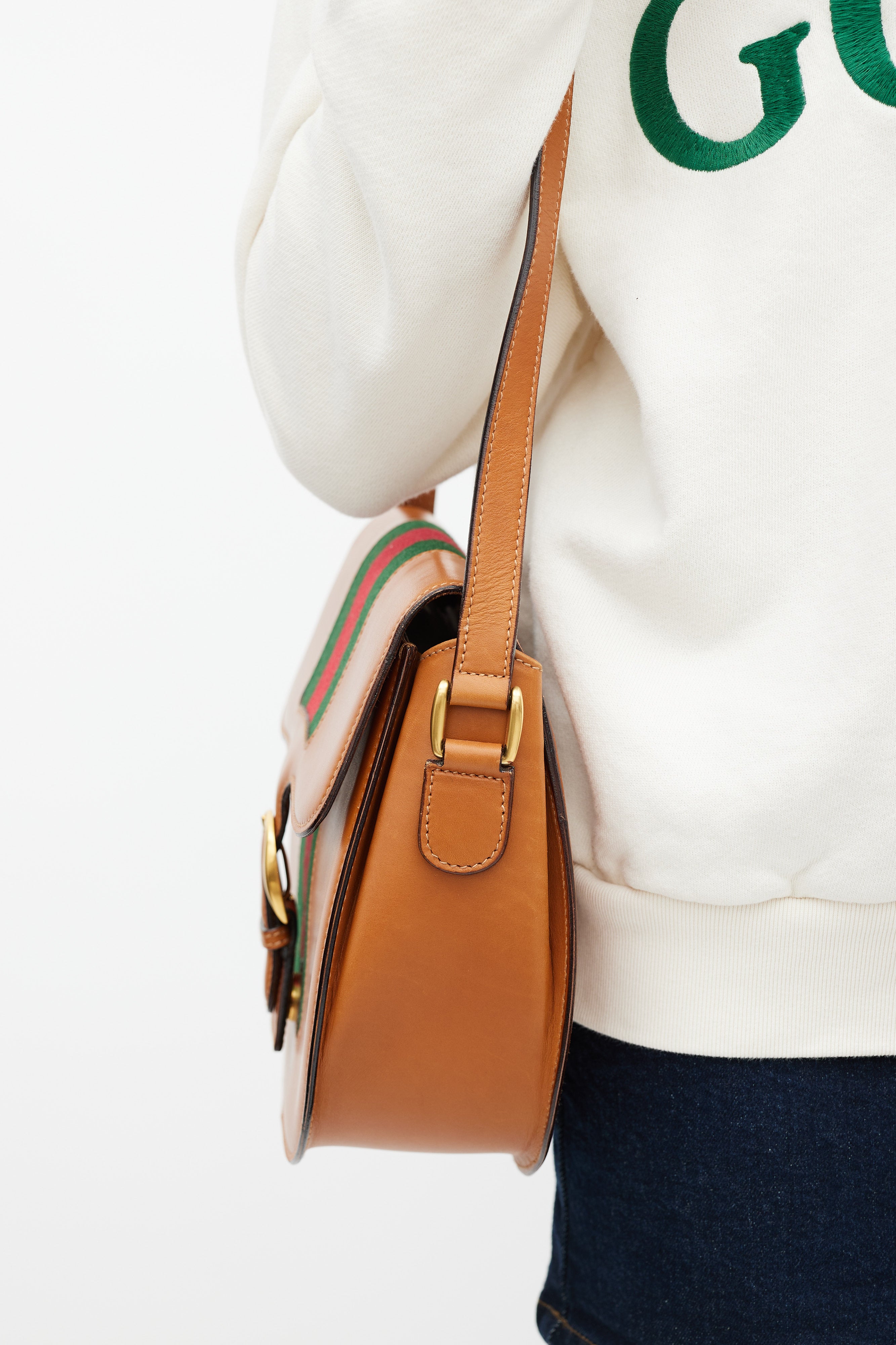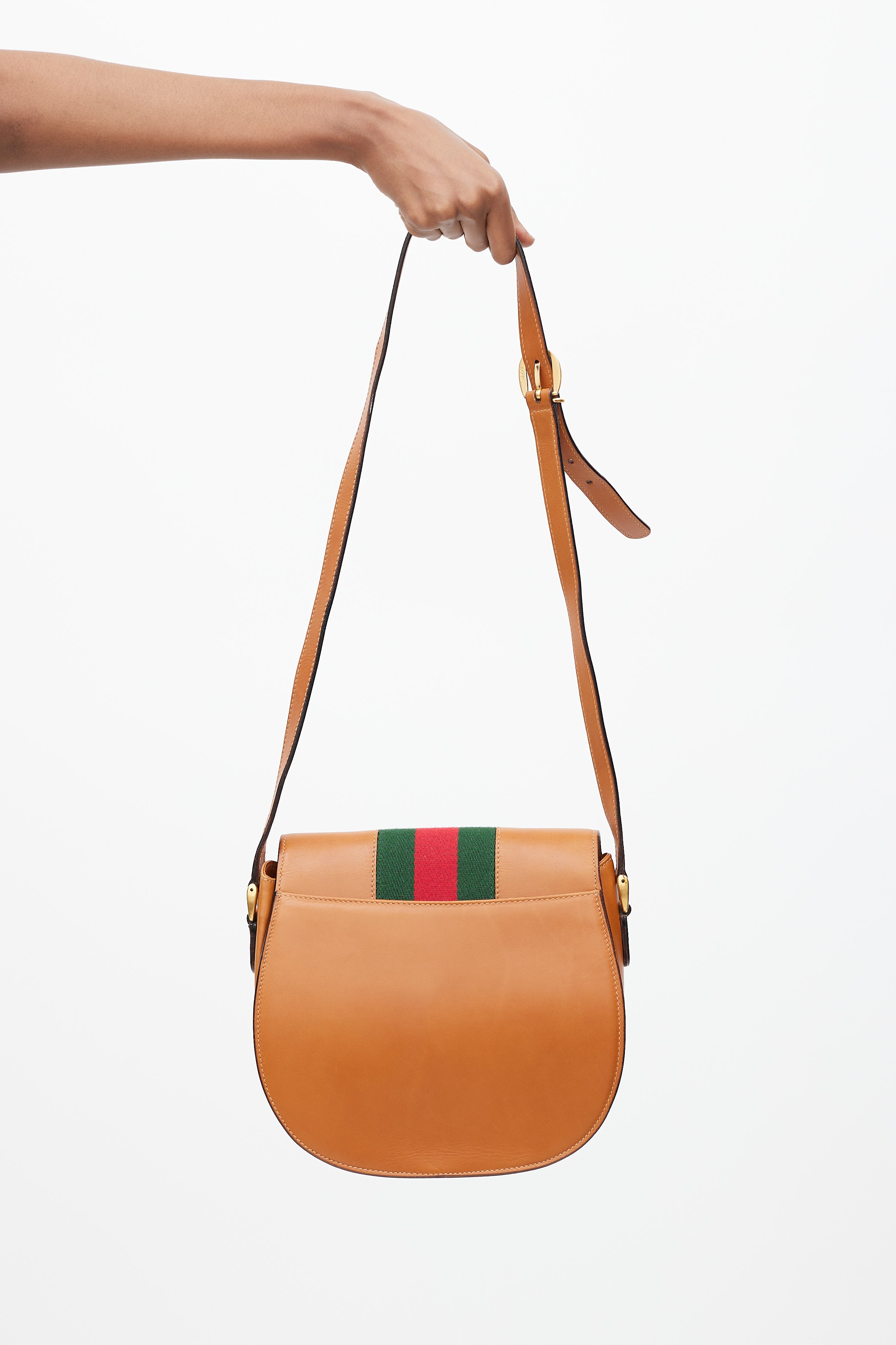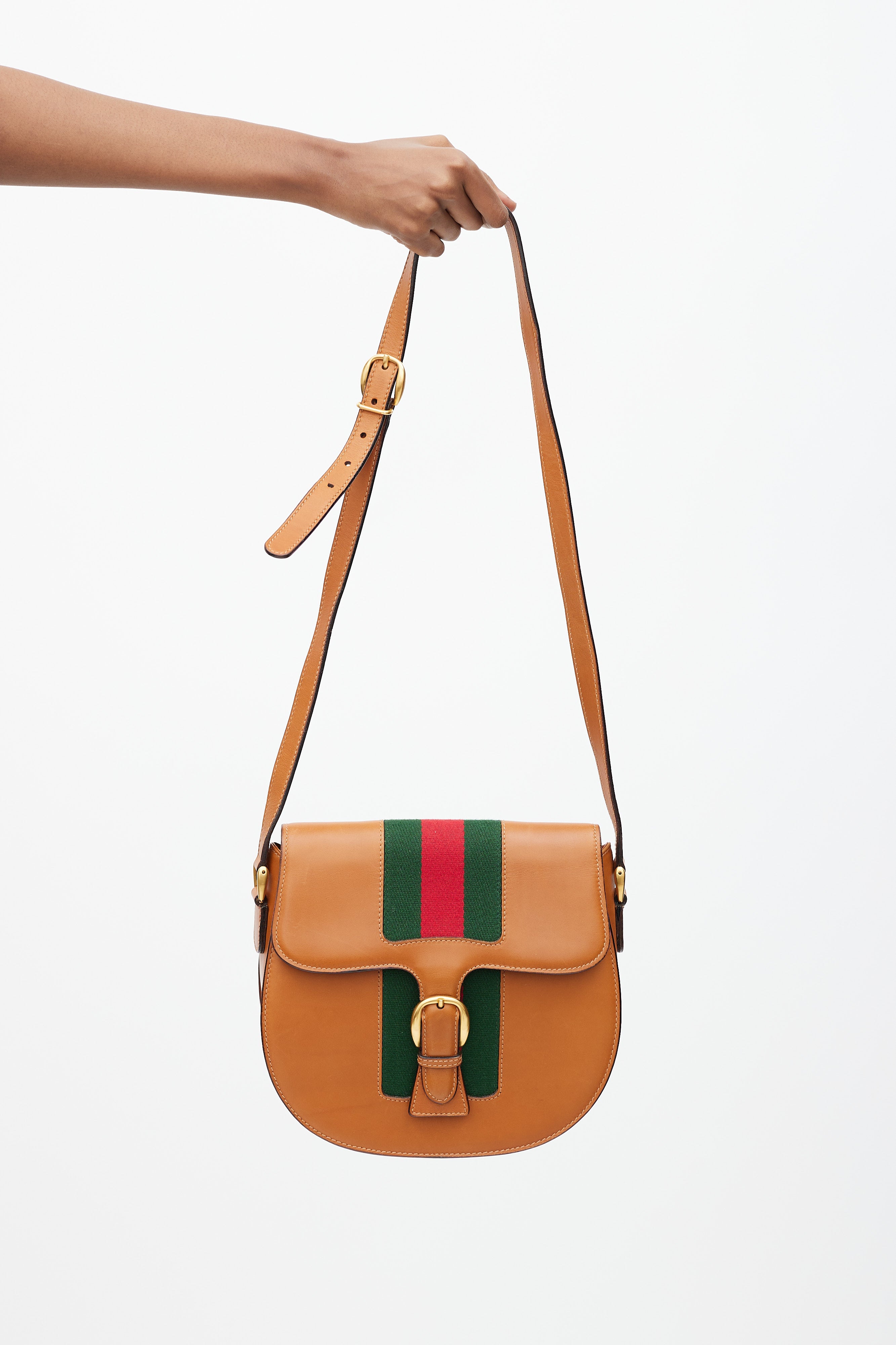 Pre-owned vintage Gucci brown leather Sherry Line bag featuring signature webbing at front, buckle with gold detail at front with snap button closure, adjustable crossbody strap with buckle detail, slip pocket at back, zip pocket at interior with logo pull tab, and interior lined with suede. Comes with original dust bag.