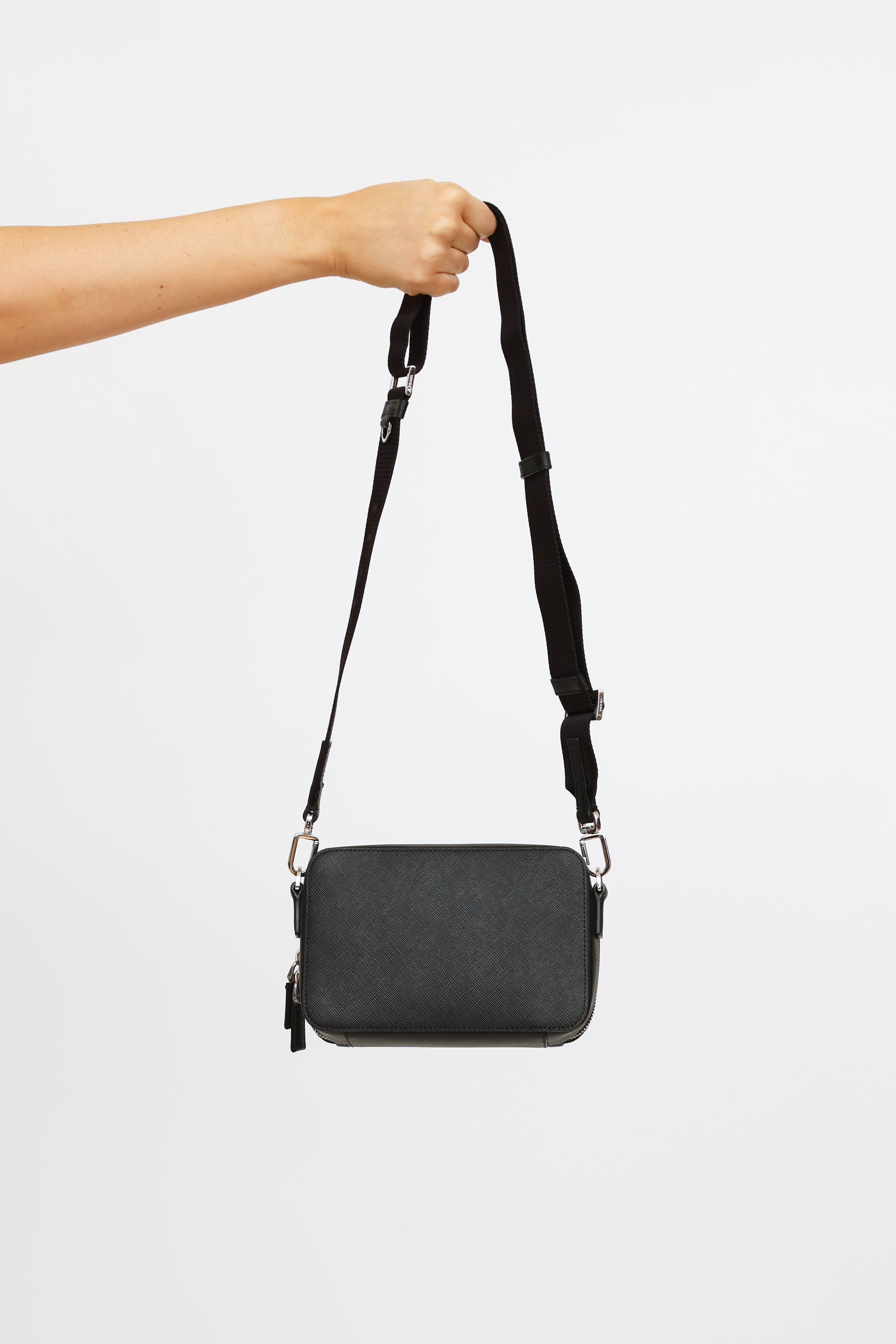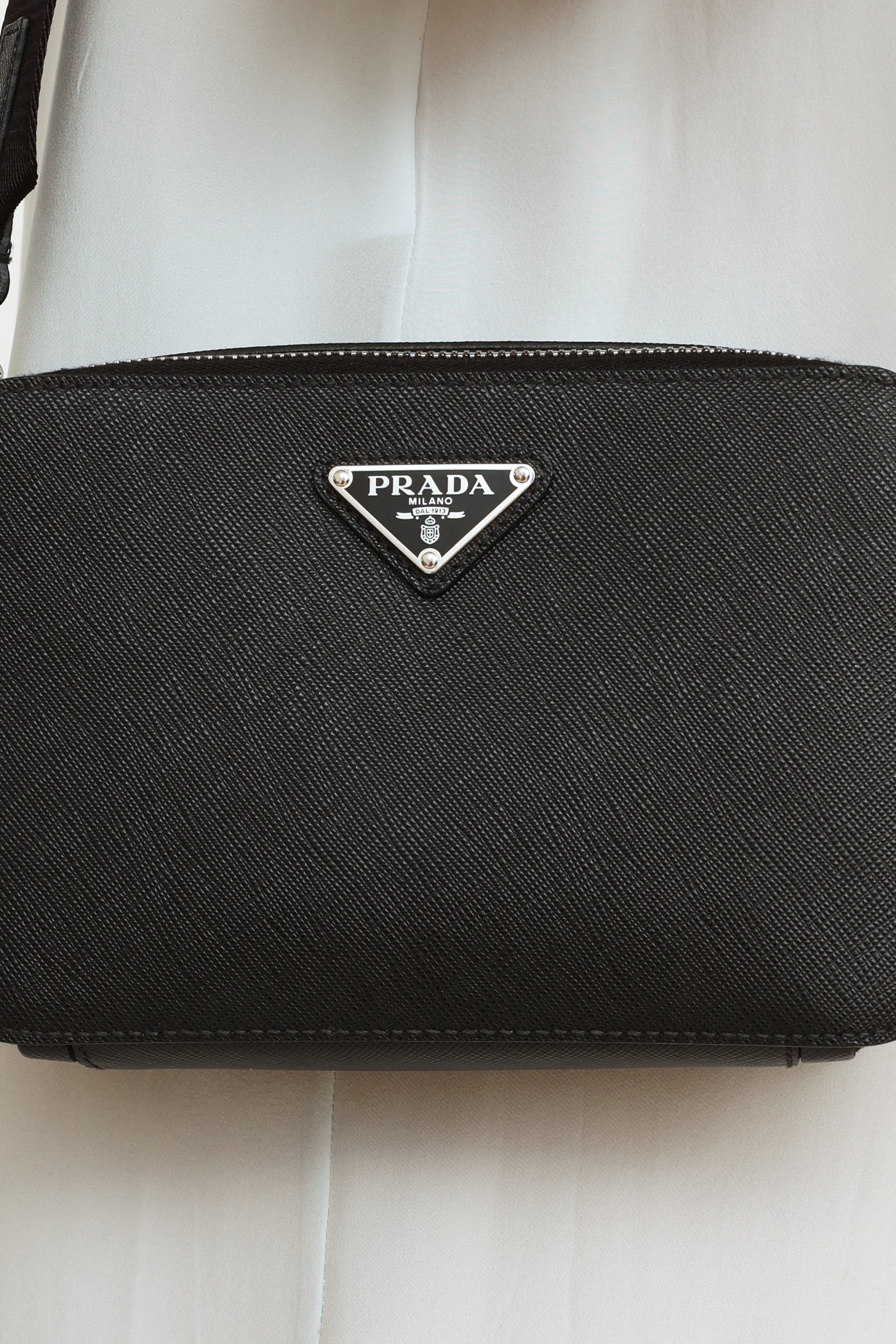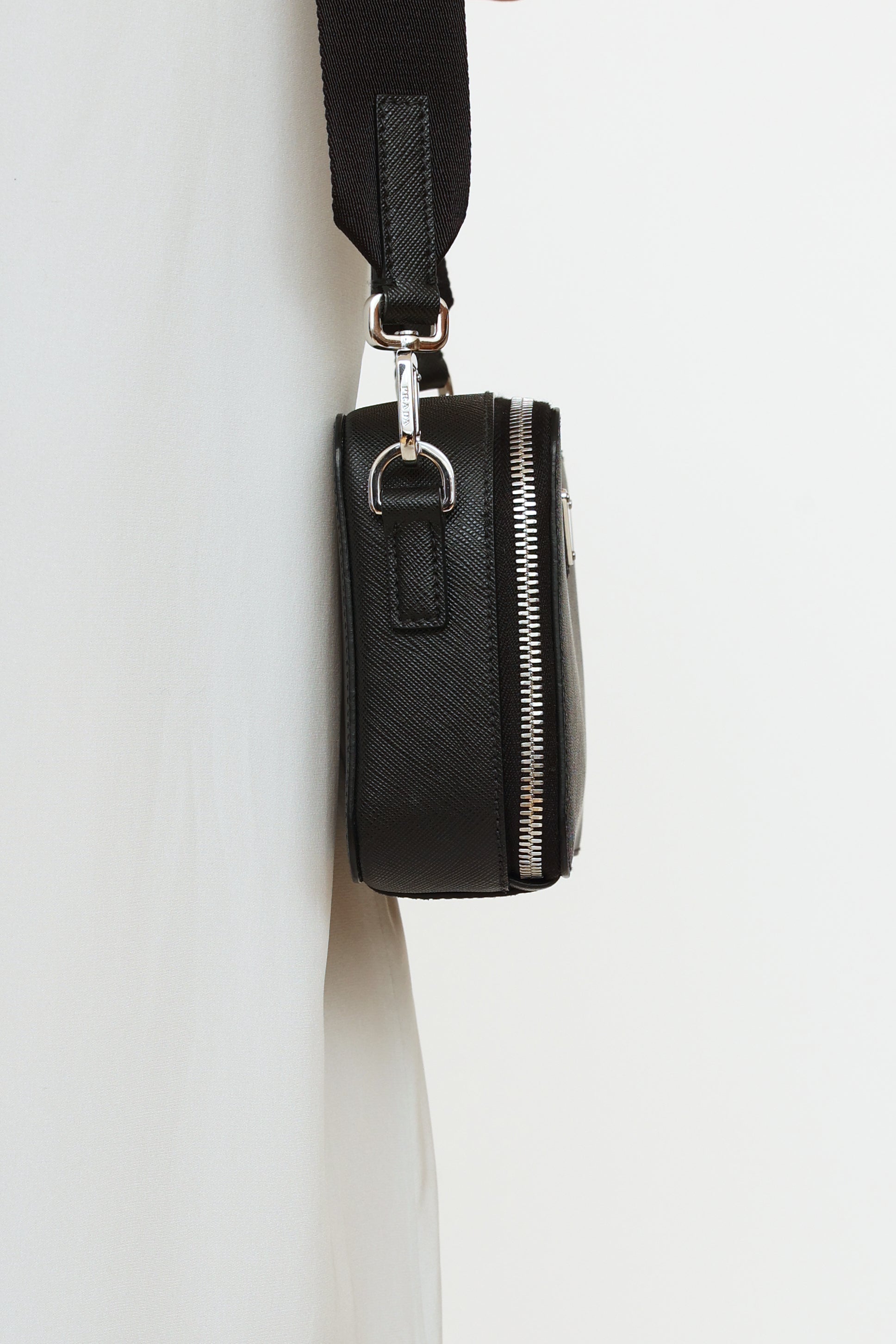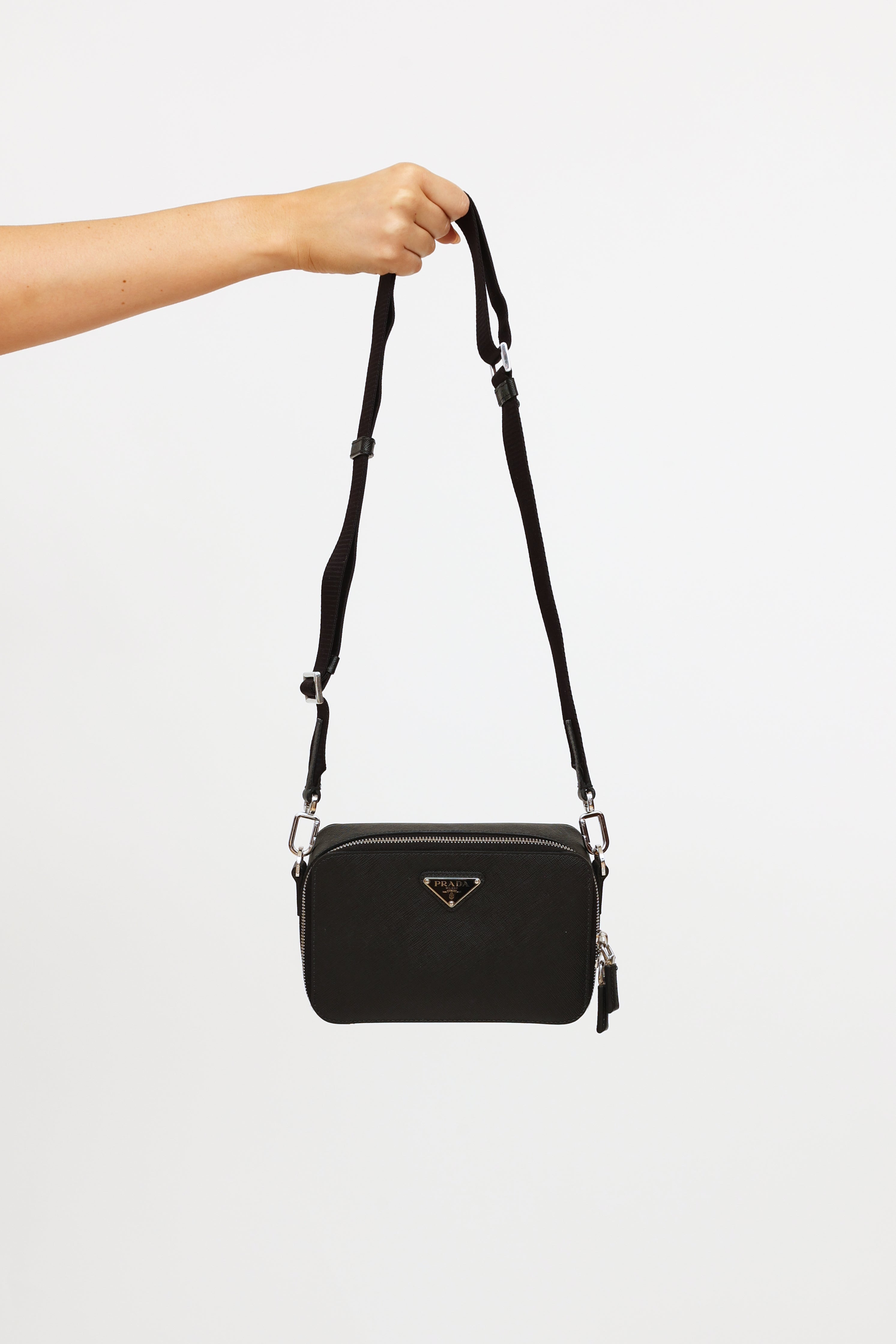 Pre-owned Prada black Saffiano Brique bag featuring a square shape, black Saffiano leather exterior, detachable and adjustable woven nylon shoulder strap with leather detailing, enamel metal triangle logo at front, wrap around zipper closure and silver-tone hardware. Interior features one main compartment, one patch pocket and Prada logo nylon lining.