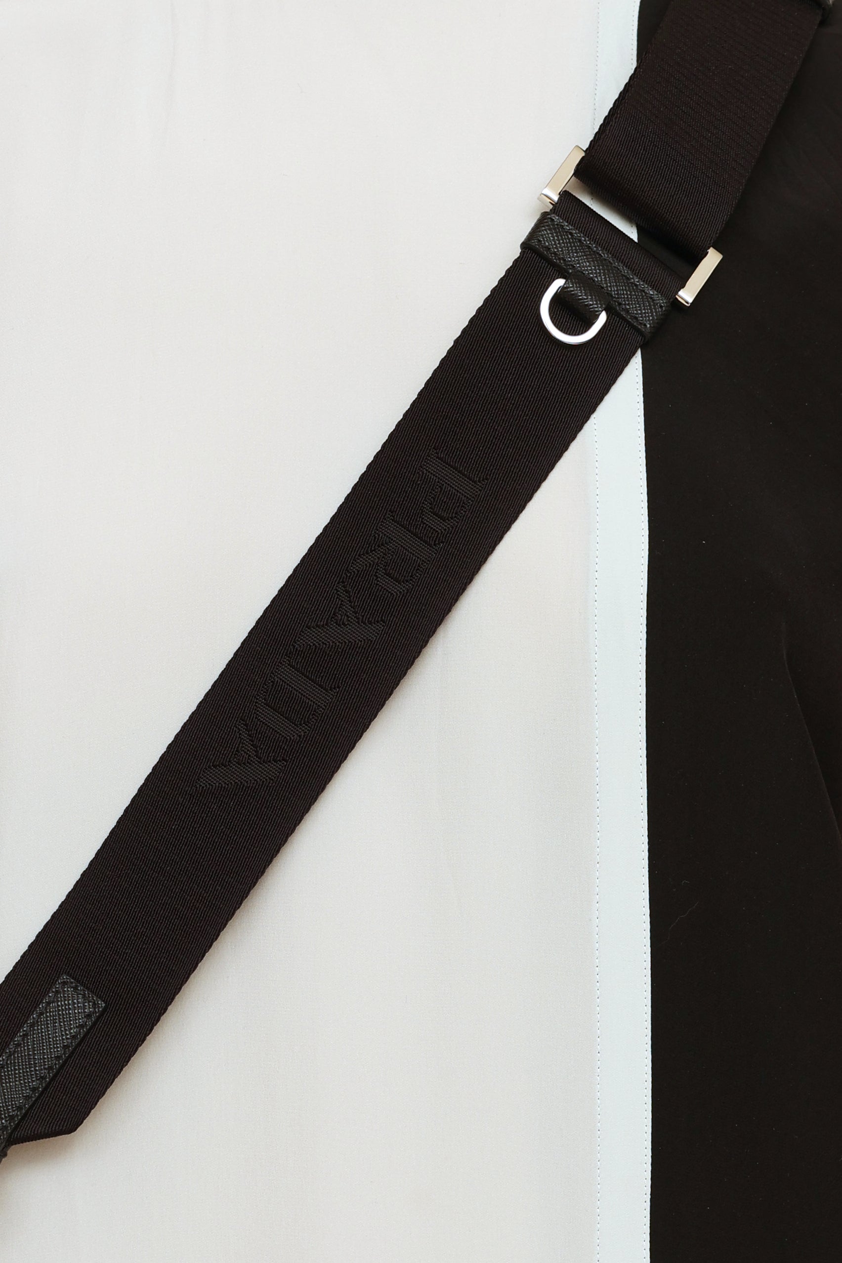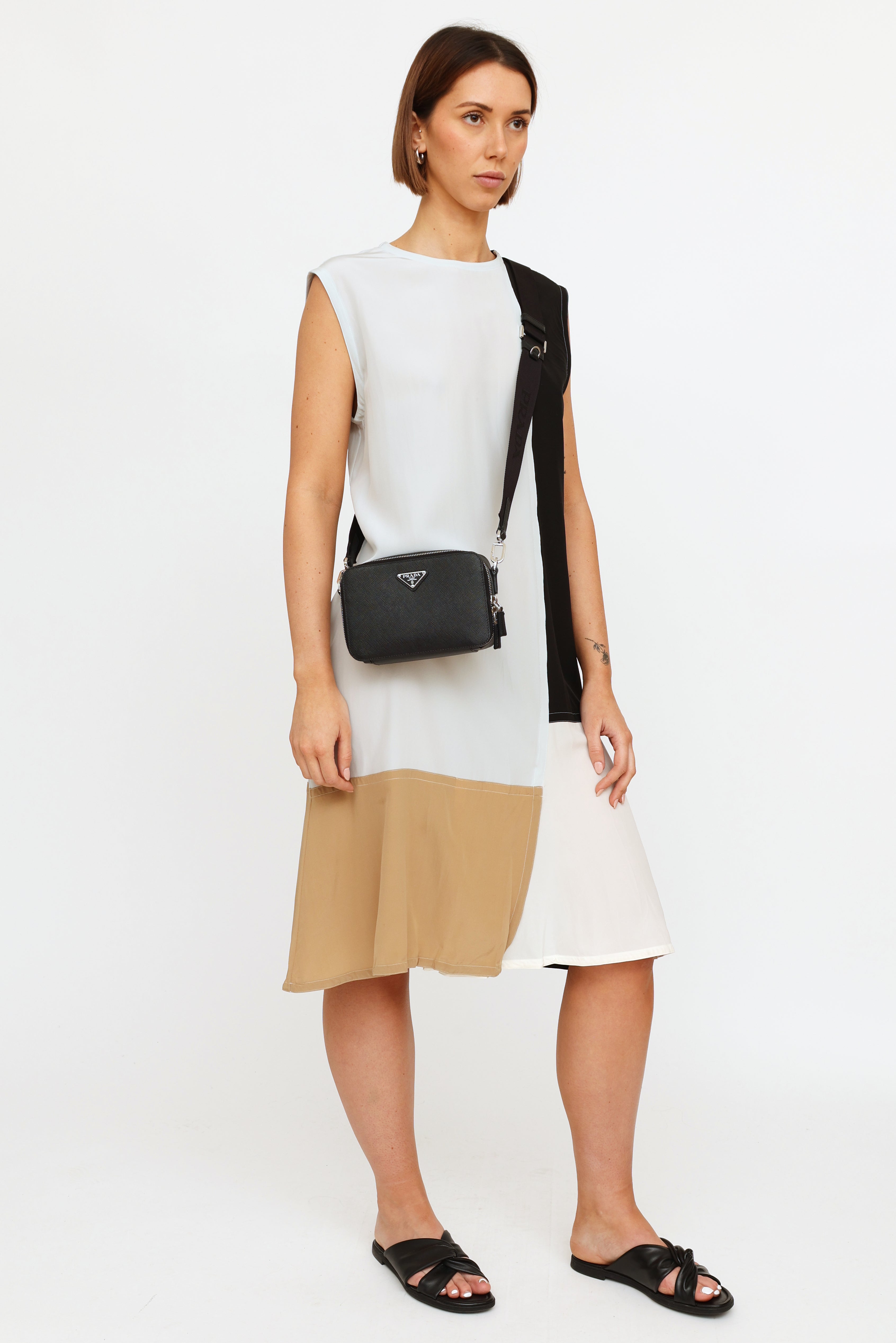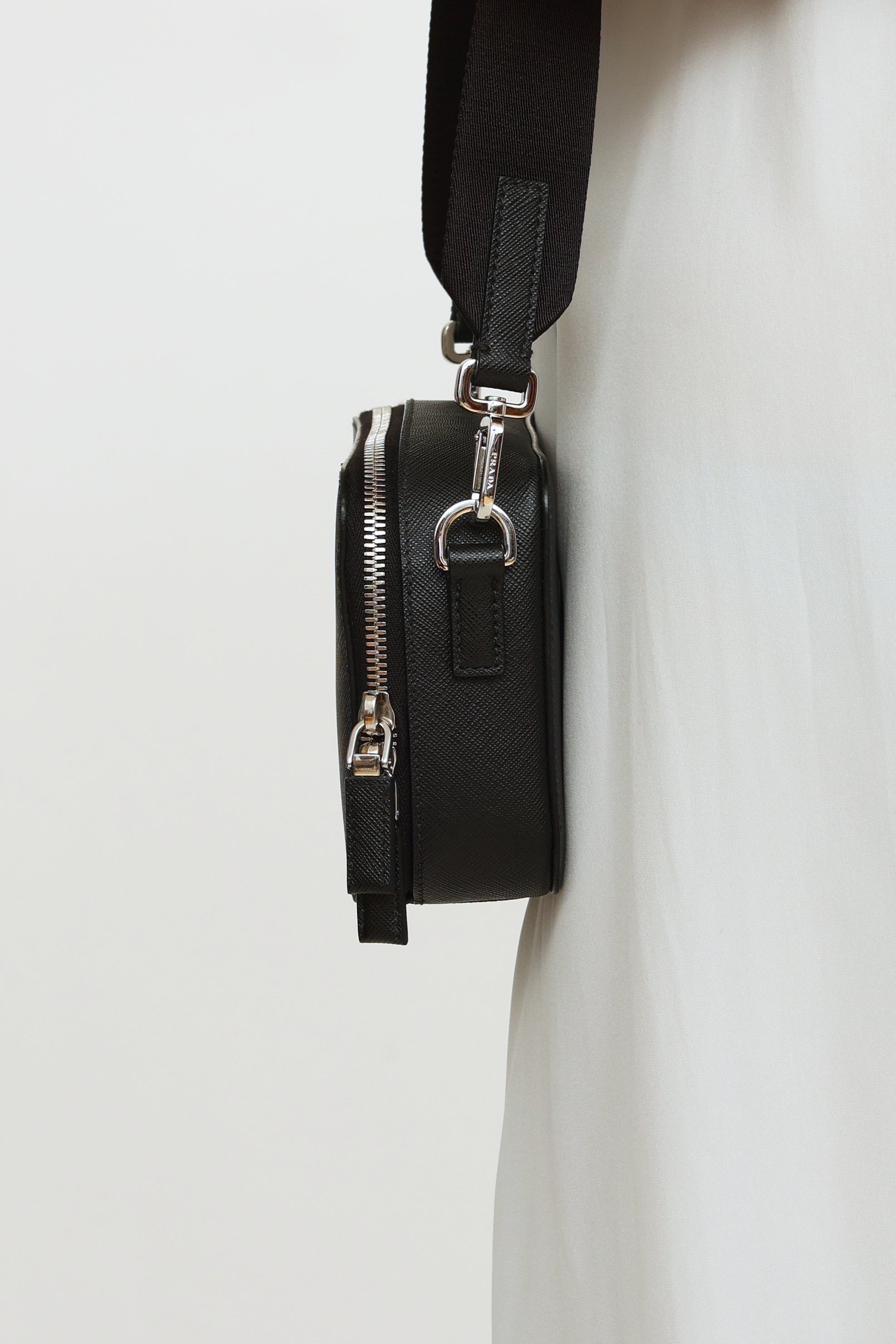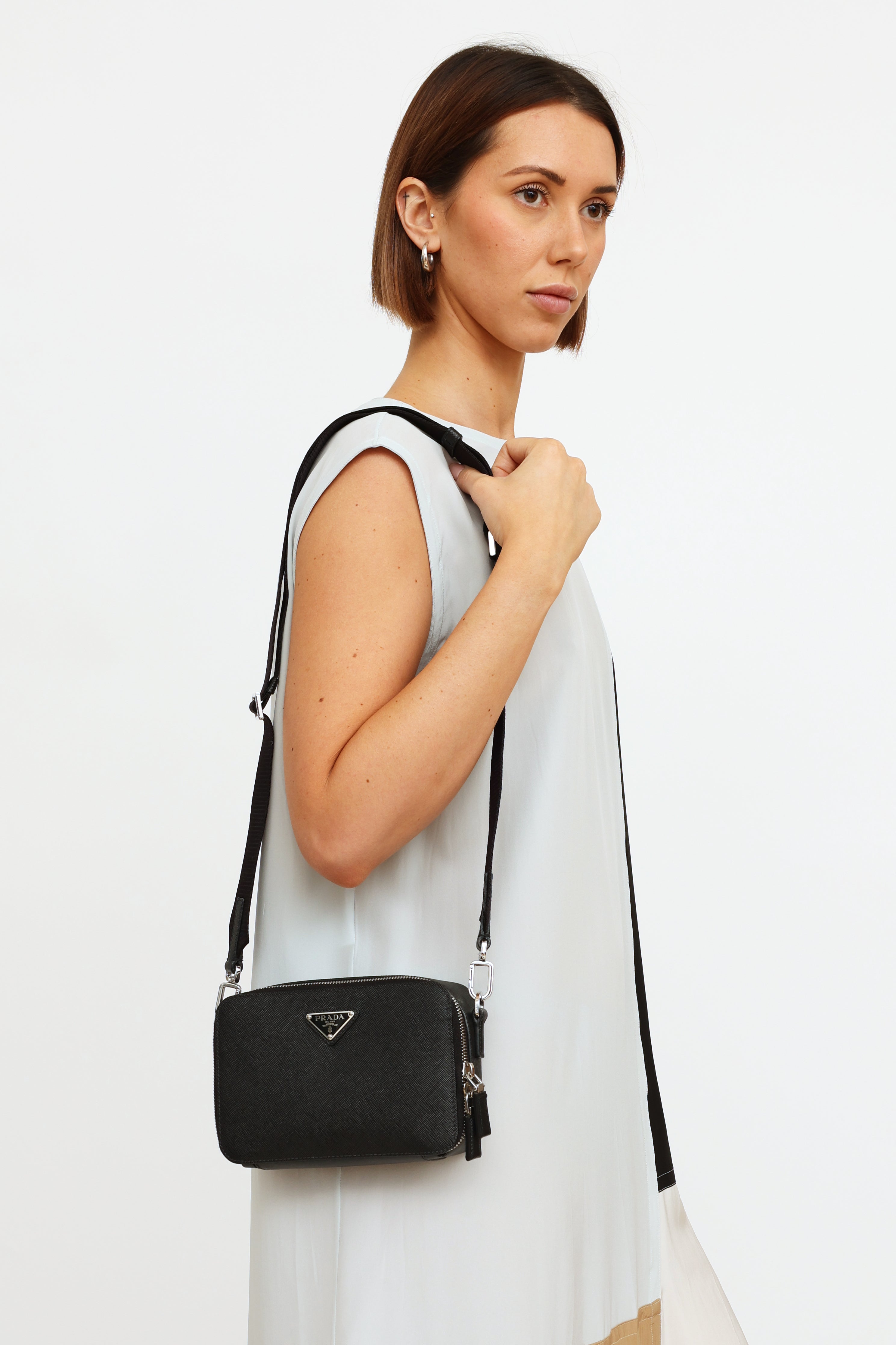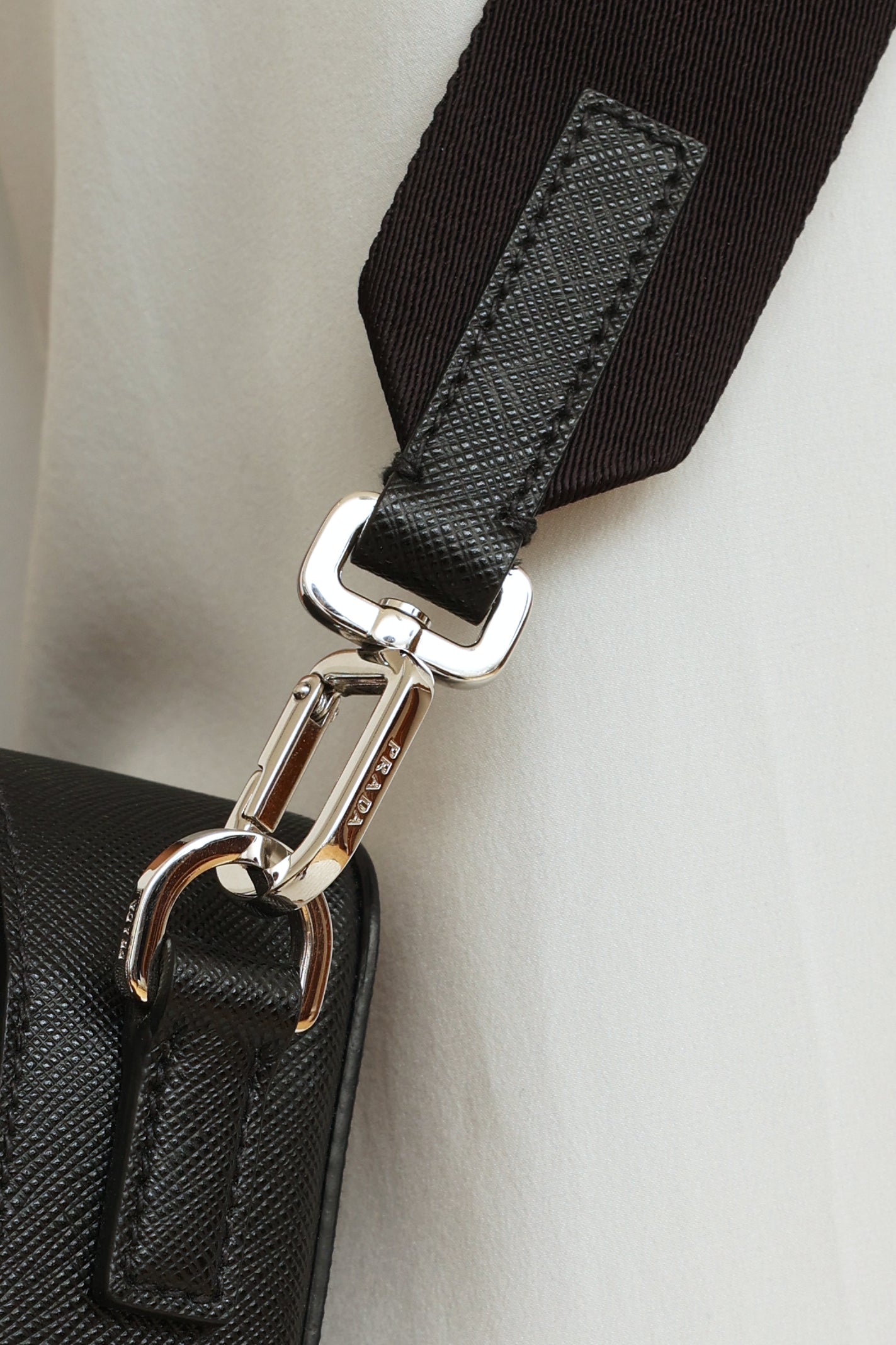 Pre-owned Prada black Saffiano Brique bag featuring a square shape, black Saffiano leather exterior, detachable and adjustable woven nylon shoulder strap with leather detailing, enamel metal triangle logo at front, wrap around zipper closure and silver-tone hardware. Interior features one main compartment, one patch pocket and Prada logo nylon lining.