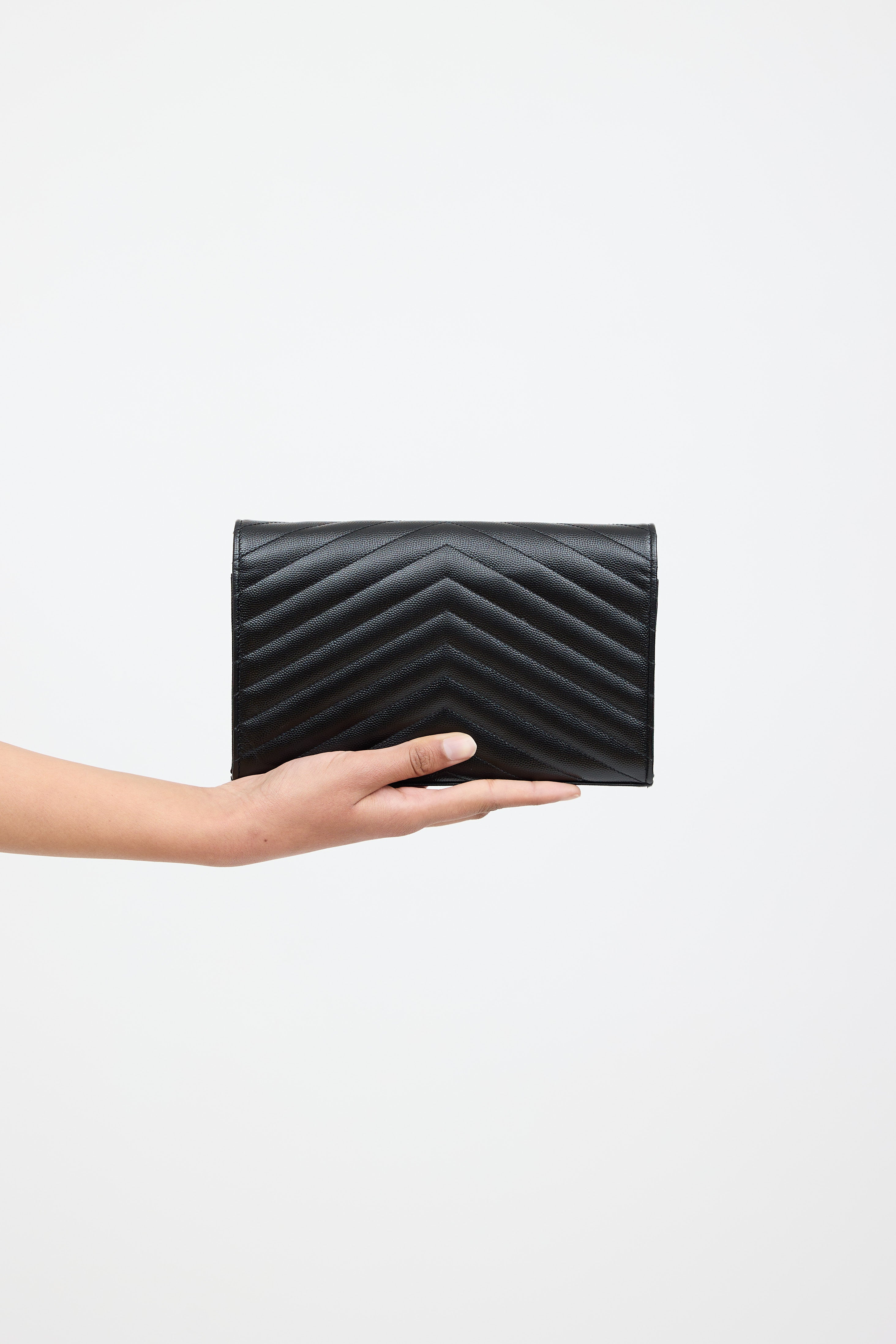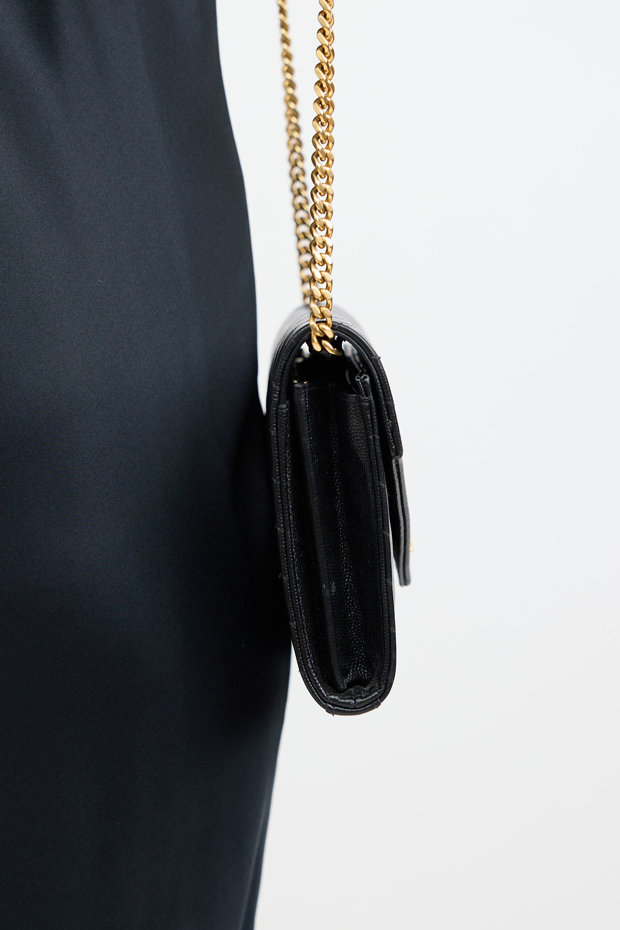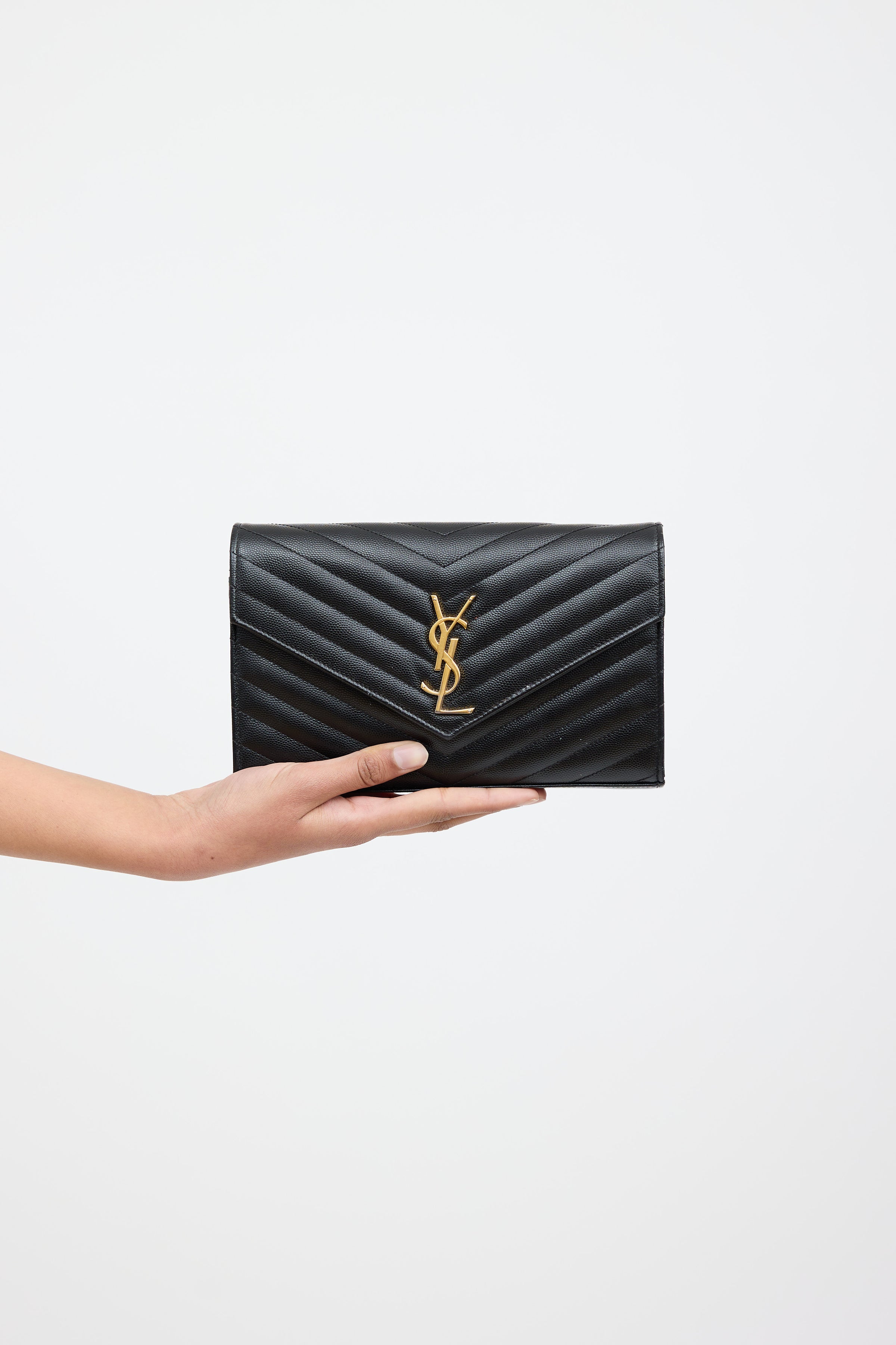Pre-owned Saint Laurent black Cassandre chain wallet bag featuring chevron quilted Grain De Poudre leather, gold tone Cassandre logo at front, detachable gold tone chain-link shoulder strap, front flap with snap closure, one main compartment with one zip pocket, two bill slots, and 20 card slots.