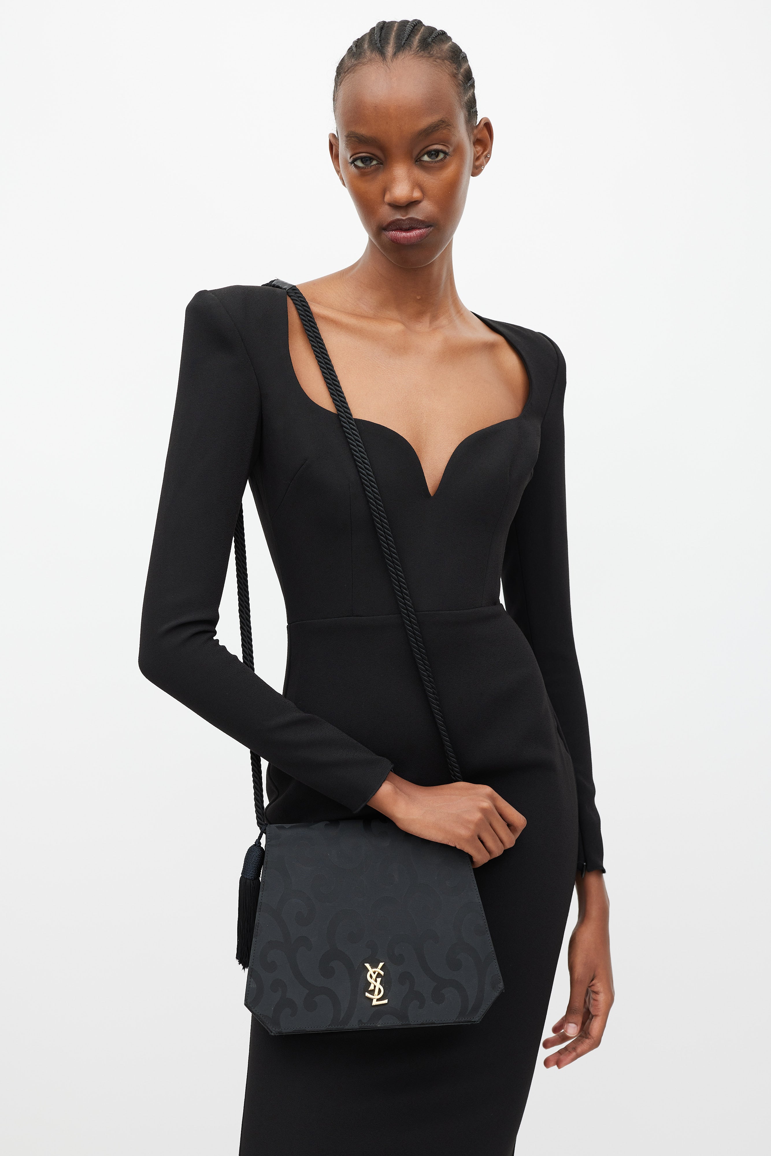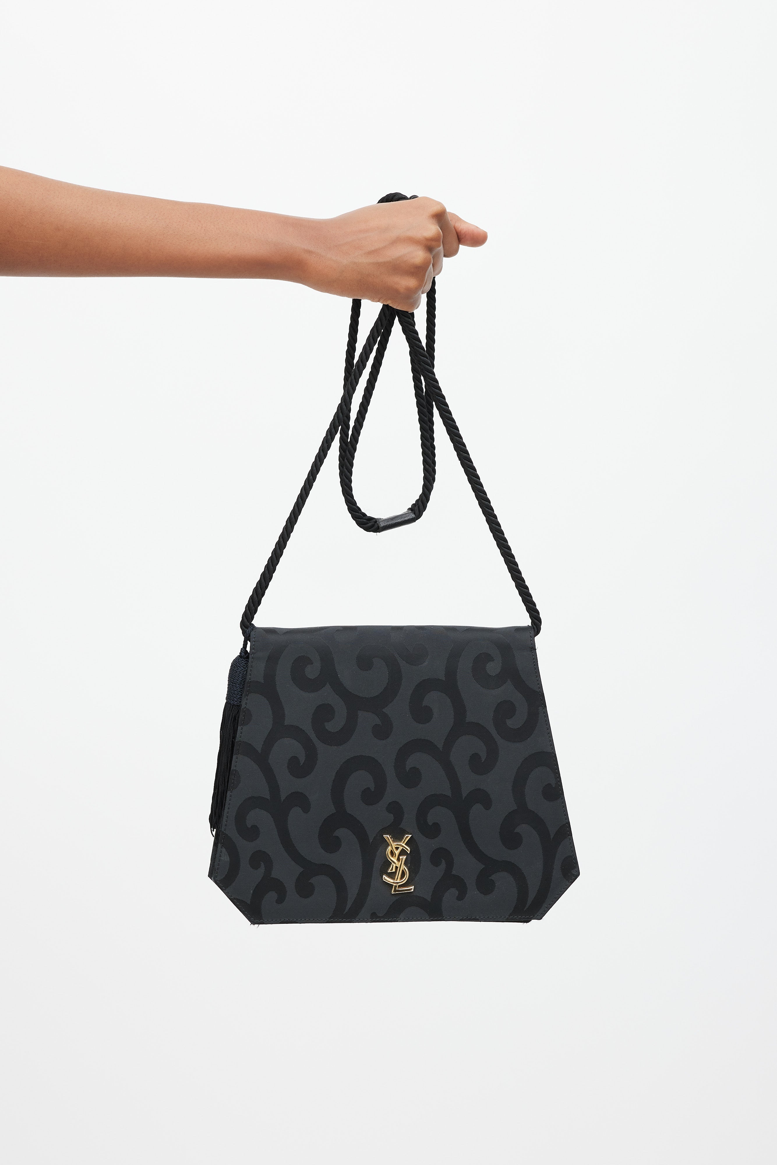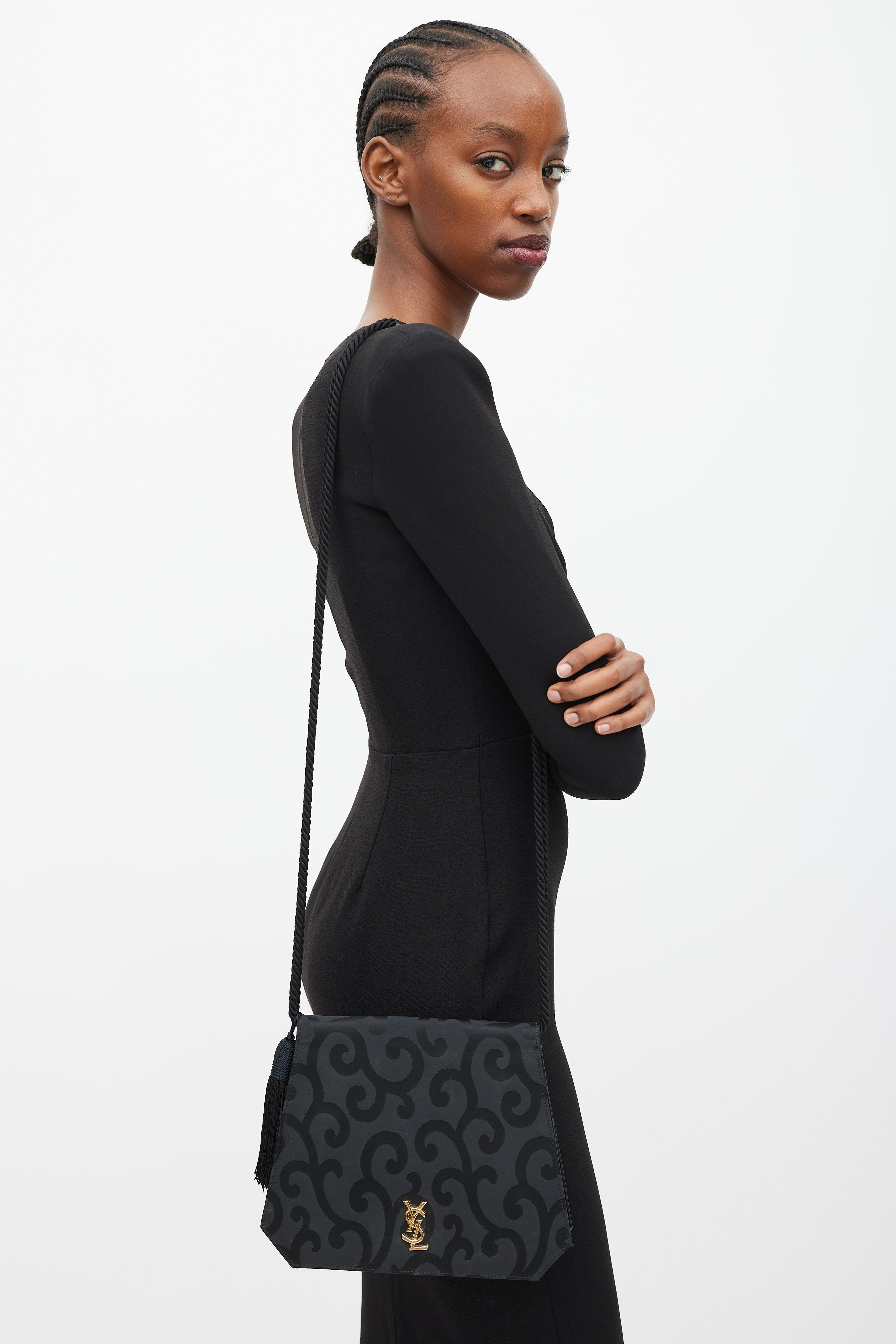 Pre-owned vintage Yves Saint Laurent black satin crossbody bag featuring damask satin with swirl motif throughout, gold tone Cassandre logo at front, front snap button closure, fixed cord straps, black tassel at side, black leather panel at sides, and zipped wall pocket at interior.