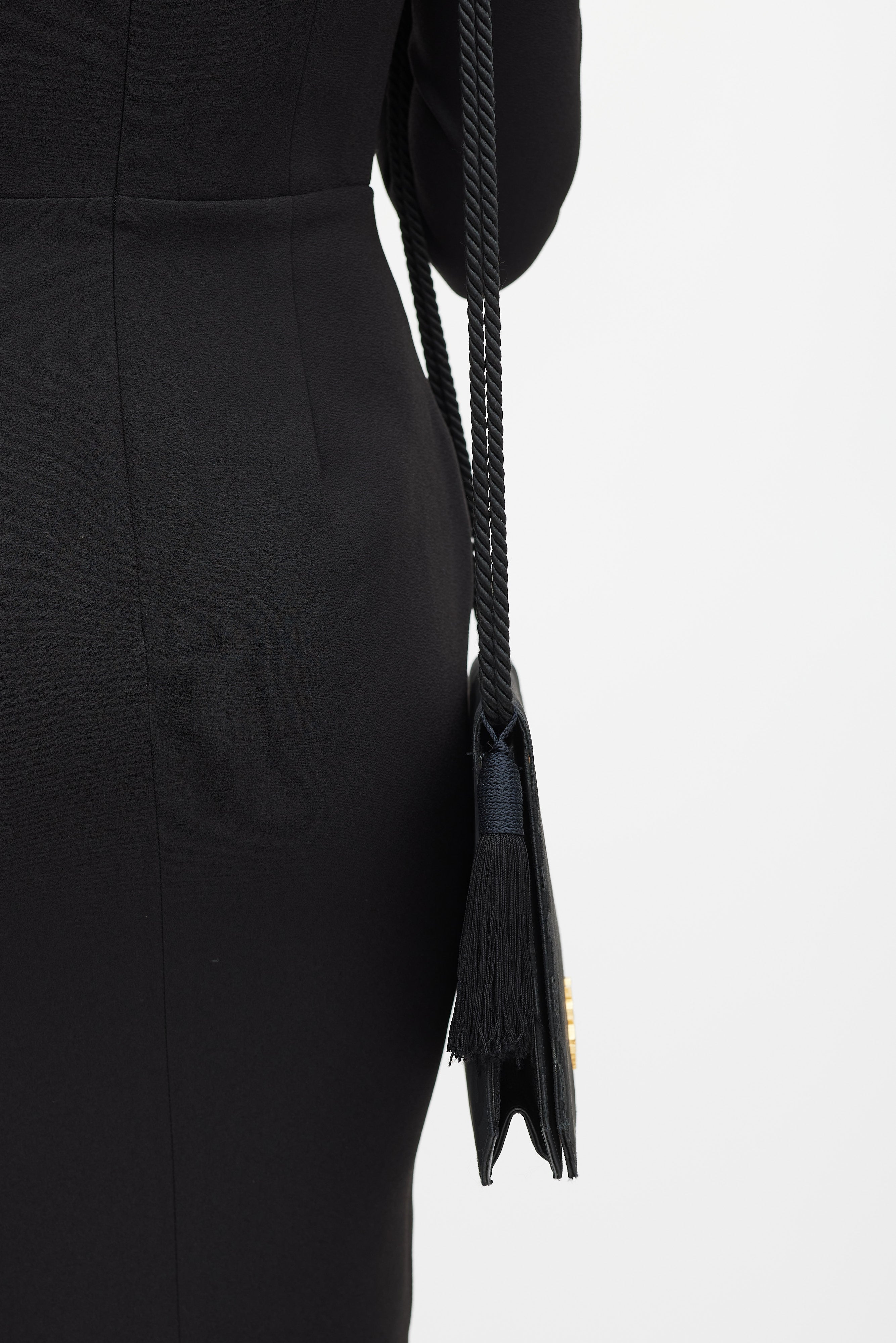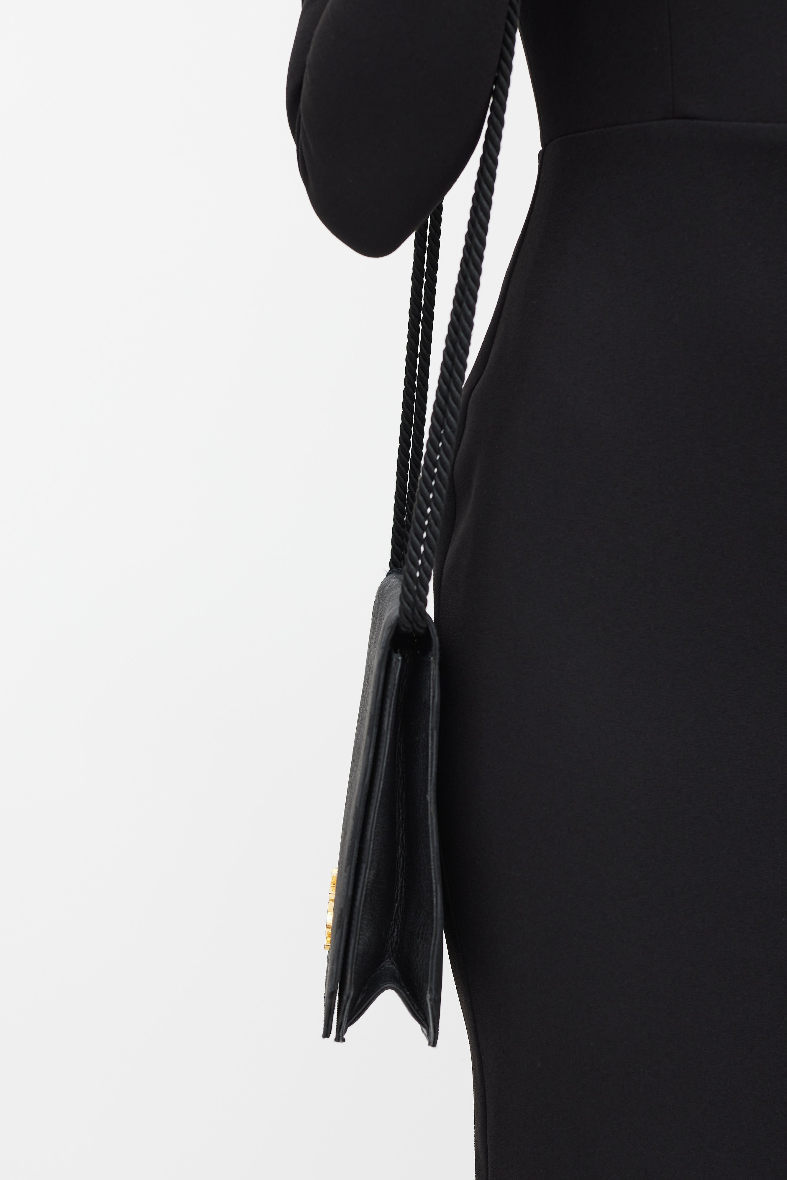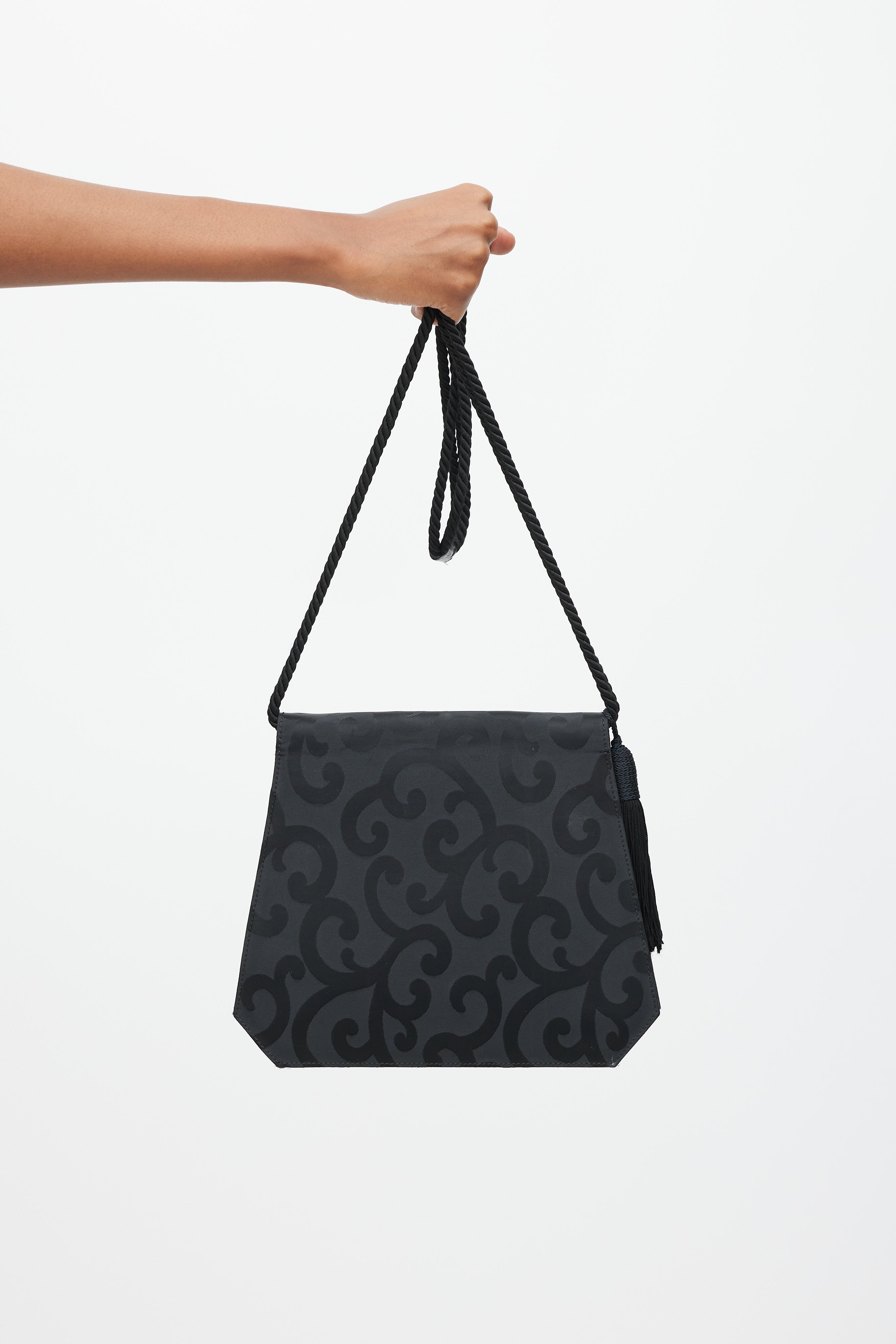 Pre-owned vintage Yves Saint Laurent black satin crossbody bag featuring damask satin with swirl motif throughout, gold tone Cassandre logo at front, front snap button closure, fixed cord straps, black tassel at side, black leather panel at sides, and zipped wall pocket at interior.