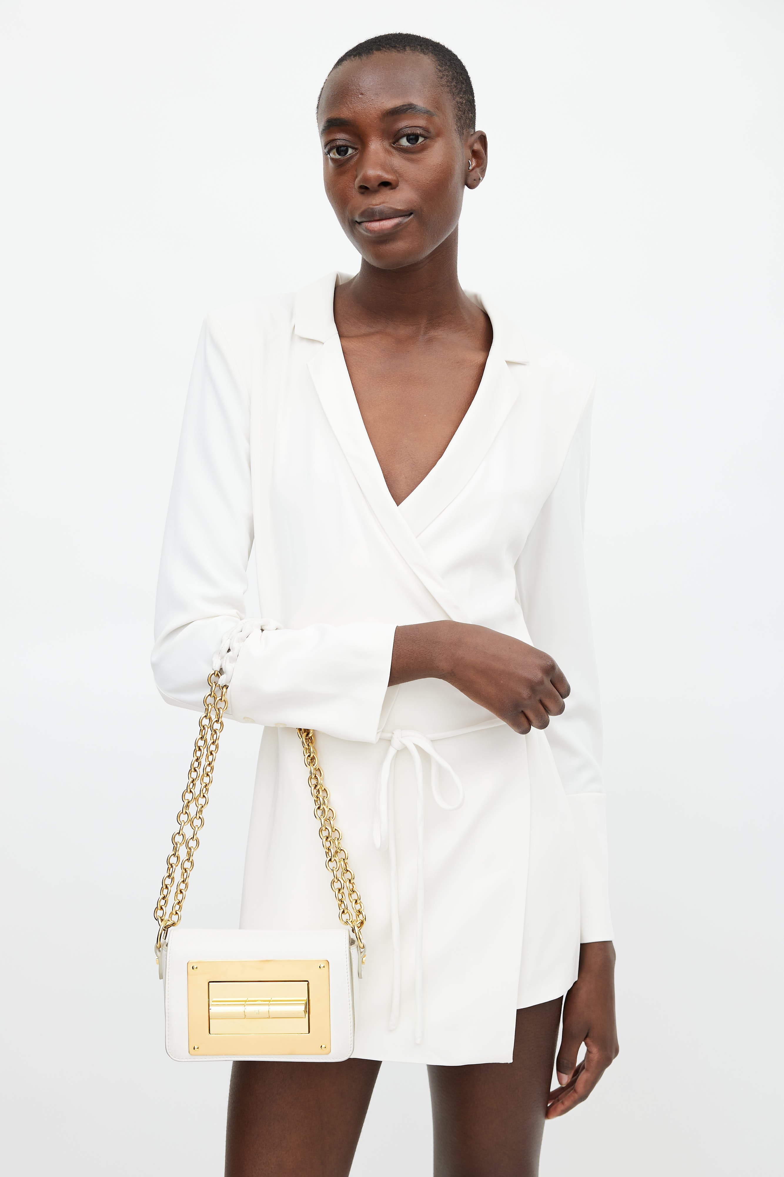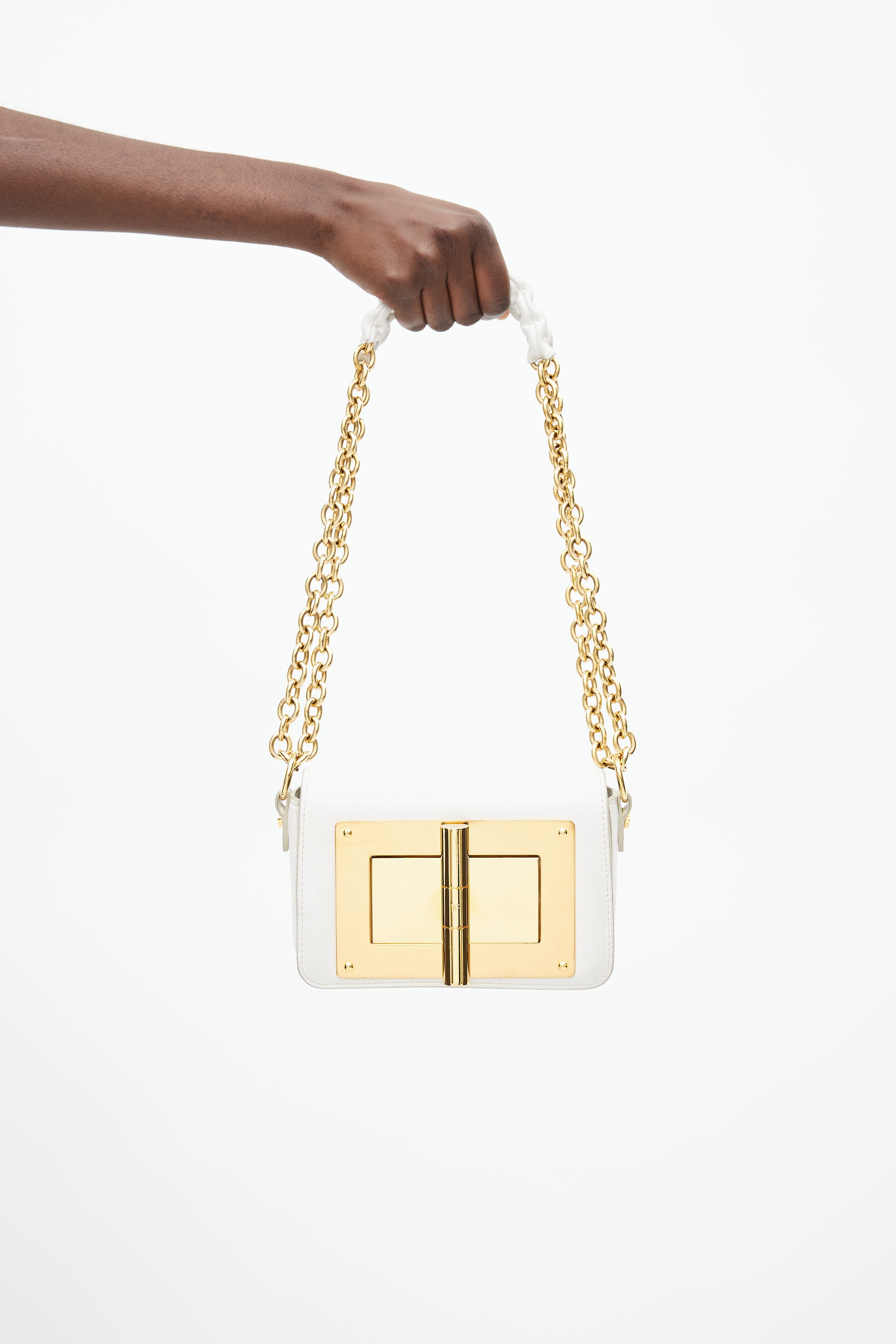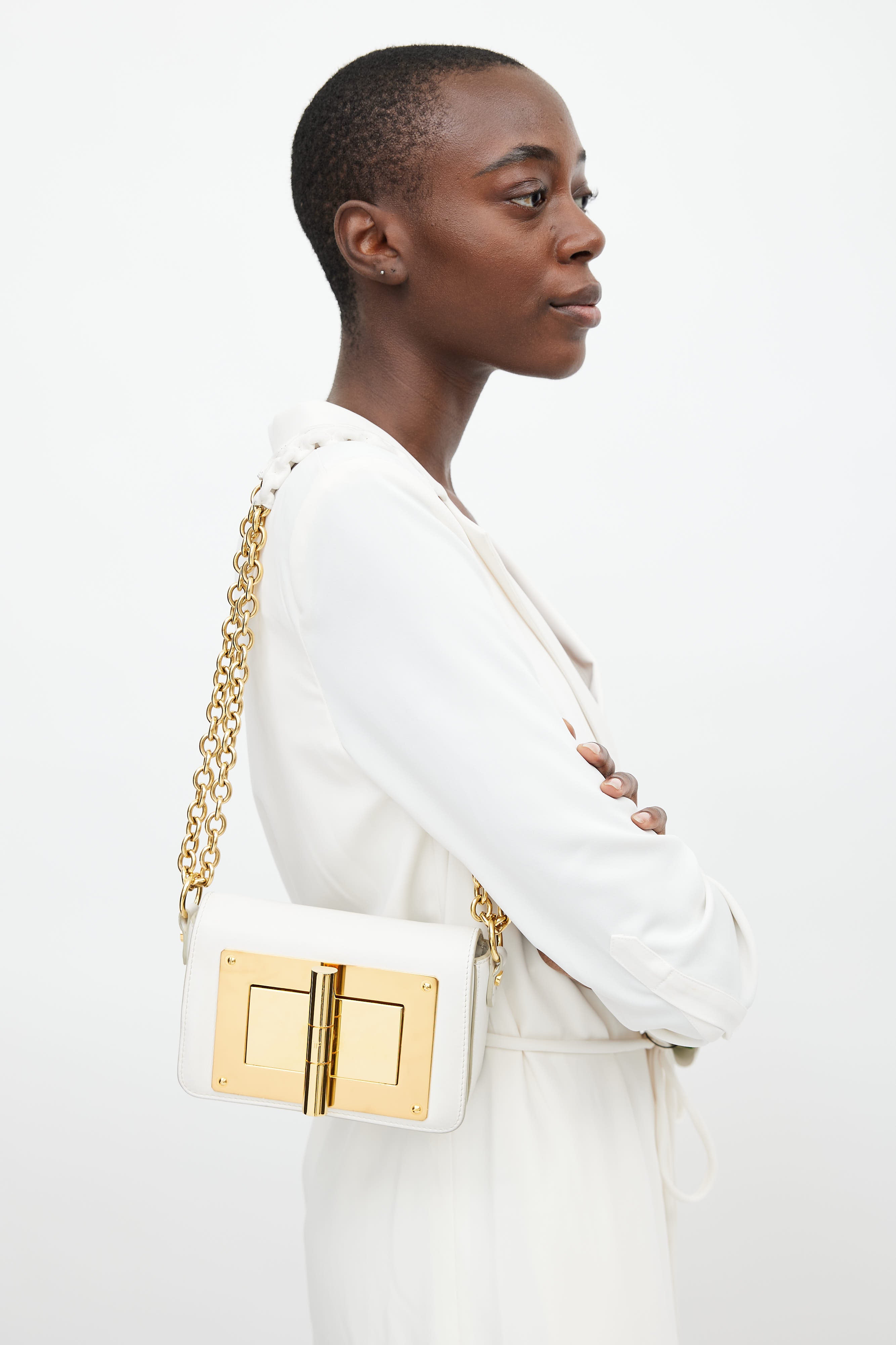 Pre-owned Tom Ford white Natalia shoulder bags featuring gold tone hardware, oversized turnstile lock at face with engraved logo, textured leather and chain link shoulder straps, lined main compartment, and interior slip pocket.