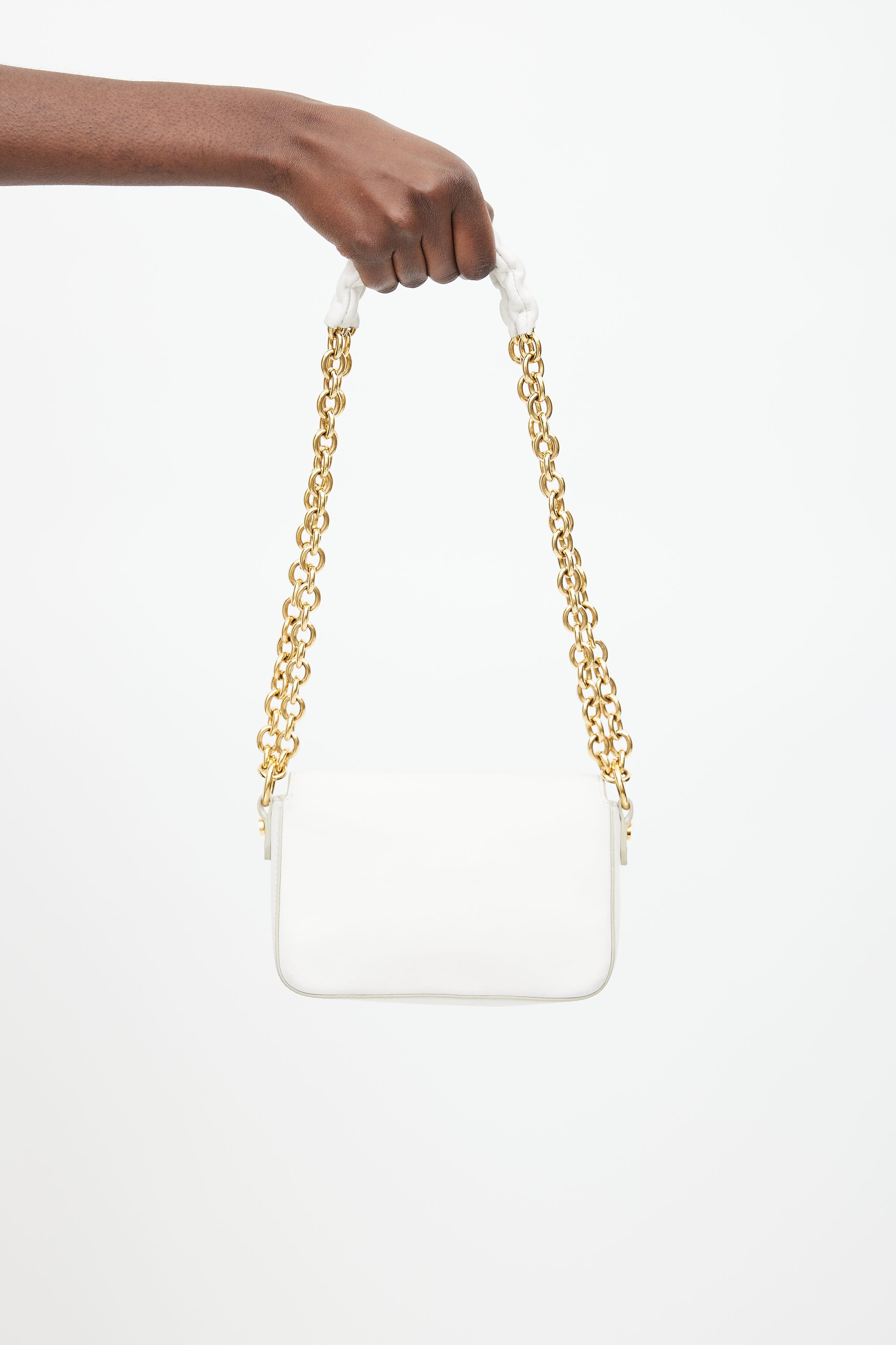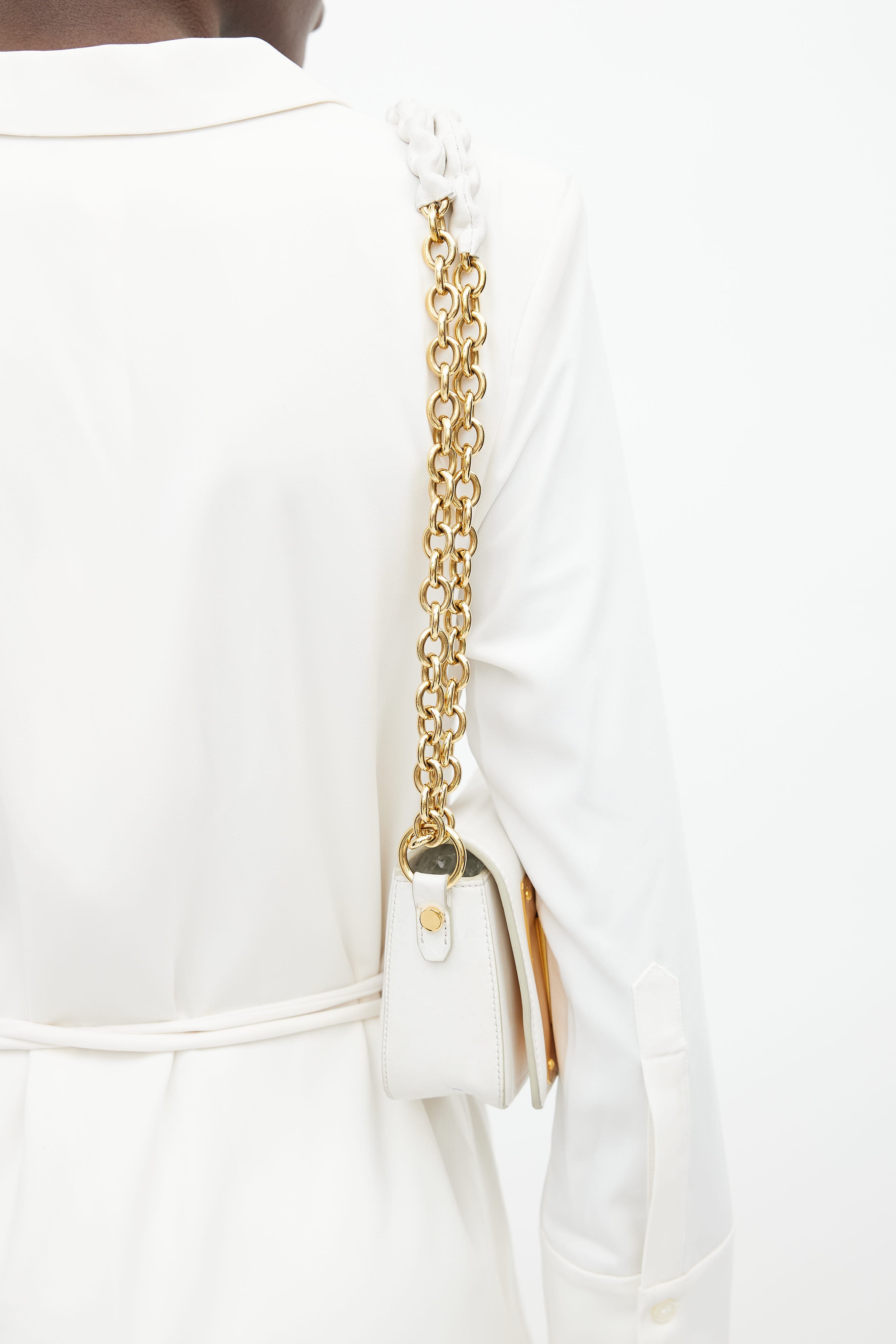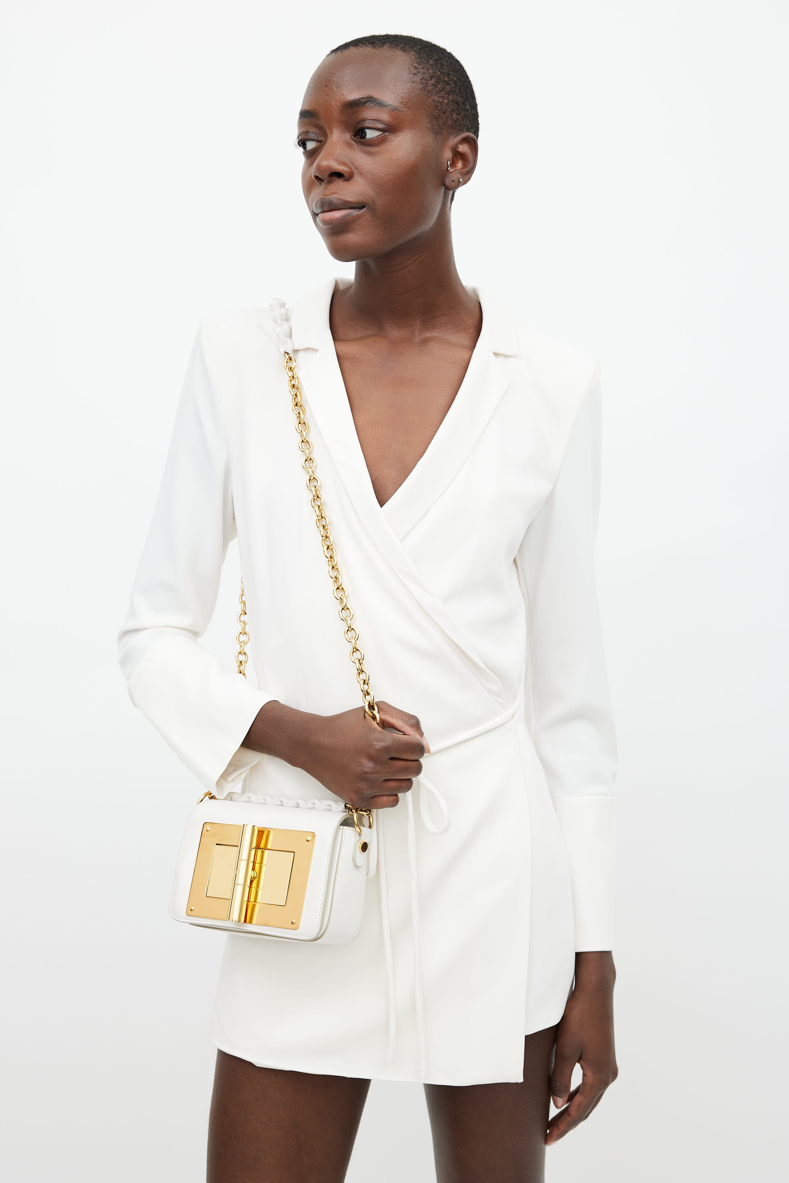 Pre-owned Tom Ford white Natalia shoulder bags featuring gold tone hardware, oversized turnstile lock at face with engraved logo, textured leather and chain link shoulder straps, lined main compartment, and interior slip pocket.