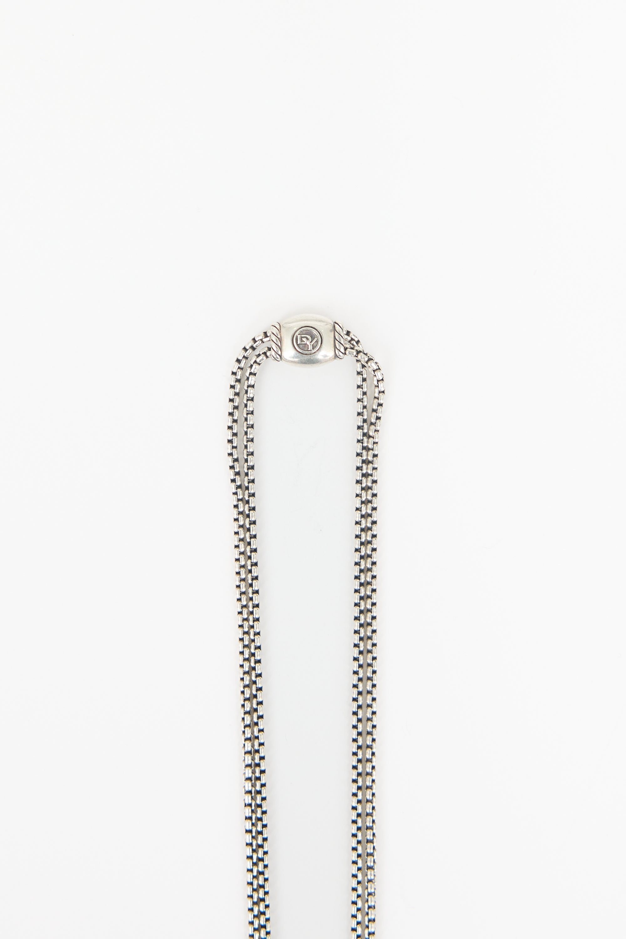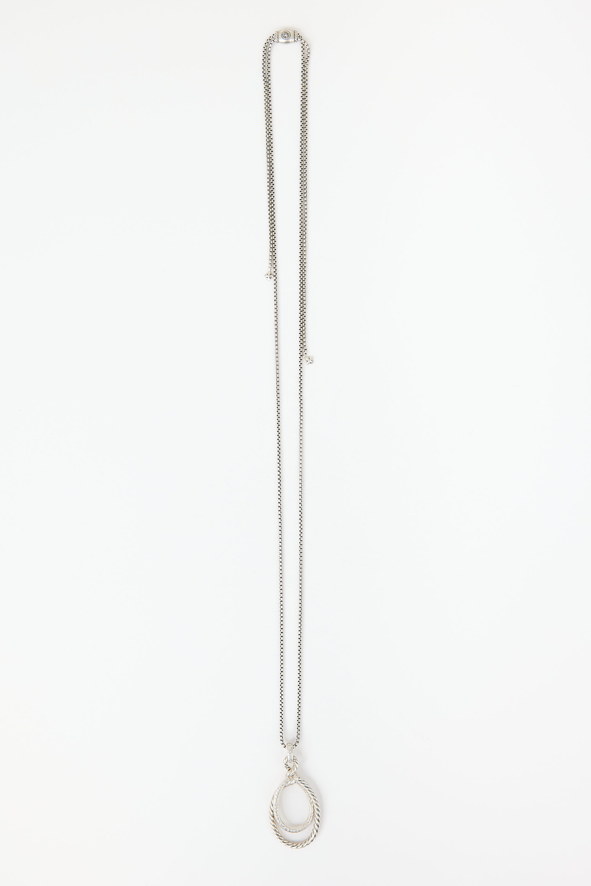 Pre-owned David Yurman sterling silver Continuance necklace featuring a multi loop cable pendant with inset diamonds, box chain band, and Quatrefoil ends. Stamped with "925". Comes with original dust bag.