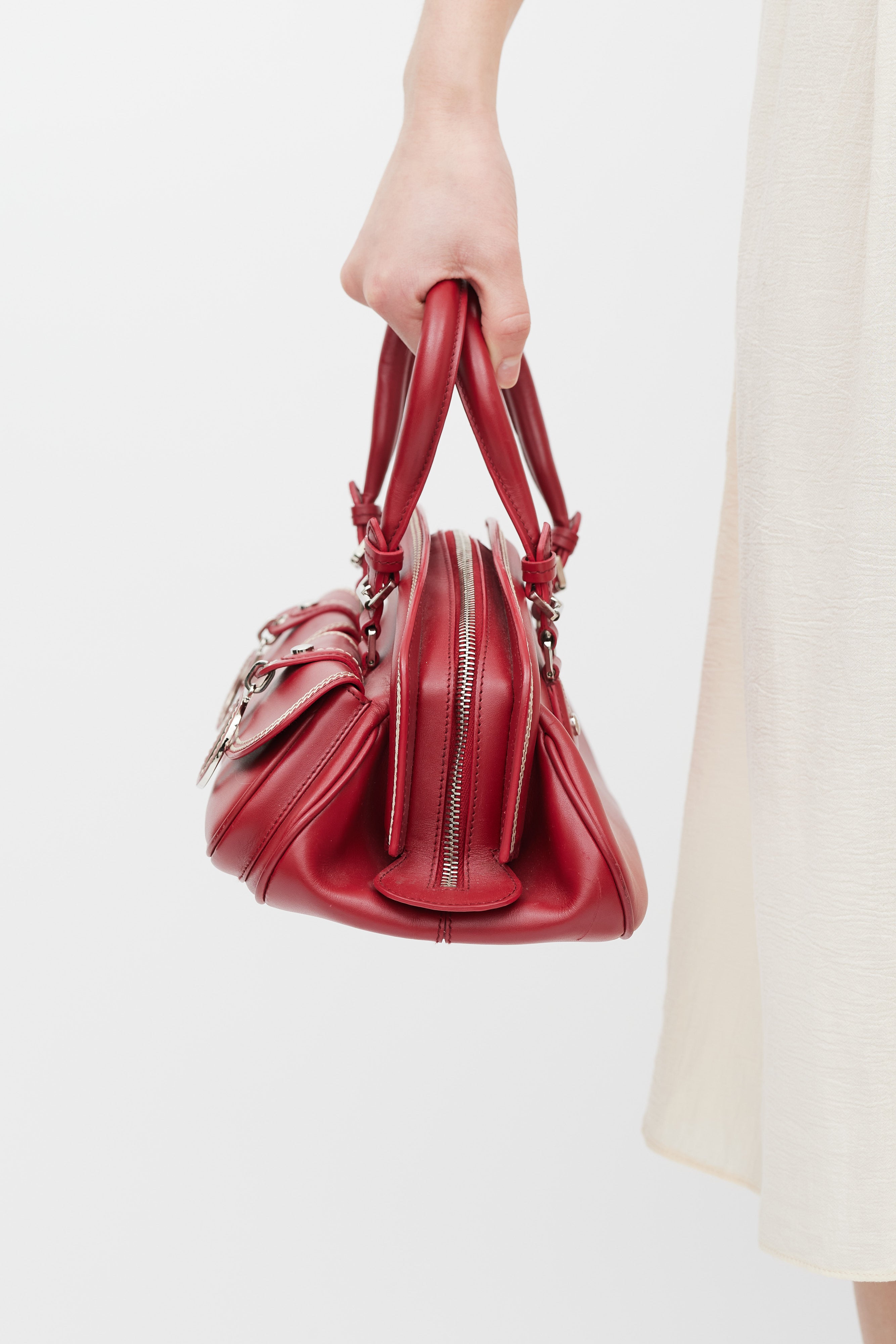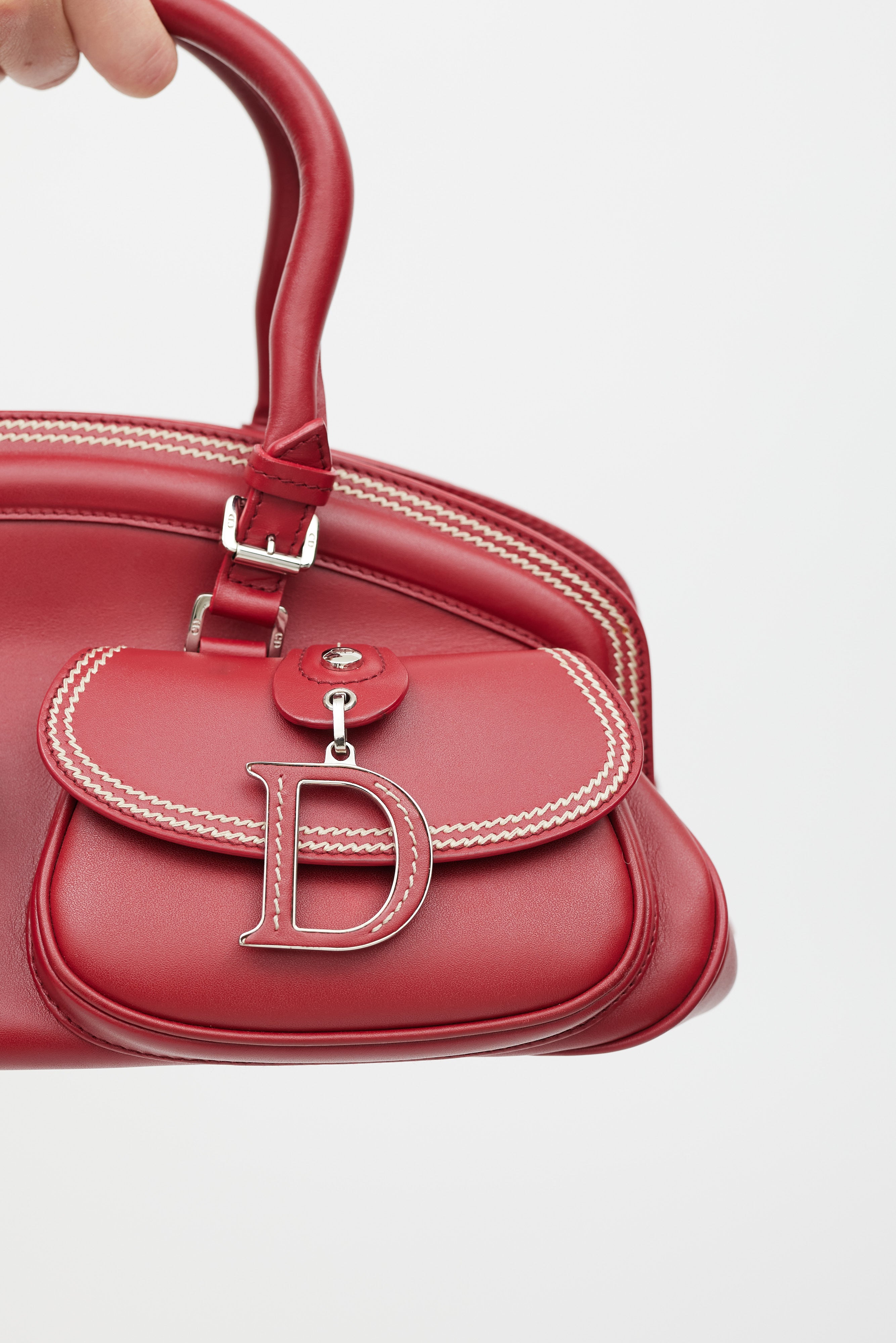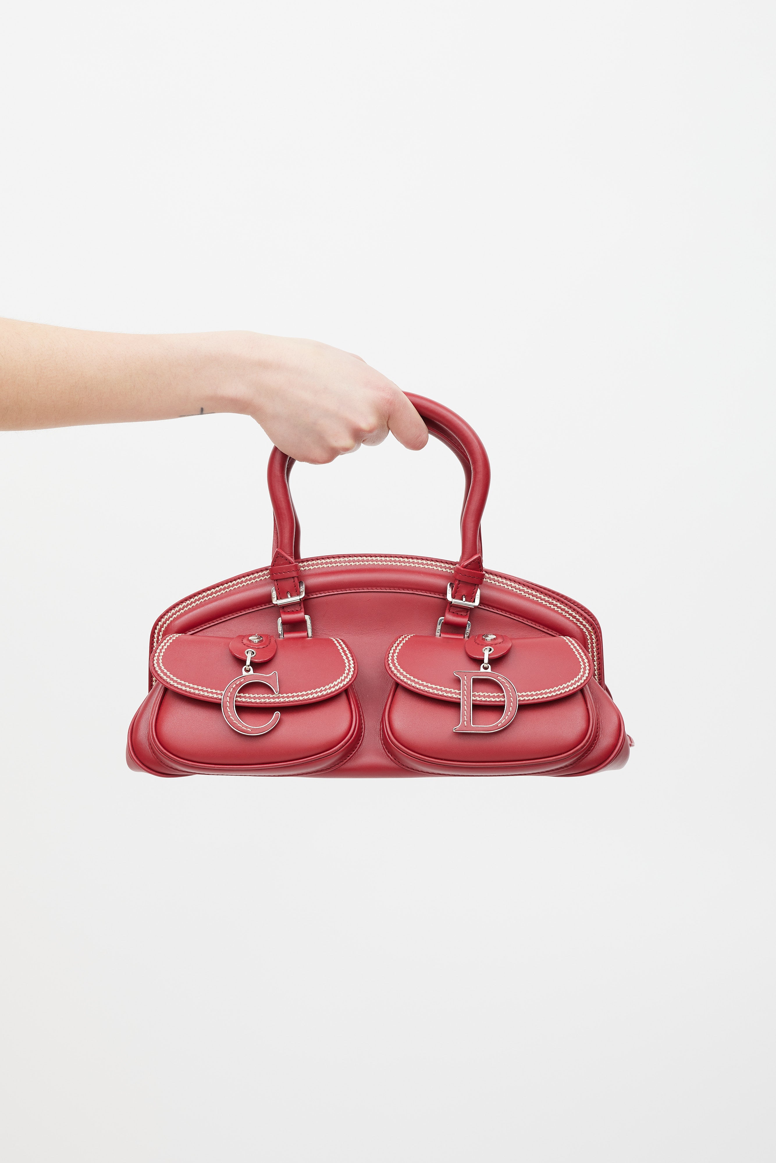 Pre-owned Christian Dior 2005 red leather Detective bag featuring dual rolled top handles with silver tone buckles, two flap pockets at front with C and D covered hardware charms, white contrast stitching, four protective feet at base, top zip closure, and one lined main compartment with one slip pocket and one zip pocket. Designed by John Galliano.