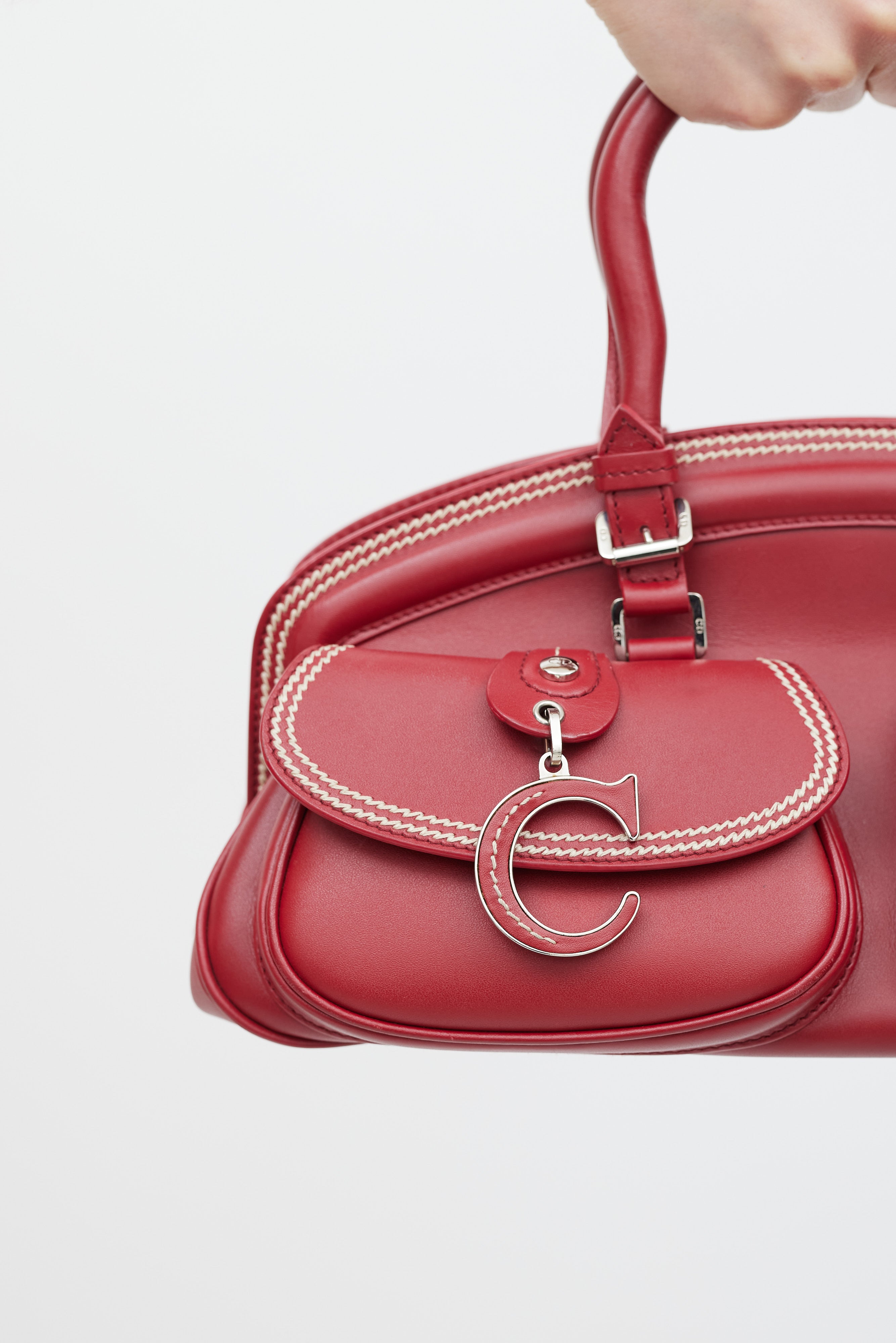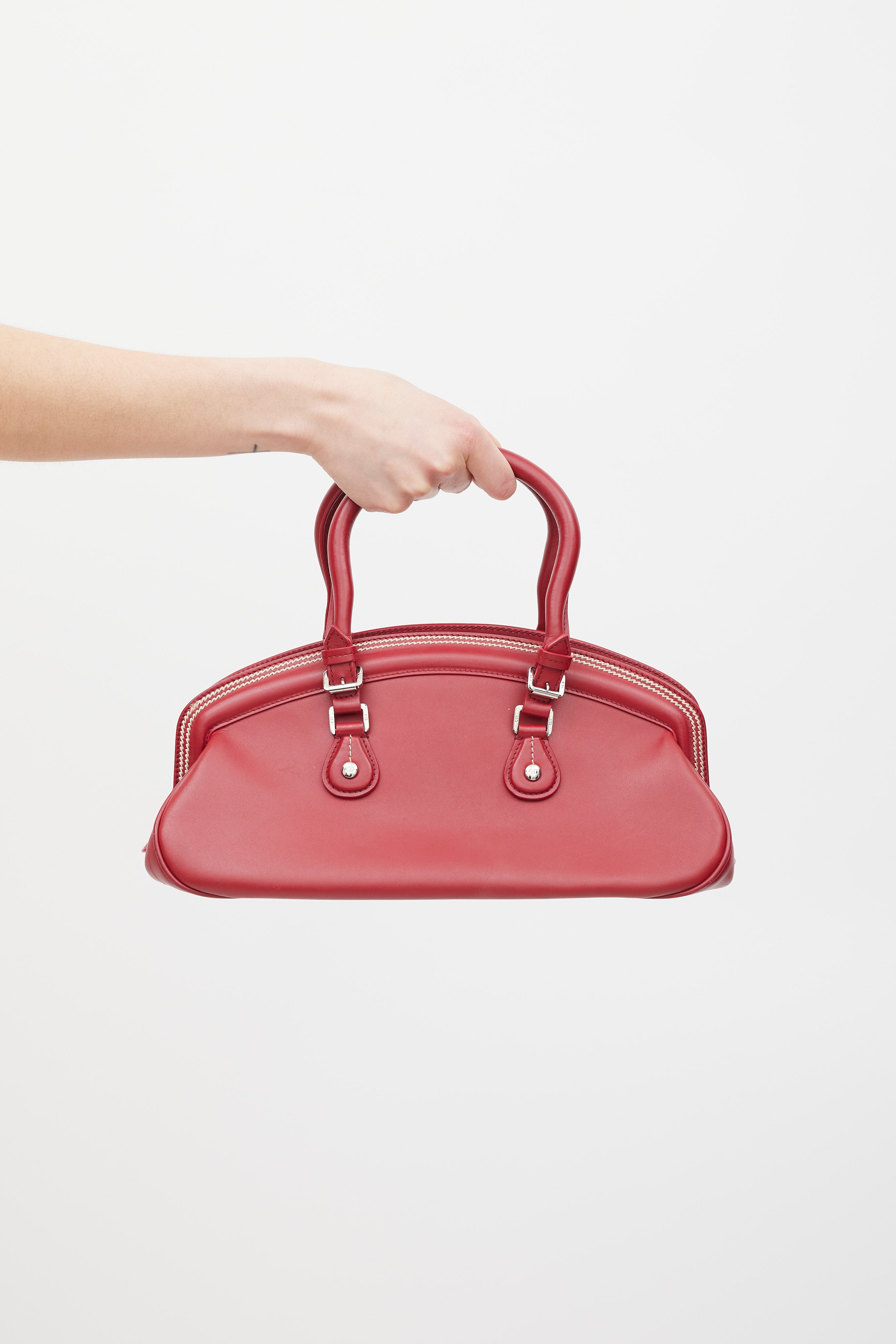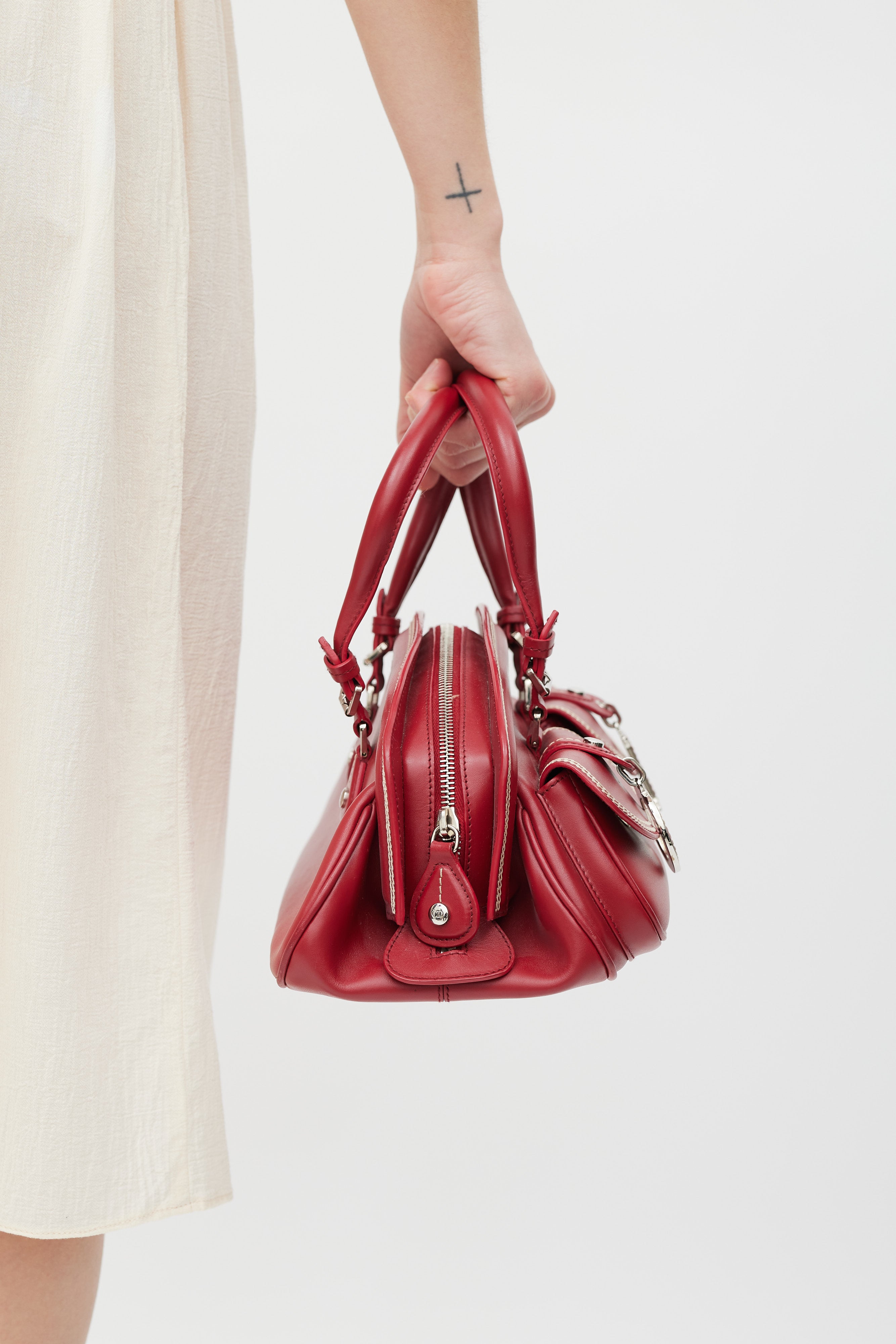 Pre-owned Christian Dior 2005 red leather Detective bag featuring dual rolled top handles with silver tone buckles, two flap pockets at front with C and D covered hardware charms, white contrast stitching, four protective feet at base, top zip closure, and one lined main compartment with one slip pocket and one zip pocket. Designed by John Galliano.