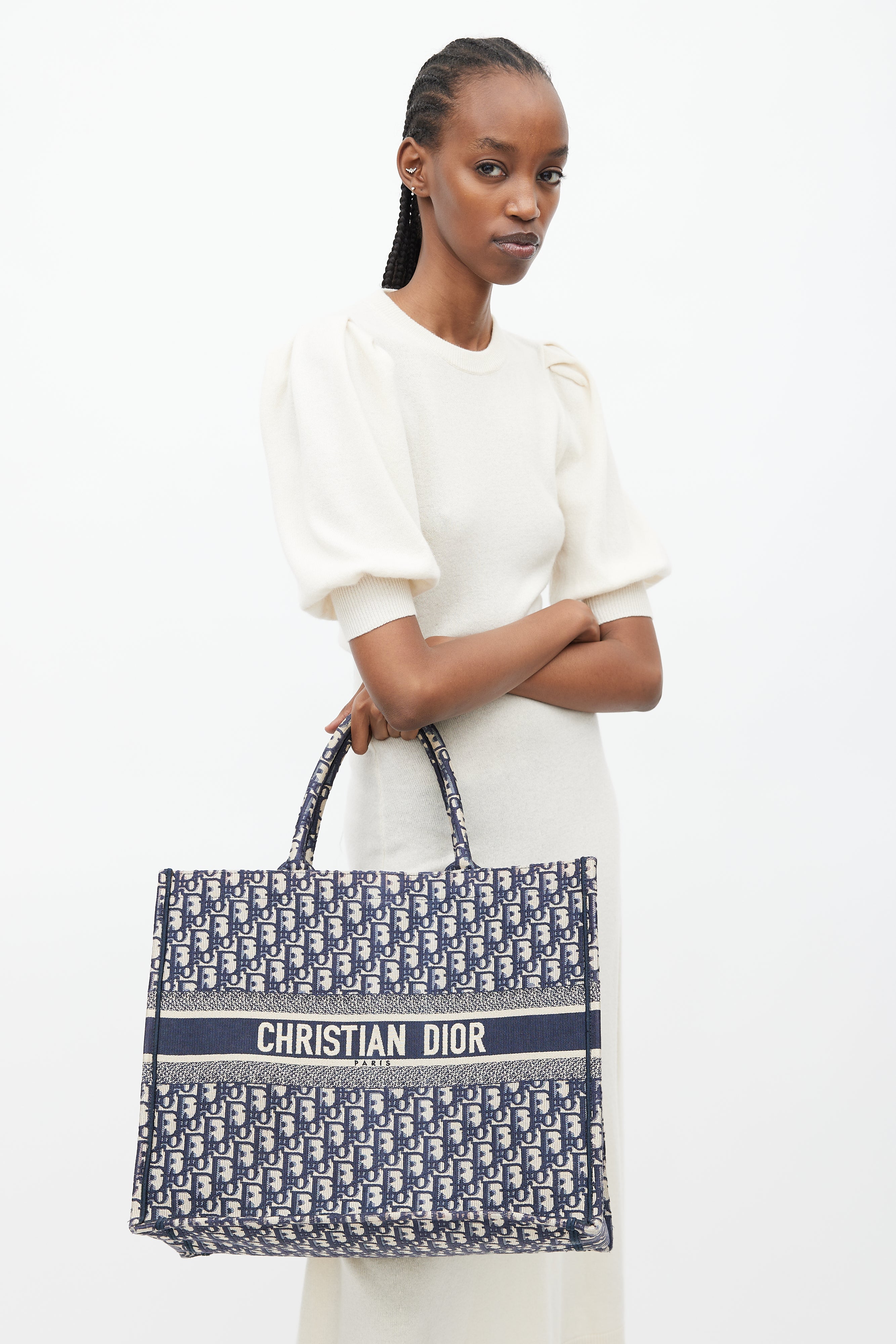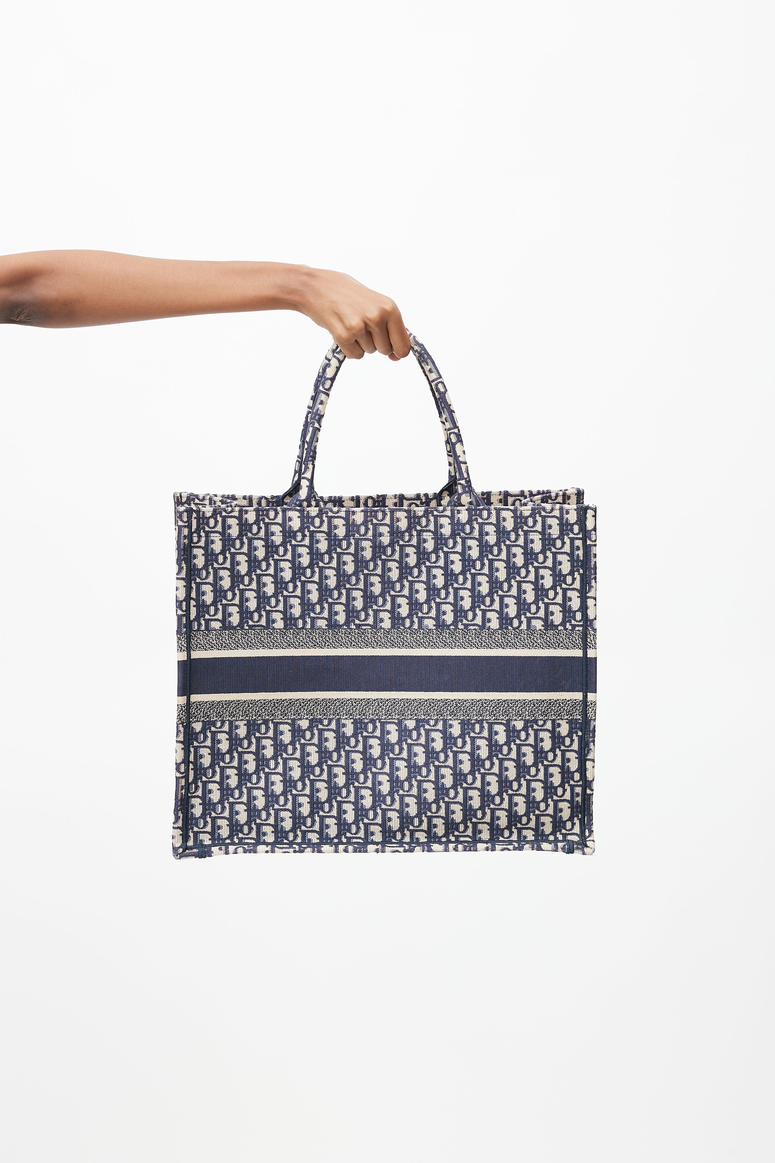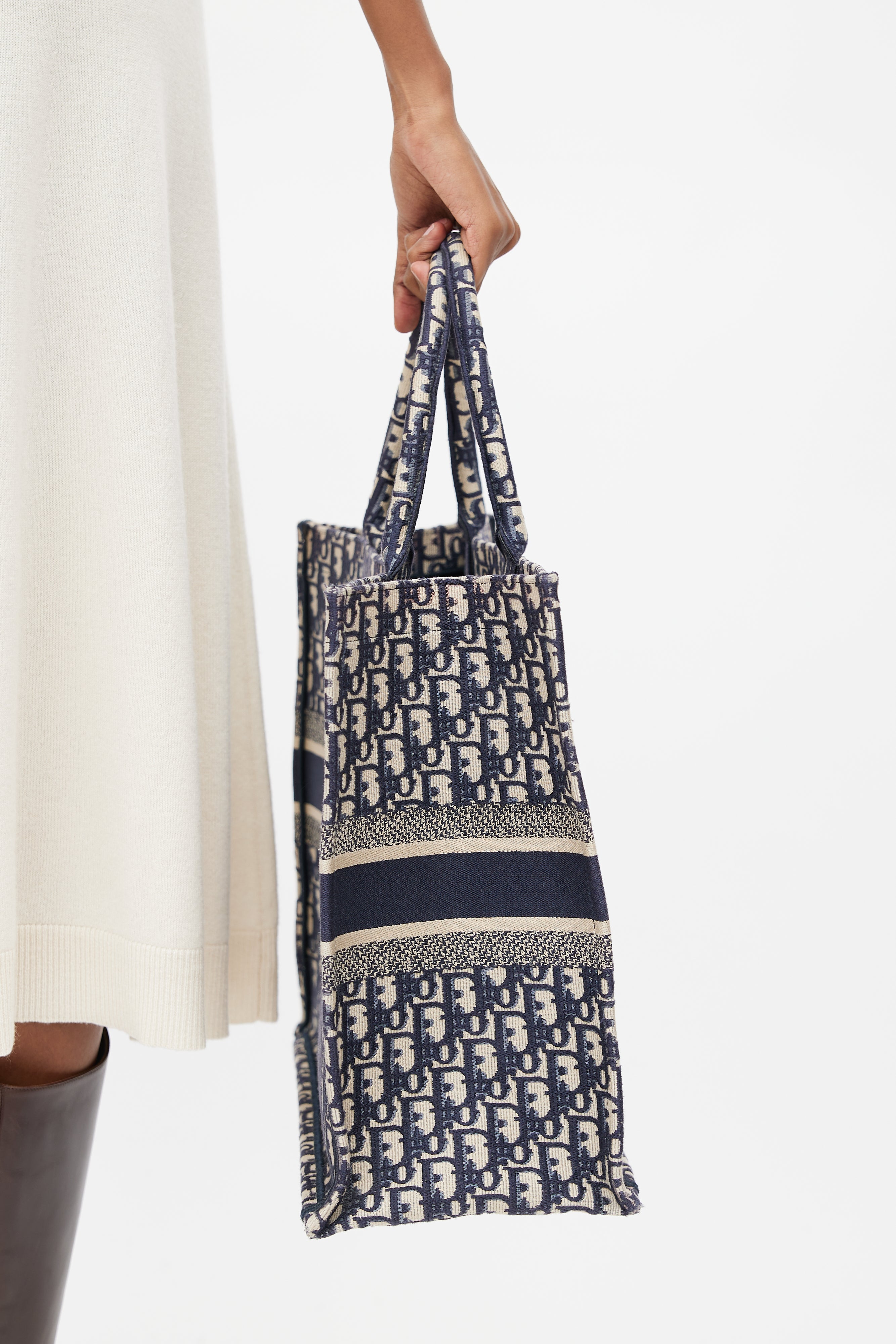 Pre-owned 2019 Dior cream and navy large Book Tote featuring monogram Dior Oblique embroidery, dual rolled top handles, logo centre panel, open compartment, and logo tab inside. Comes with original dust bag.