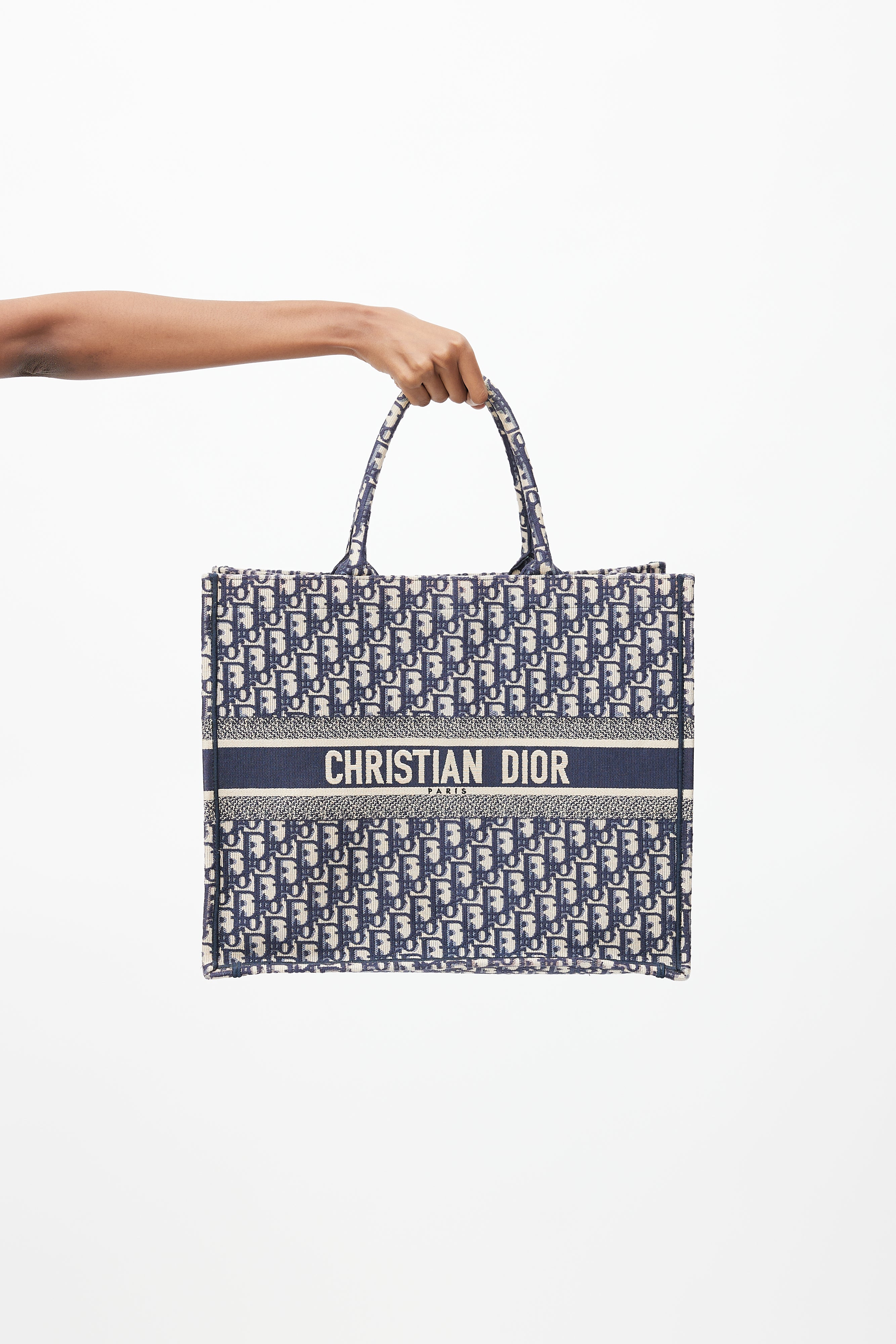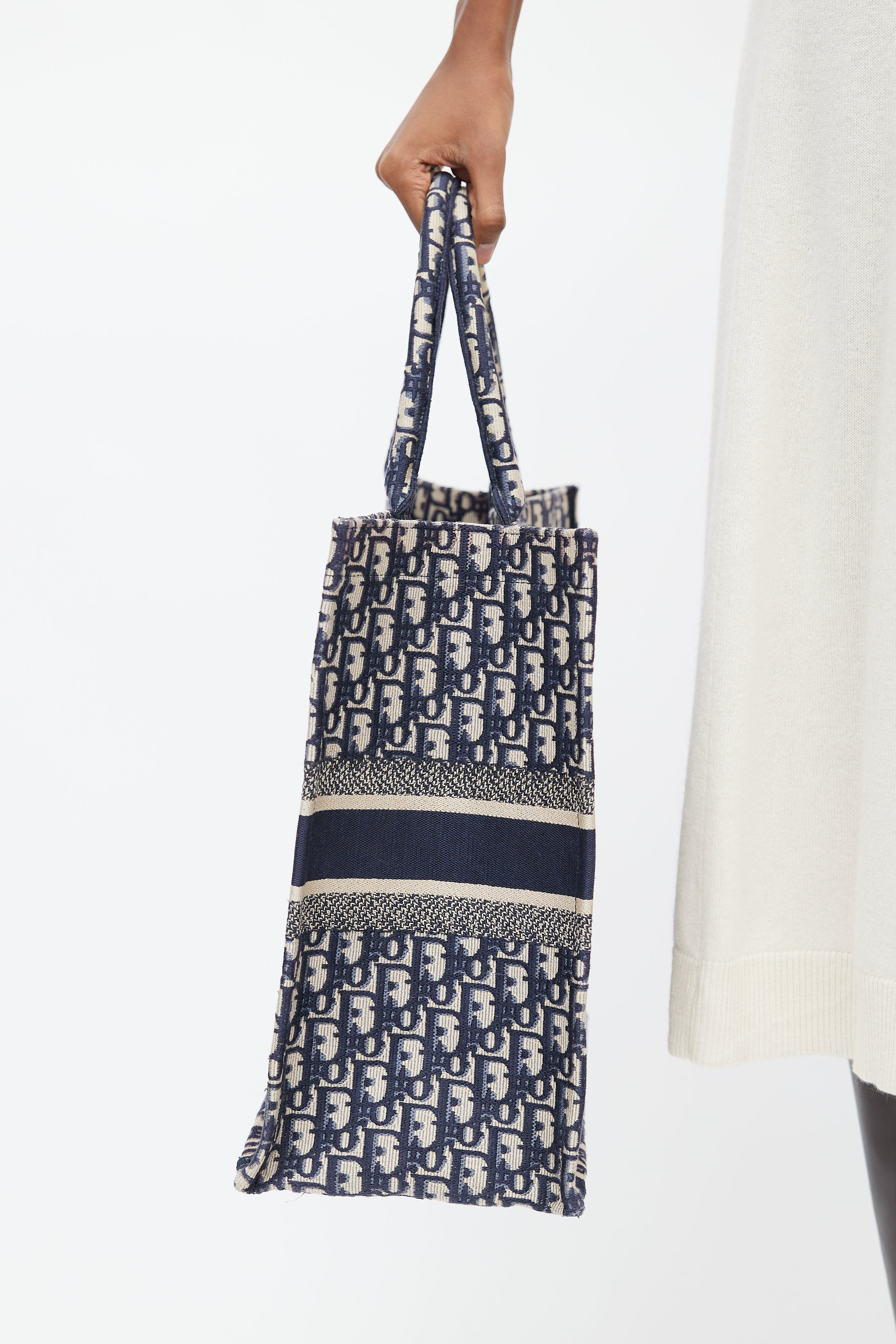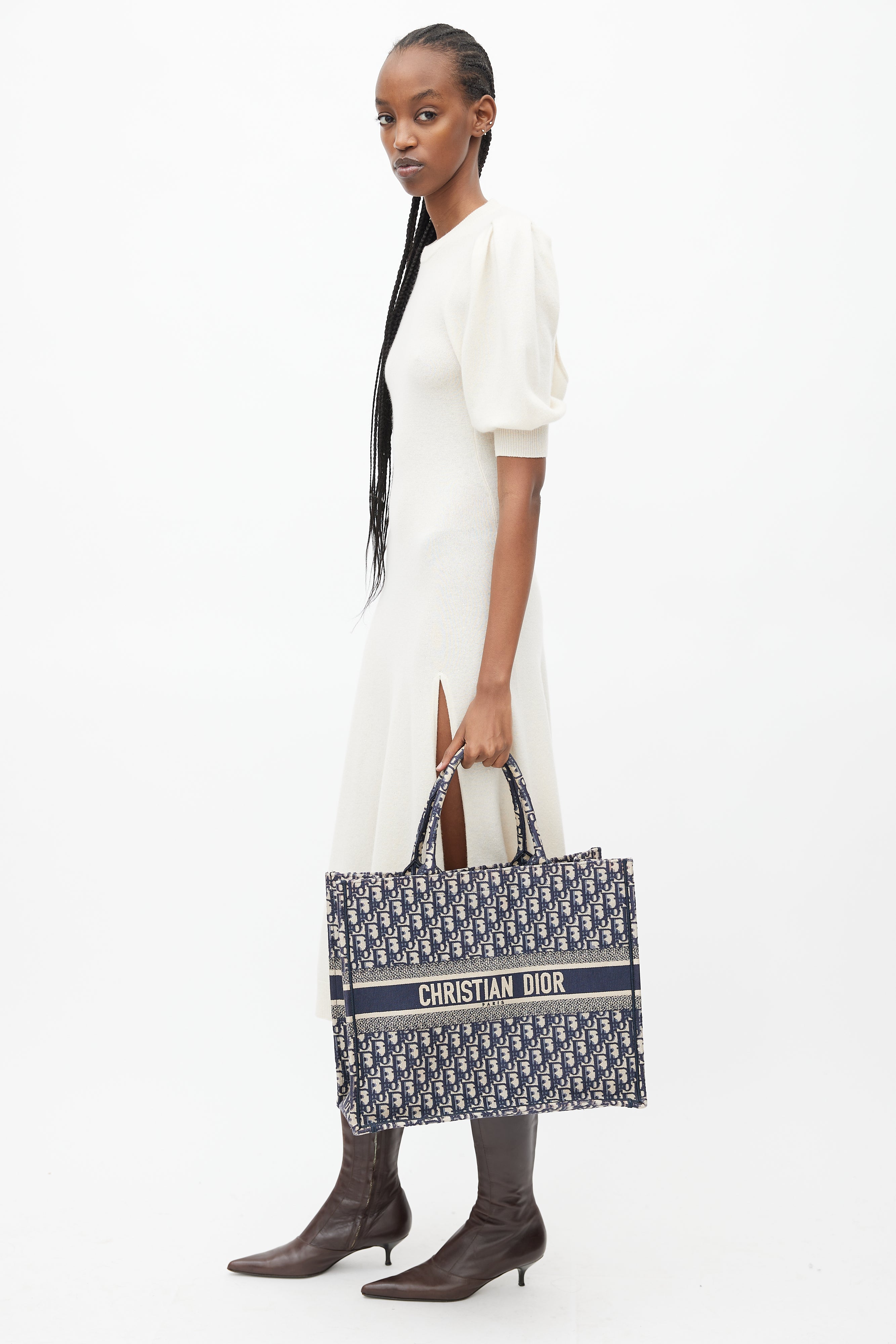 Pre-owned 2019 Dior cream and navy large Book Tote featuring monogram Dior Oblique embroidery, dual rolled top handles, logo centre panel, open compartment, and logo tab inside. Comes with original dust bag.