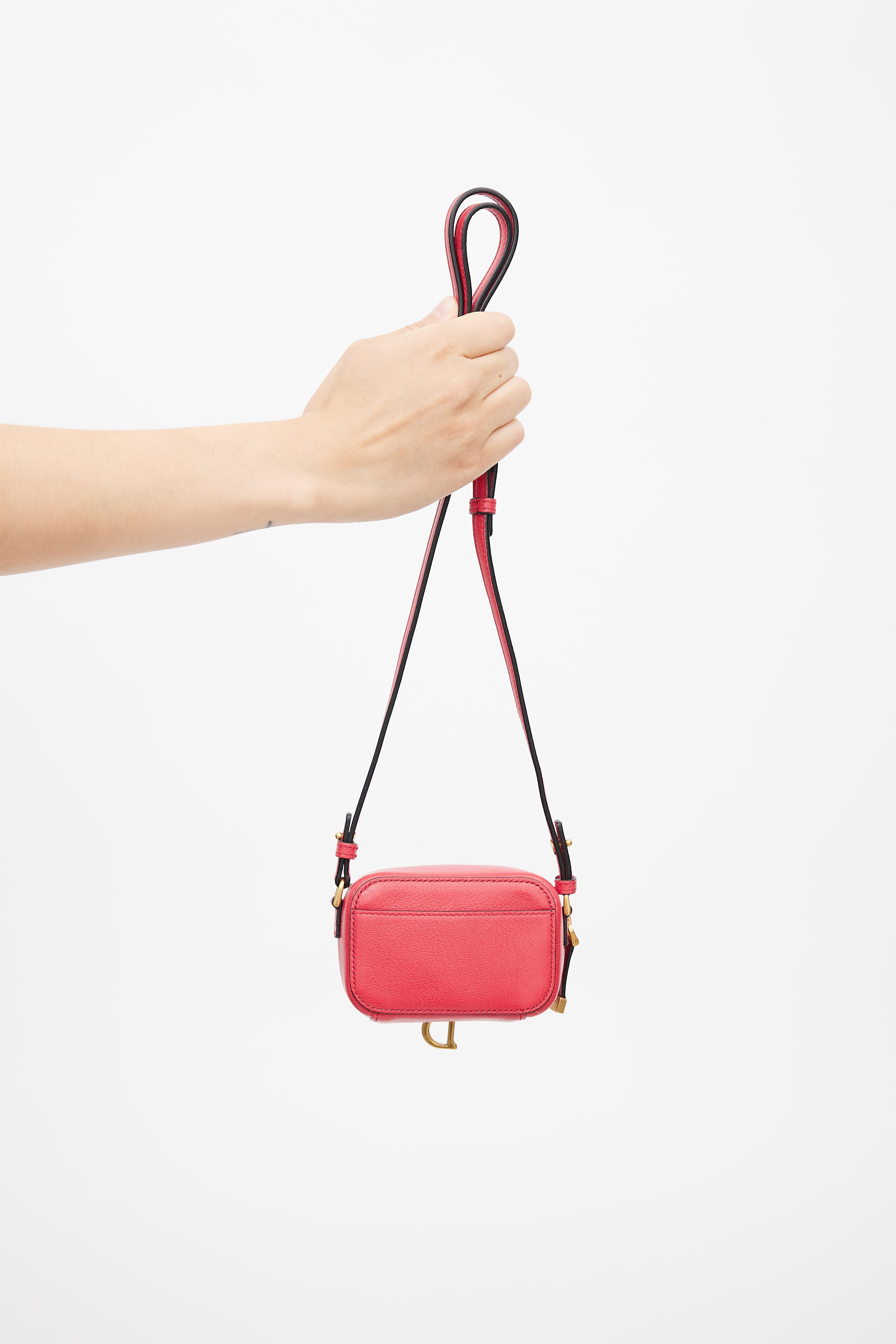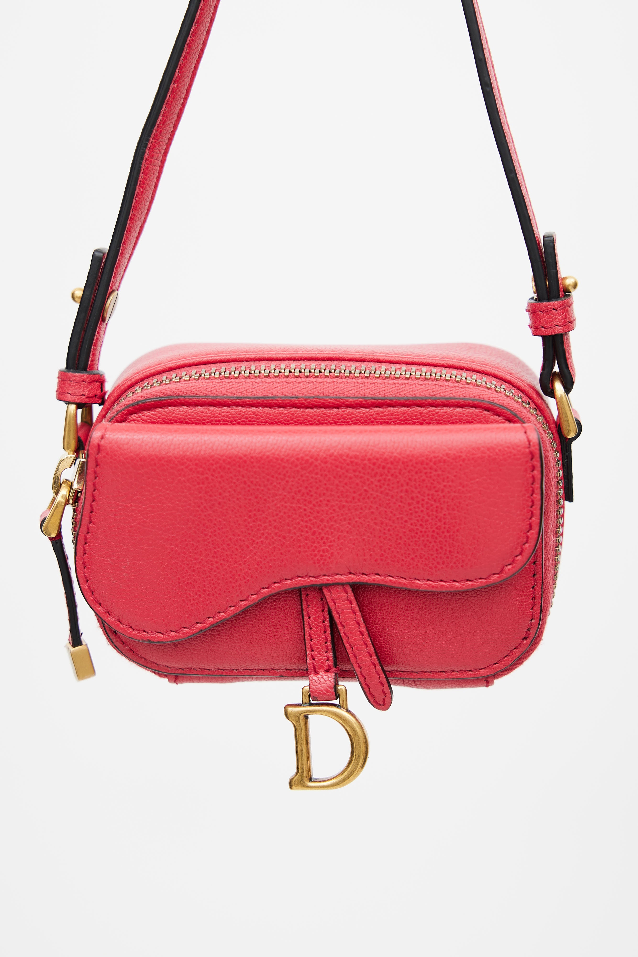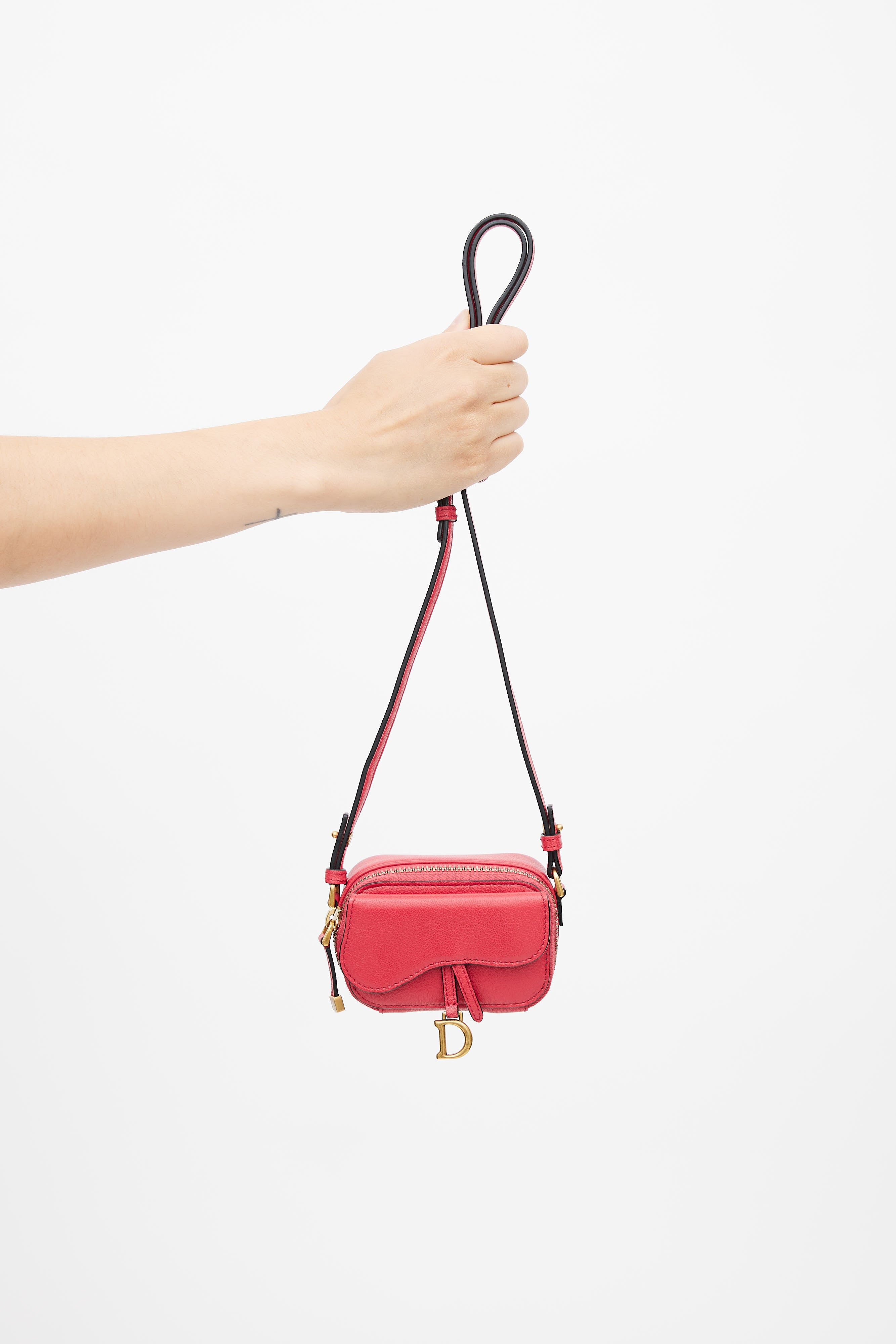 Pre-owned 2021 Dior red mini Saddle crossbody pouch featuring adjustable shoulder strap, flap pocket at front with gold tone D charm, slip pocket at back, zip closure, and suede lined compartment. Comes with original dust bag.