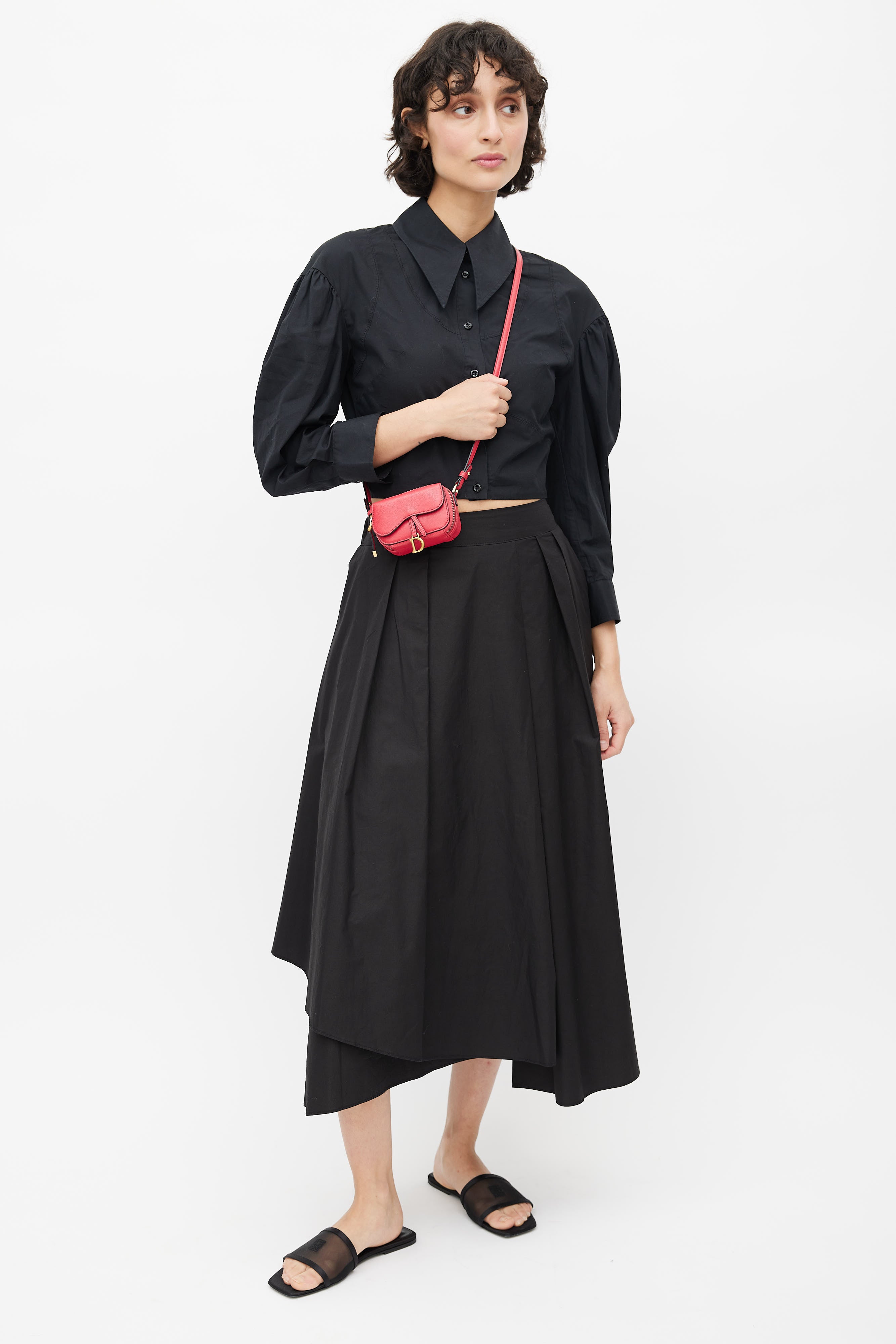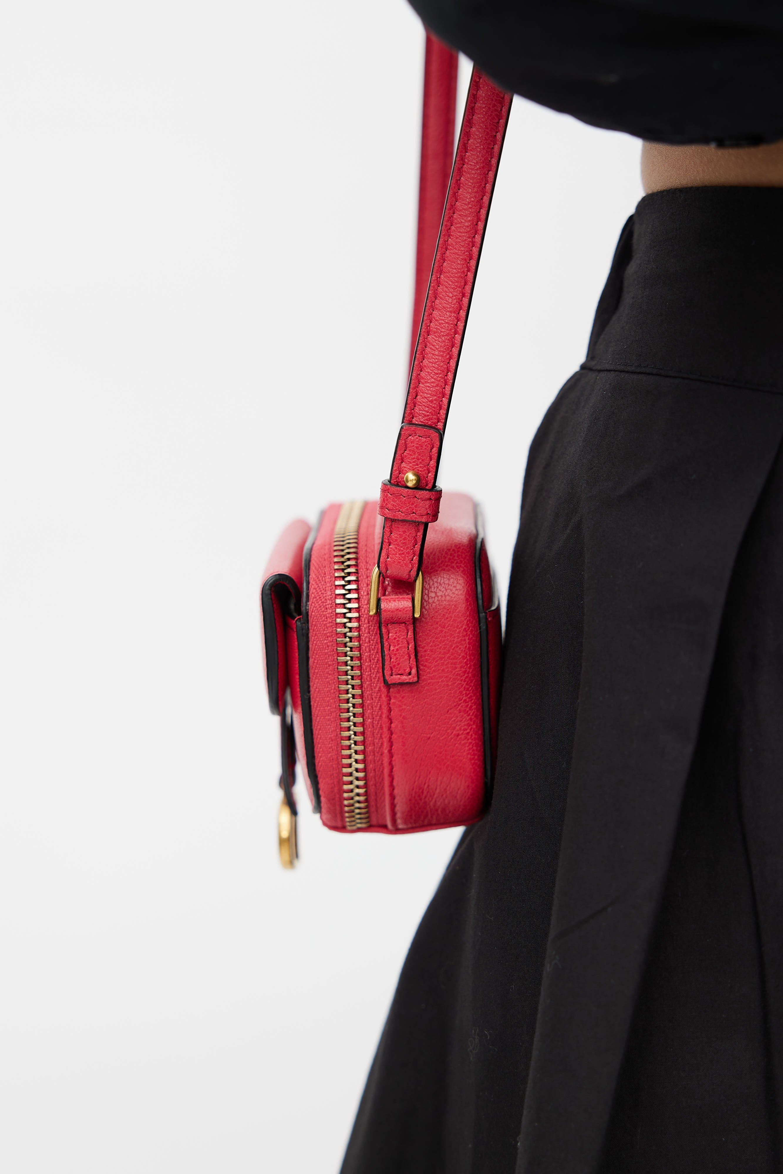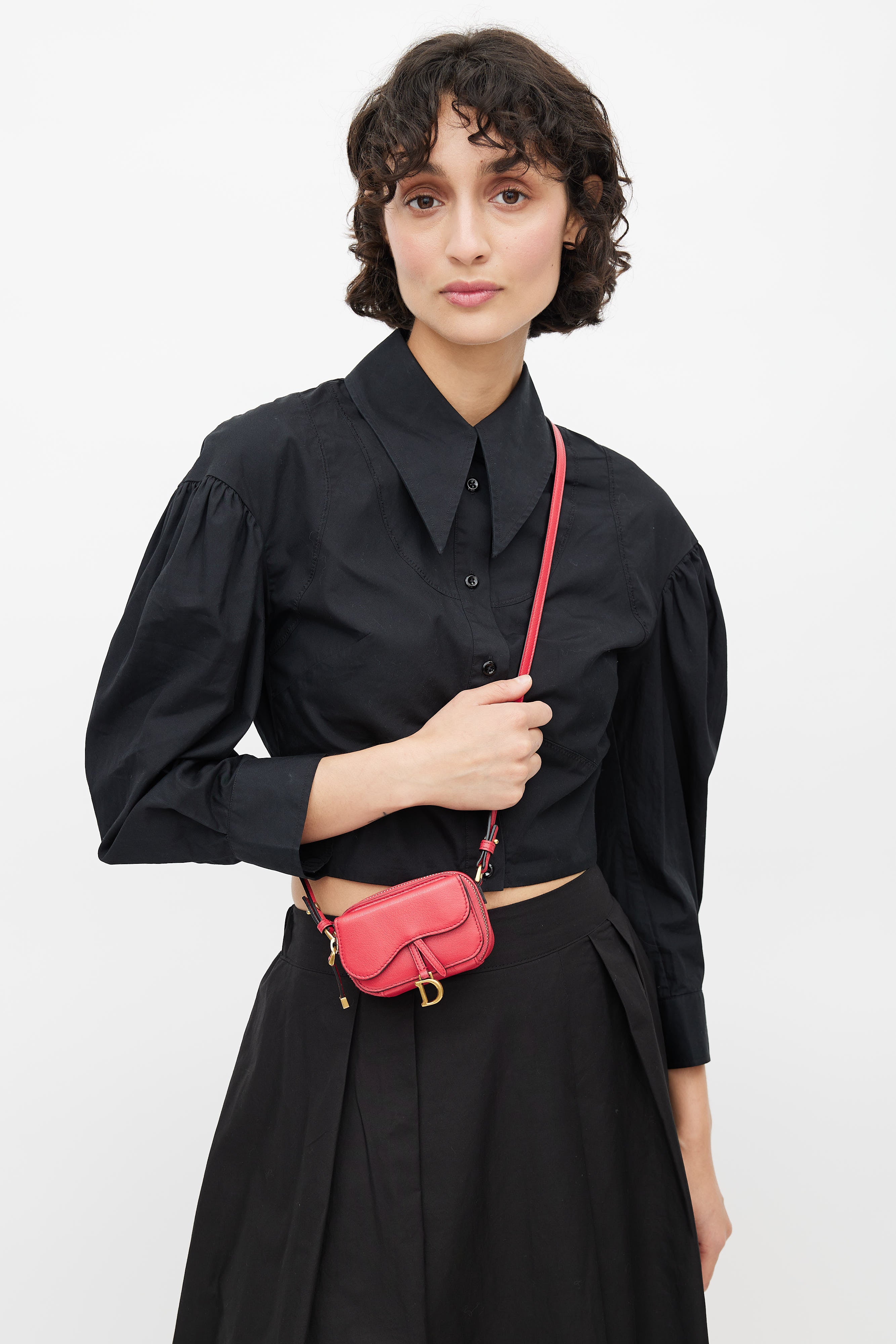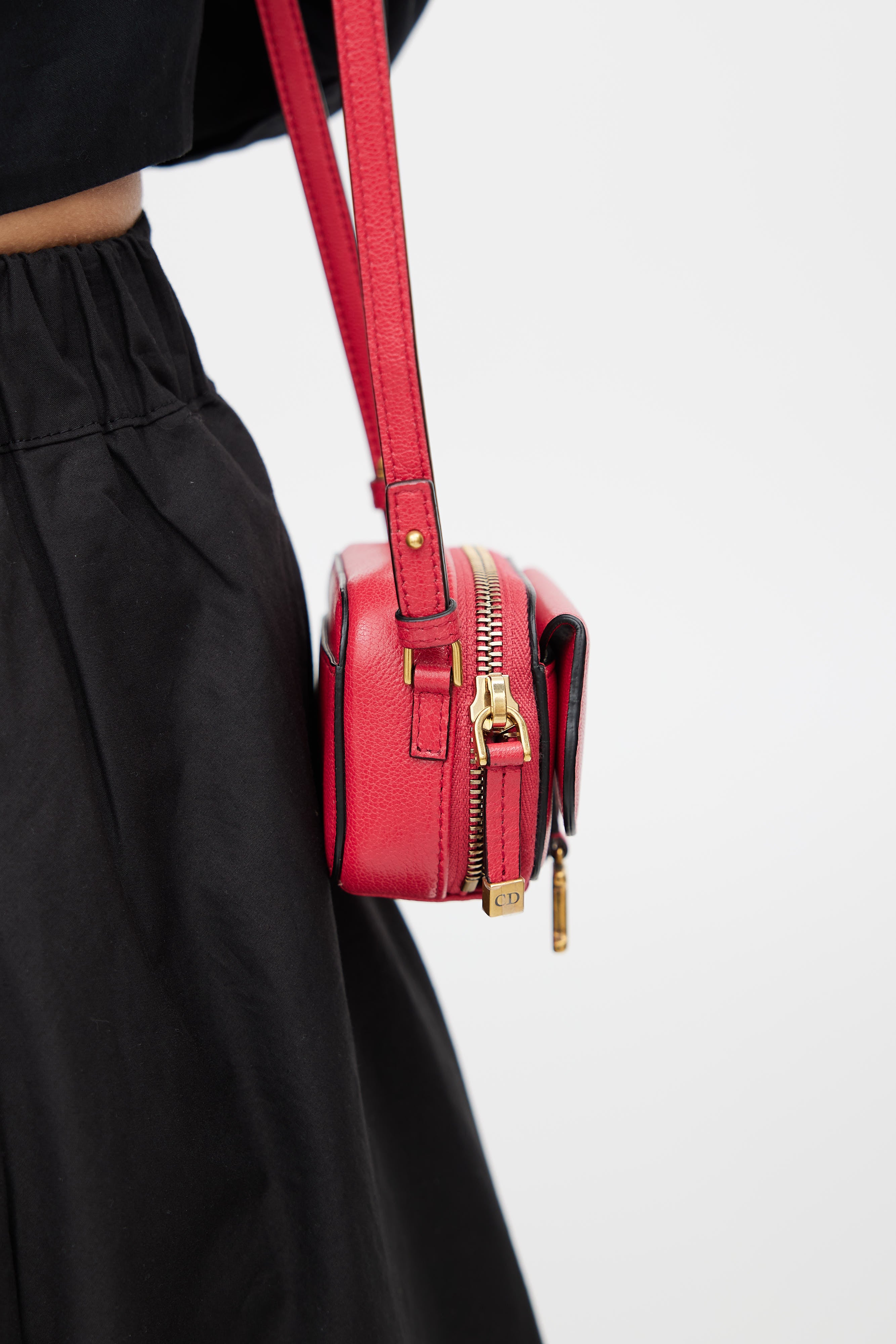 Pre-owned 2021 Dior red mini Saddle crossbody pouch featuring adjustable shoulder strap, flap pocket at front with gold tone D charm, slip pocket at back, zip closure, and suede lined compartment. Comes with original dust bag.