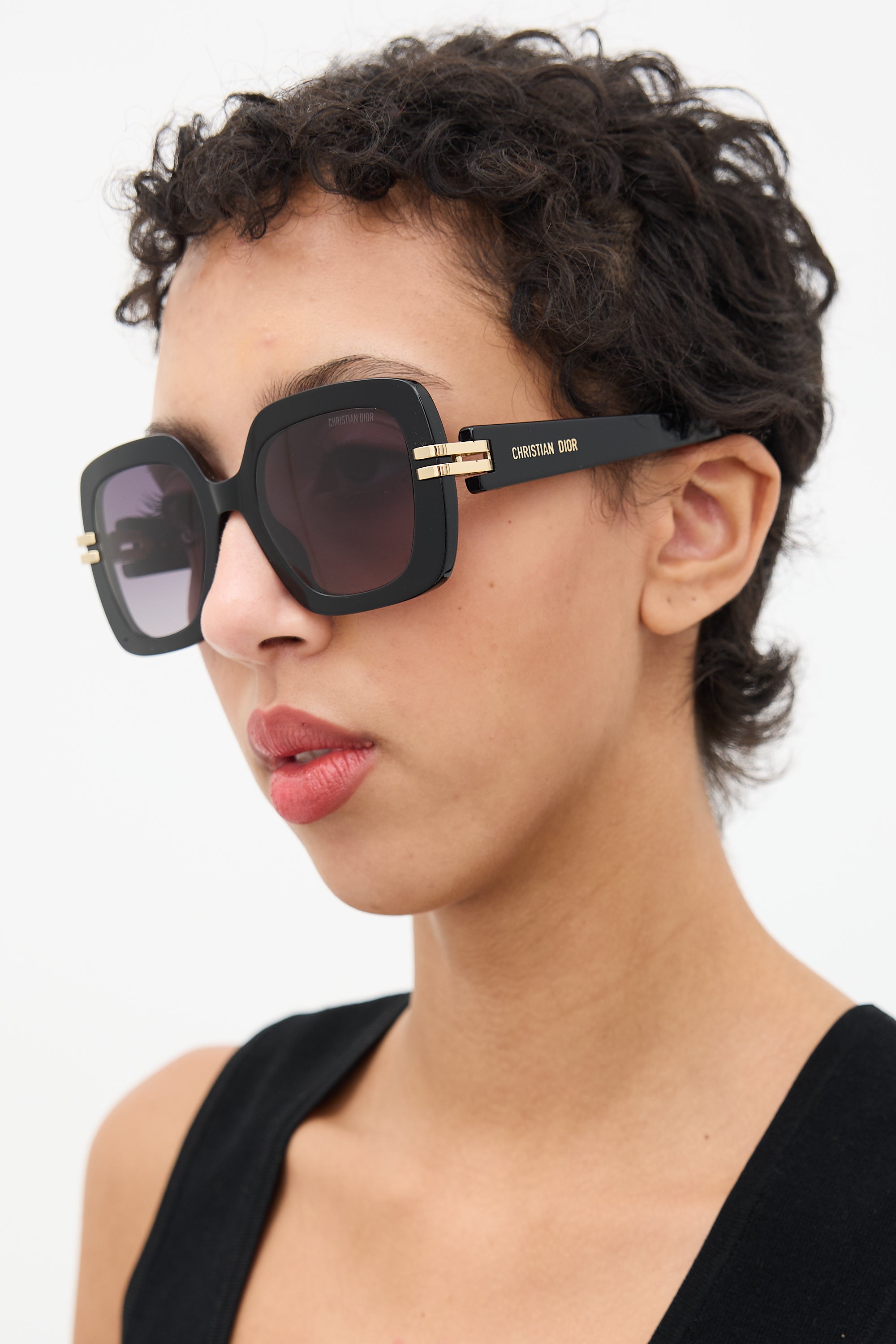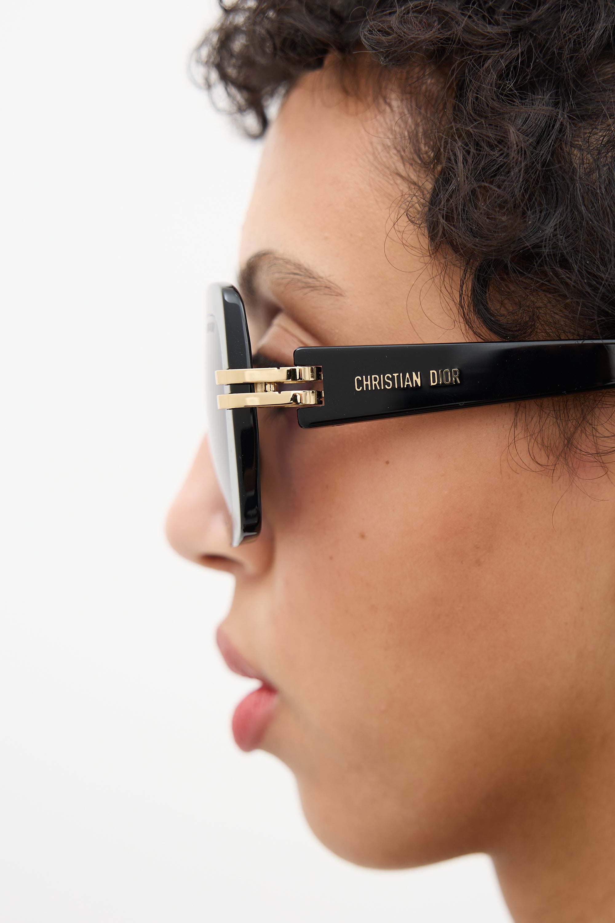 Pre-owned Dior CDior S2I sunglasses featuring grey tinted lenses, black acetate square frame, and inset gold hardware logo at temples. Comes with original case, pouch, and wipe cloth.
