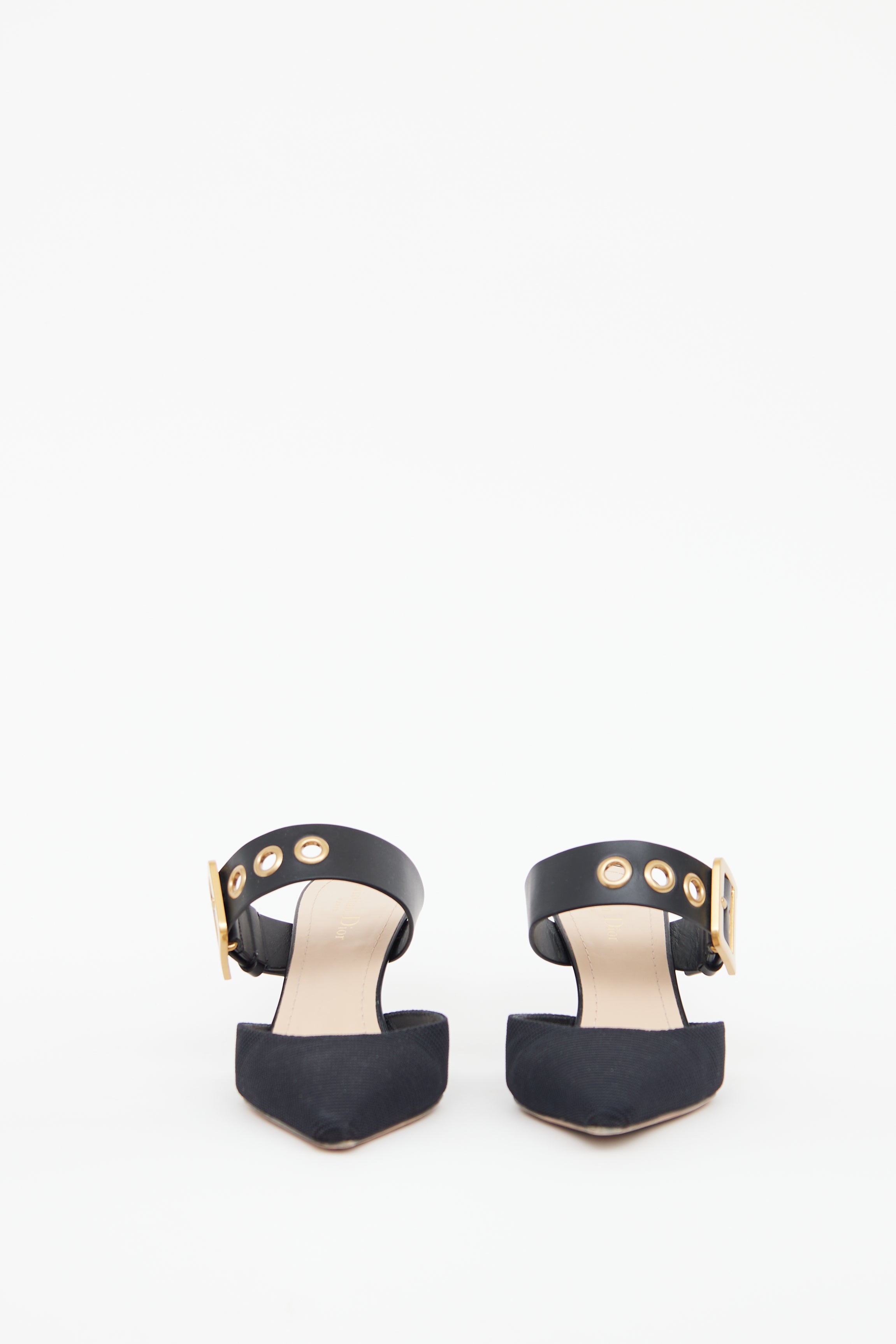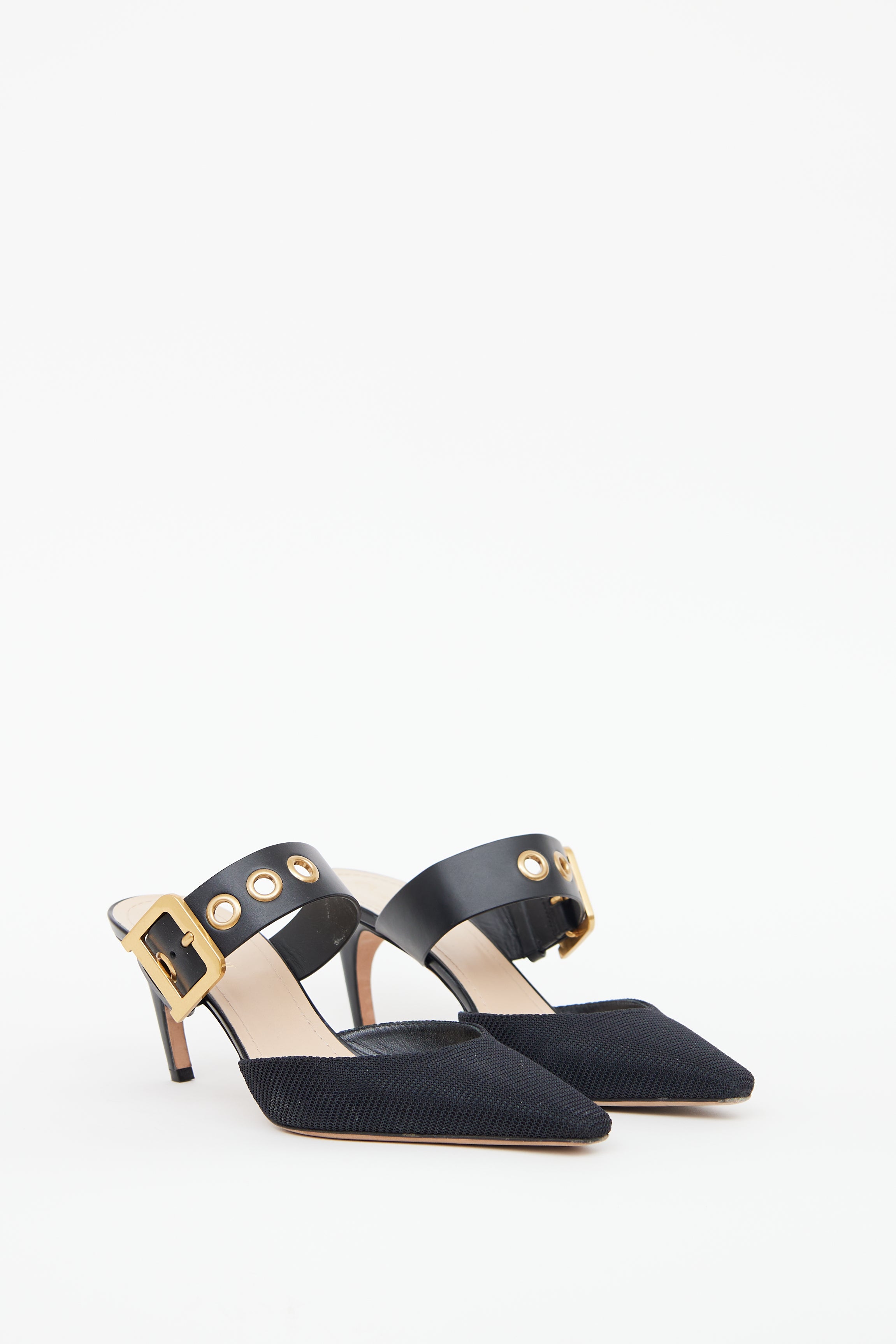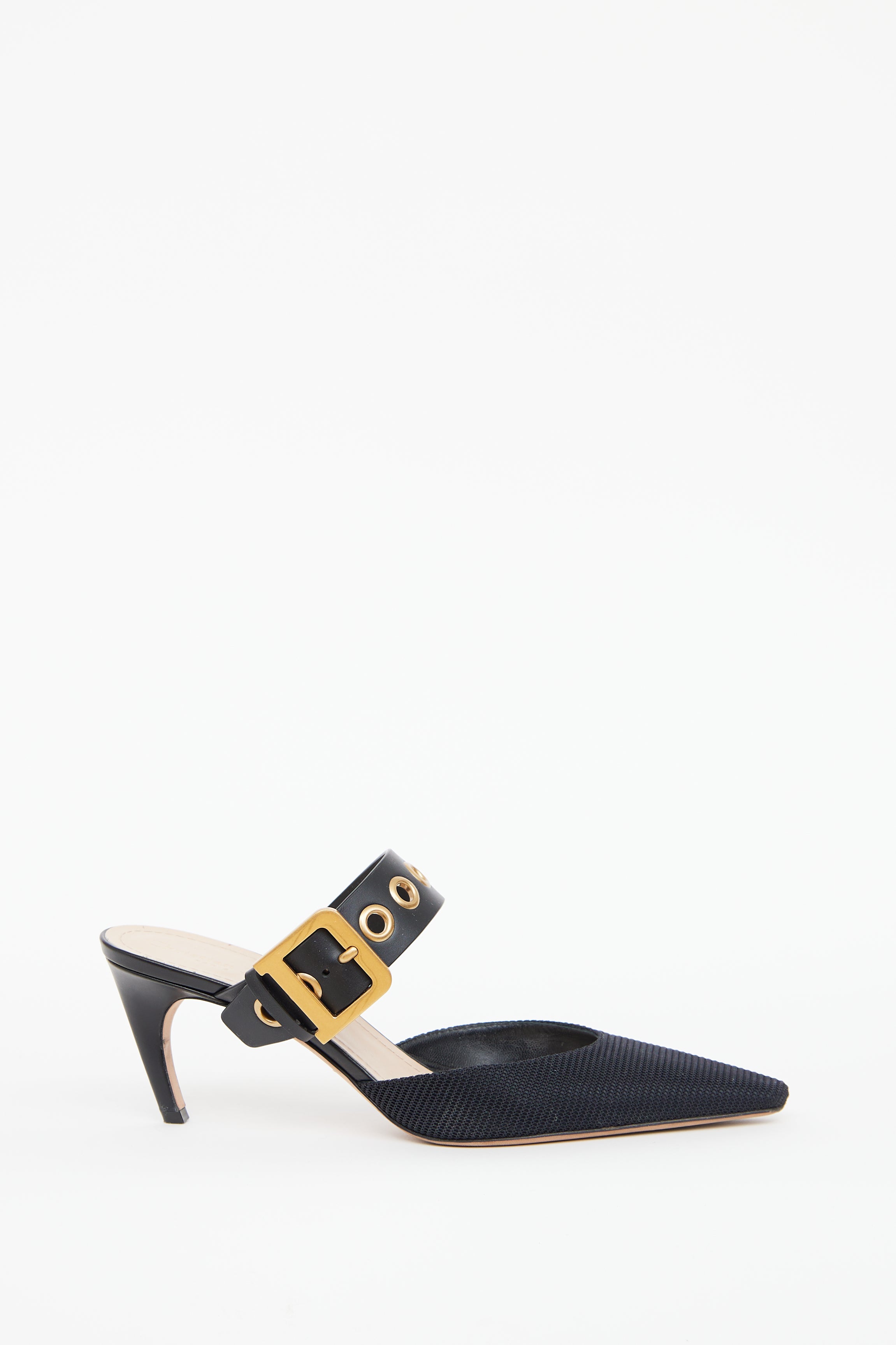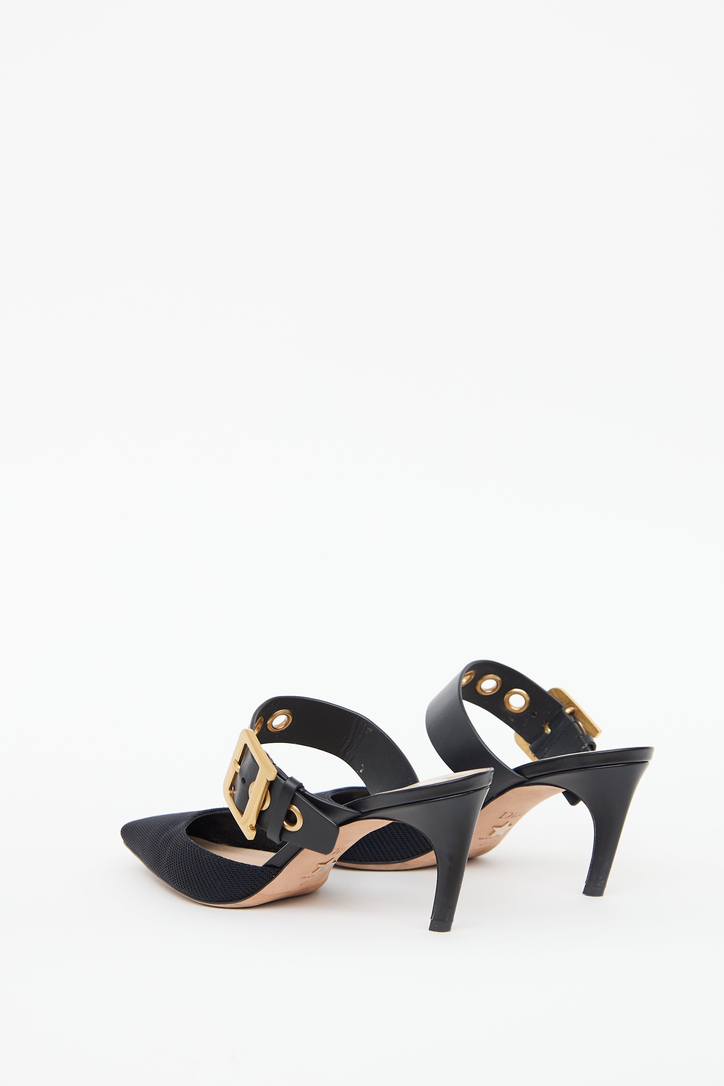 Pre-owned Christian Dior black D-Dior Technical Canvas mule featuring slip on styling, pointed toe, stiletto heel, adjustable leather buckle detail at vamp featuring gold-tone grommets and oversized buckle and leather insole.