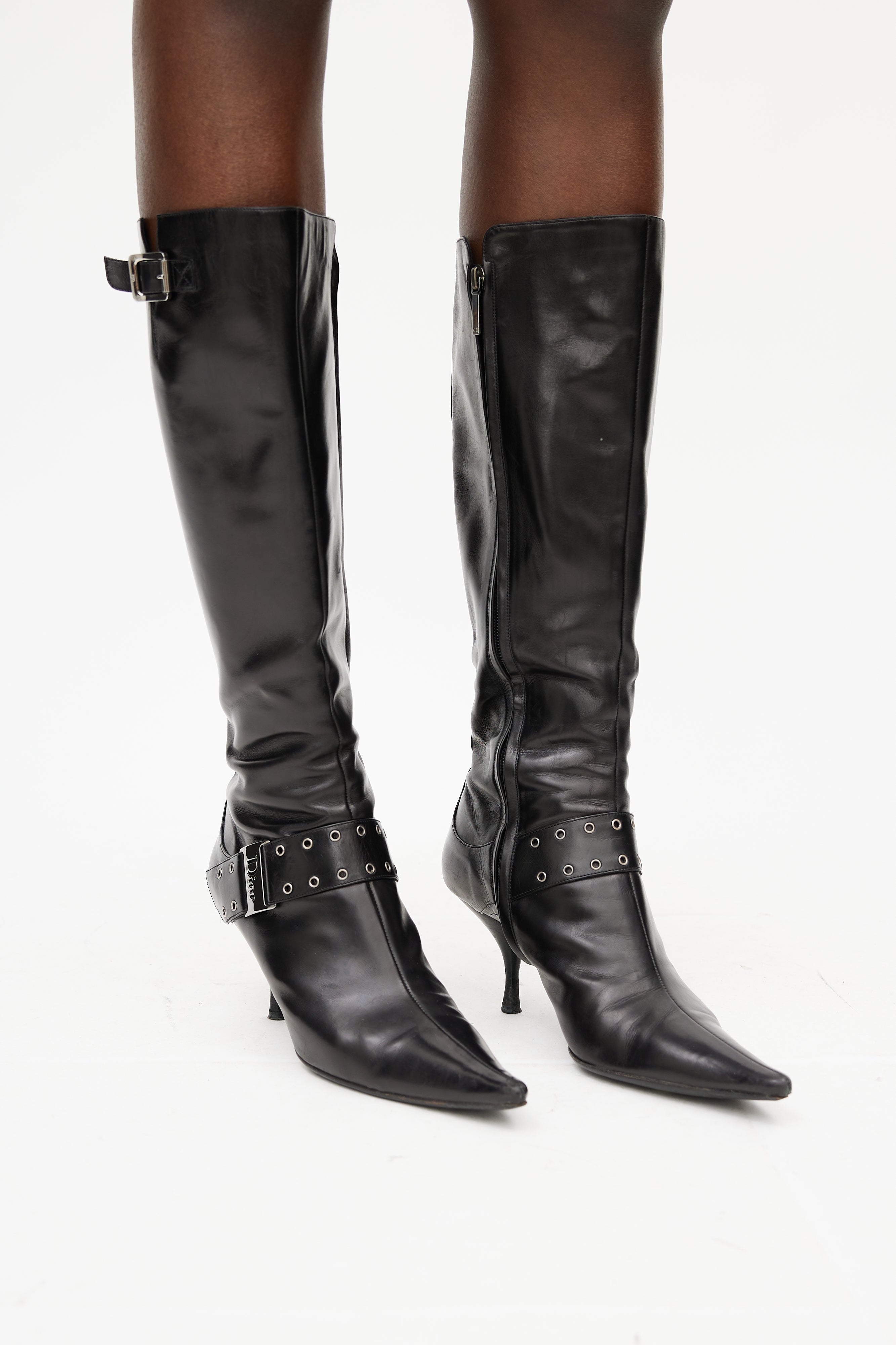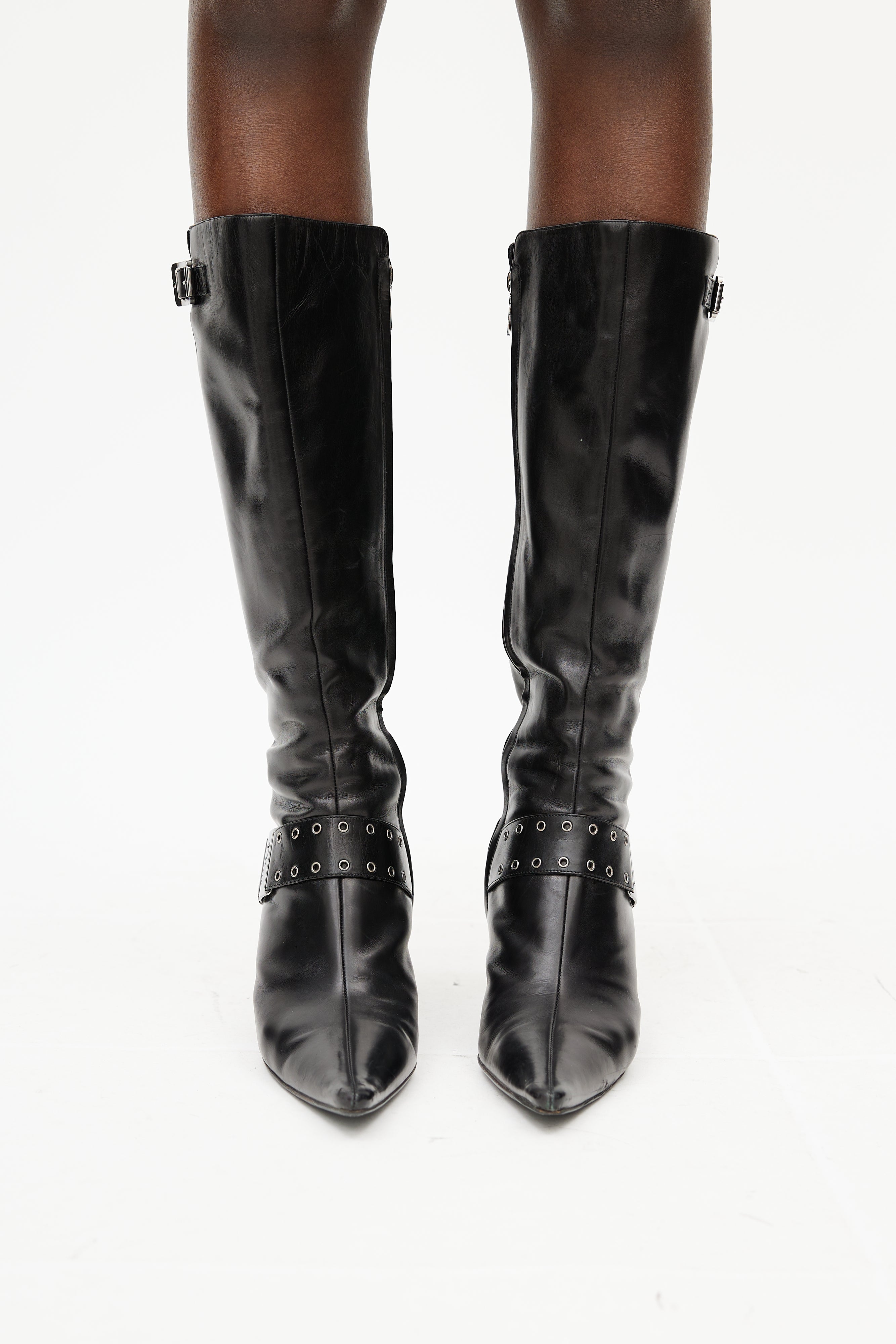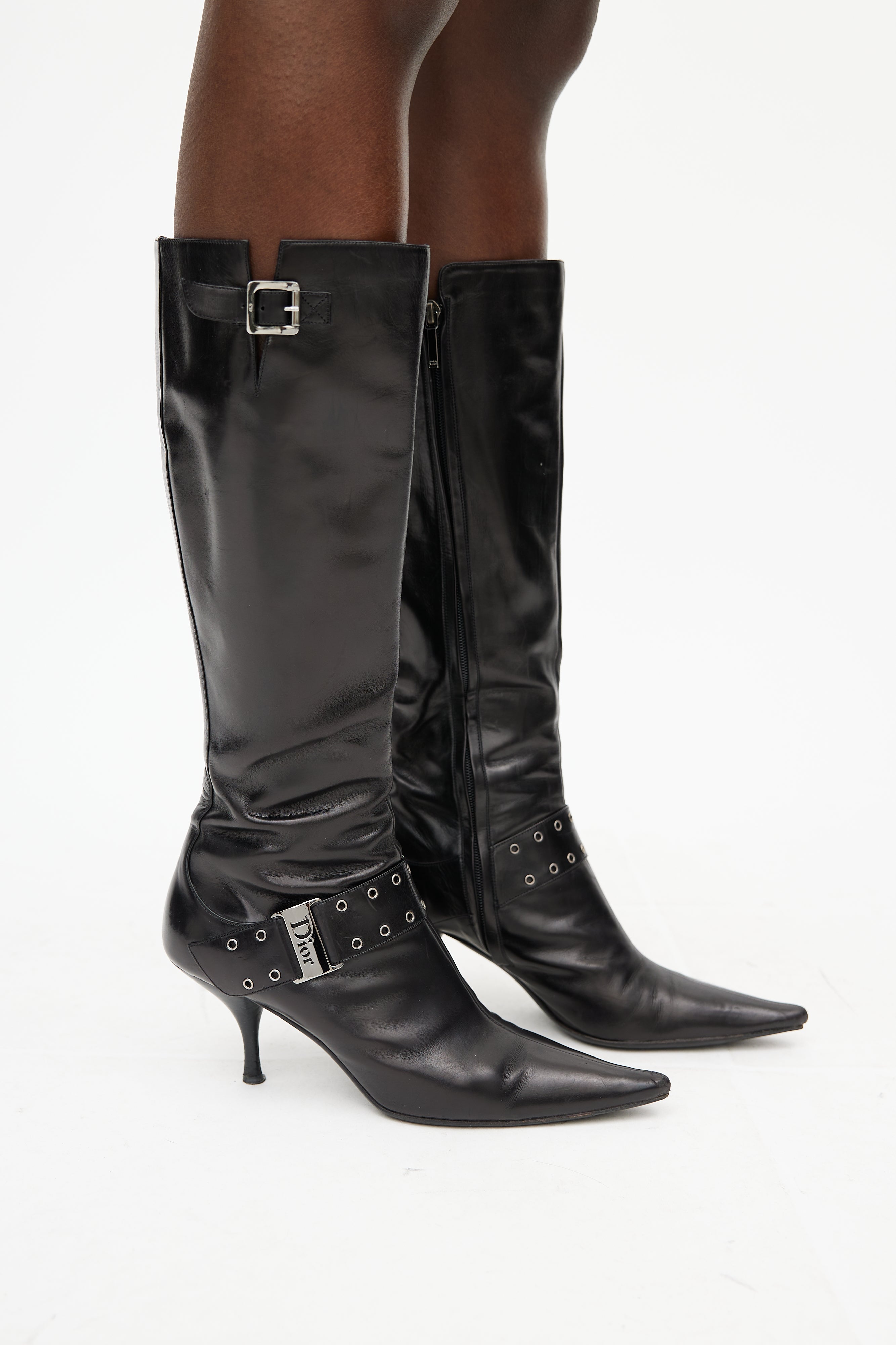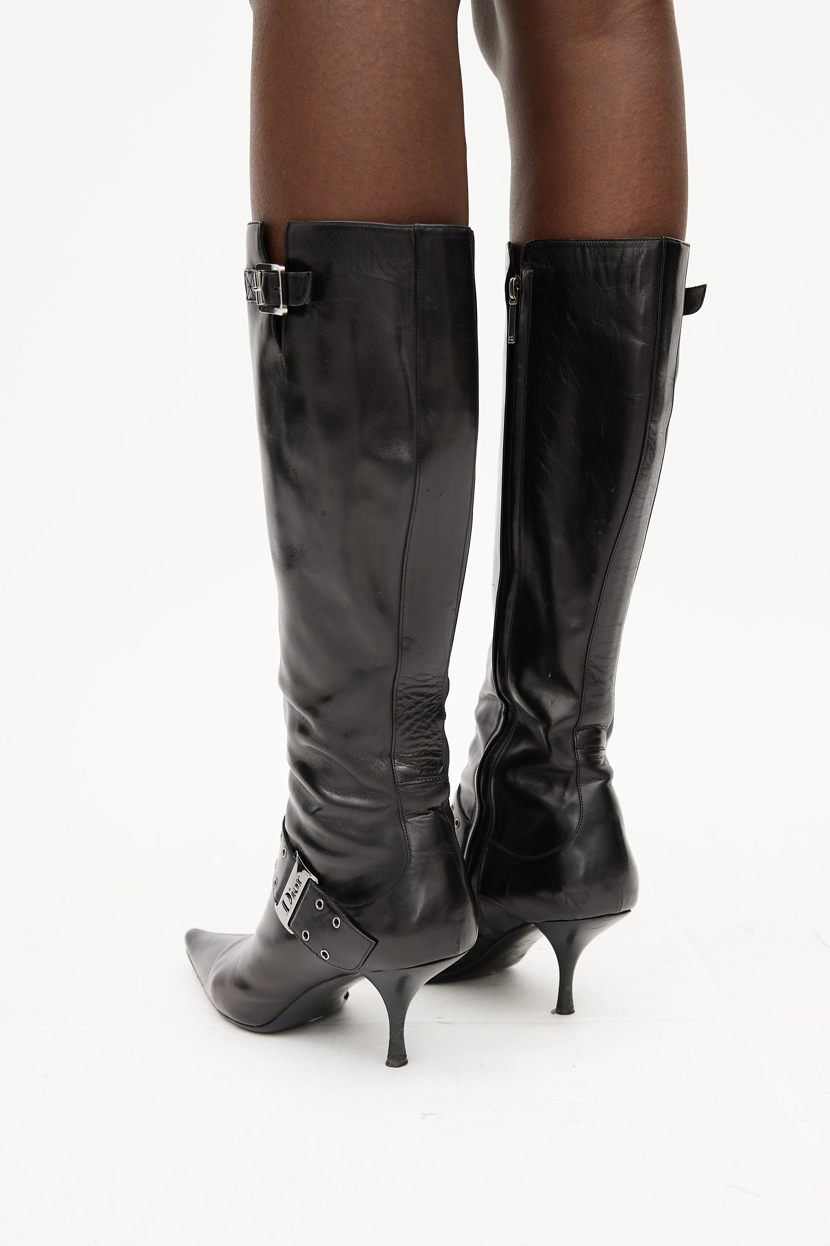 Pre-owned Dior black leather boots featuring a pointed toe, stiletto heel, buckle detail at vamp with silver tone logo hardware, knee high shaft, and zip closure at side. Early 2000's John Galliano era design.