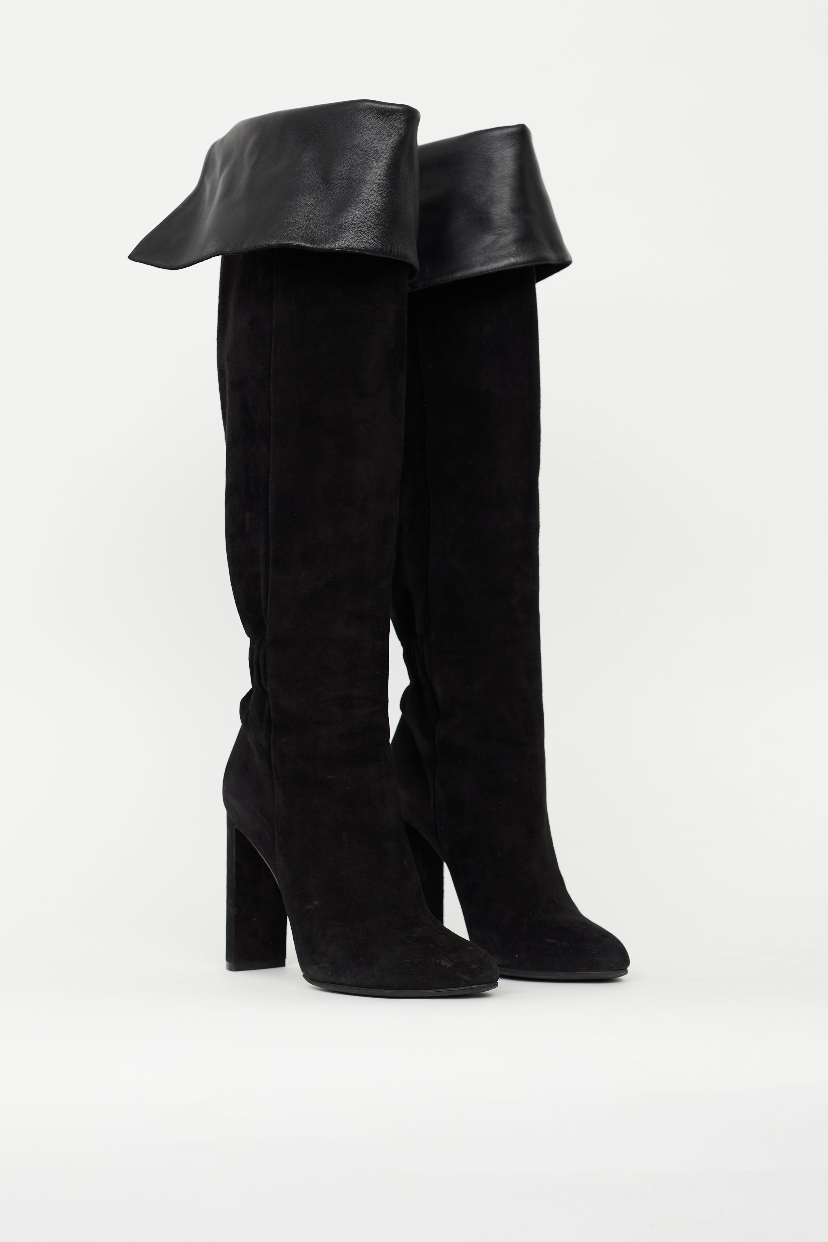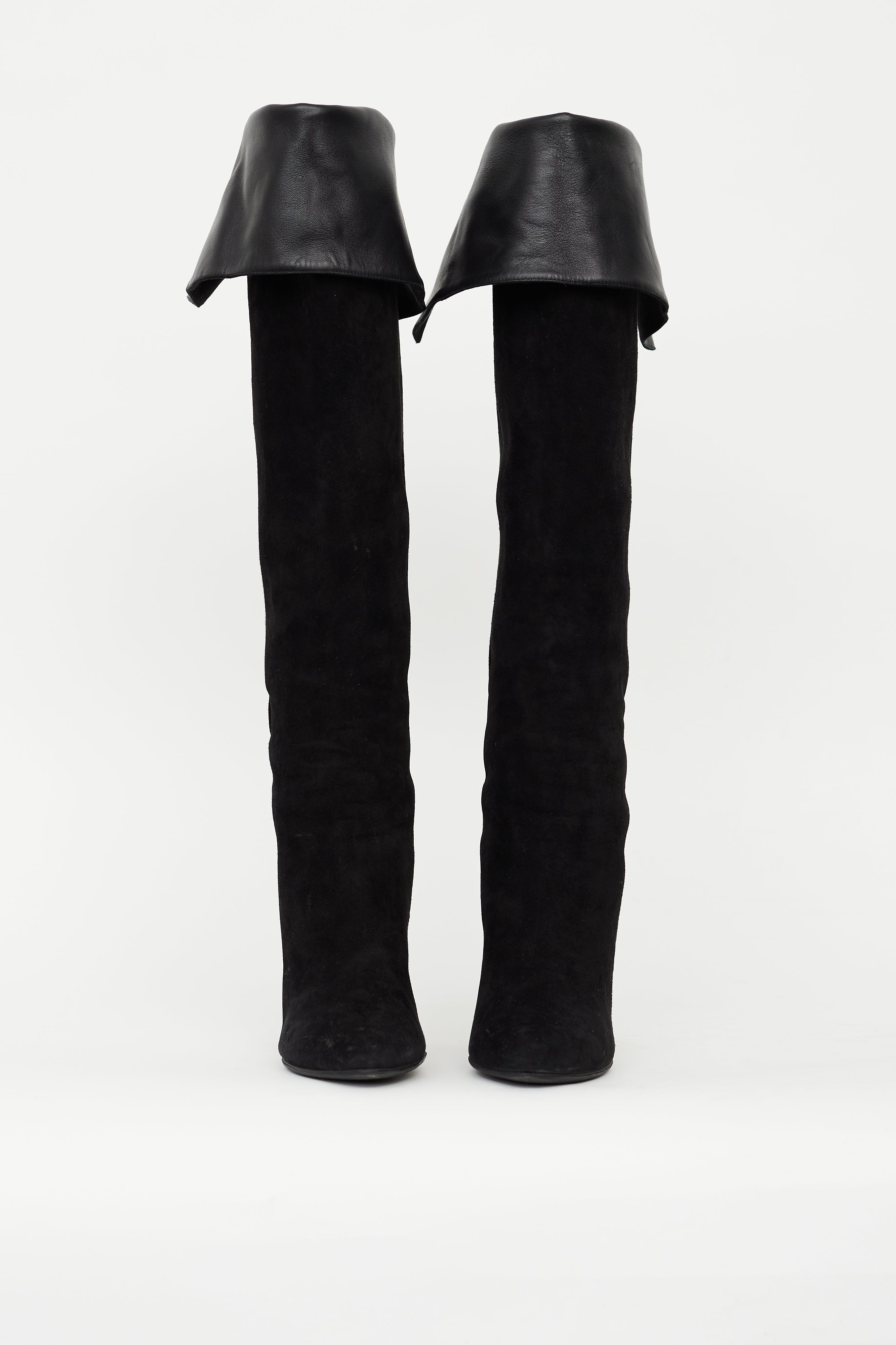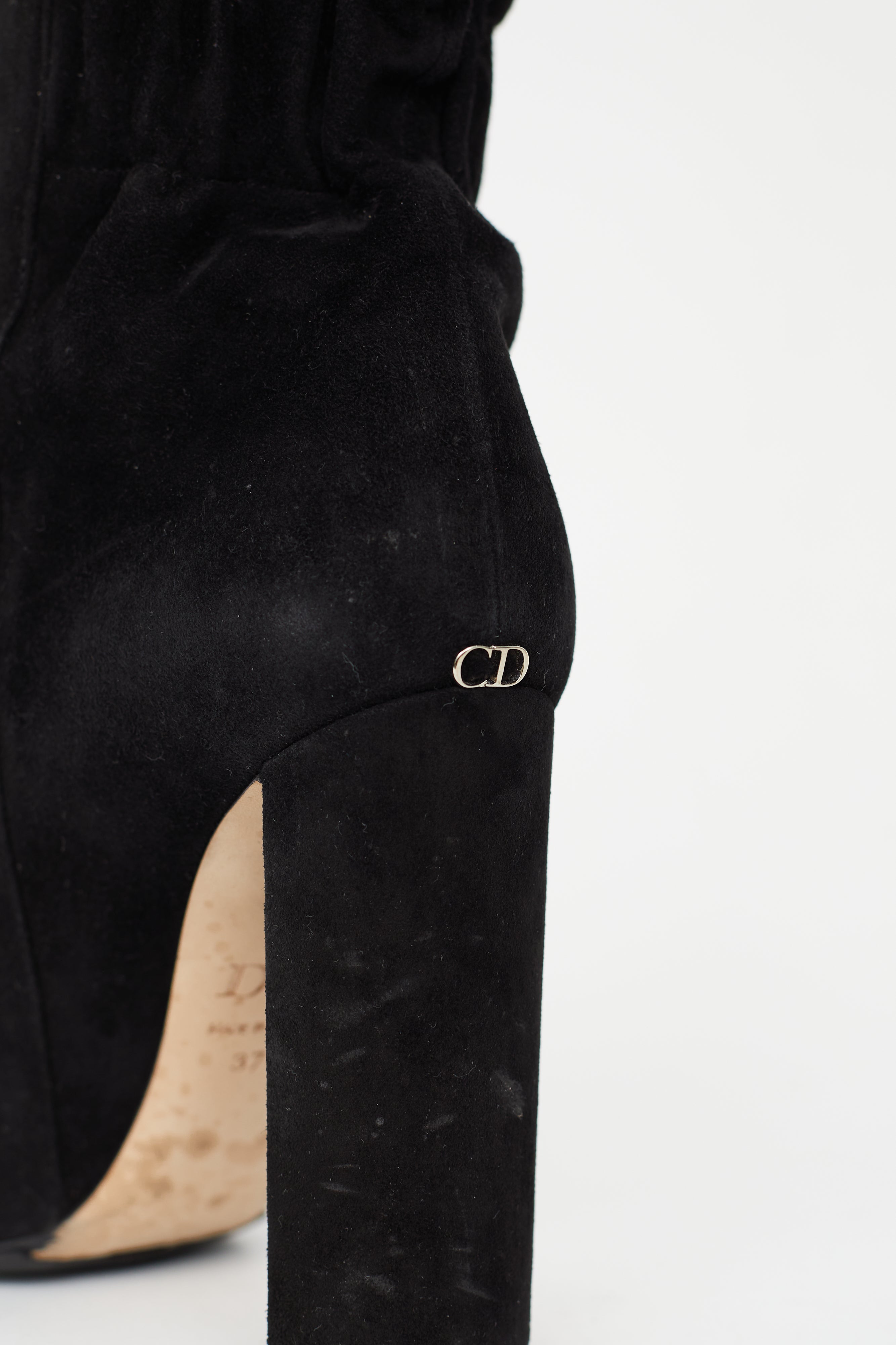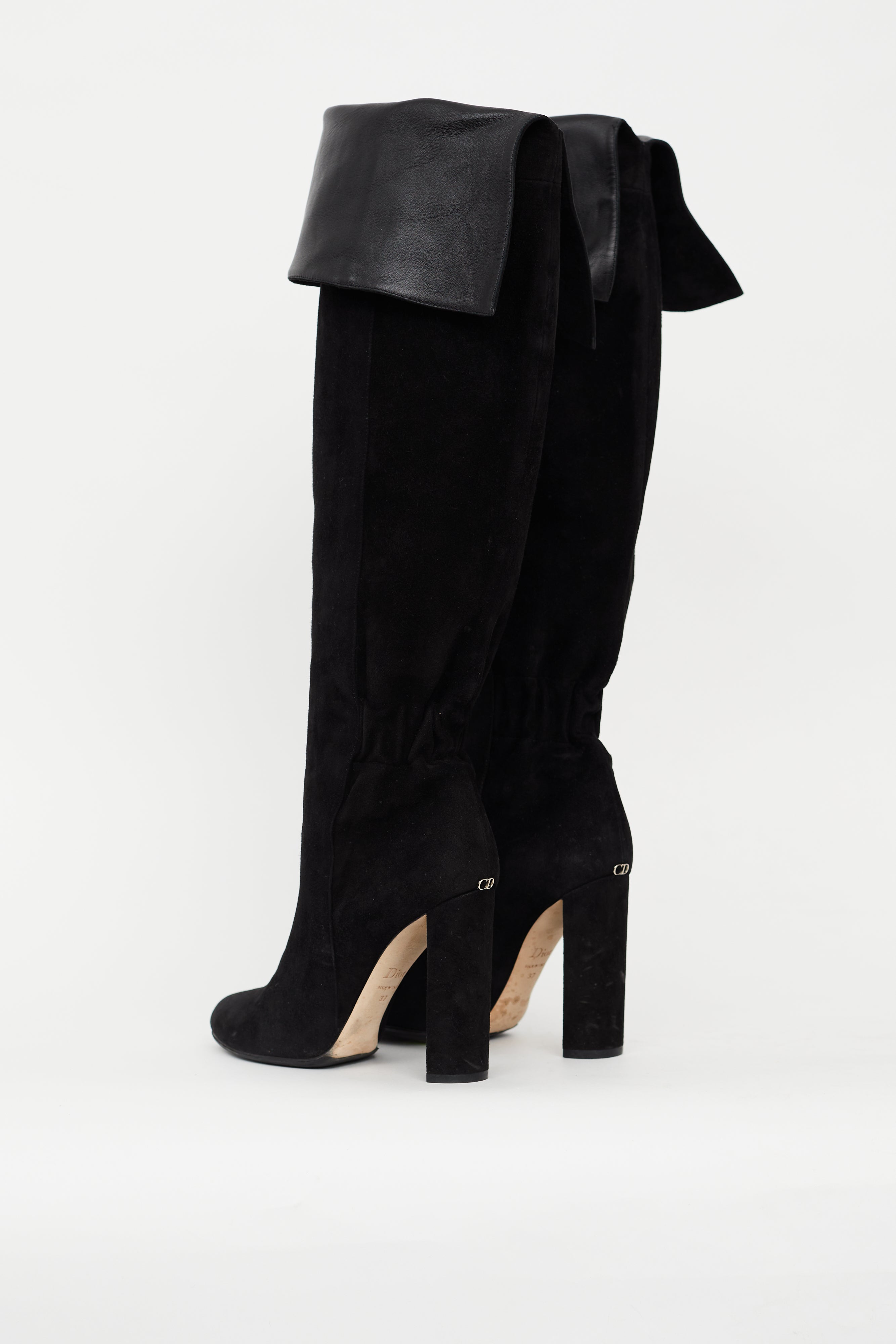 Pre-owned Dior knee high boot in black suede featuring folded over top with tonal leather lining, elasticized cinching at ankle, almond toe cap, silver-tone CD logo at heel and flat block heel. Comes with original box.