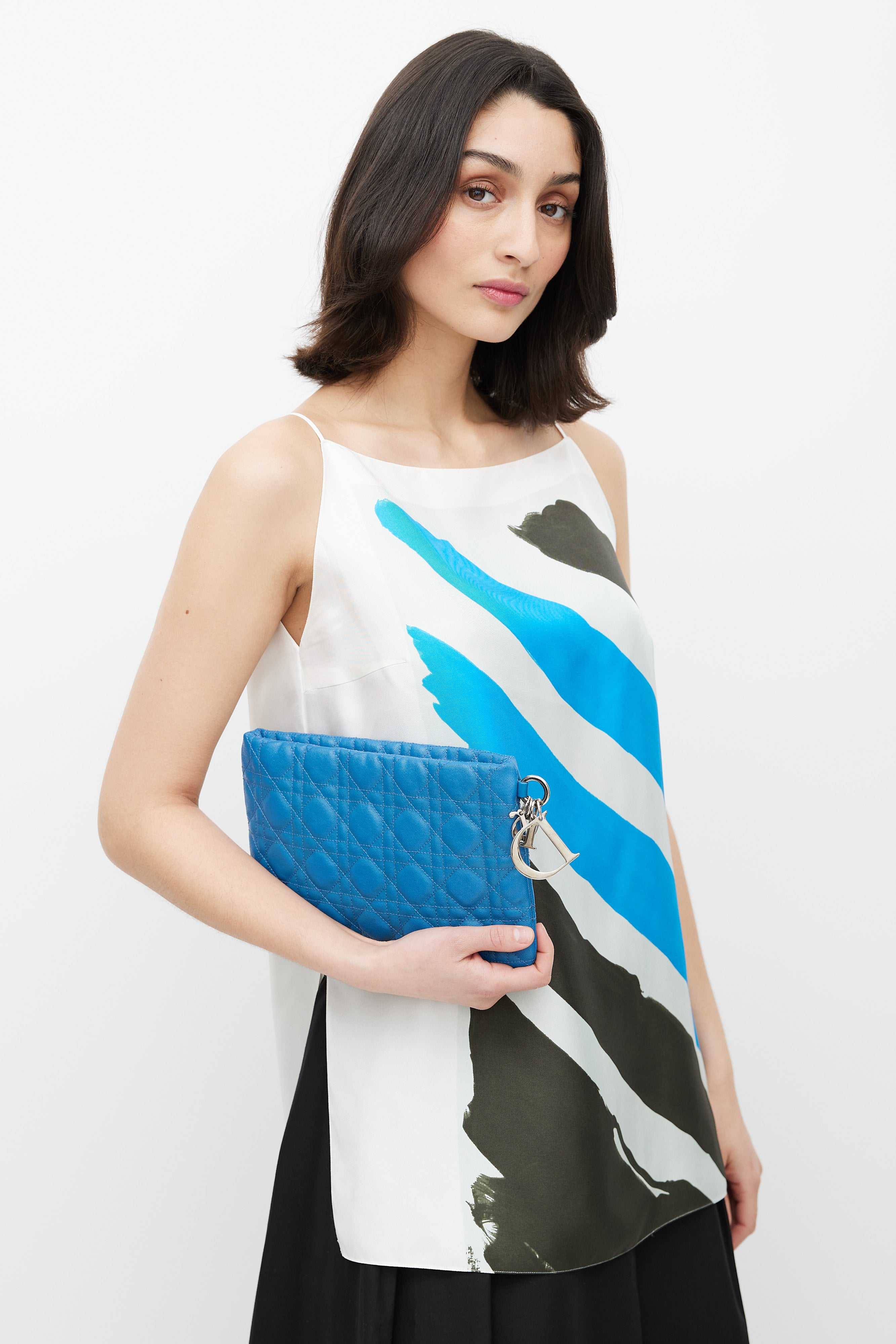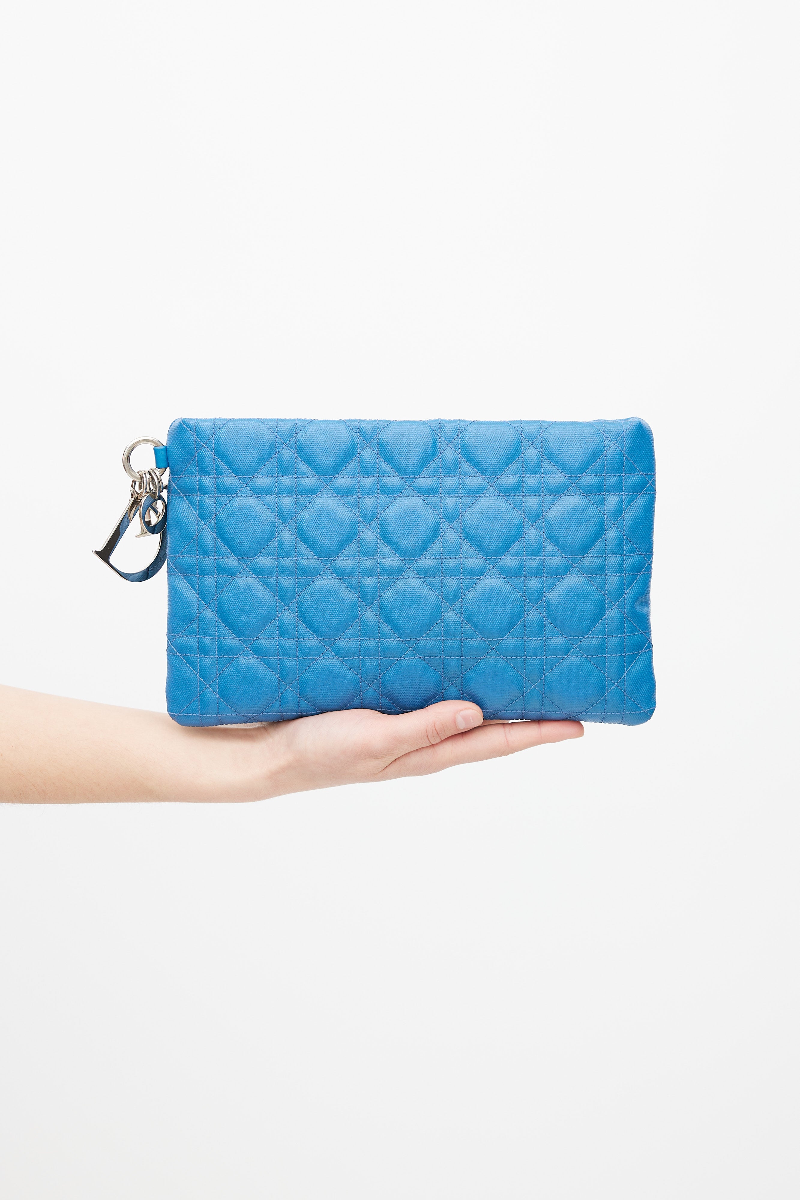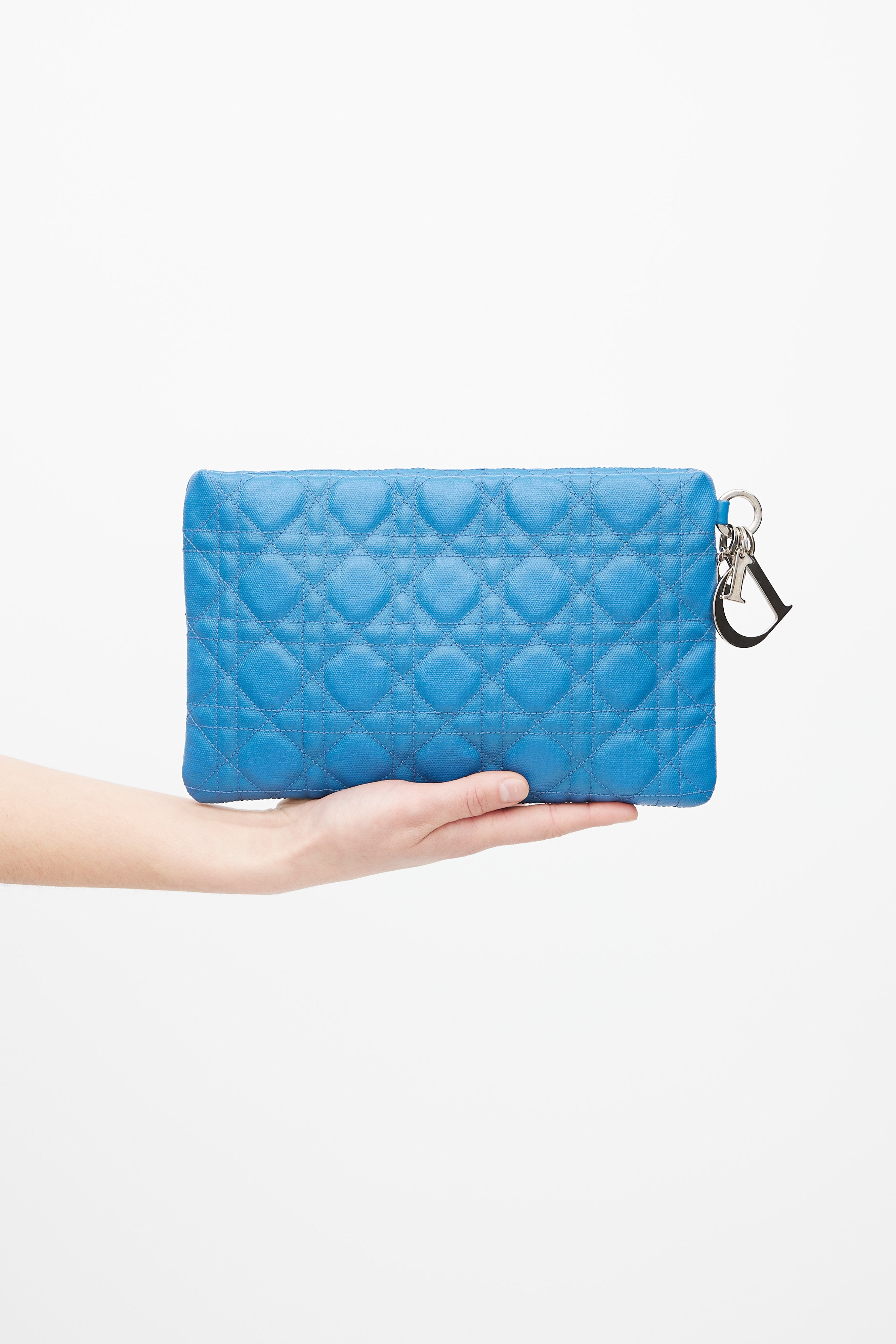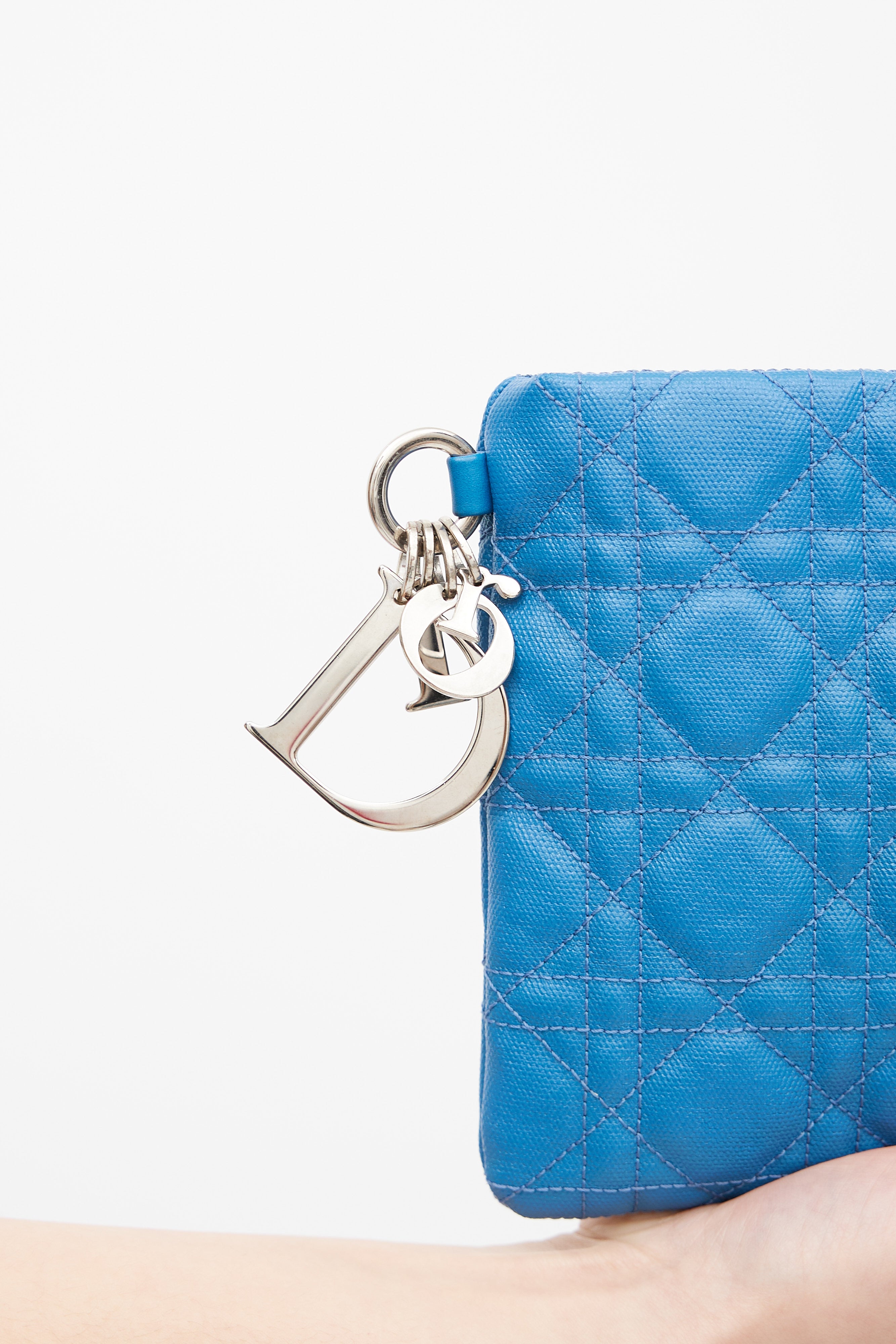 Pre-owned Christian Dior blue pouch featuring Cannage embroidery throughout, silver tone "D.I.O.R." charms, silver tone zip closure at top, canvas lining, and one interior slip pocket.