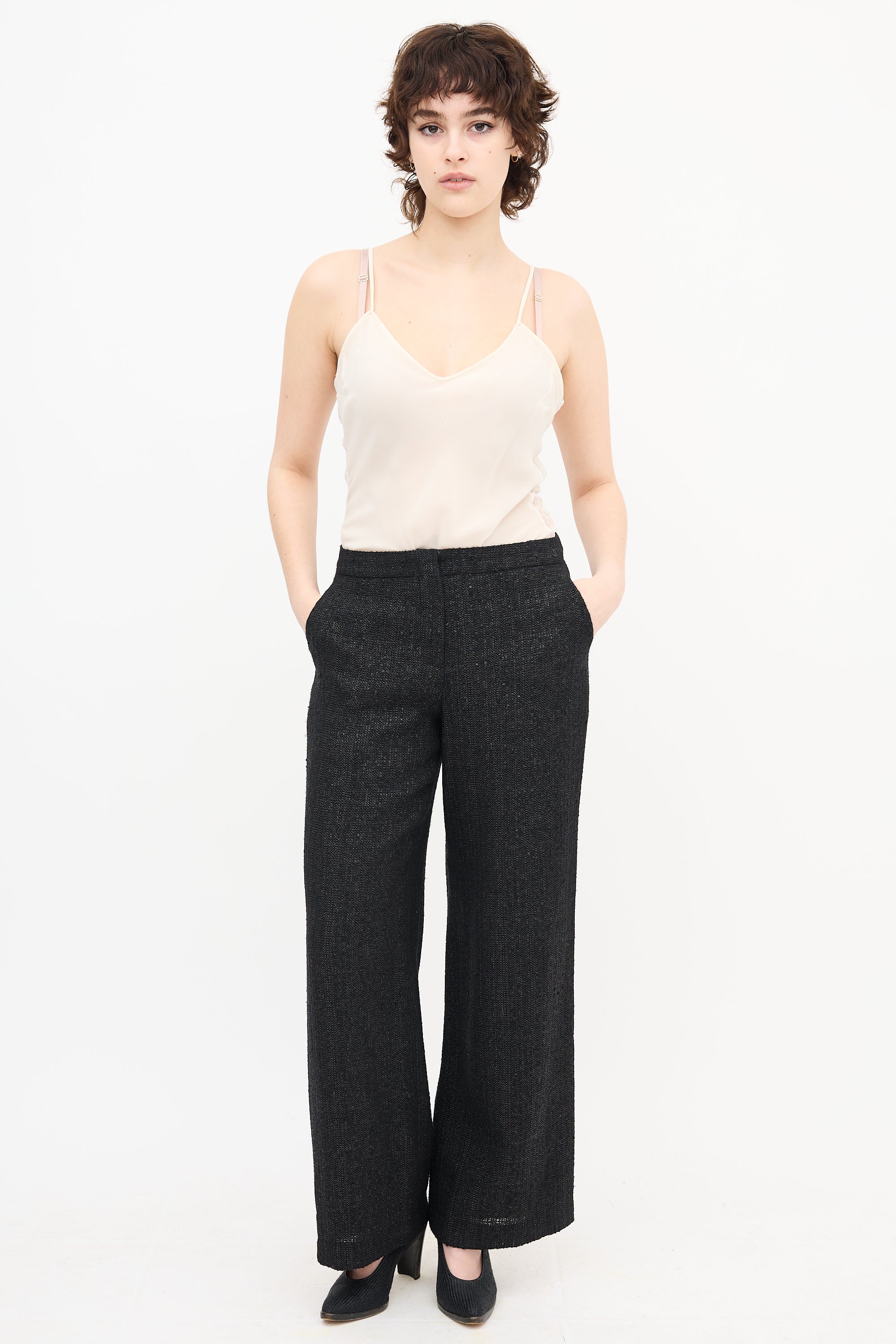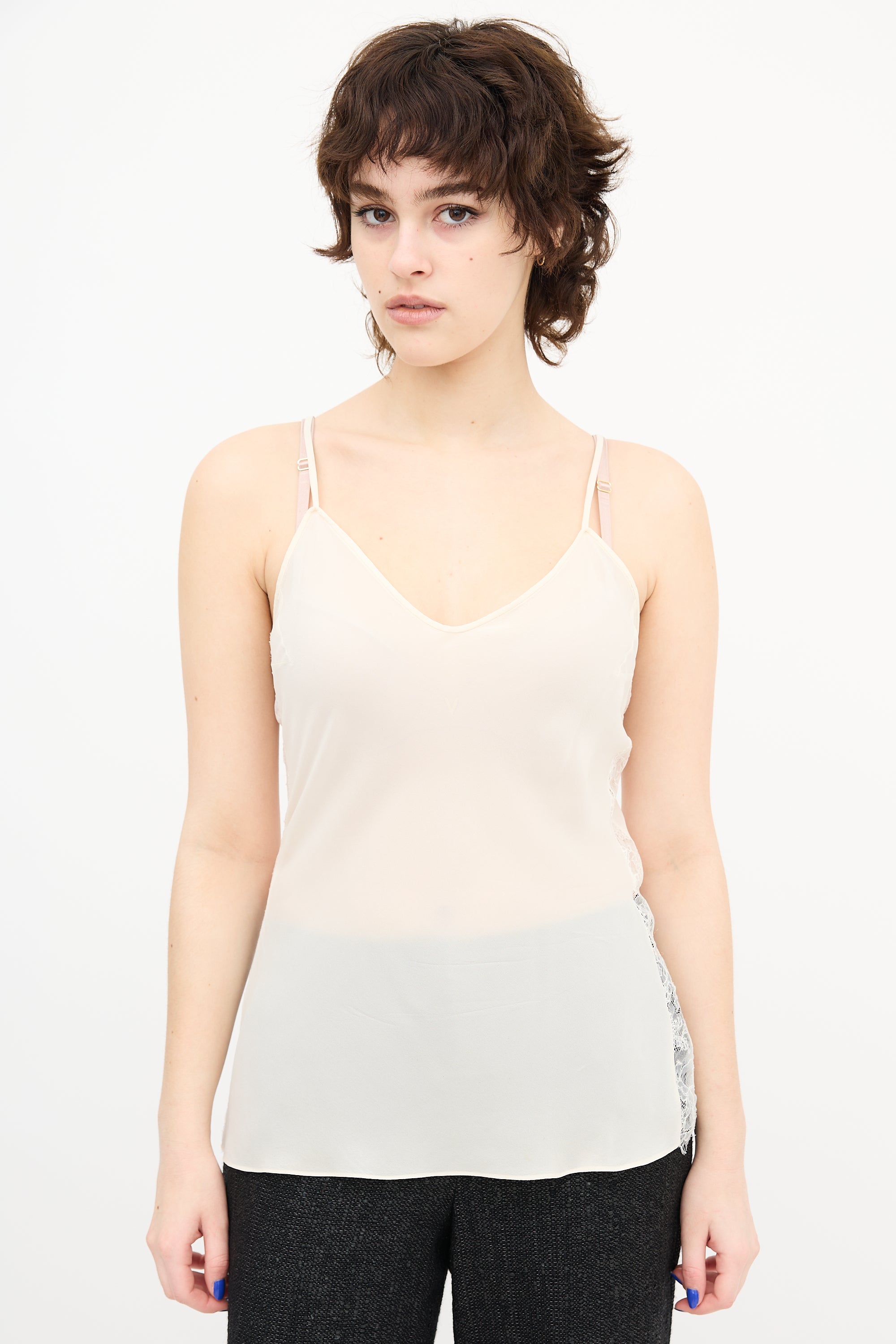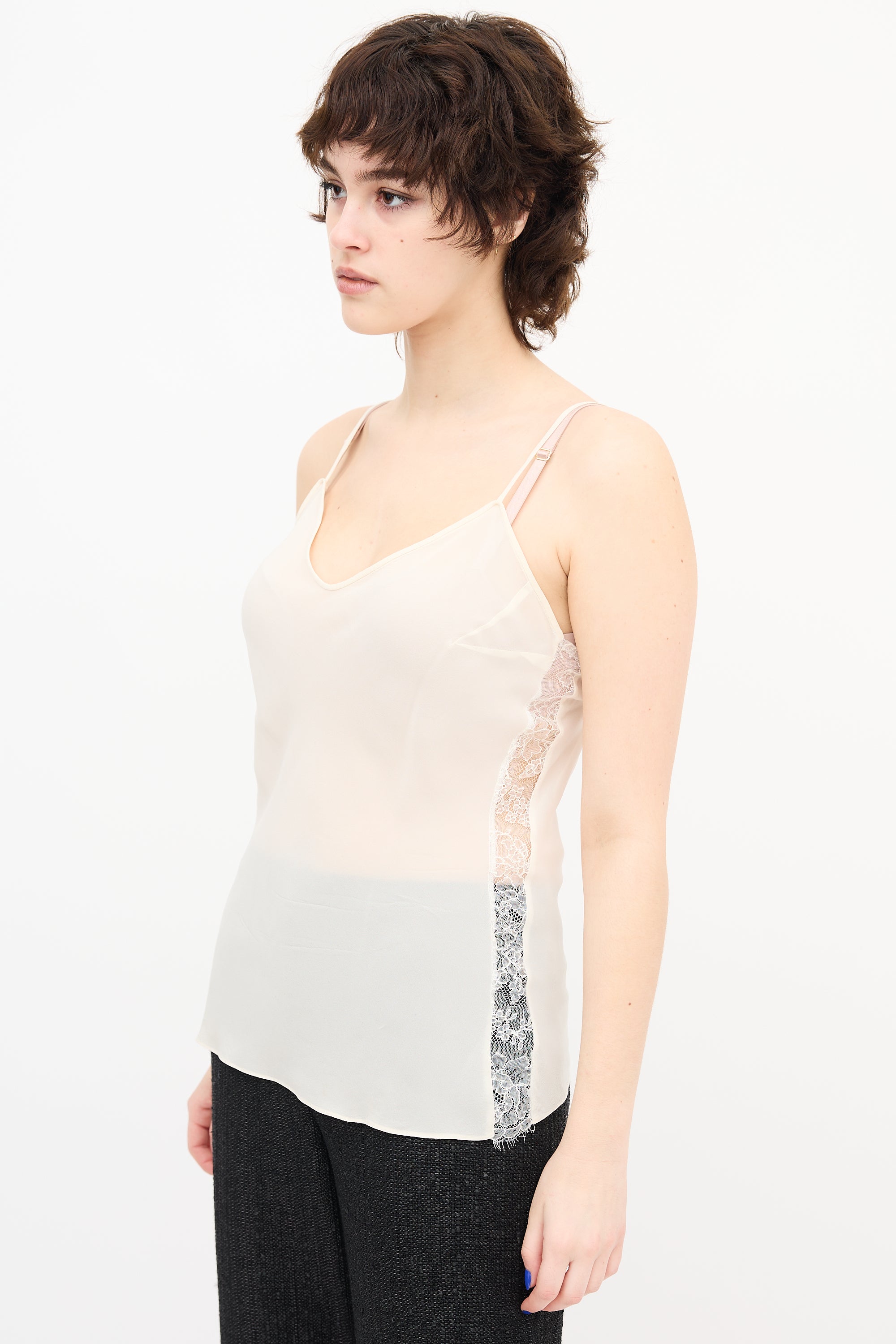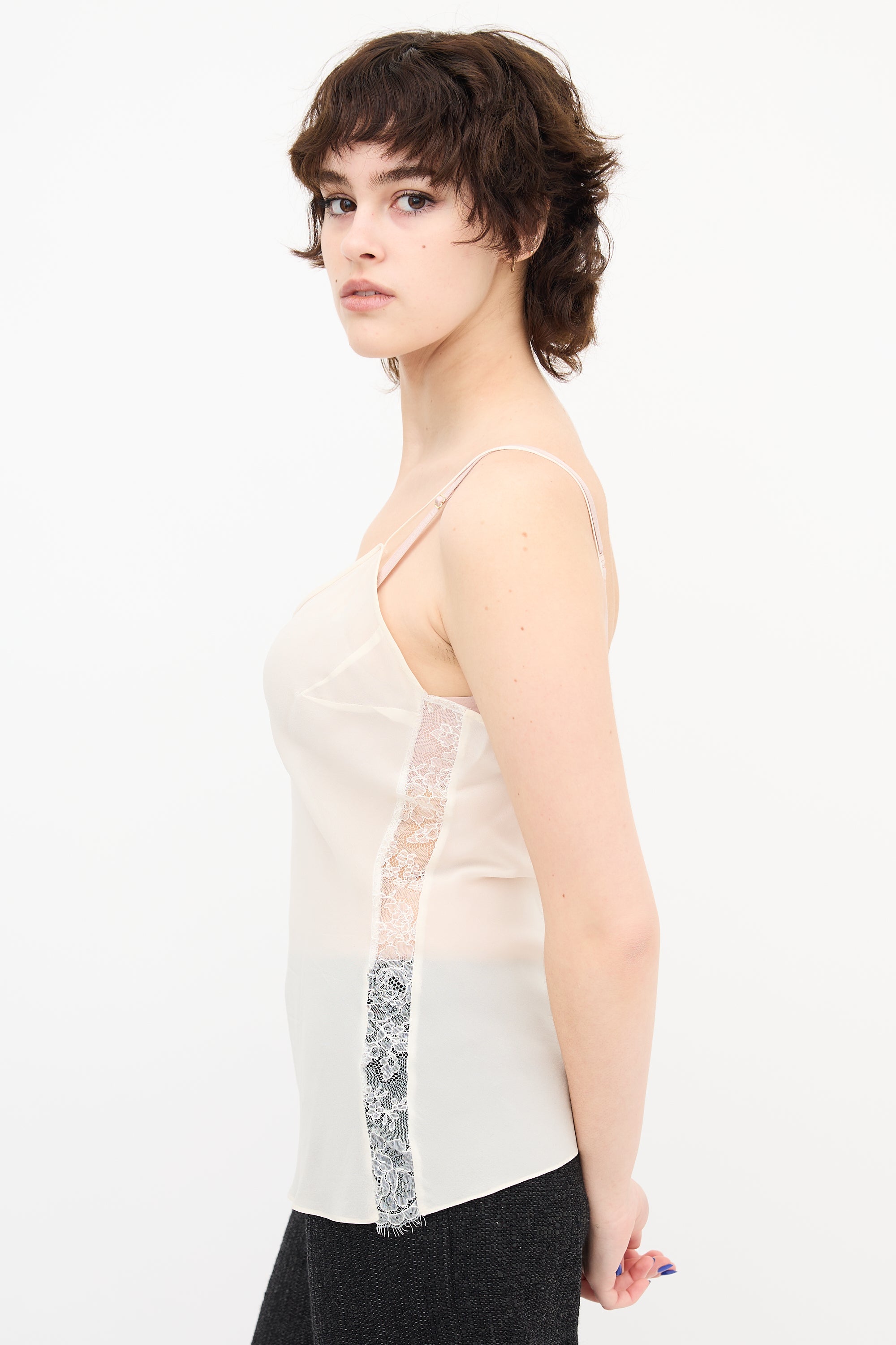Pre-owned Dior cream tank top featuring a V-neck, fixed straps, and lace panels at sides.