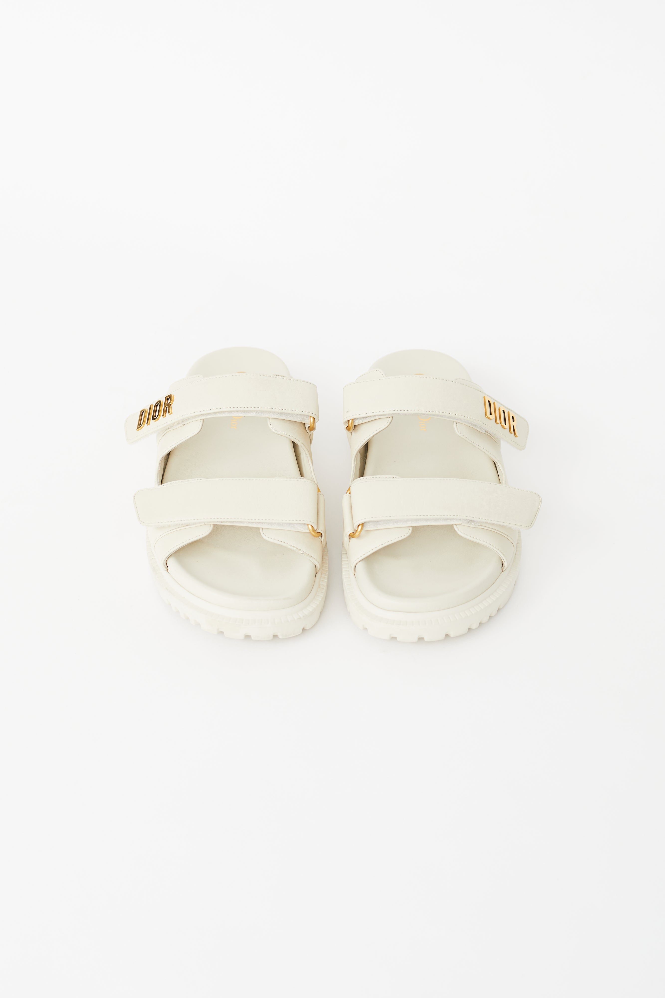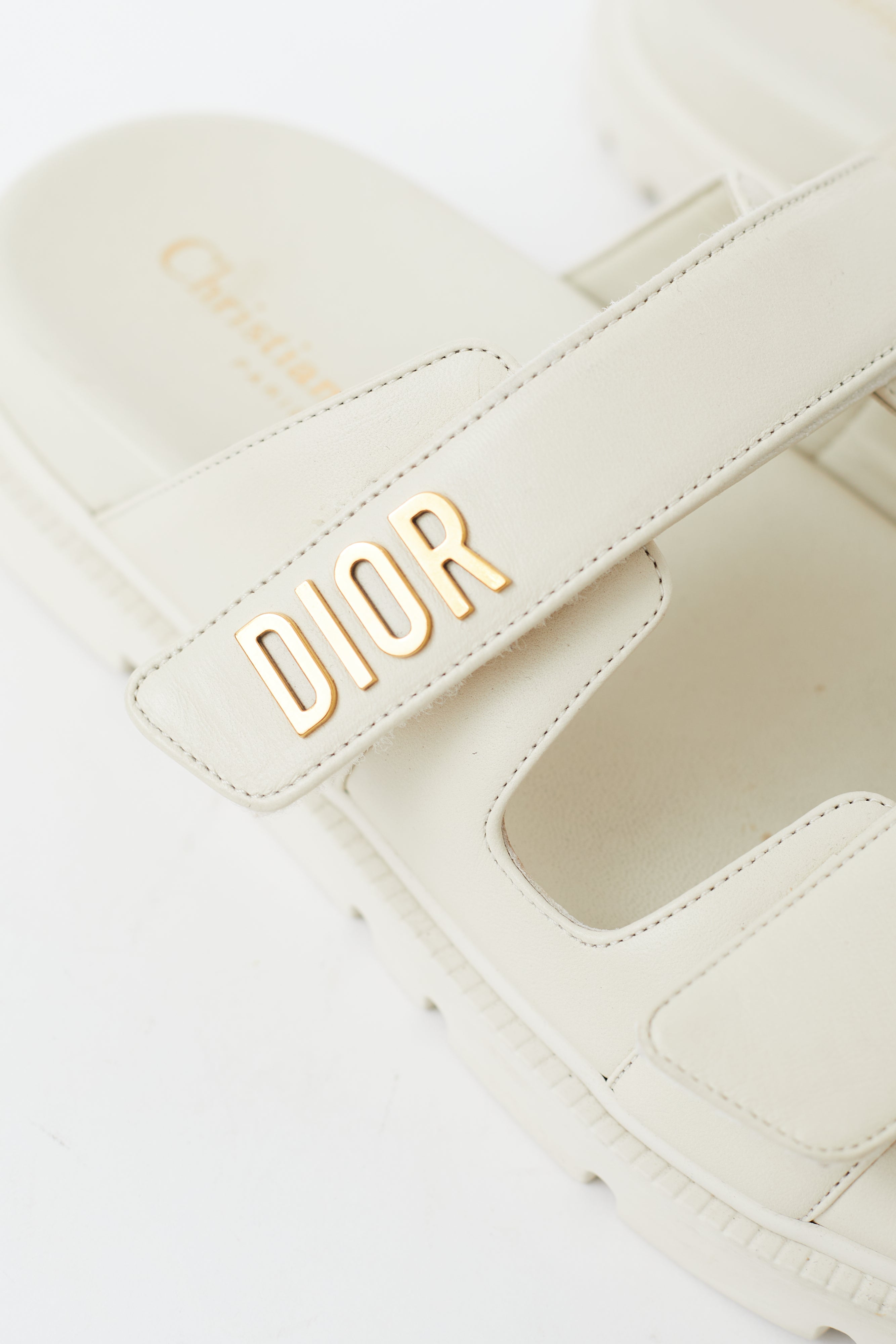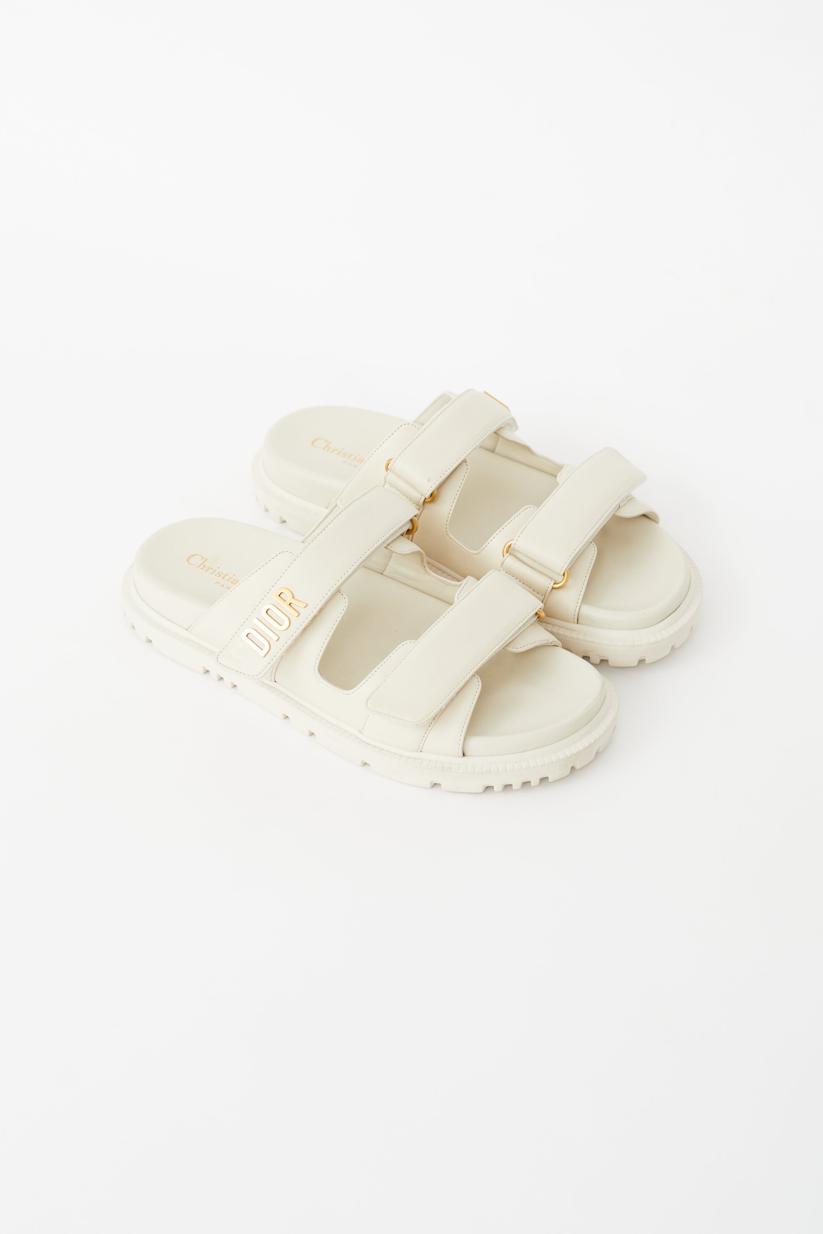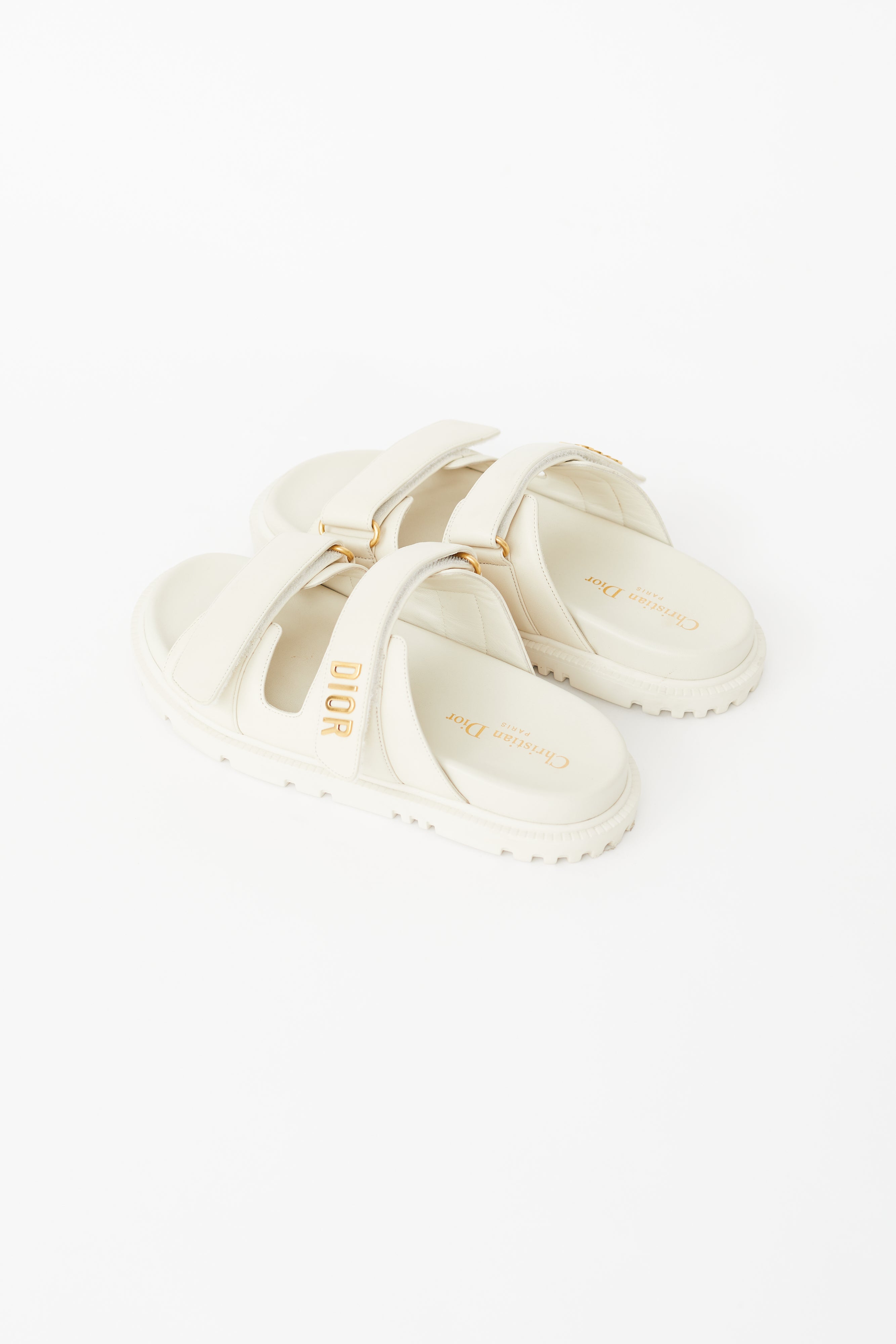 Pre-owned Dior cream Dioract slides featuring rounded toe, Velcro straps fastening, rubber ridged outsole, gold tone logo hardware at side, and stamped logo at insole.