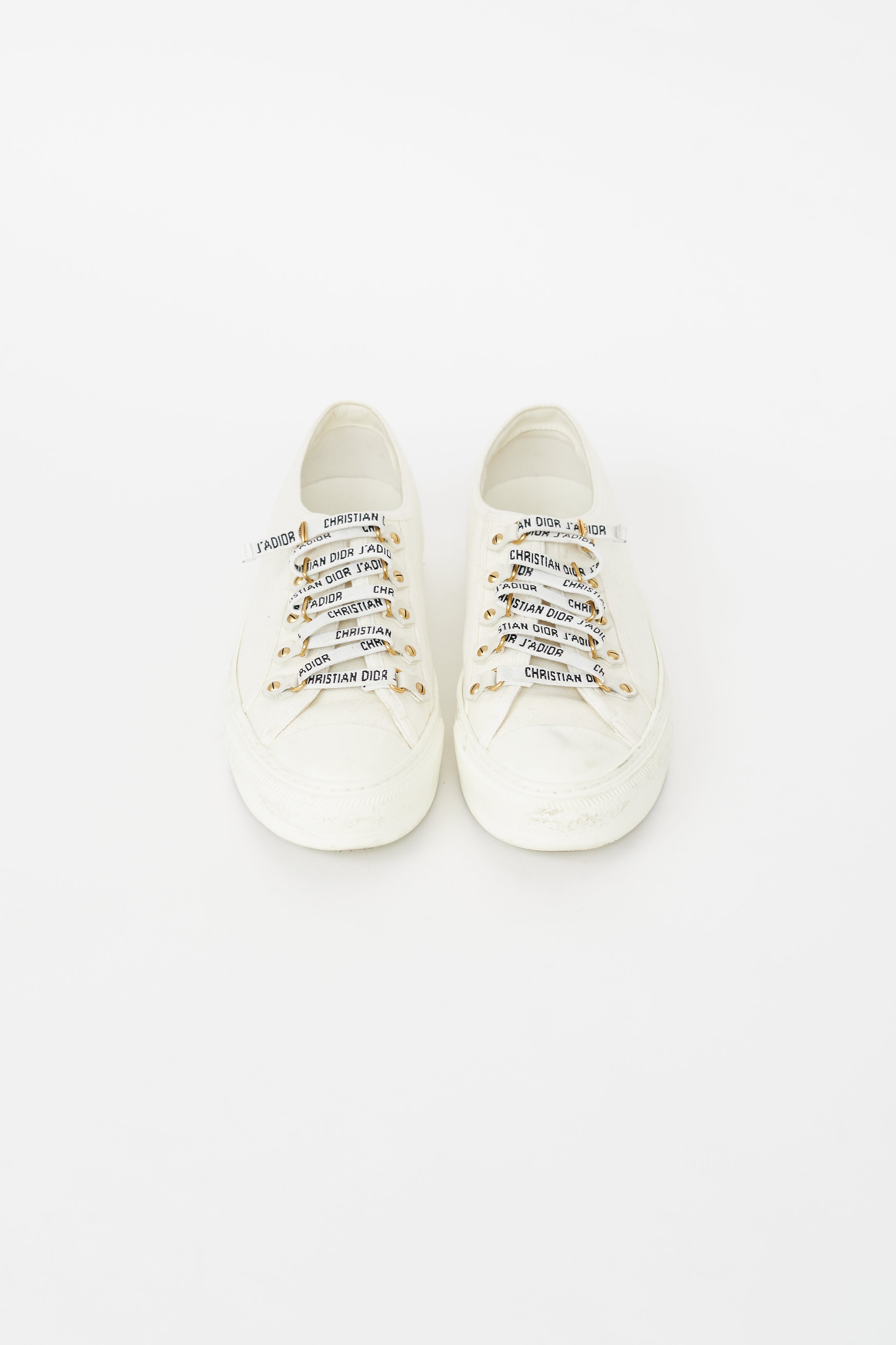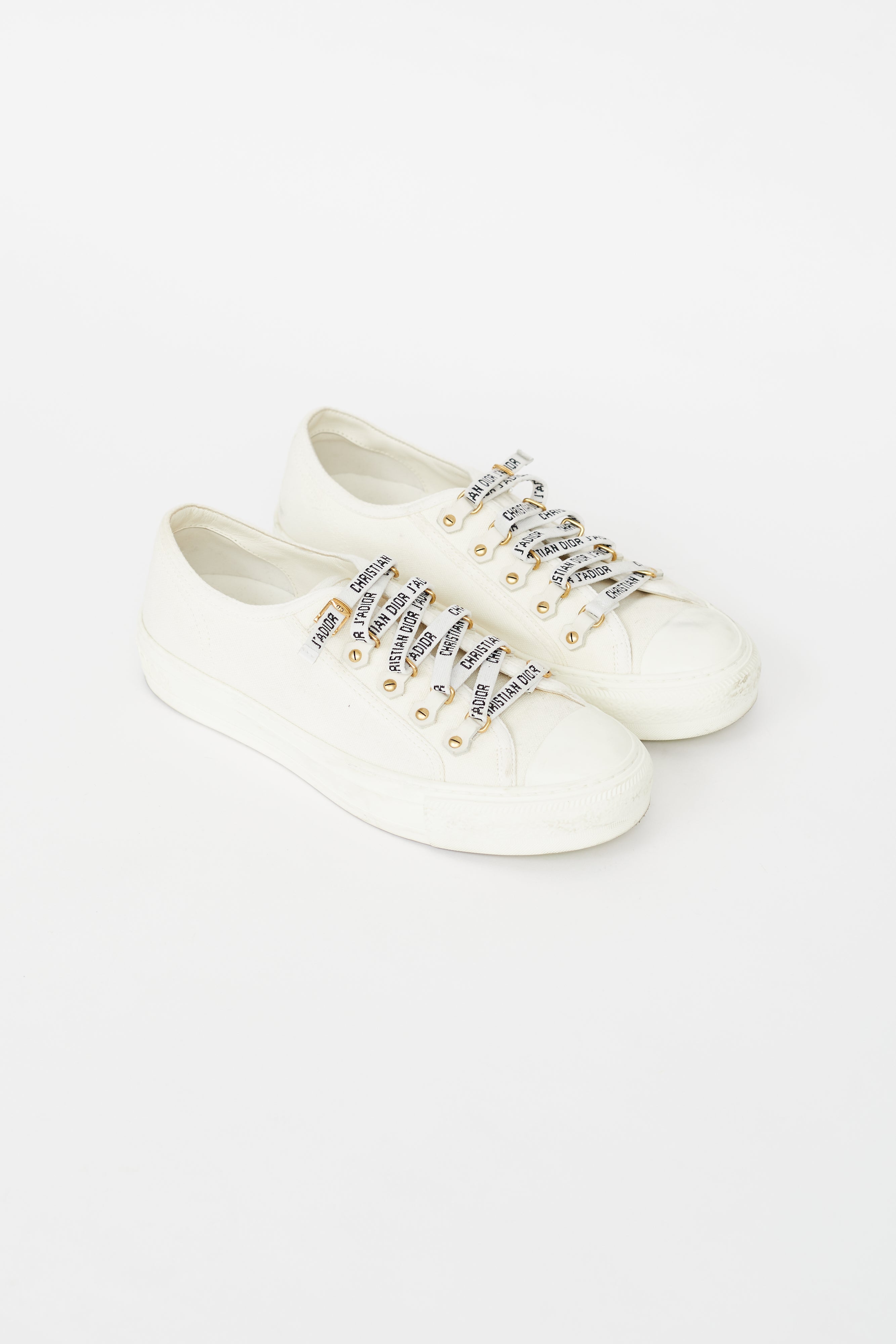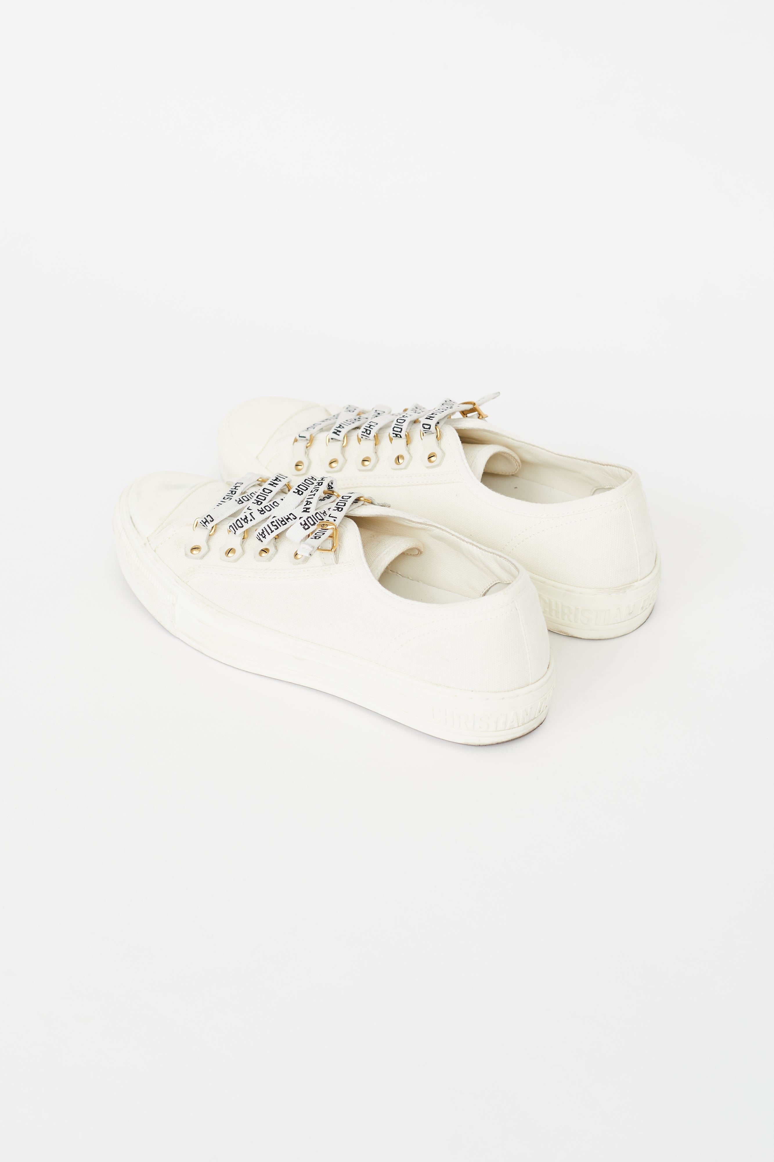 Pre-owned Dior cream Walk'N'Dior canvas sneakers featuring a round cap toe, embossed logo at heel, gold tone eyelet hardware, and lace up closure.