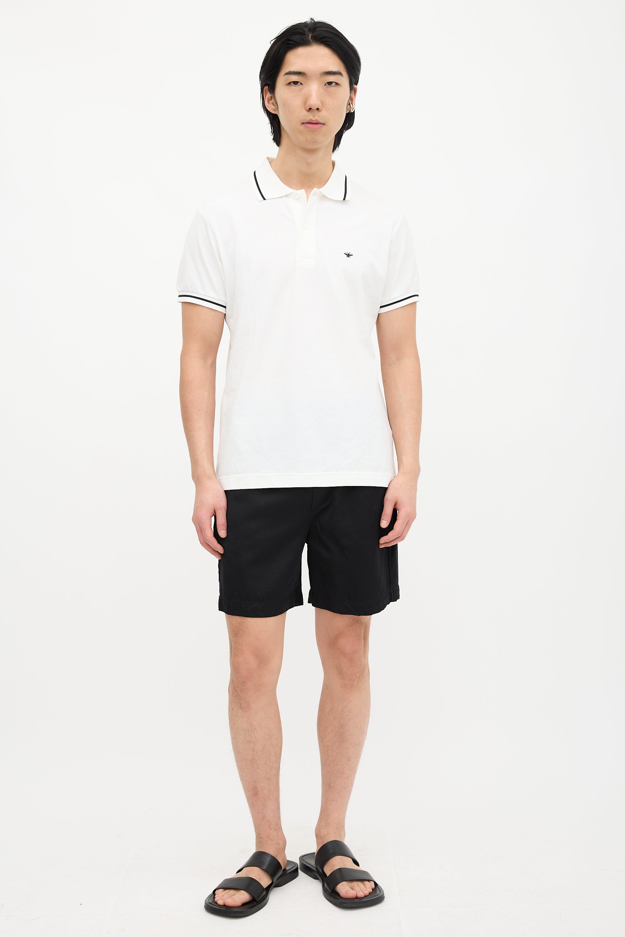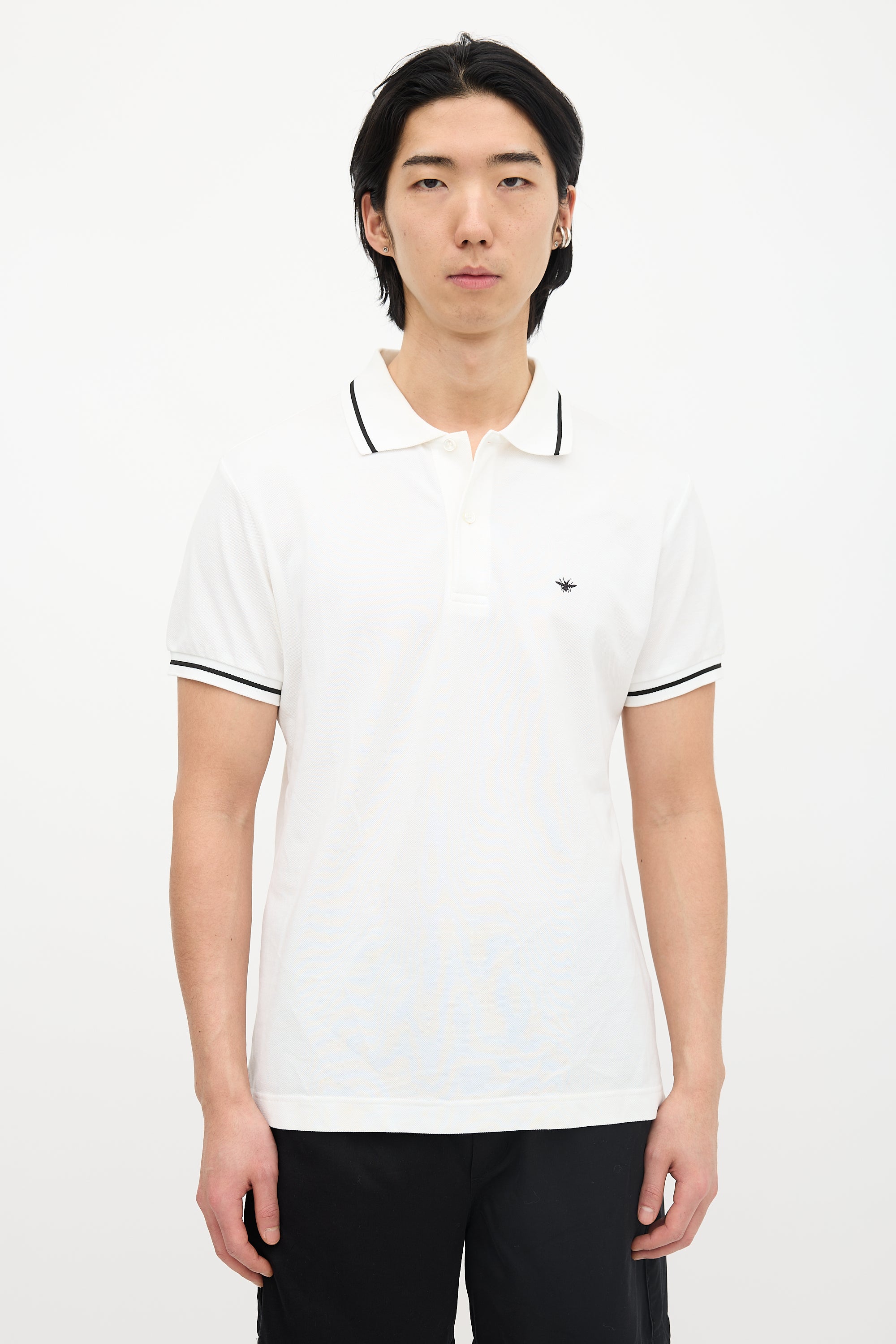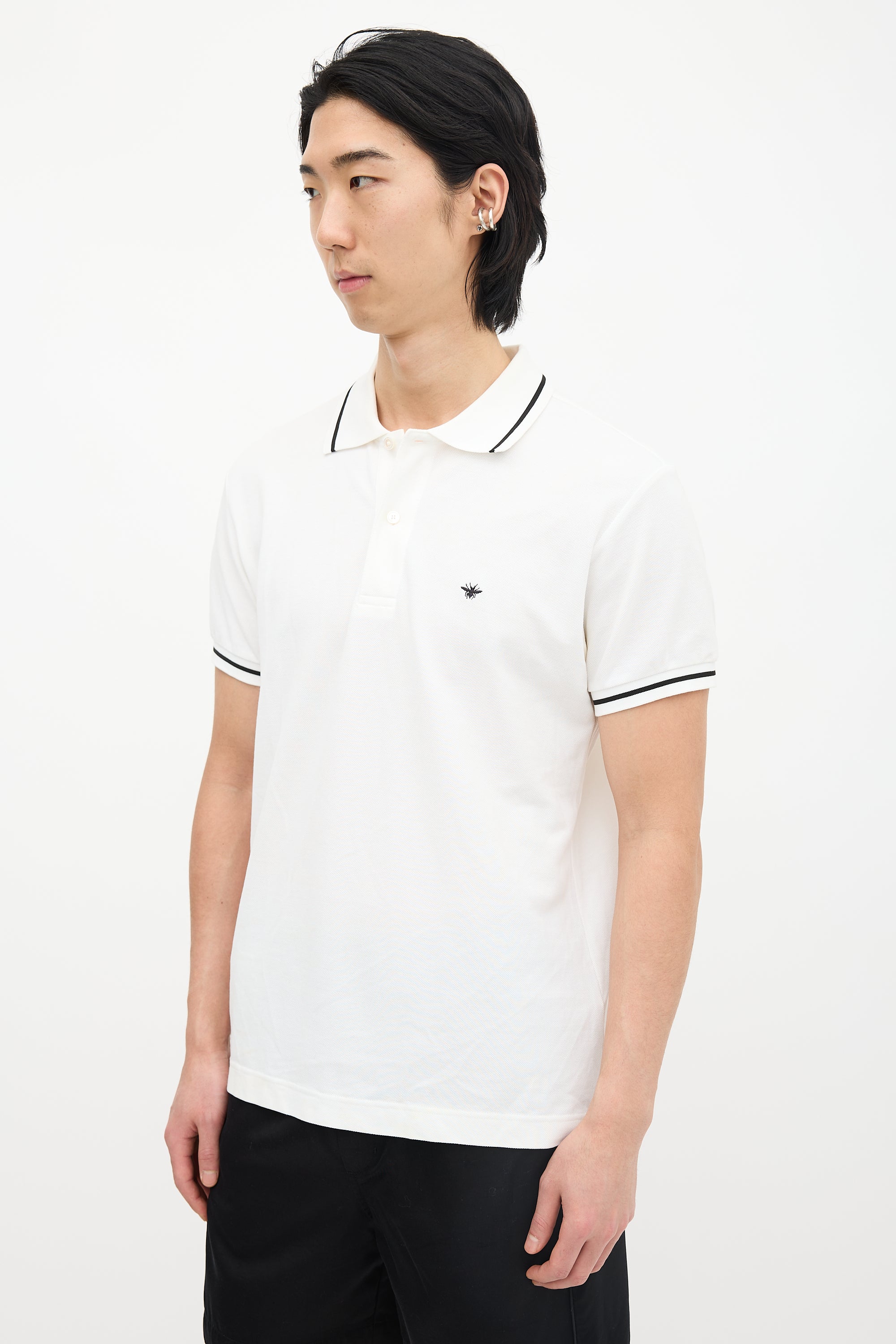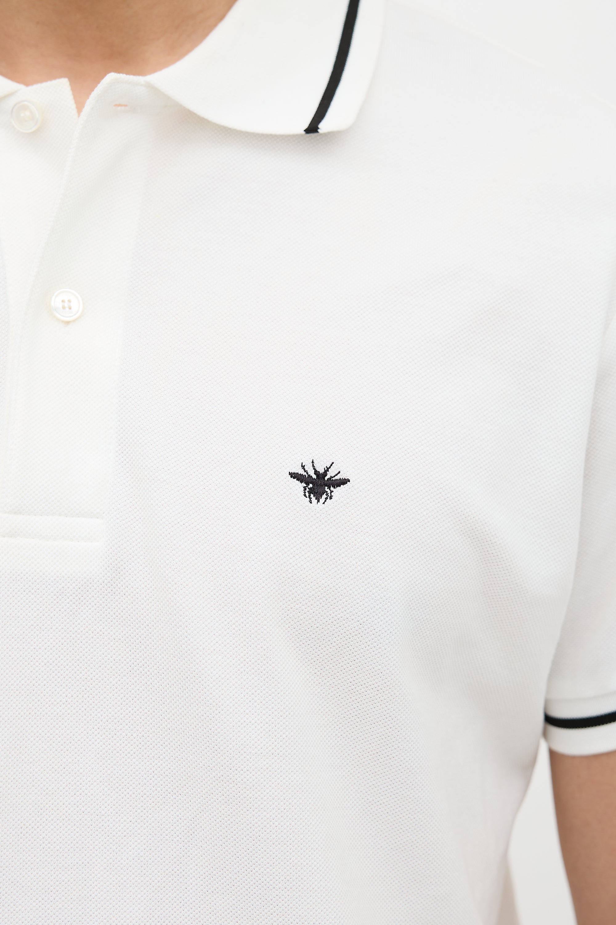 Pre-owned Dior white pique polo top featuring cutaway collar, button up neckline, black embroidered bee motif at left chest, and stripe ribbed collar and cuffs.