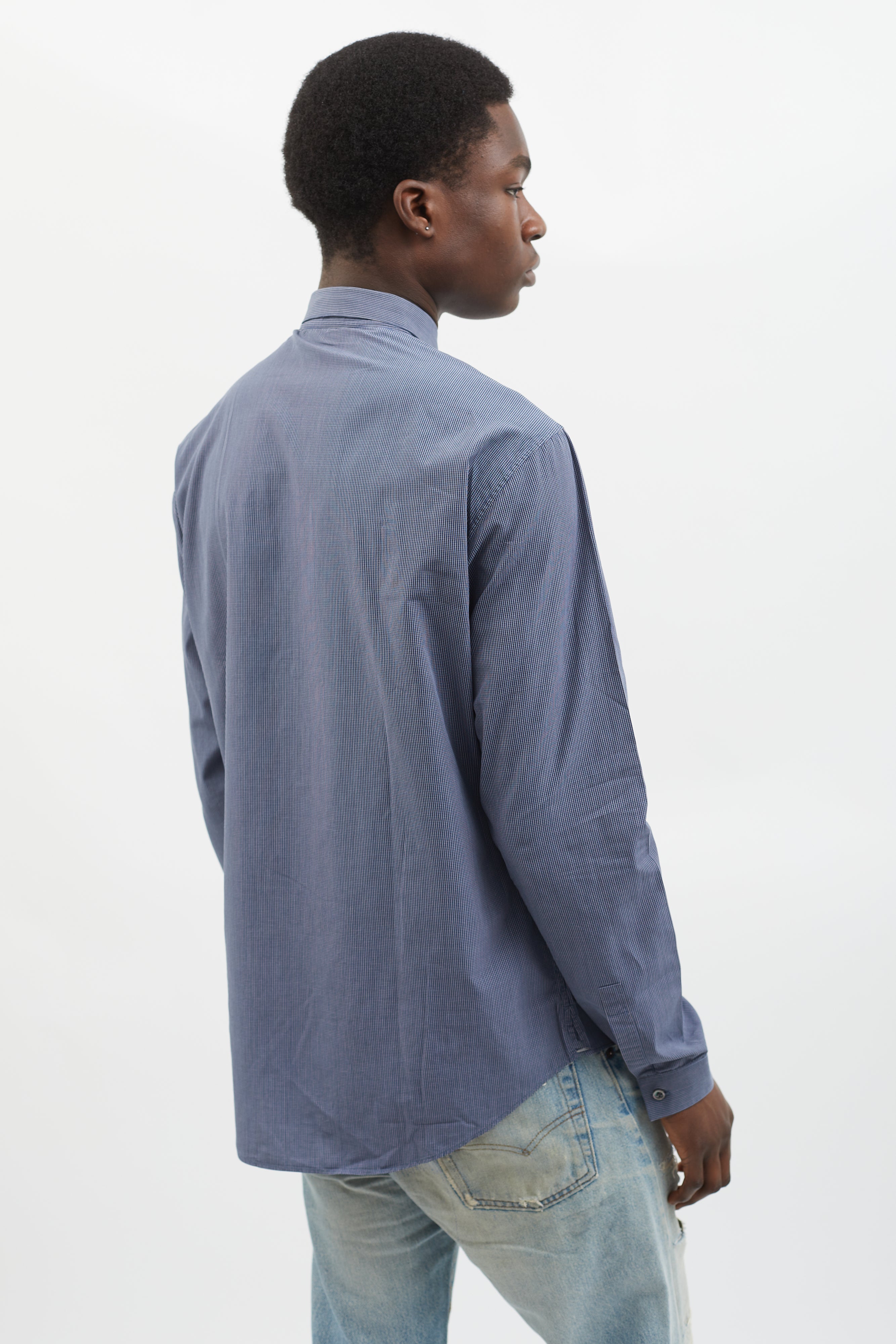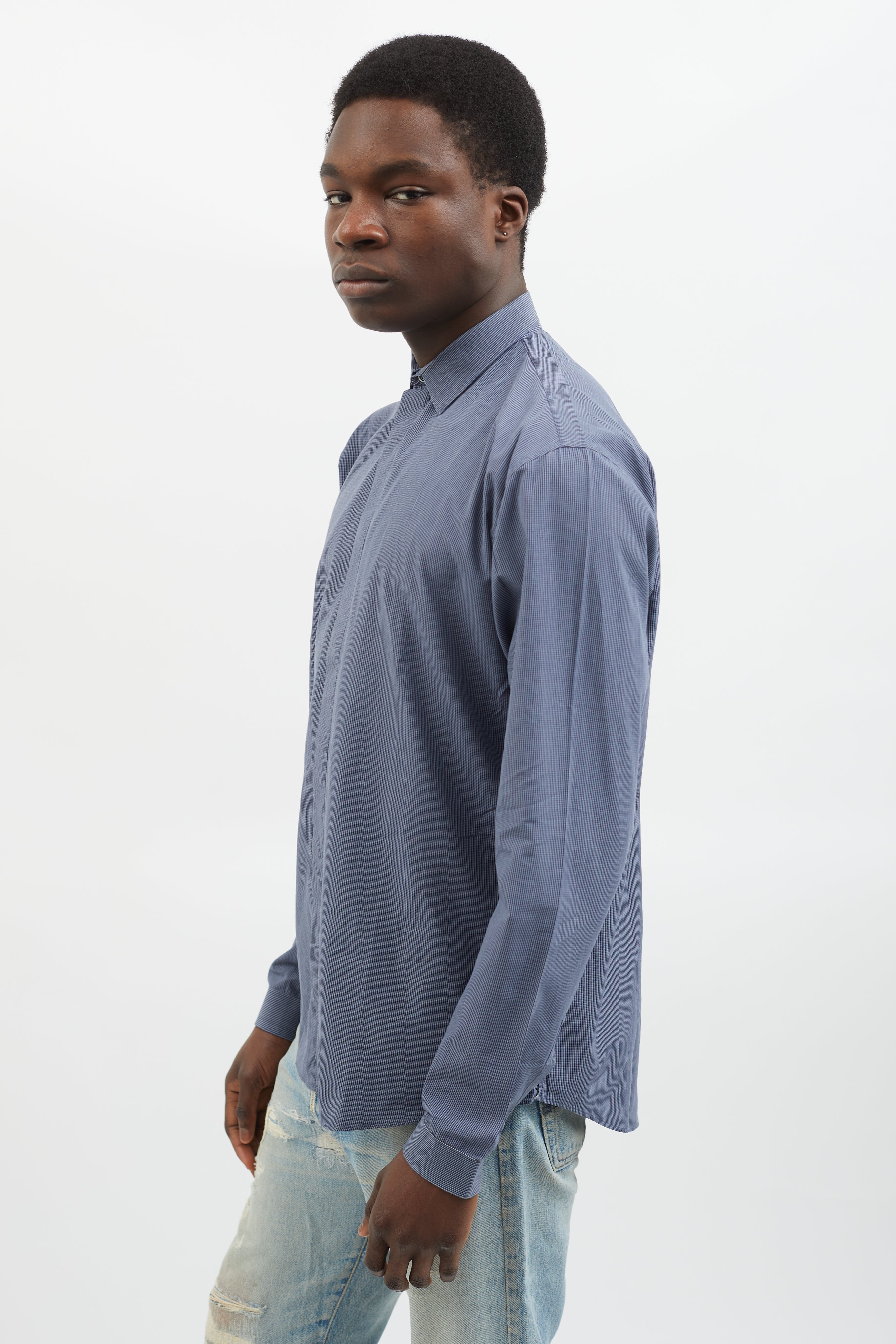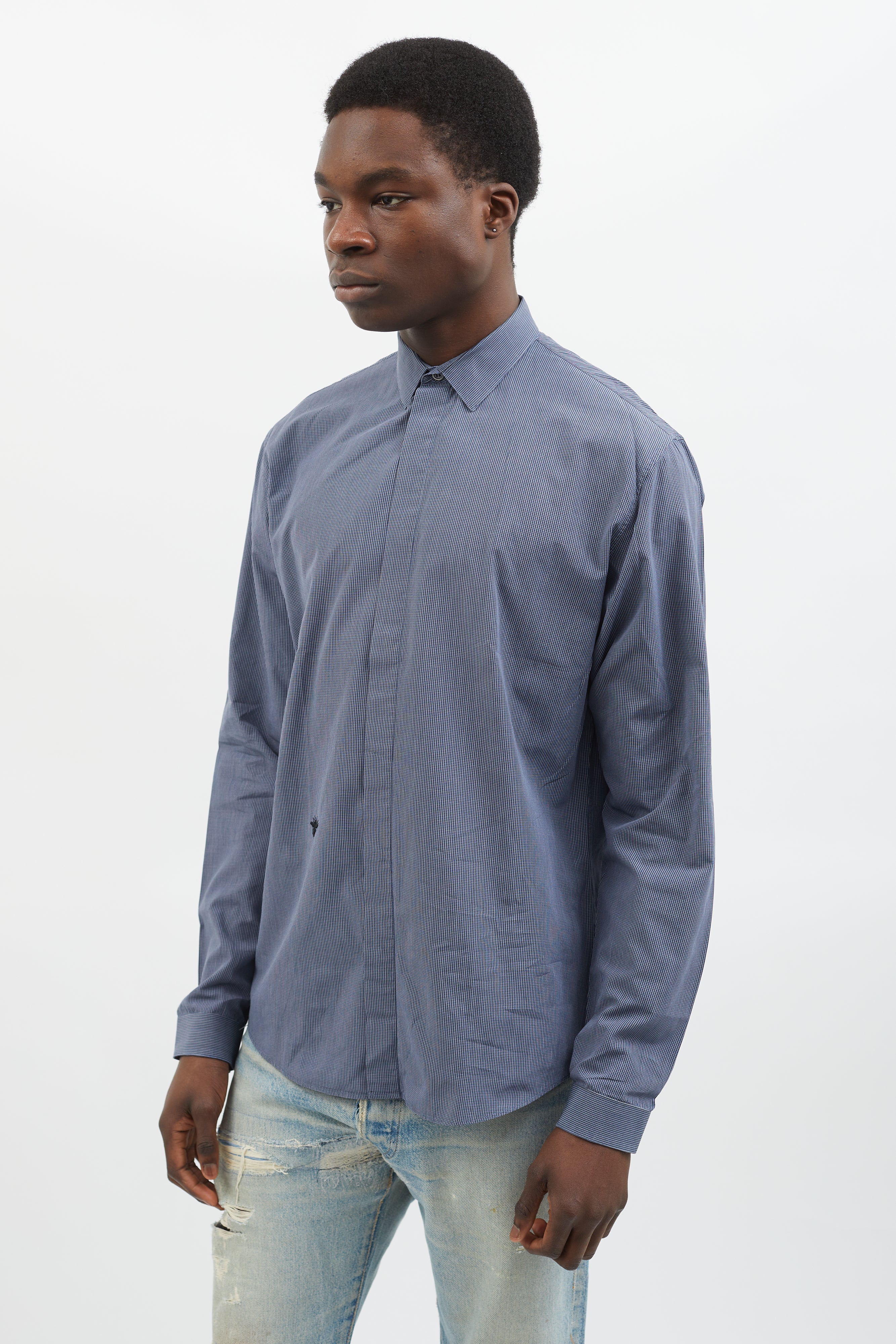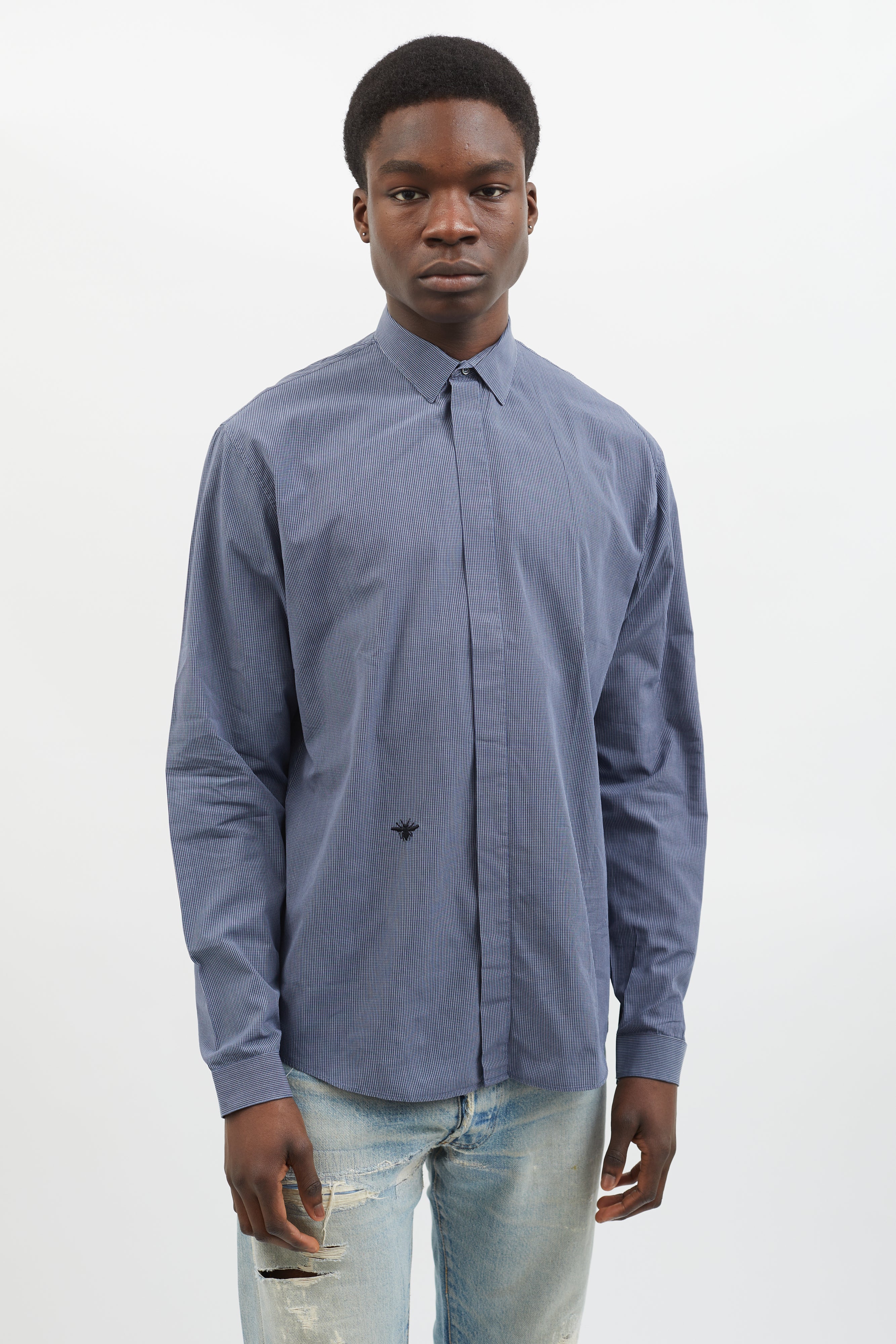Pre-owned Dior shirt in navy and white featuring check pattern, long sleeve design, classic collar, concealed button closure at front, shirttail hem, and navy bee embroidery at front.