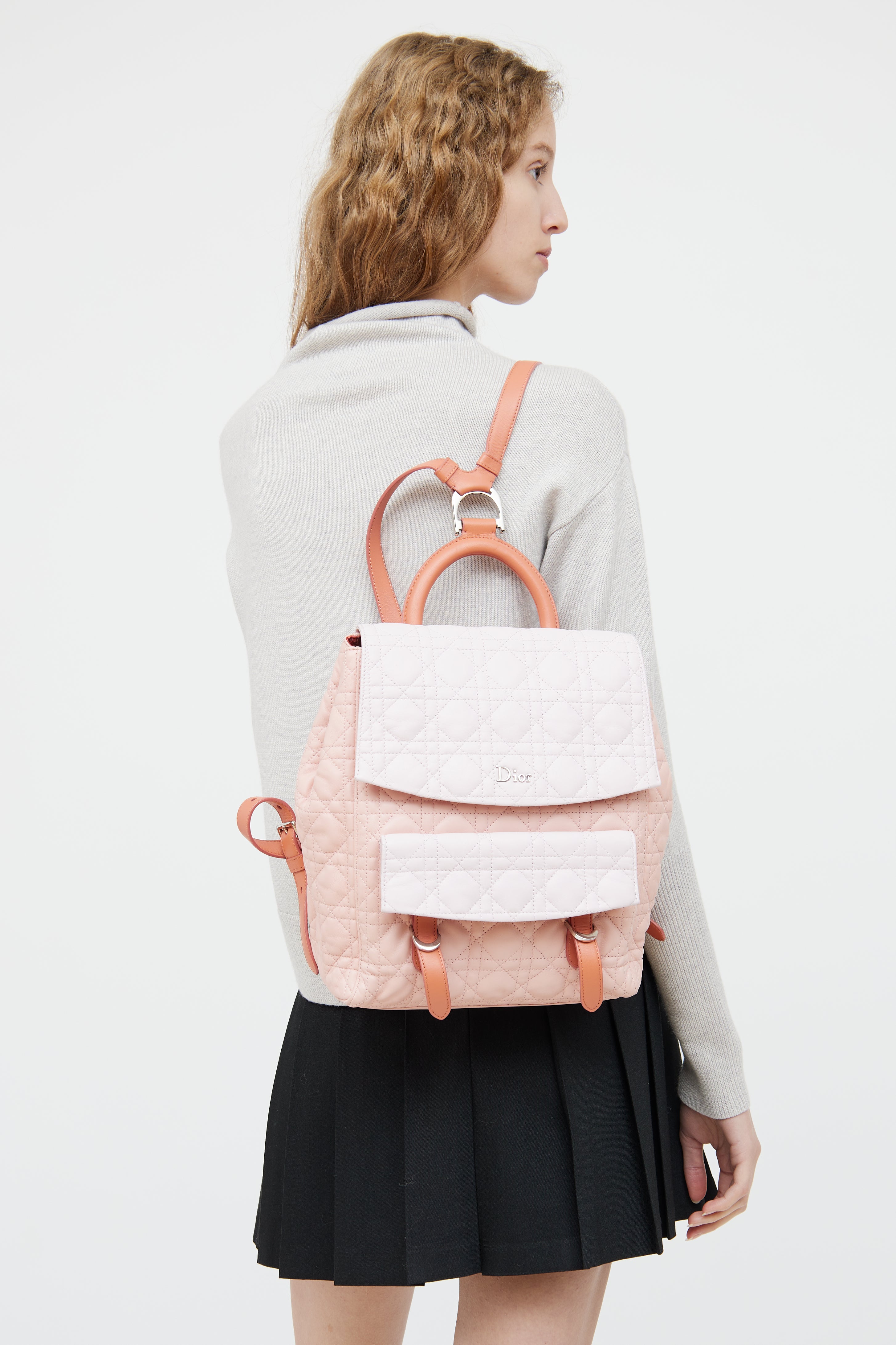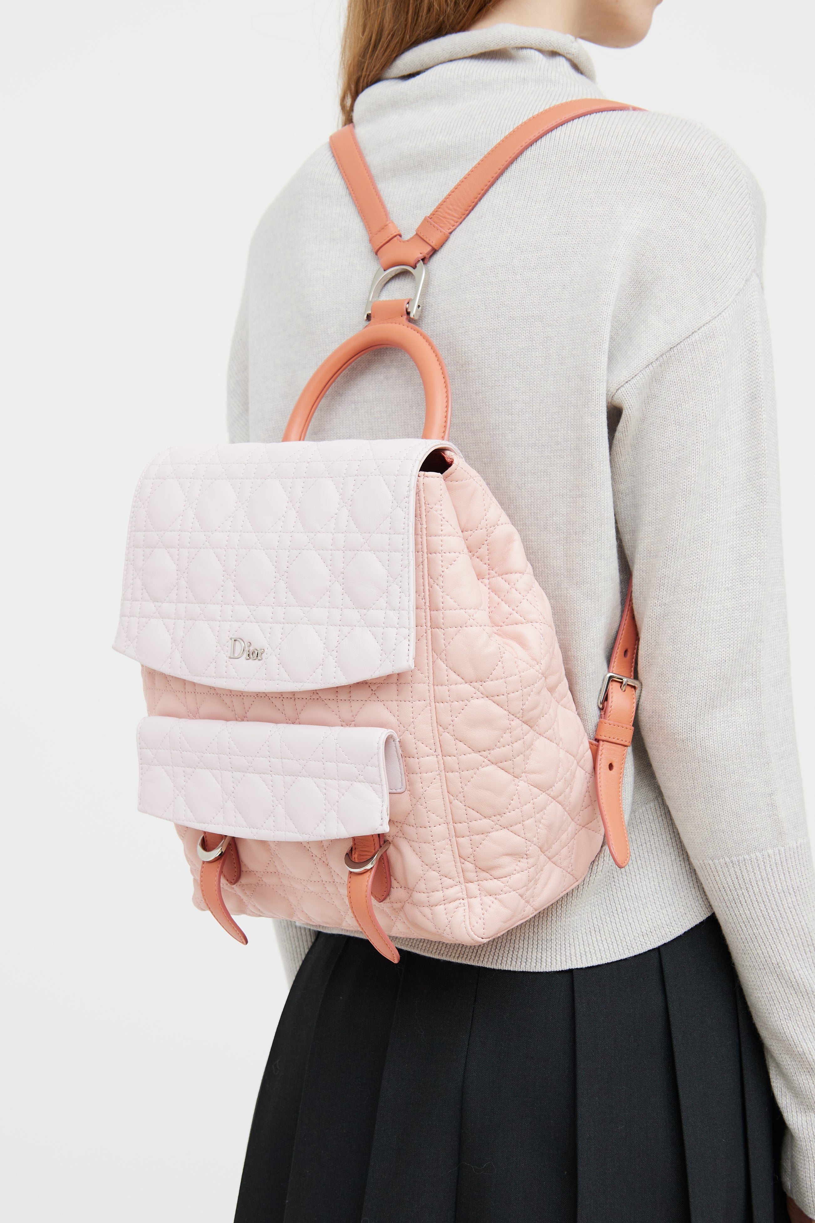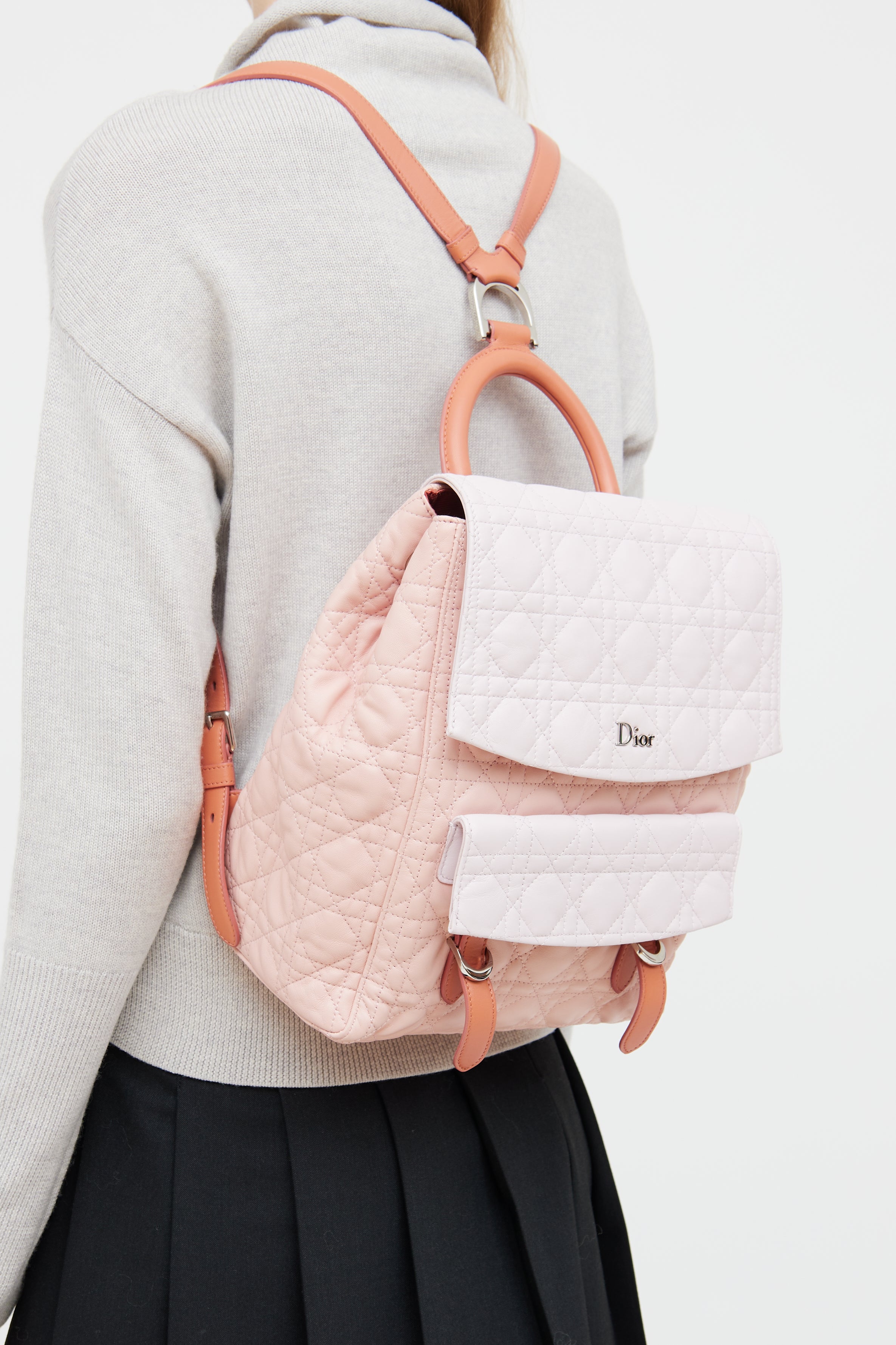 Pre-owned Dior pink Cannage quilt Stardust backpack featuring a rolled top handle with attached adjustable straps, top flap opening with magnetic closure, plaque logo at front, front flap pocket with belt closures, one main canvas lined compartment, interior leather line slip pocket, and silver tone hardware throughout.