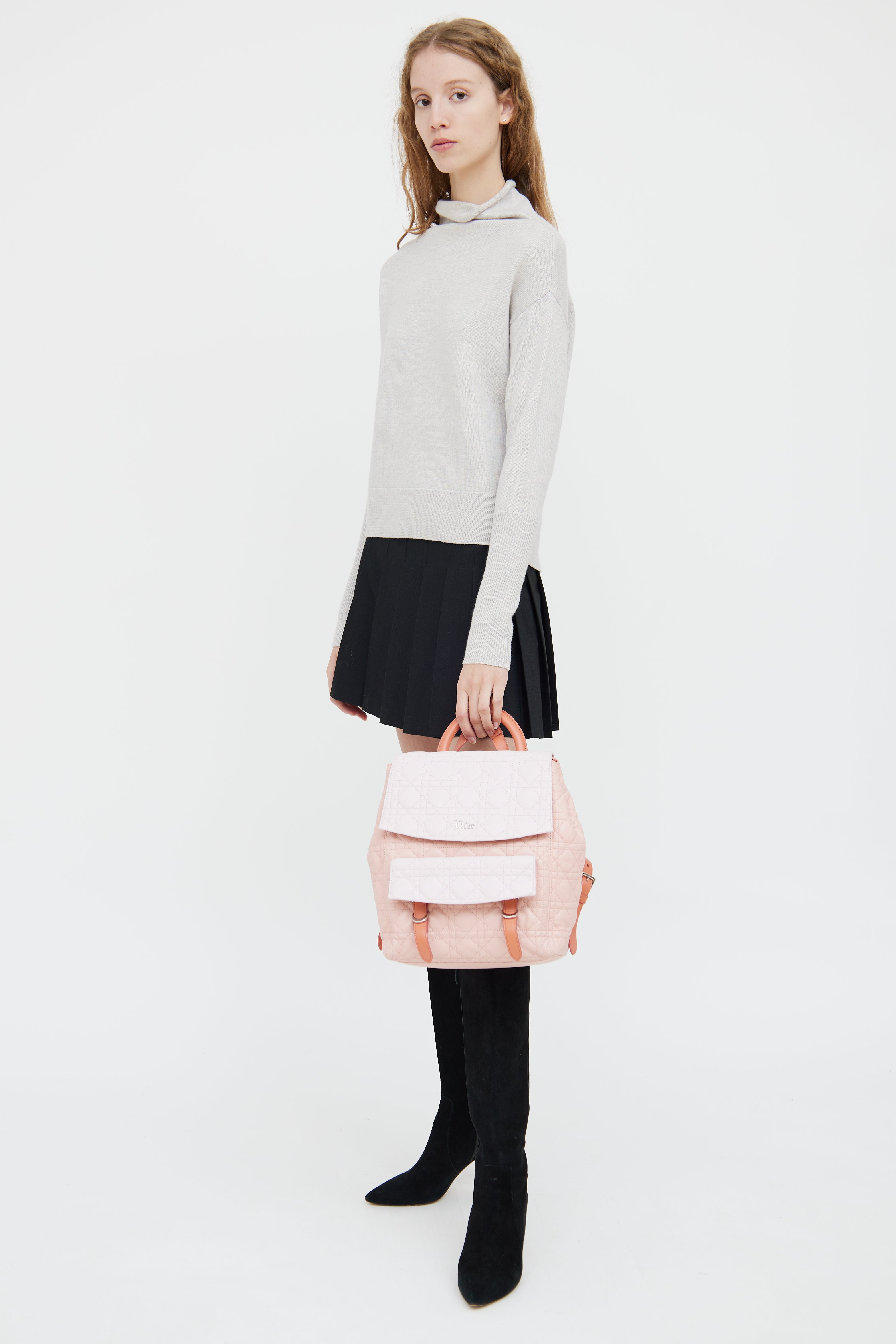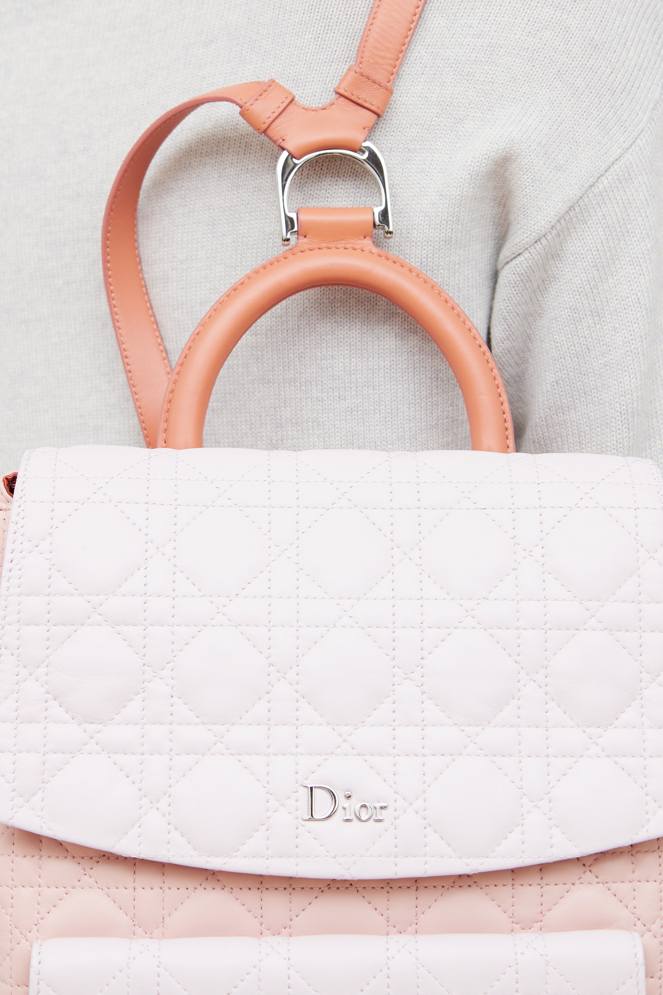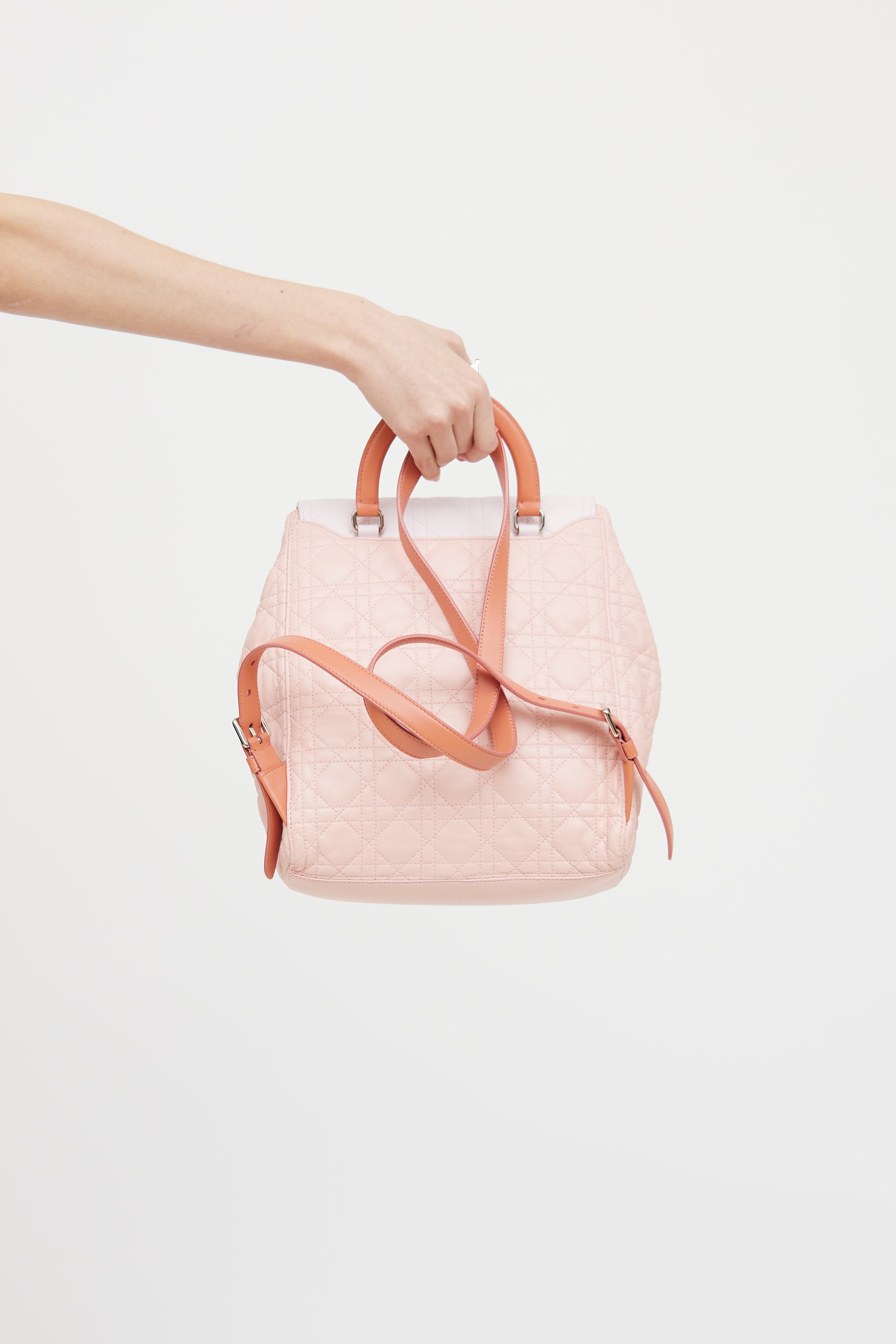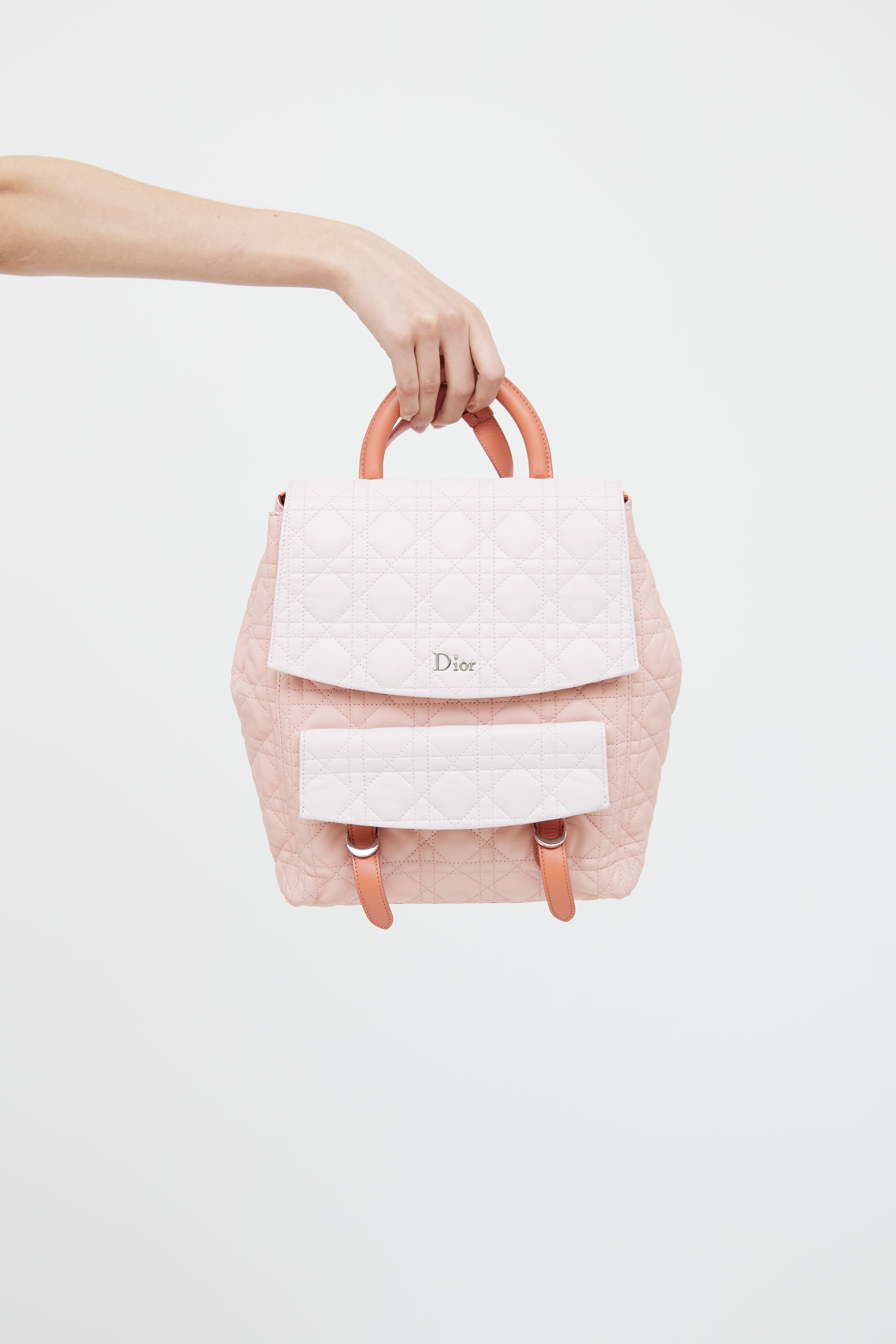 Pre-owned Dior pink Cannage quilt Stardust backpack featuring a rolled top handle with attached adjustable straps, top flap opening with magnetic closure, plaque logo at front, front flap pocket with belt closures, one main canvas lined compartment, interior leather line slip pocket, and silver tone hardware throughout.