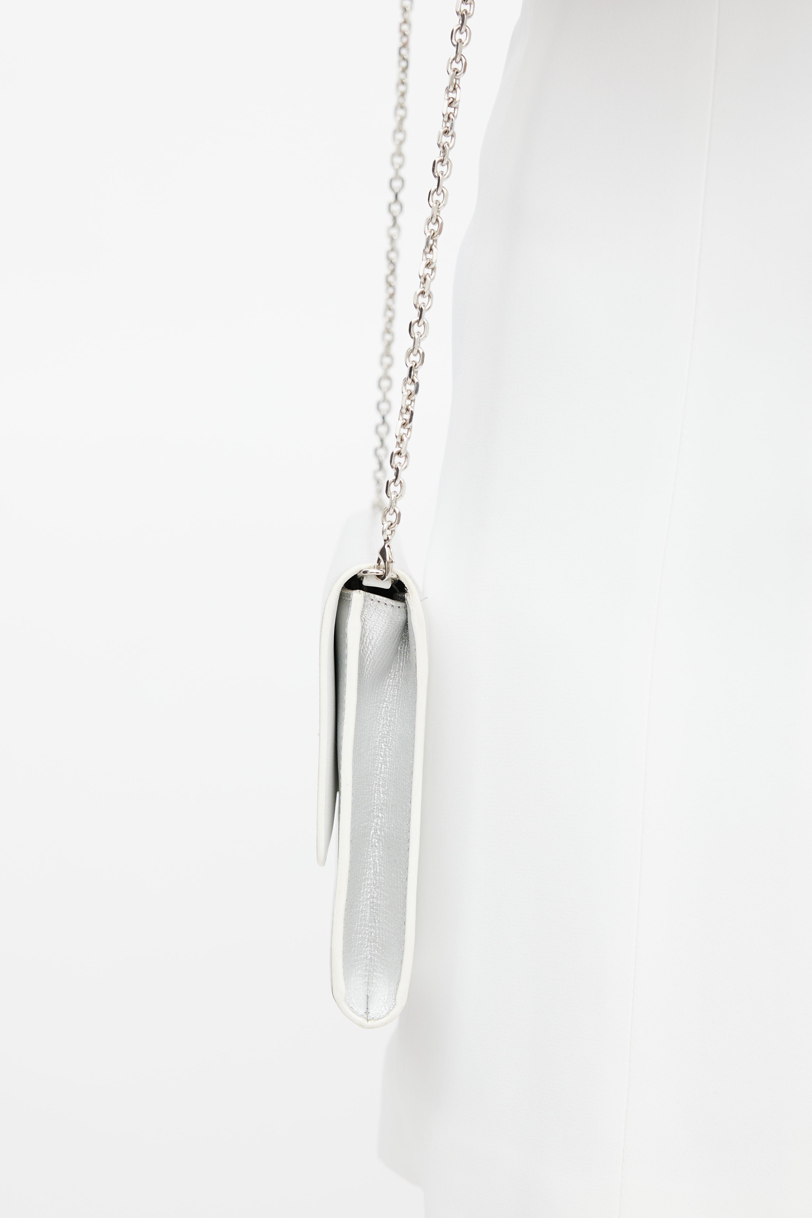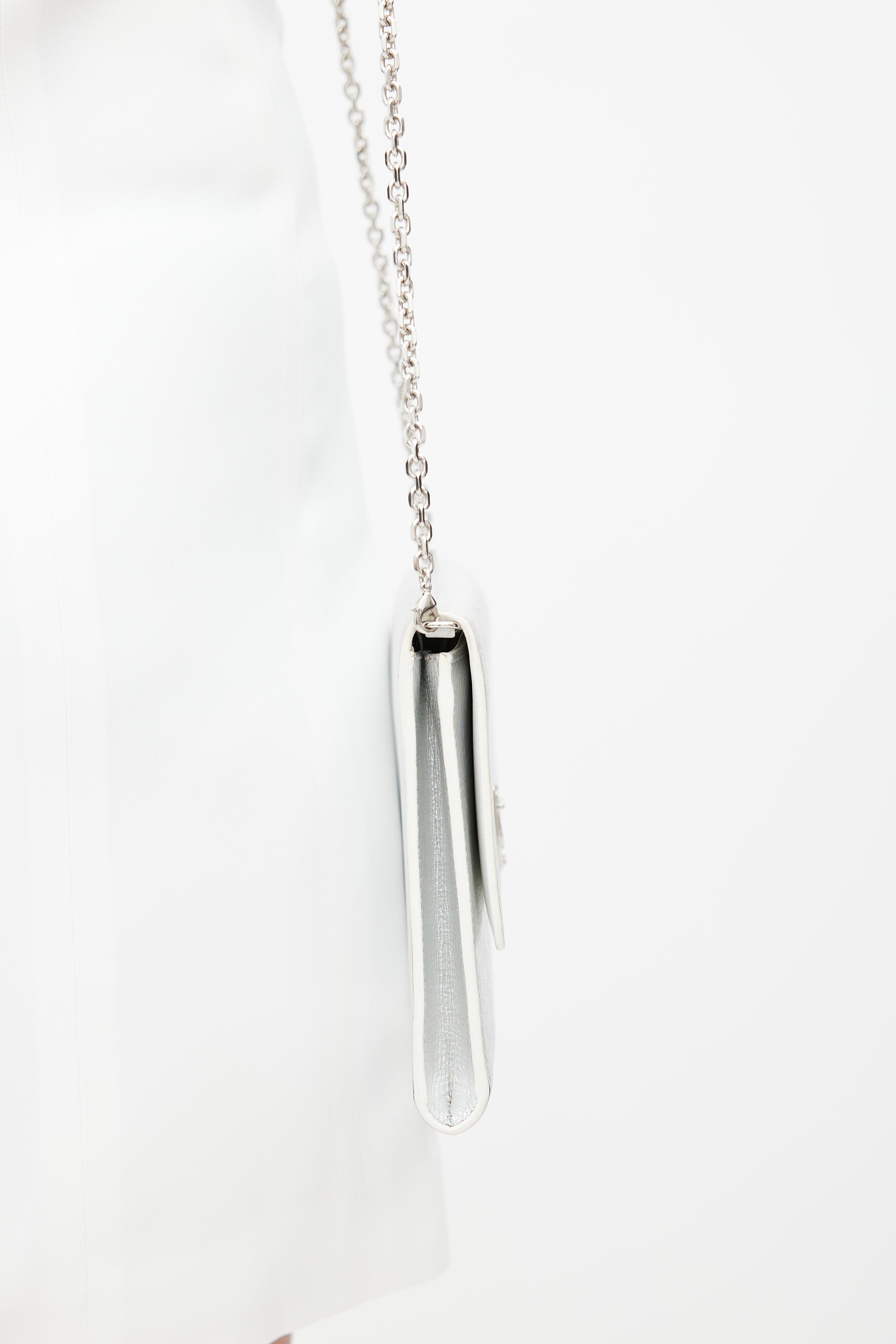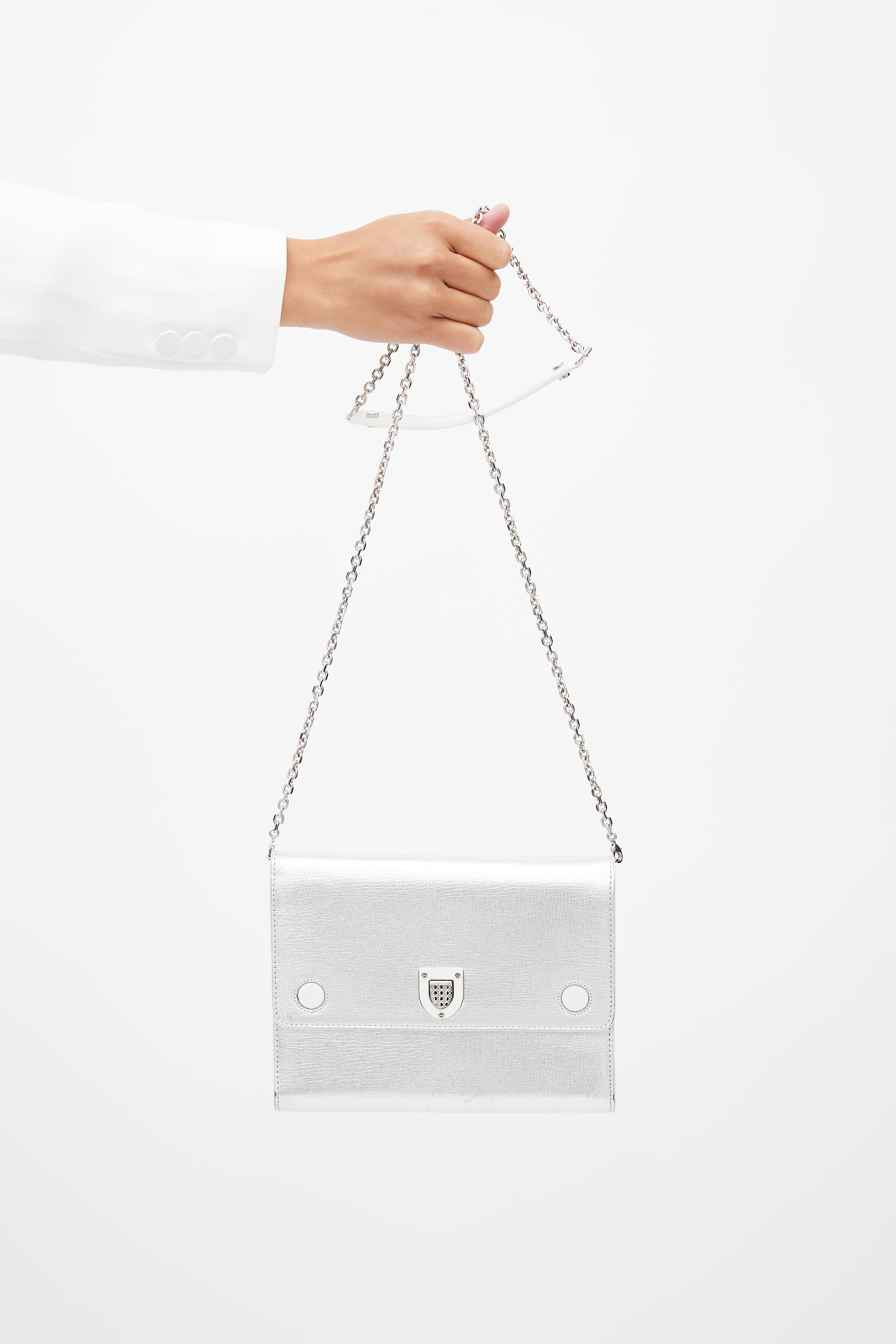 Pre-owned Dior silver and white Diorever shoulder bag featuring a top flap with magnetic closure, one main compartment with nine slip pockets and one zip pocket, and a silver tone chain strap with leather shoulder tab.