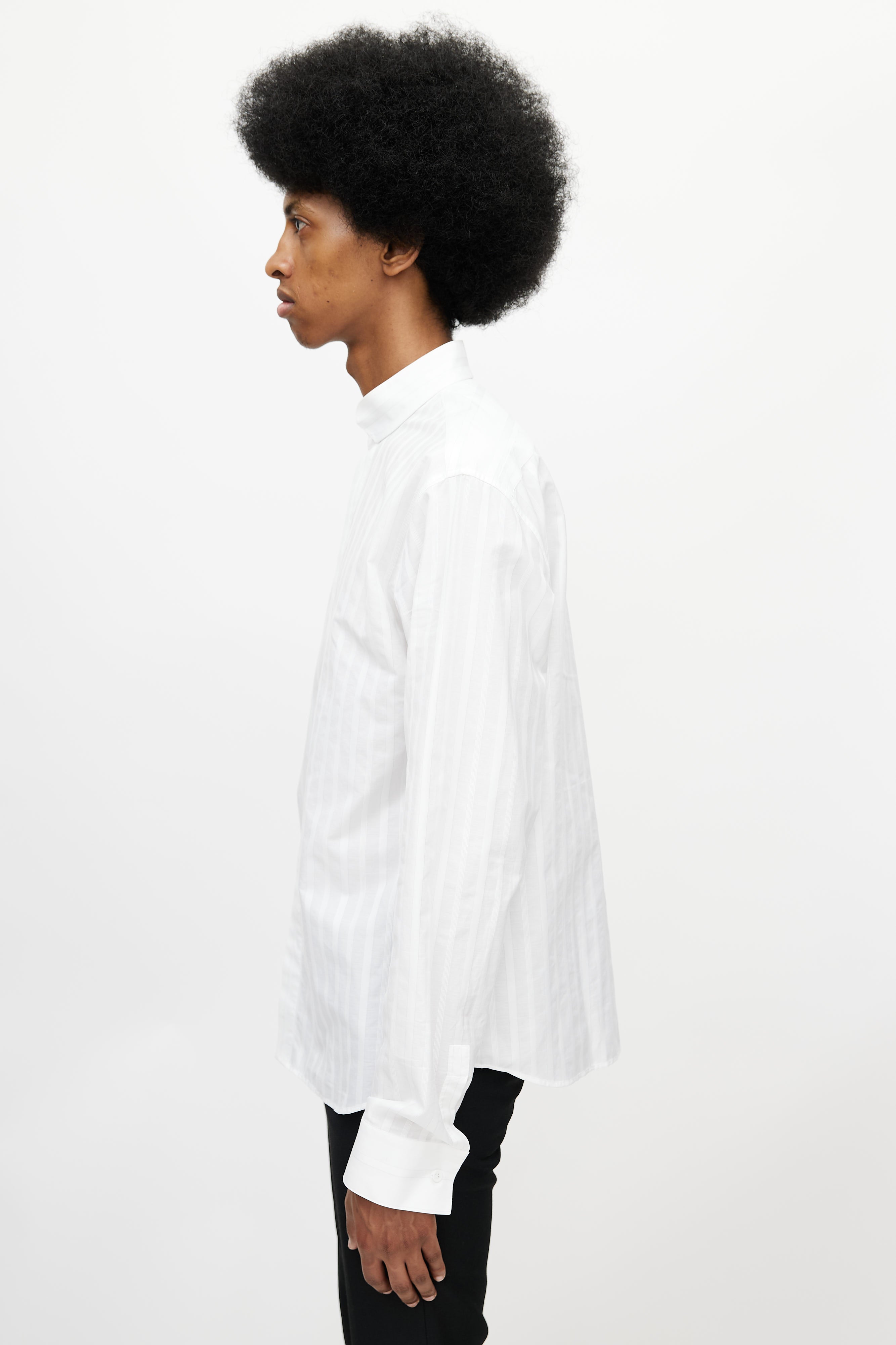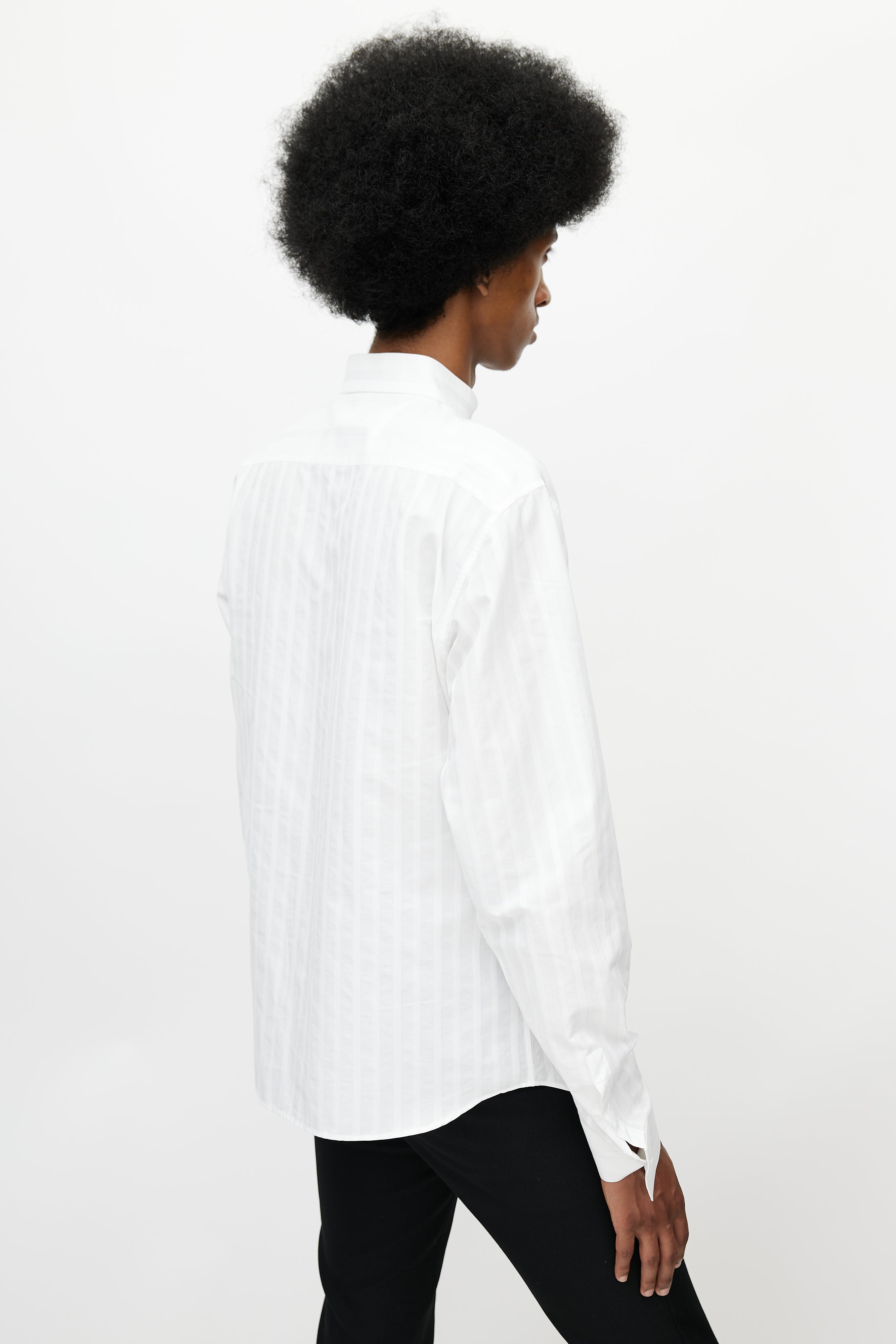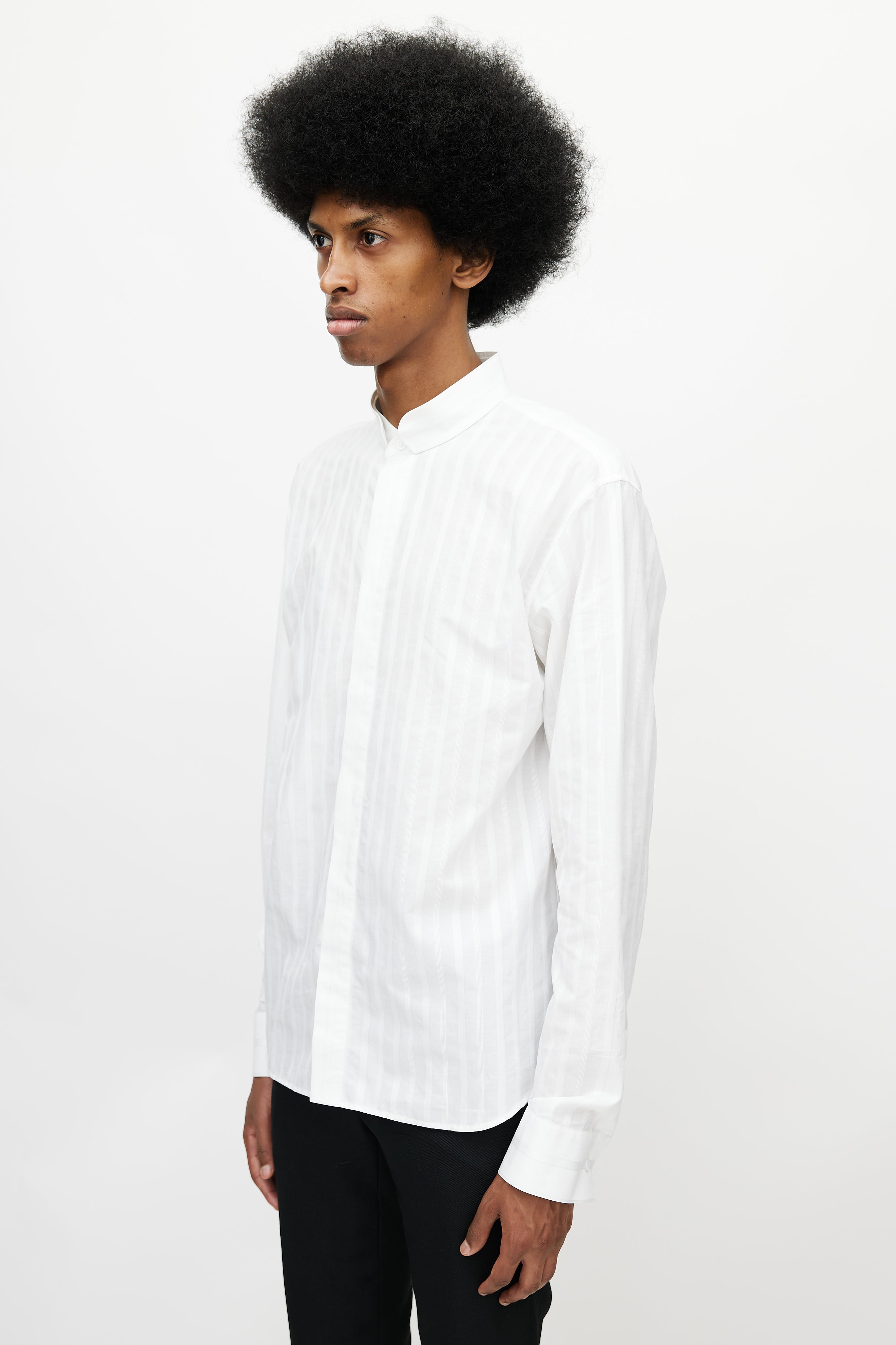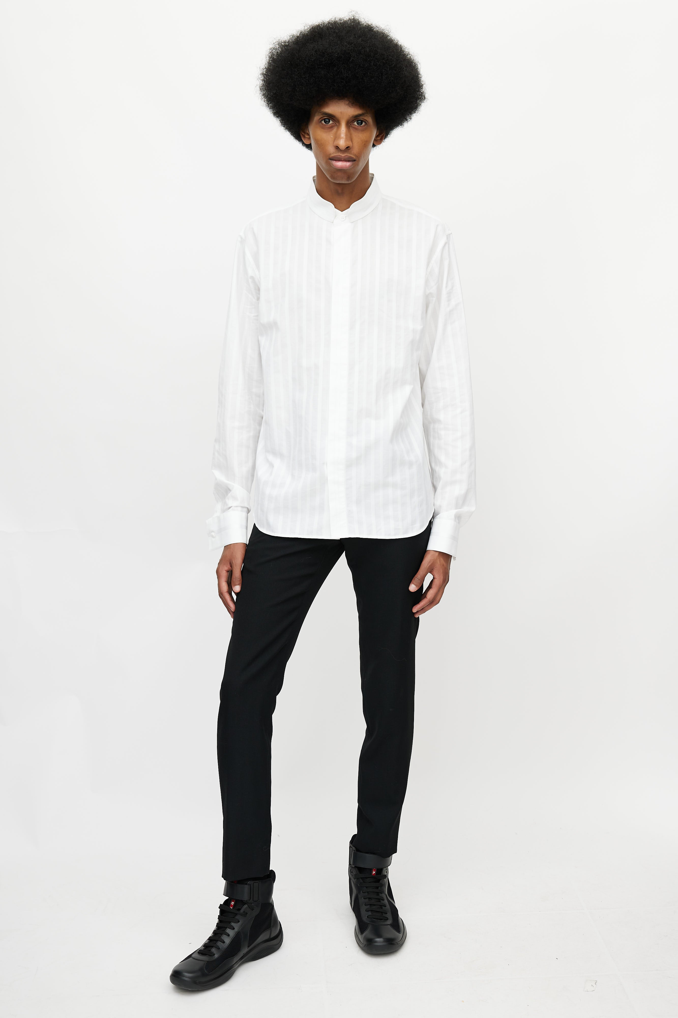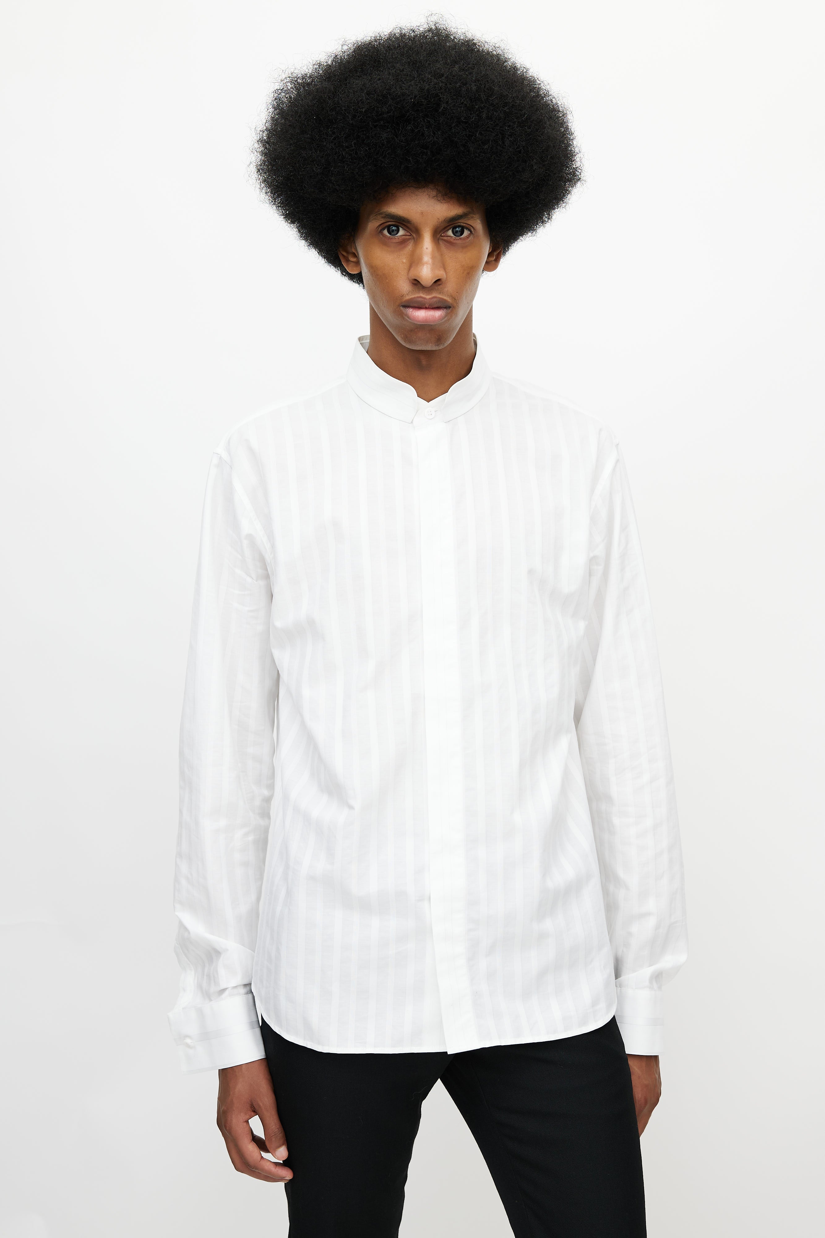 Pre-owned Dior white shirt featuring a tonal pinstripe print throughout, band collar, long sleeves with buttoned cuffs, and button up front.