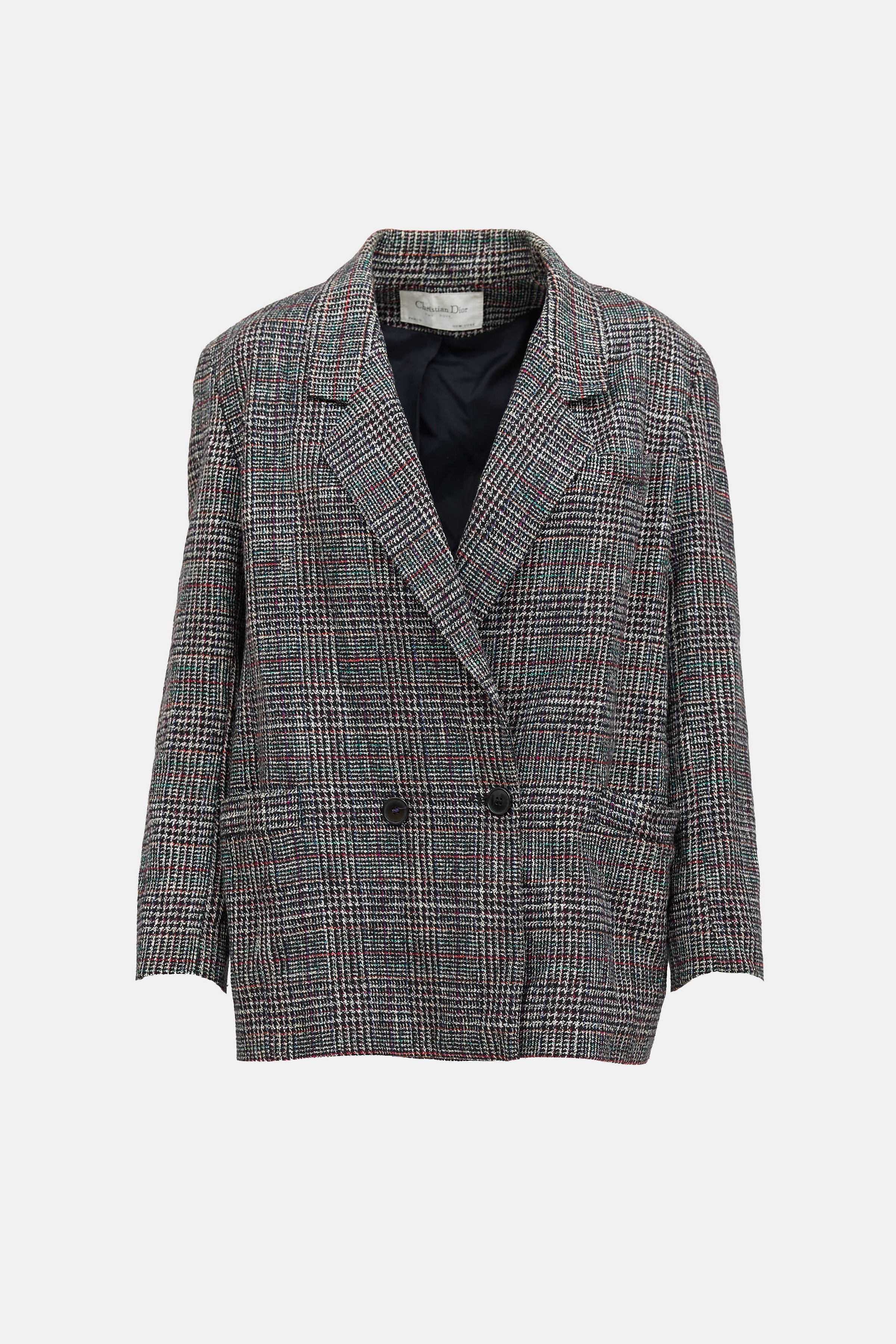 Pre-owned Christian Dior The Suit black wool blazer featuring a white plaid pattern throughout, notched lapel, padded shoulders, long sleeves with buttoned cuffs, one welt pocket at chest, two patch pockets at hip, and double breasted button closure. Lined.