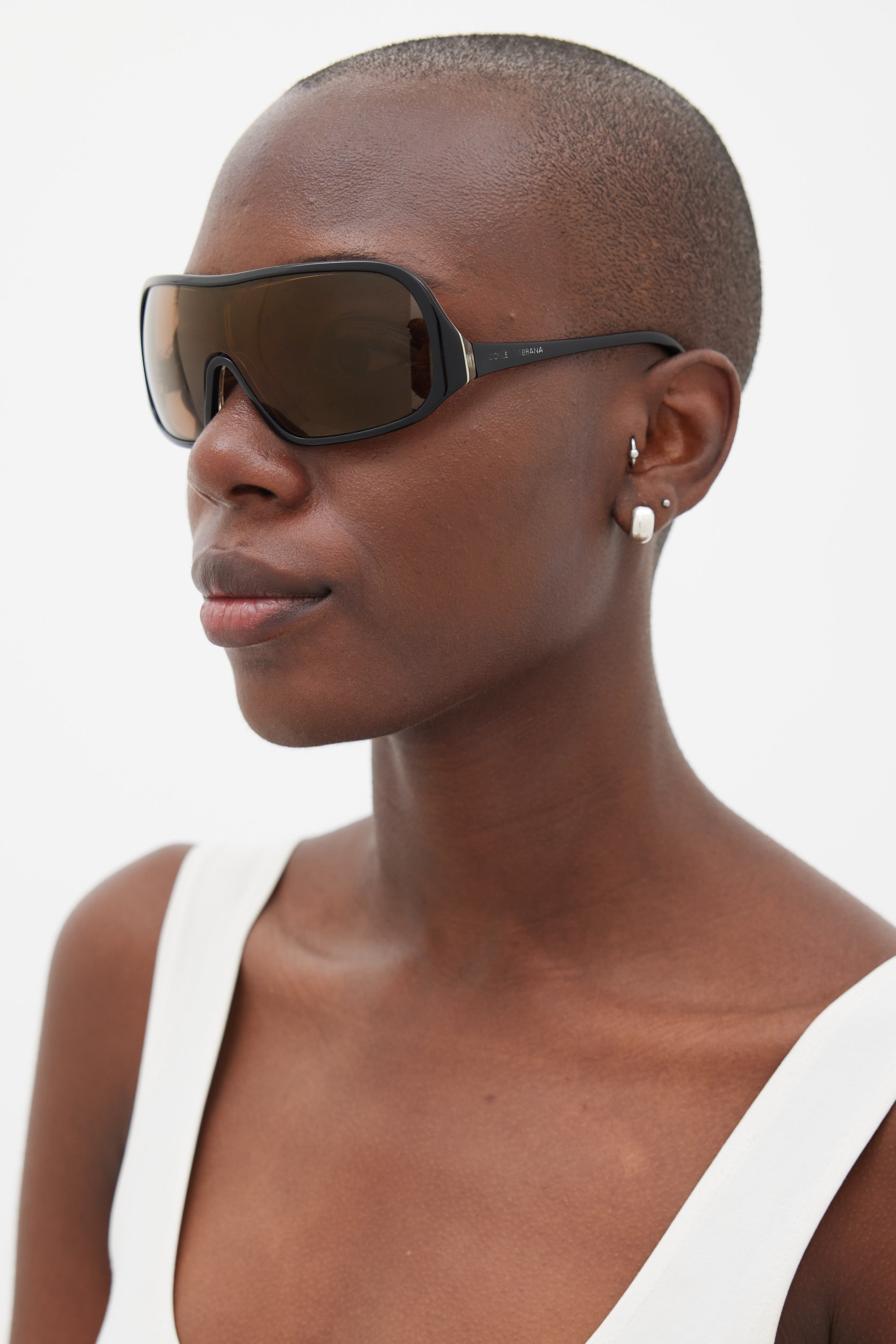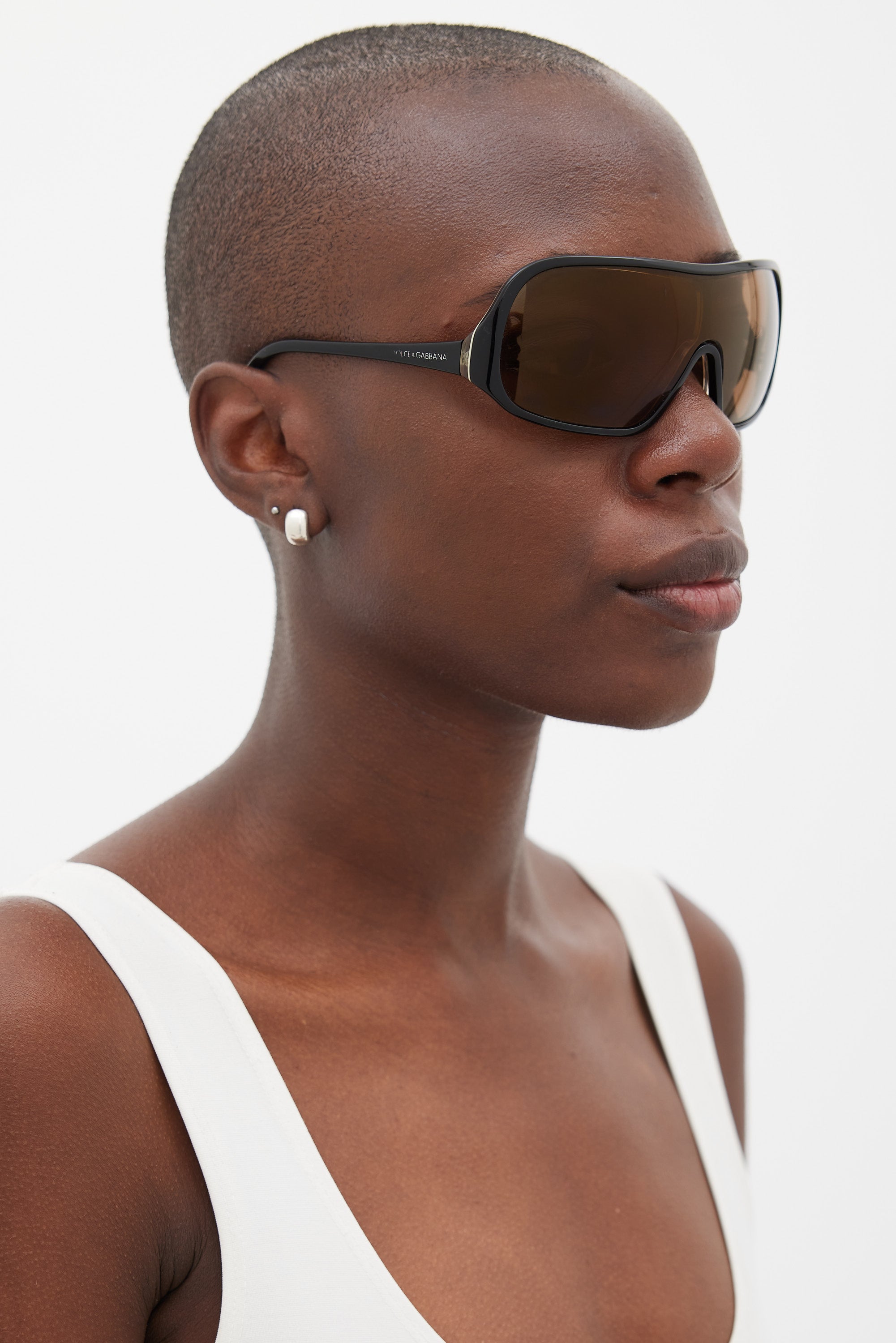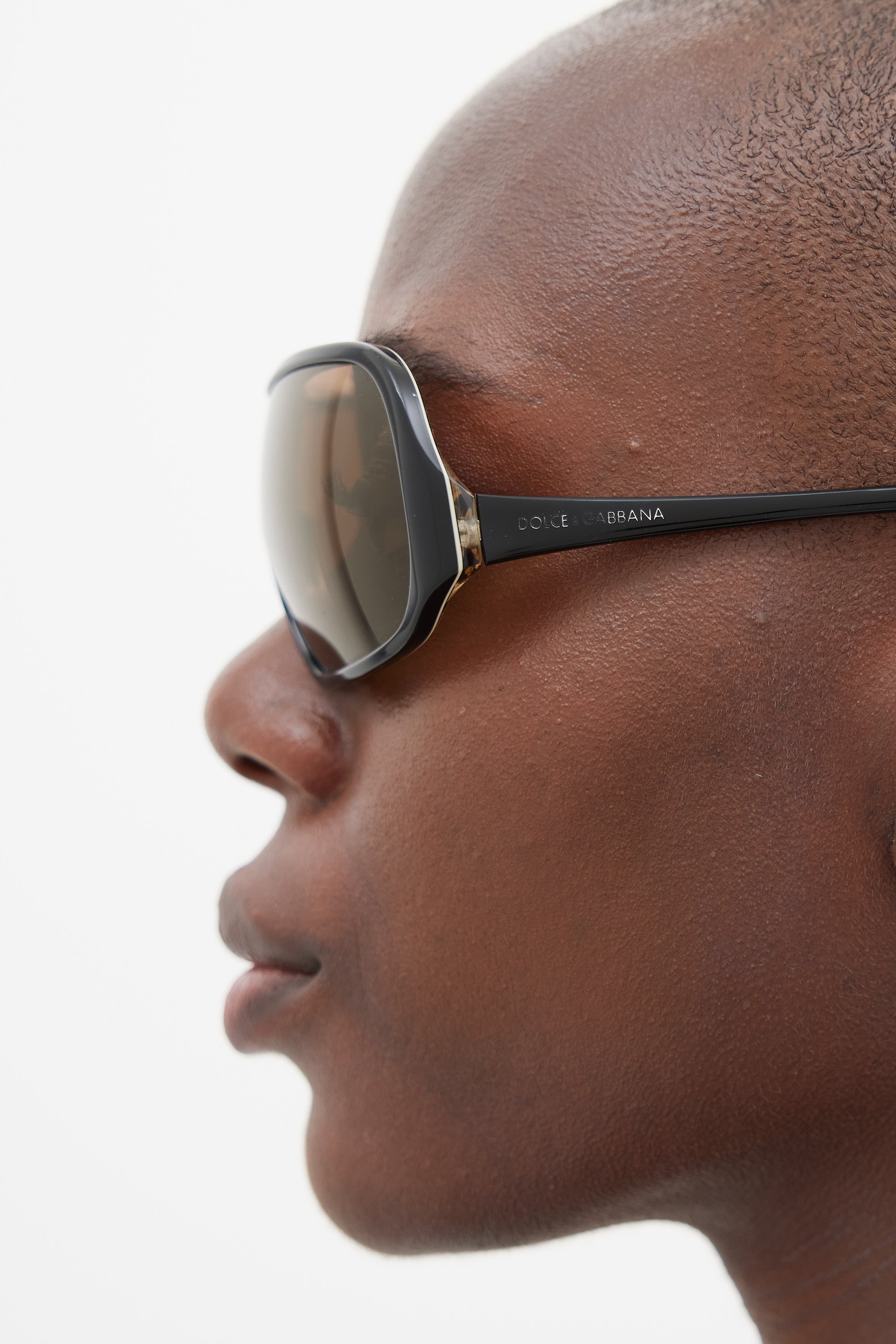 Pre-owned Dolce & Gabanna DG417S sunglasses featuring a black acetate rectangular frame, brown lens, and silver tone logo at temple.