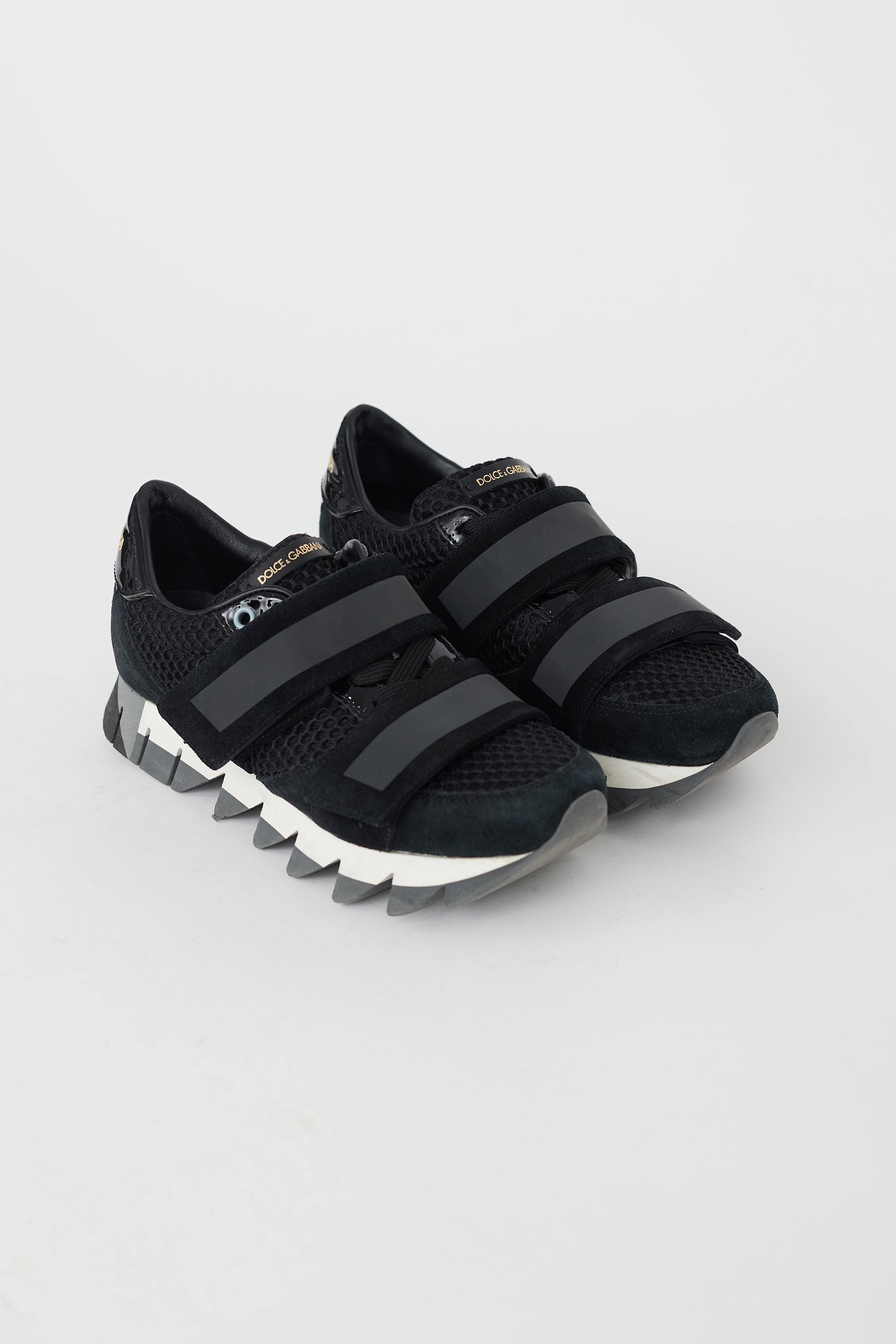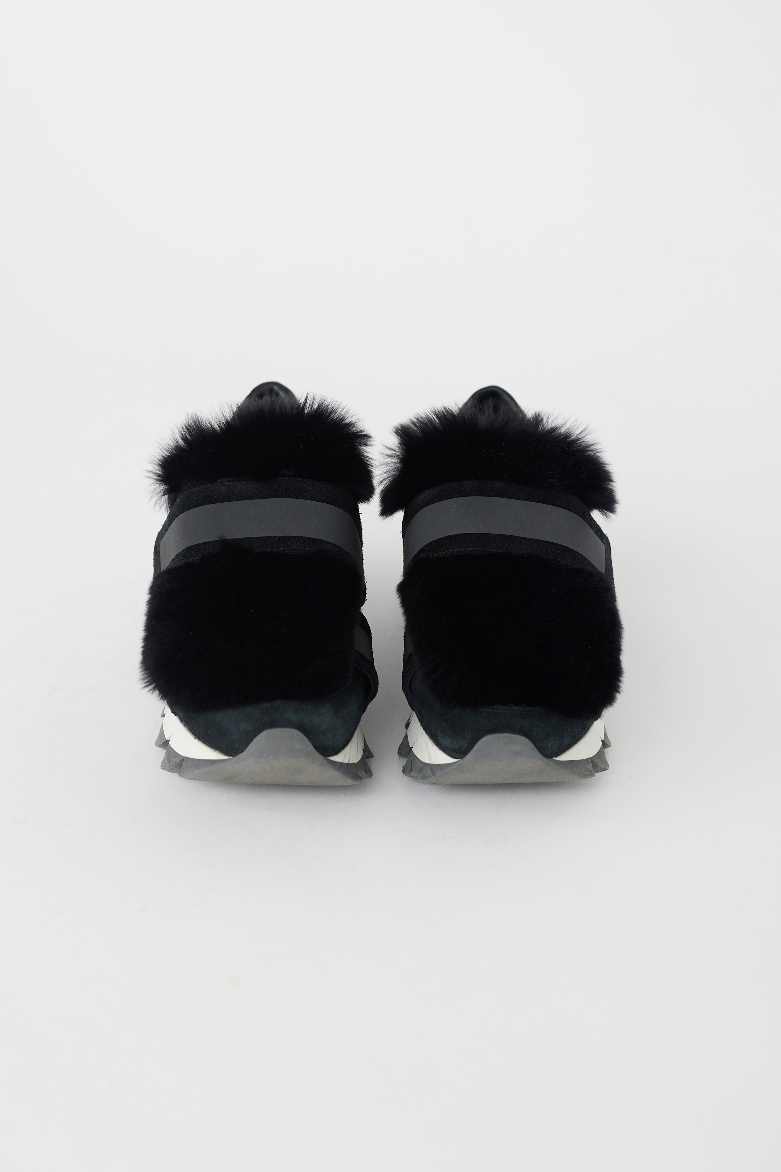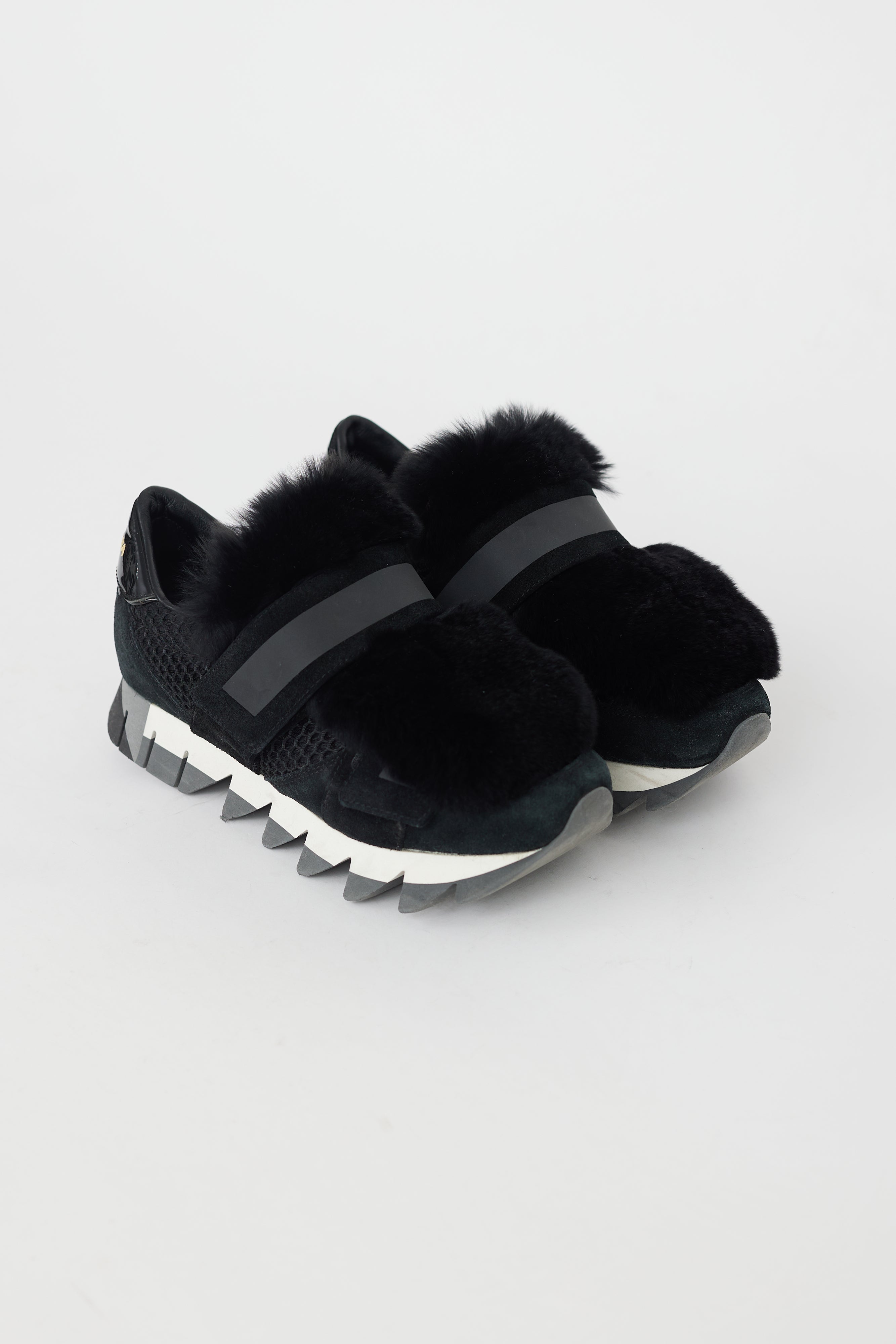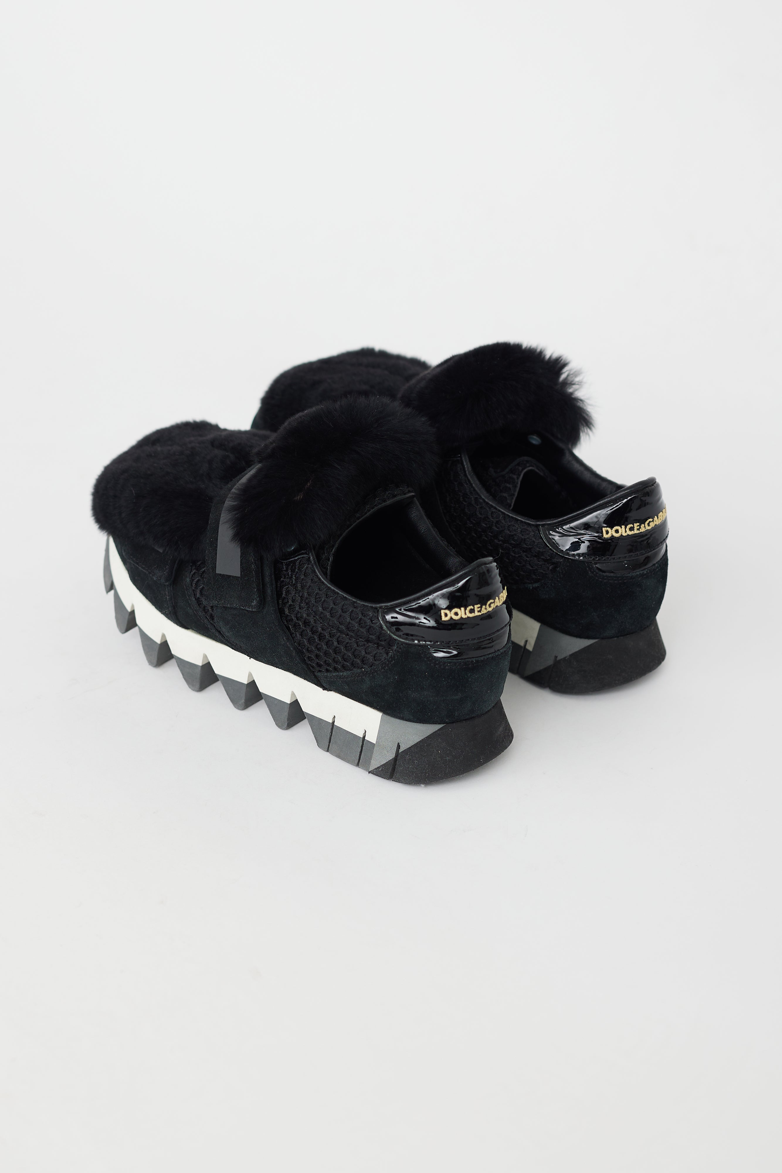 Pre-owned Dolce & Gabbana black sneakers featuring rounded toe, mesh upper, lace up front with velcro fastening, removable tonal fur at front, embroidered logo at heel, and rubber ridged platform sole.