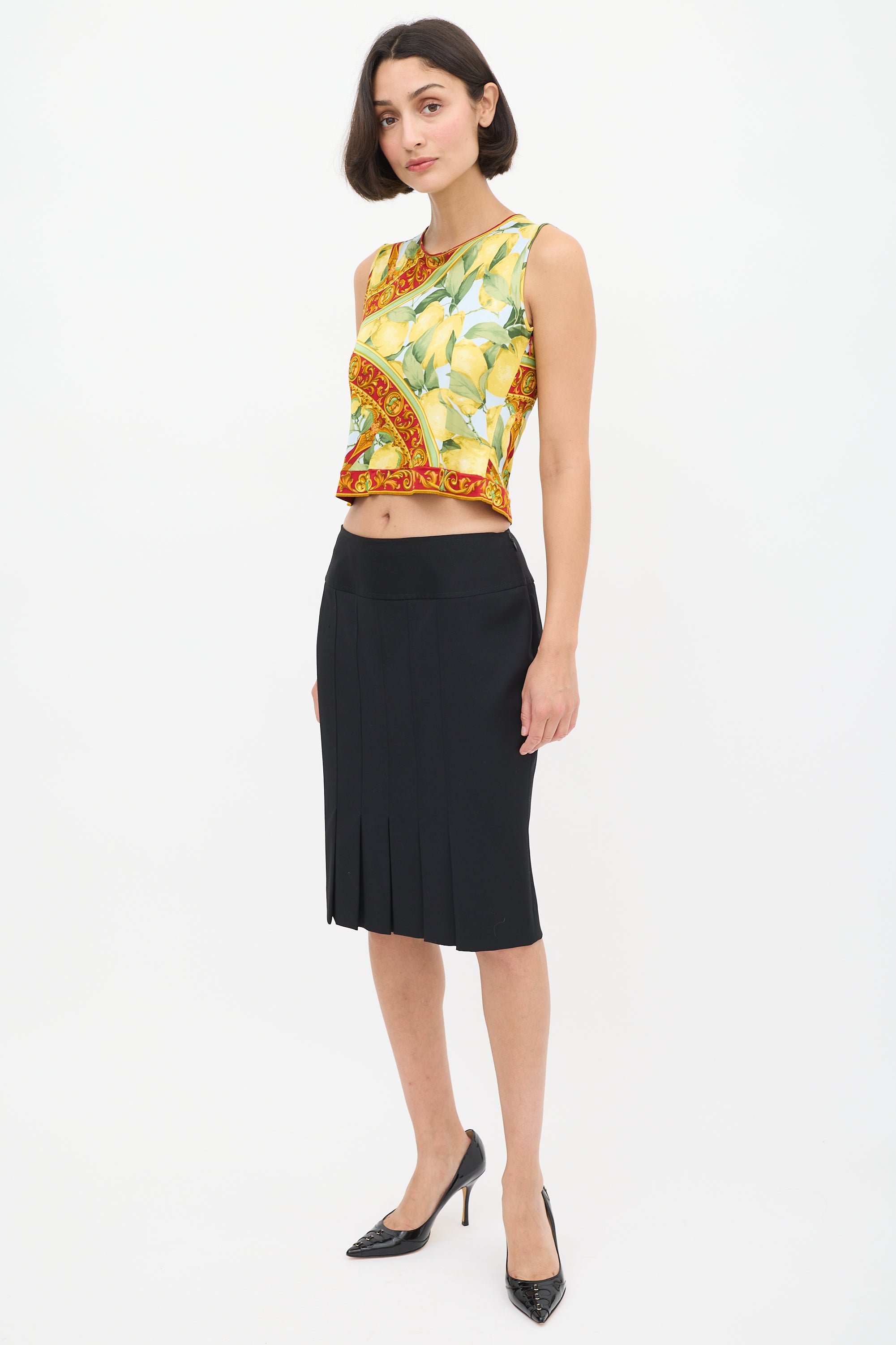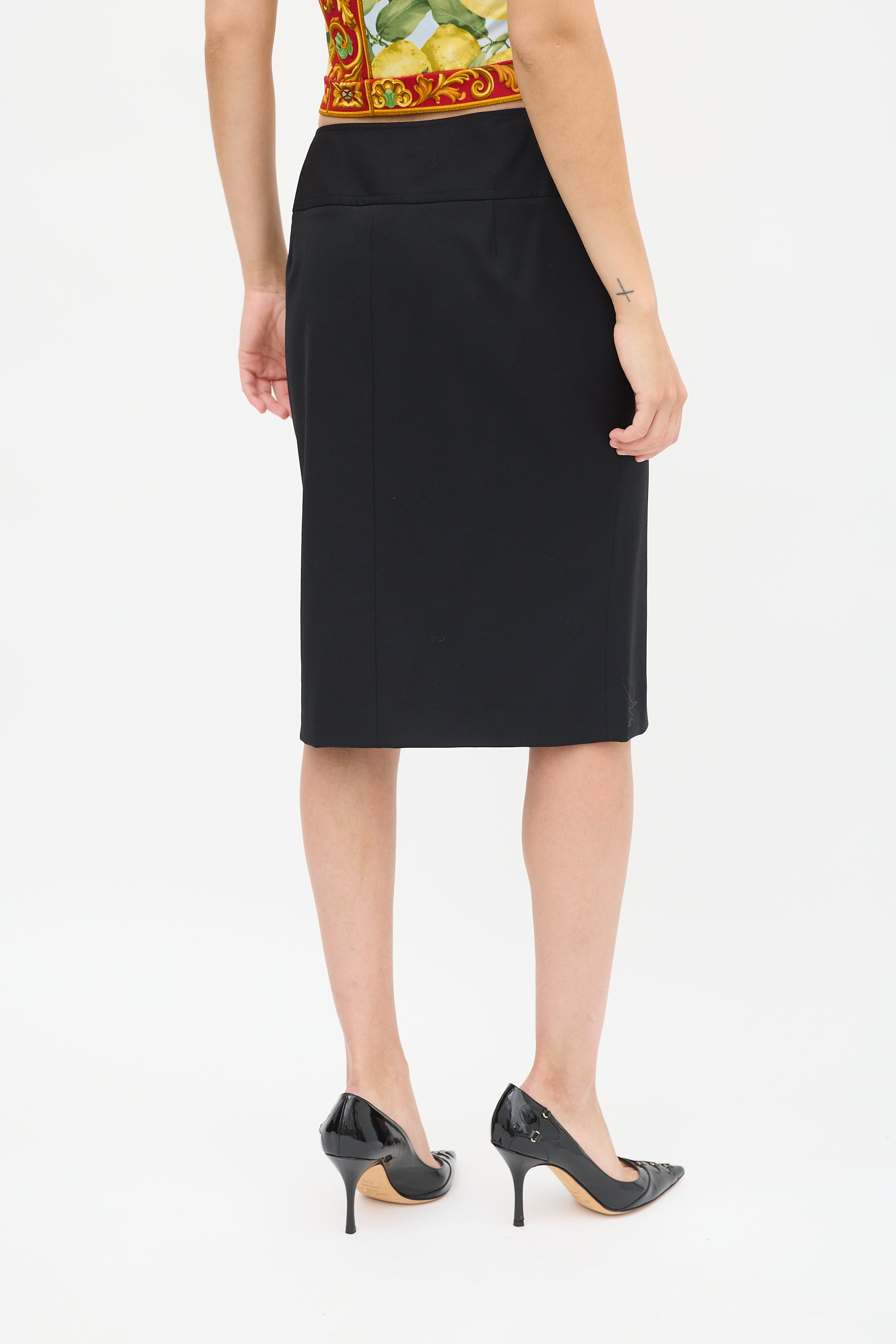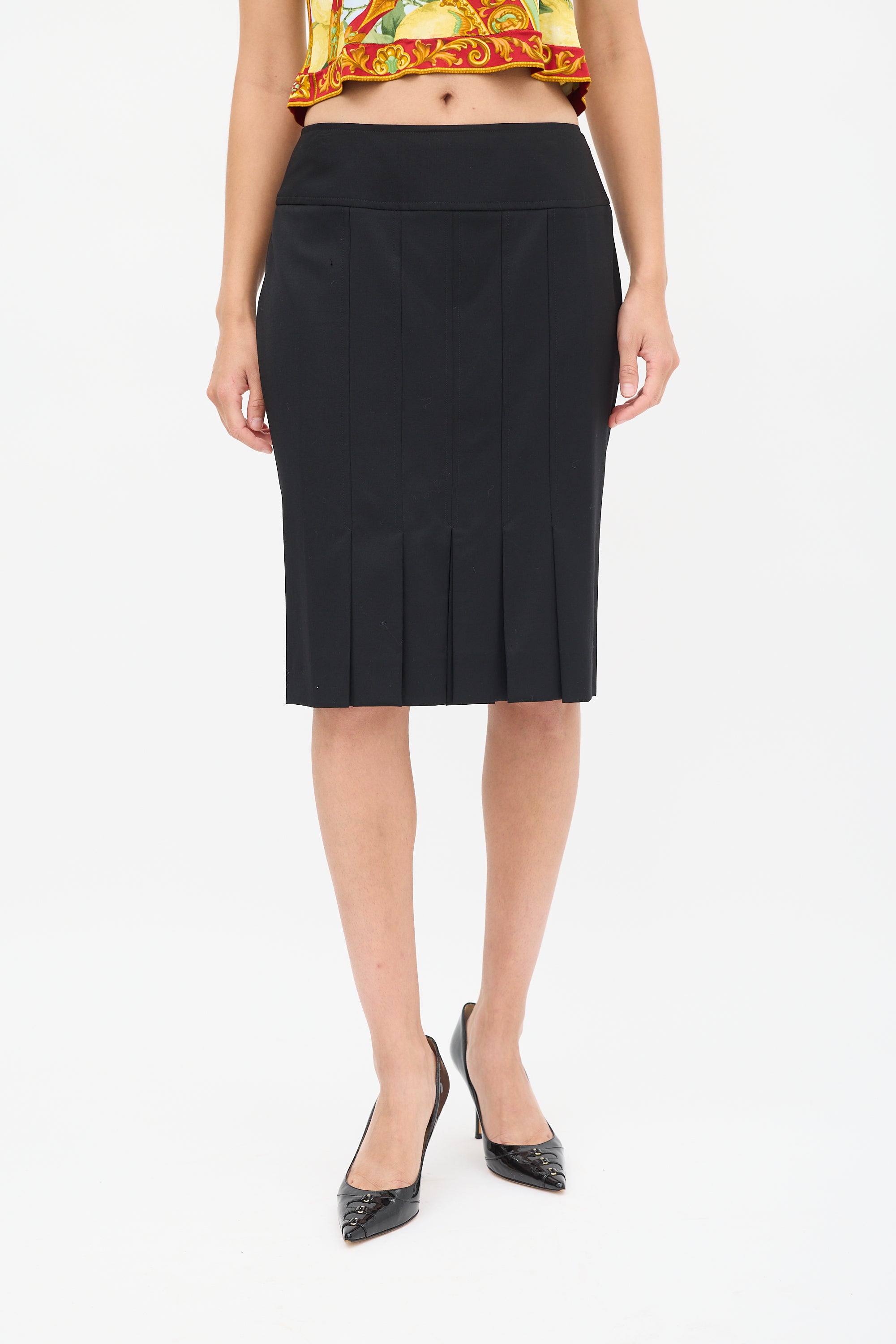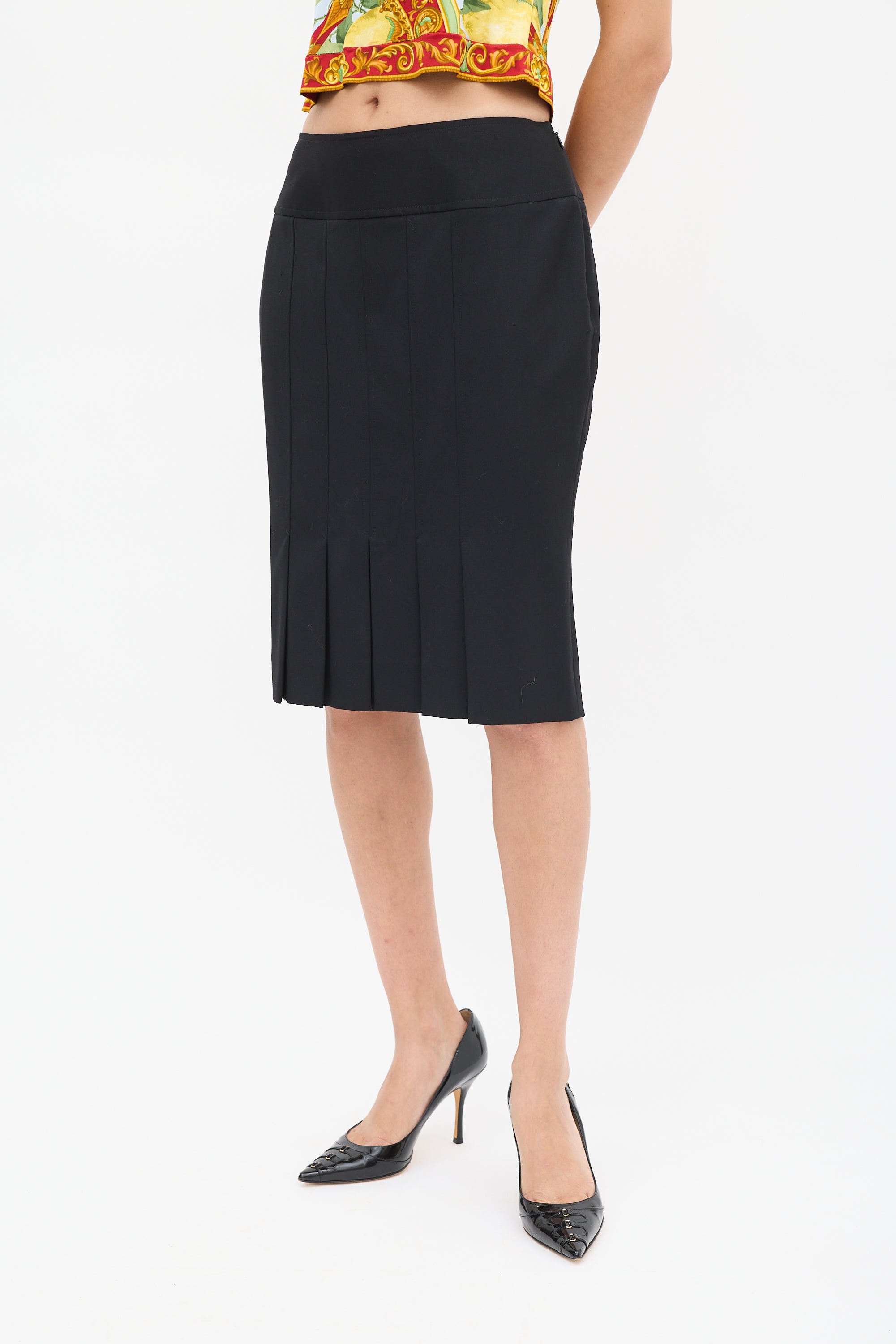 Pre-owned Dolce & Gabbana black wool midi skirt featuring wide waist band, kick pleating throughout front, and concealed side zip closure.