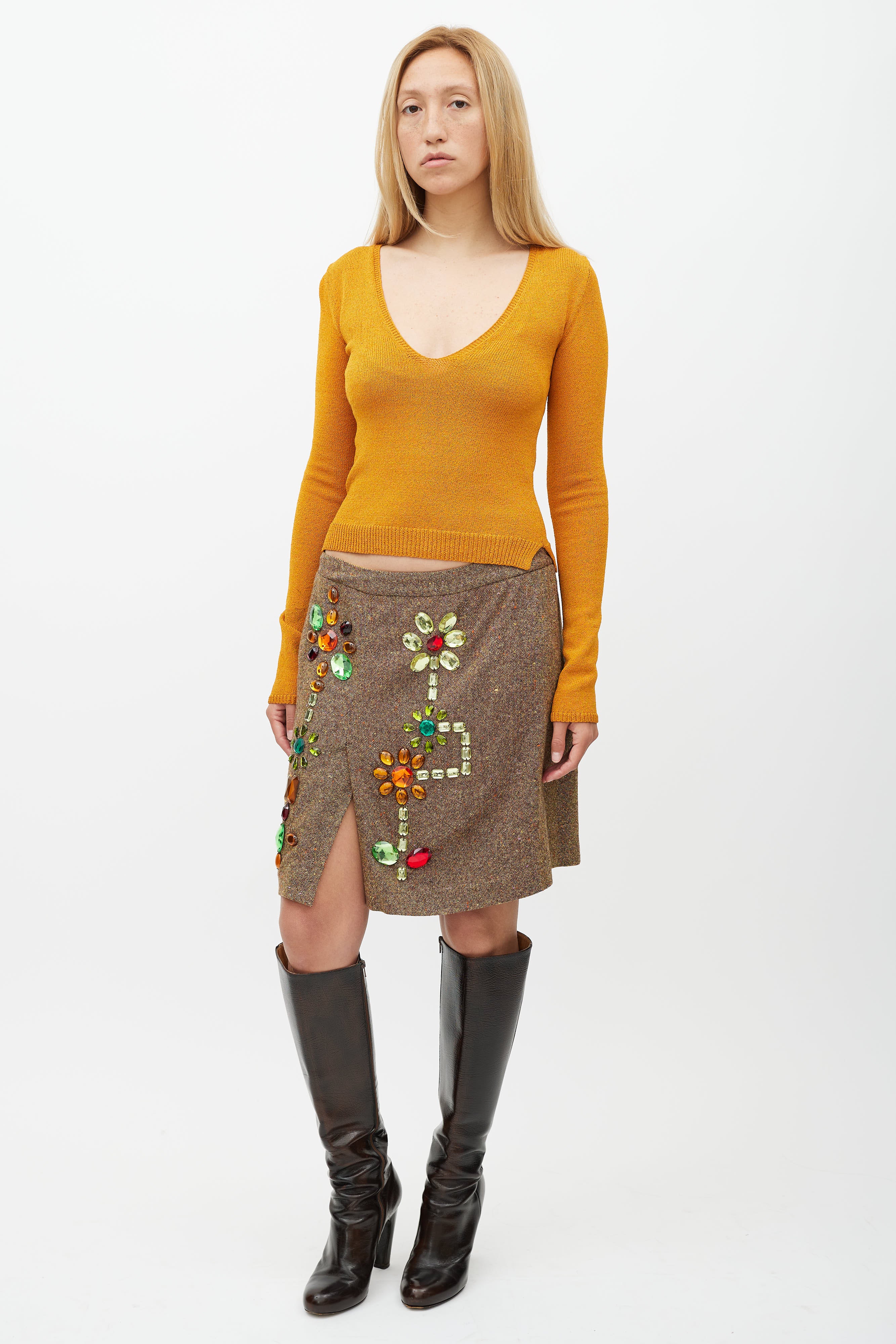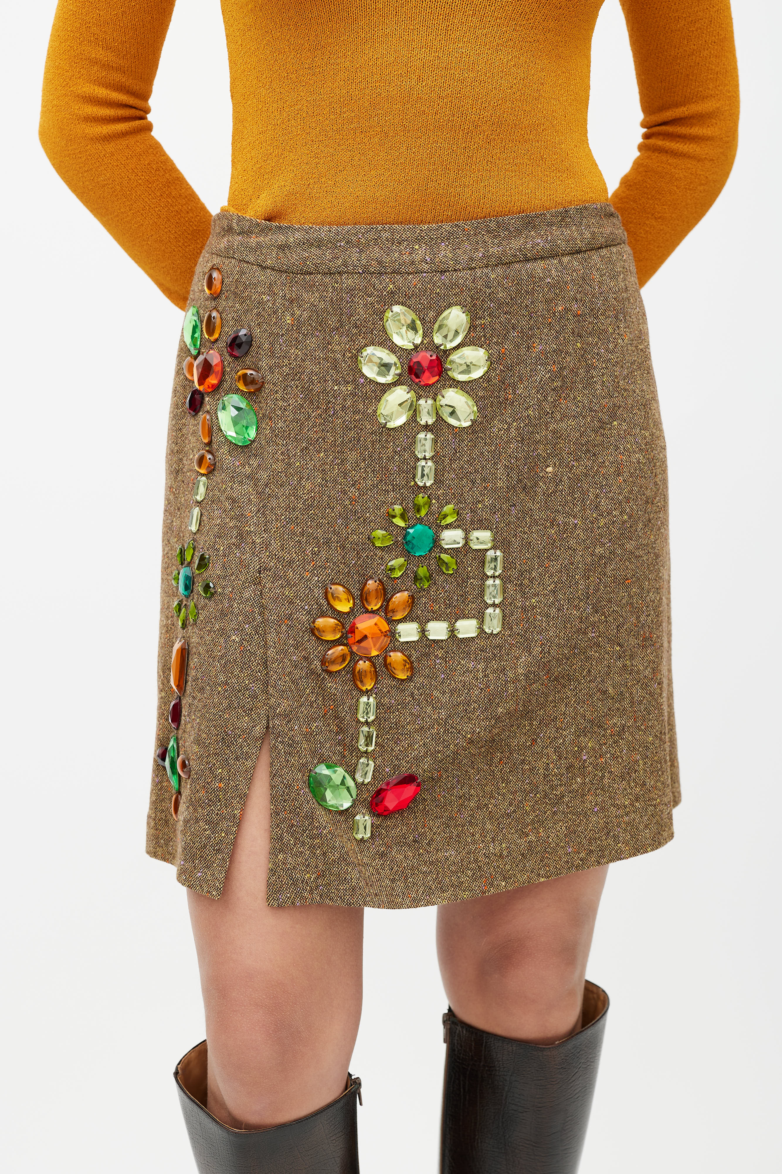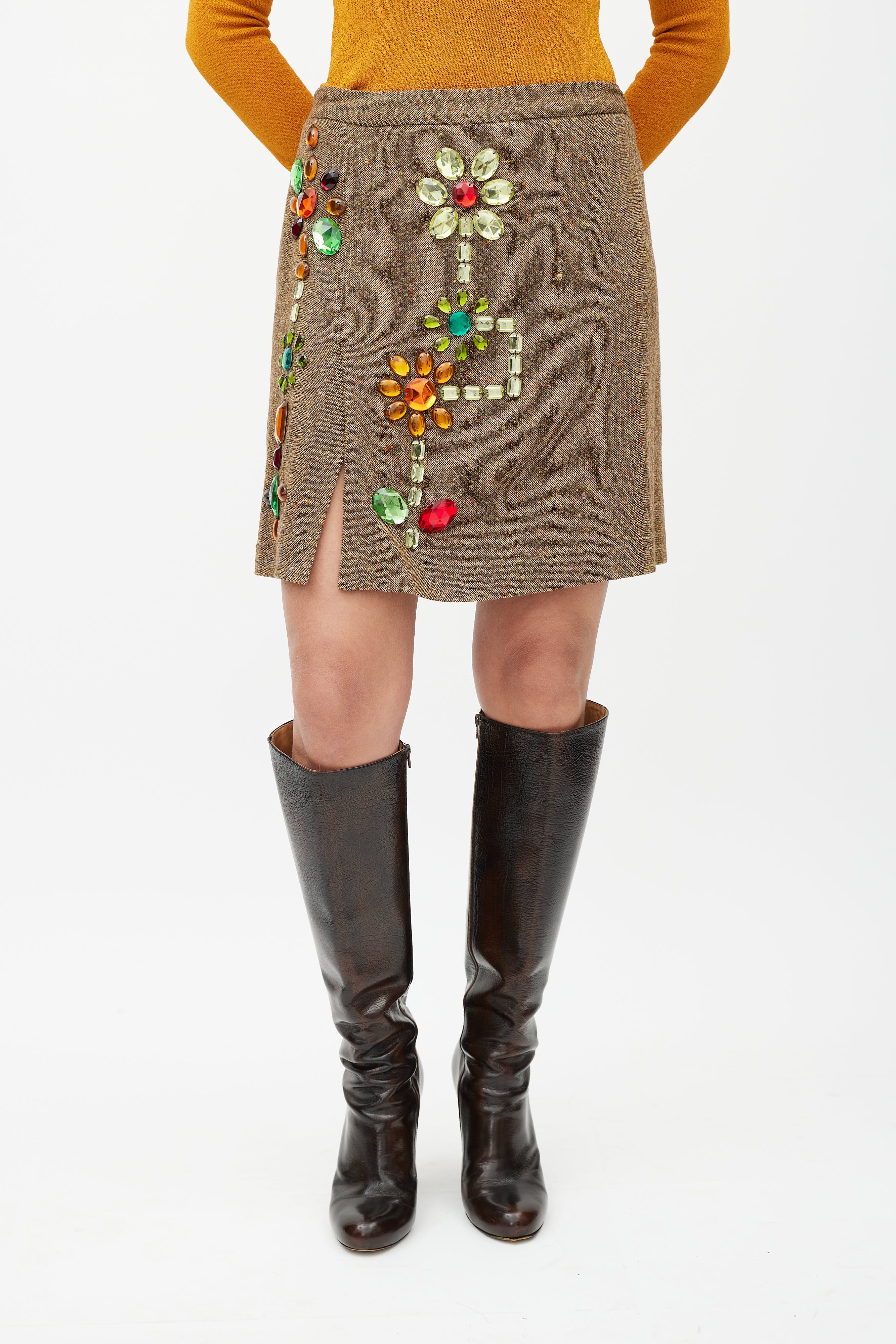 Pre-owned Dolce & Gabbana brown wool skirt featuring multicolour rhinestones floral motif, A-line cut, front slit, darting at back waist, and concealed side zip closure with top hook and eye fastener. Lined.