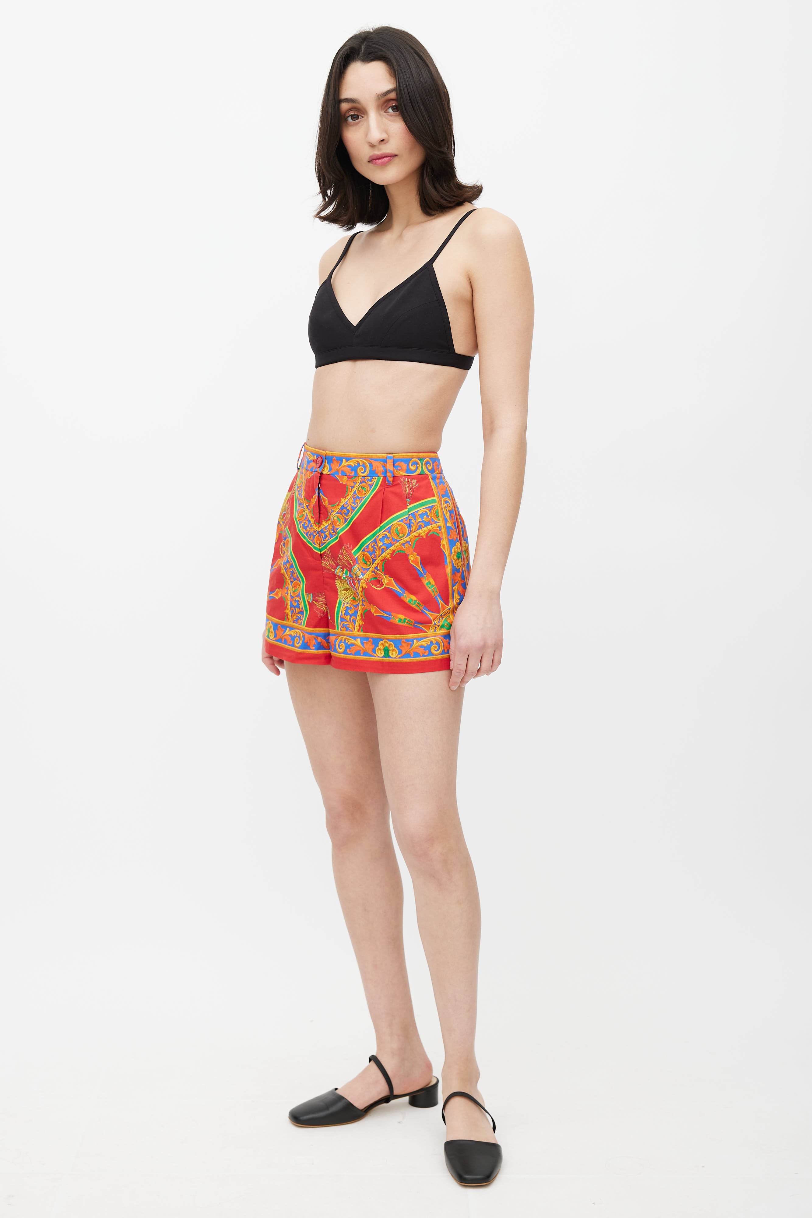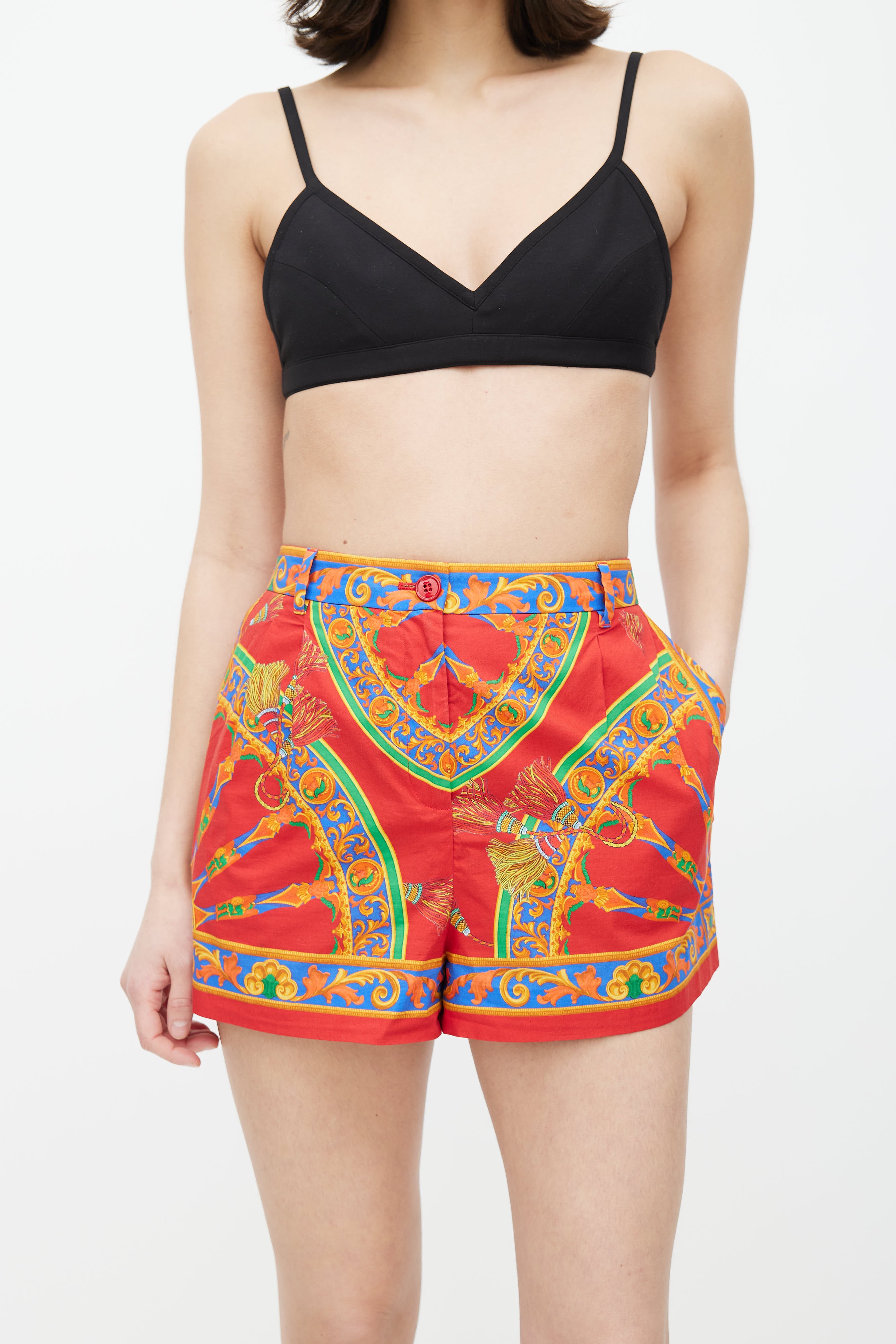 Pre-owned Dolce & Gabbana red shorts featuring a multicolour Caretto pattern throughout, two slip pockets at hip, wide leg, pleated front, and zip fly with button closure. Clipped to fit model.