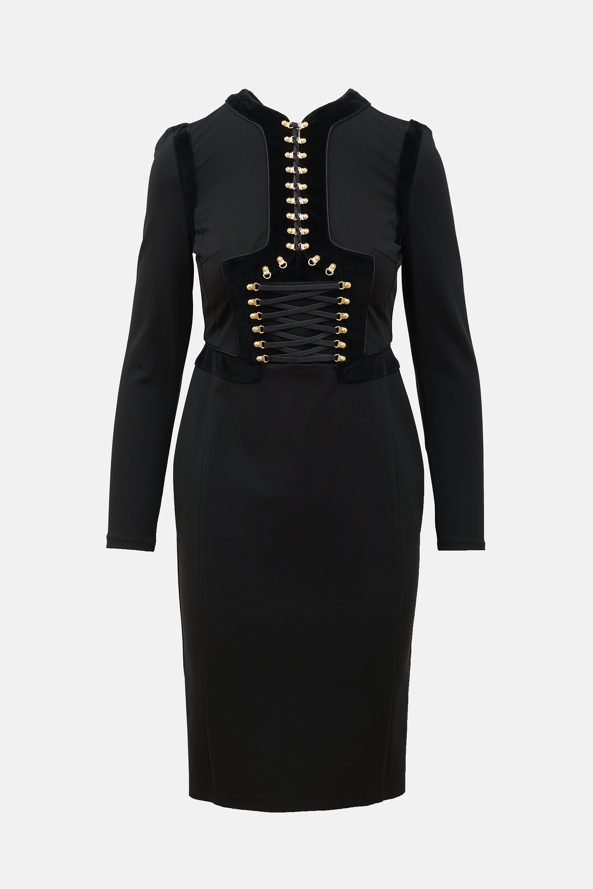Pre-owned Altuzarra black mini dress featuring a lace up detail front with gold tone hardware, cutout front, concealed back zip, tonal velour trim, and long sleeves.