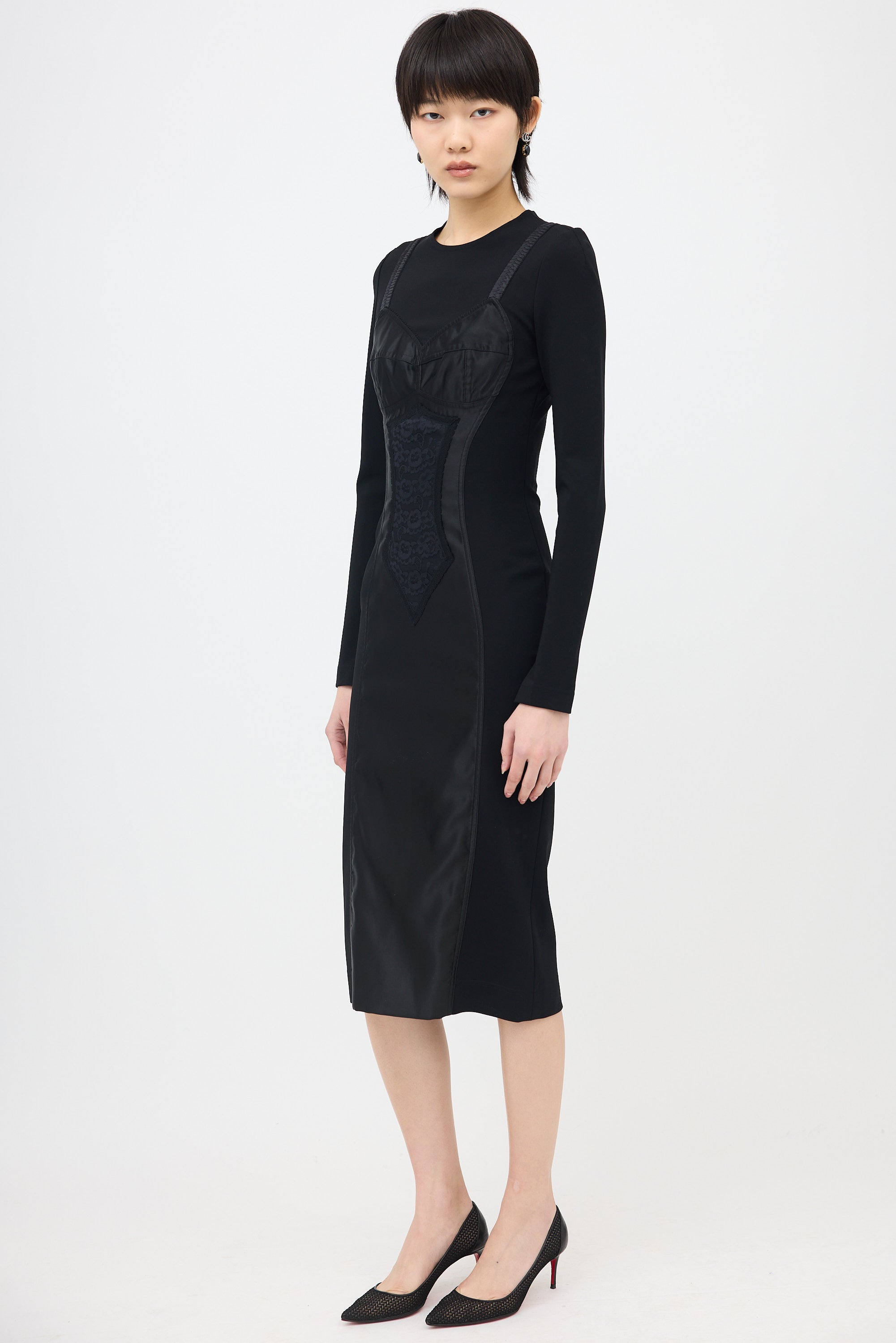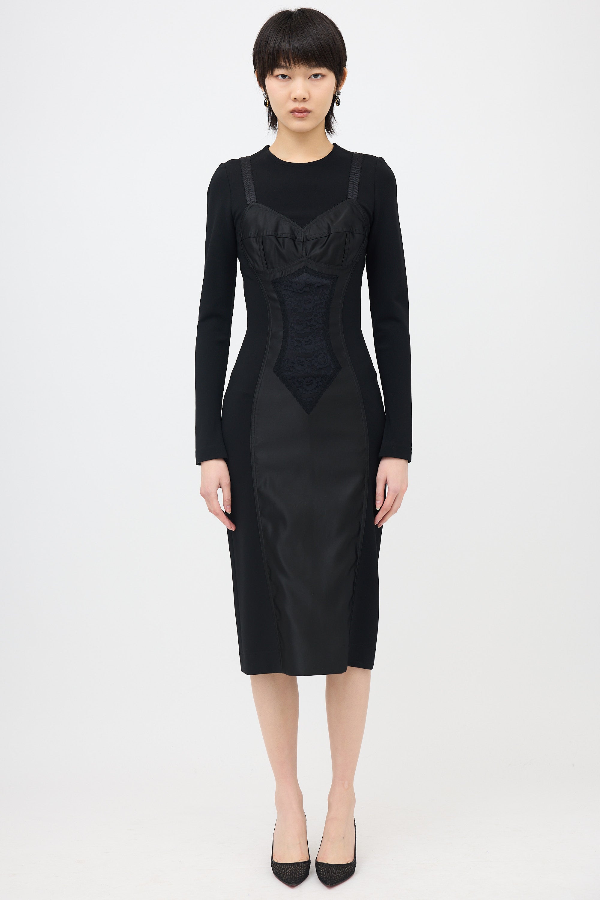 Pre-owned Dolce & Gabbana black midi dress featuring a tonal satin and lace dress panelled front, knit body, round neckline, concealed back zip, and long sleeve styling.