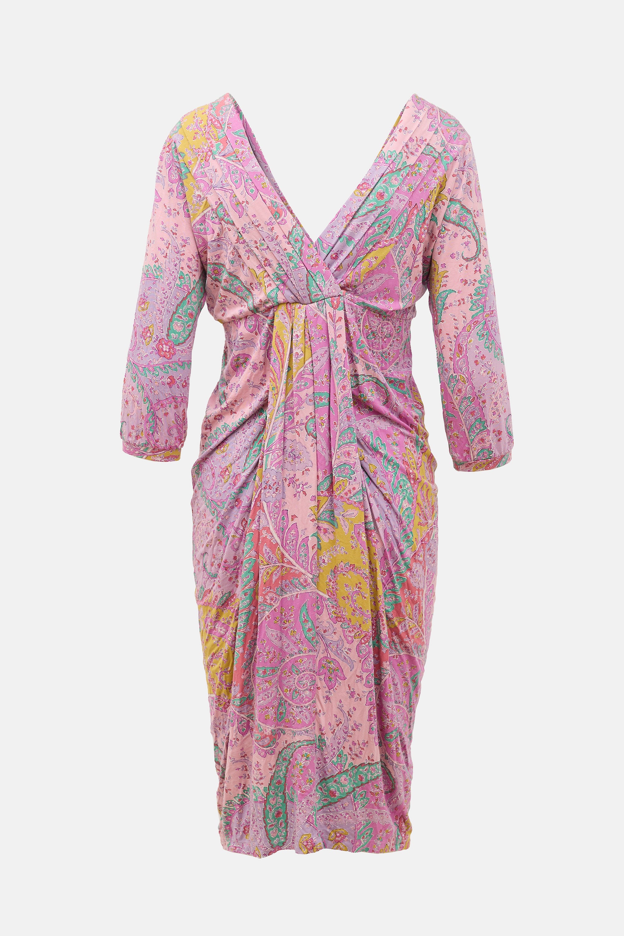 Pre-owned Etro knit midi dress featuring a multicolour paisley print, draped design, V-neckline, and three quarter length sleeves.