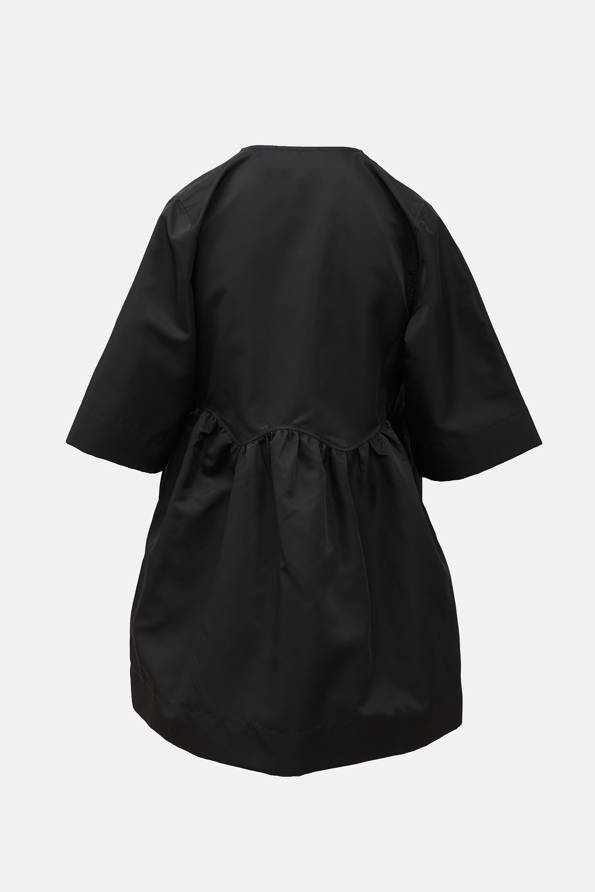 Pre-owned Ganni black recycled nylon Sport mini dress featuring surplice neckline, tie front, welt pocket and printed logo at left chest, in seam pockets, and gathered waist.