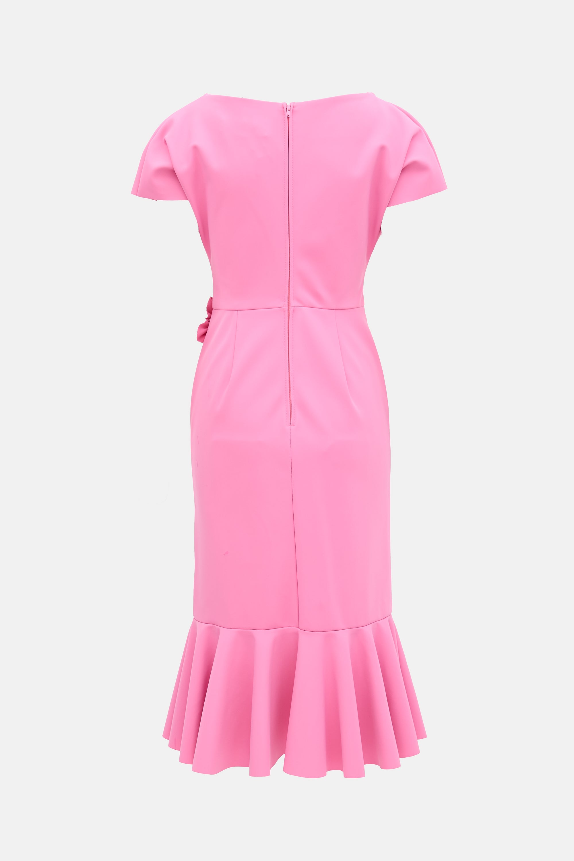 Pre-owned Greta Constantine pink Haitina midi dress featuring a cowl neckline, cap sleeves, concealed back zip, ruched flower appliques at front, and flounce hem.