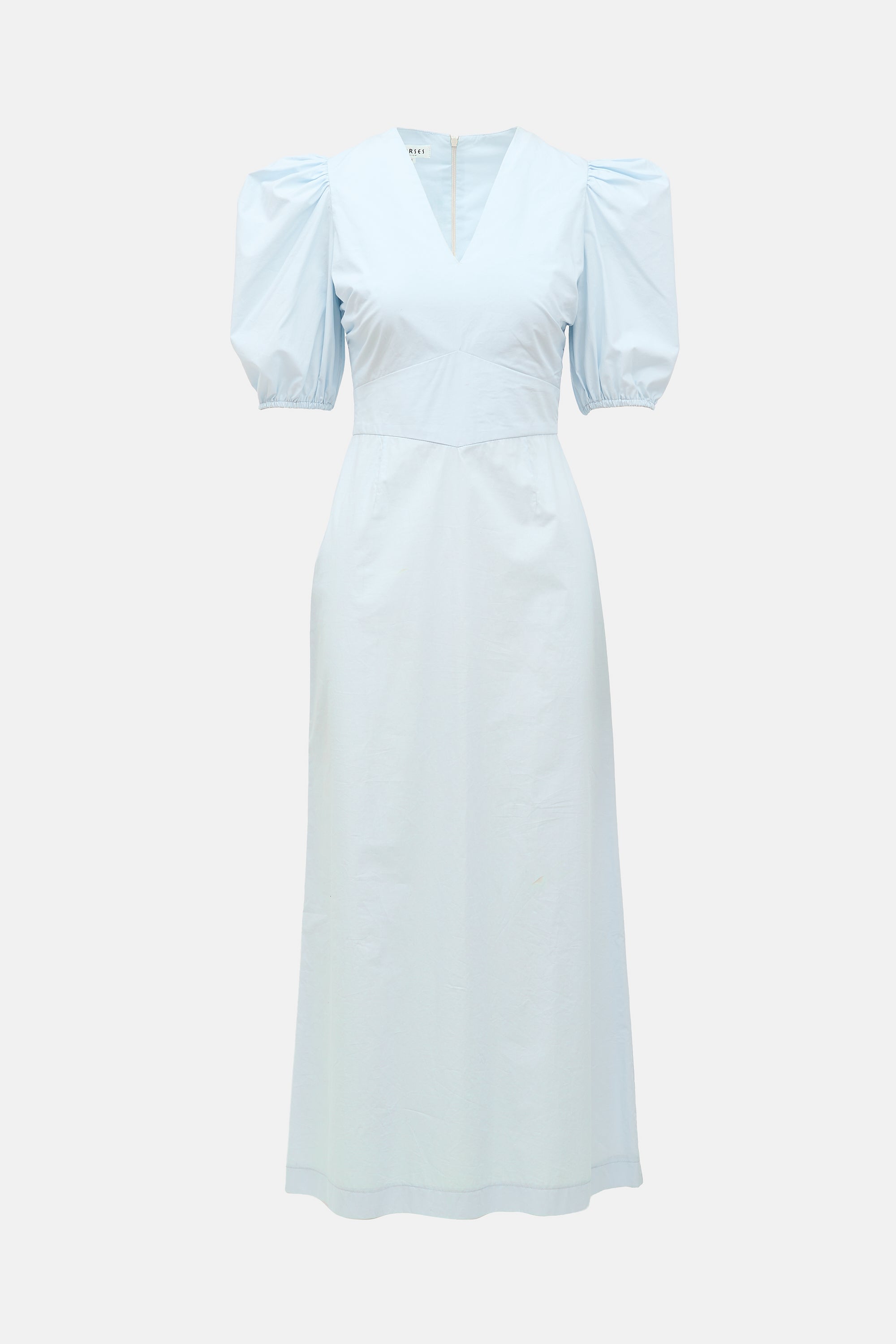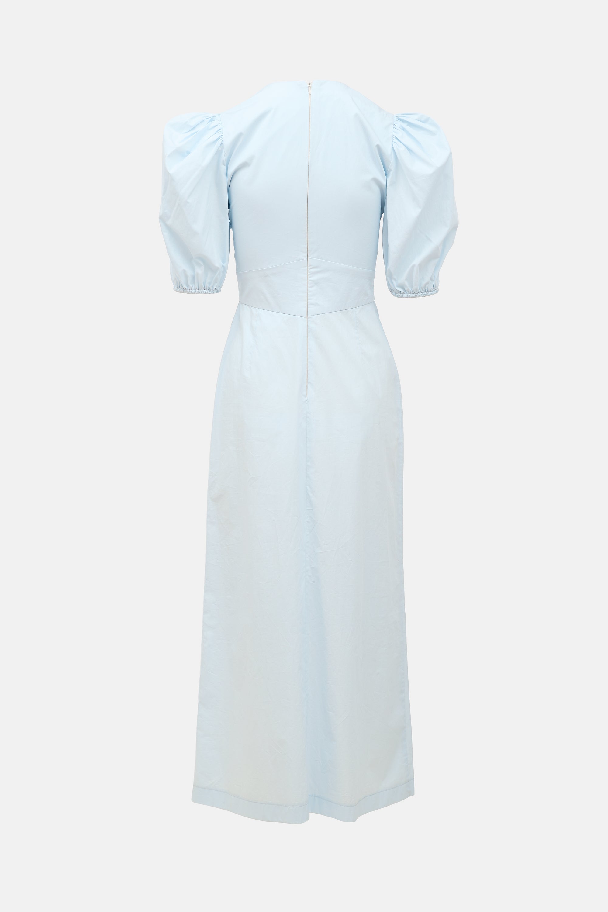 Pre-owned Horses Atelier blue dress featuring V-neckline, puff three quarter sleeves, and zip closure at back.